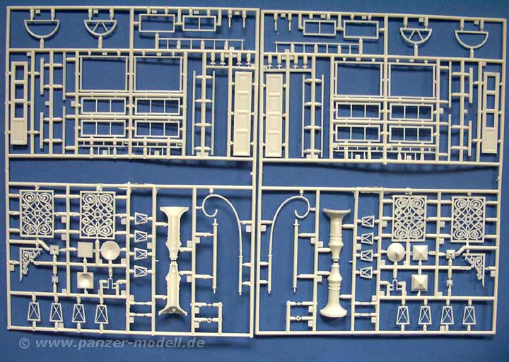 Der Karton bietet wieder schöne steife Vakuteile, die die Bearbeitung erleichtern, sowie diverse Spritzgussteile für Fenster und Türen und Laternen zur Ergänzung und Verfeinerung.