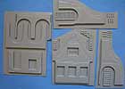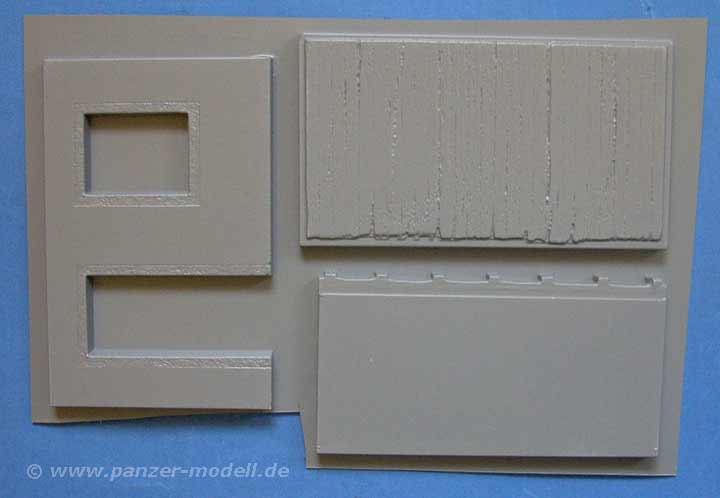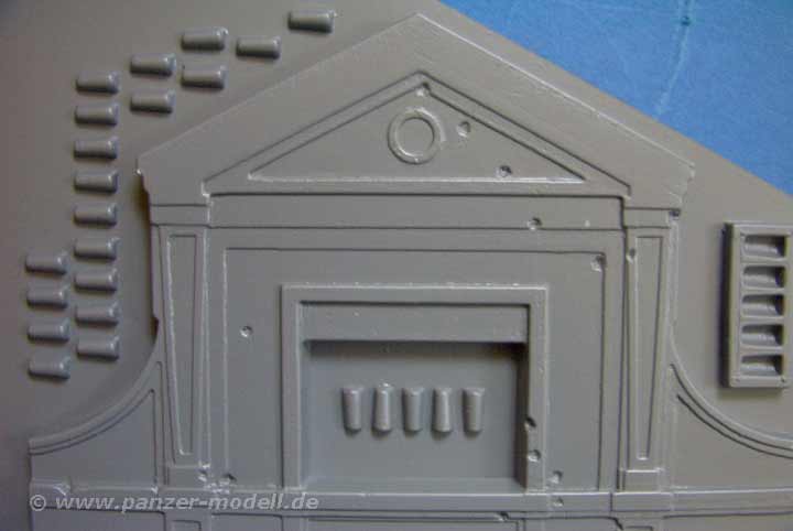 Die Seiten der Wände weisen abgesplitterten Putz mit darunterliegenden Ziegeln auf und ausserdem Dachziegel für die oberen Abschnitte. Alles recht gut gemacht, wenn auch Vakuformen an sich etwas aufwändiger zu verarbeiten sind.