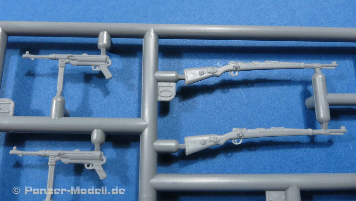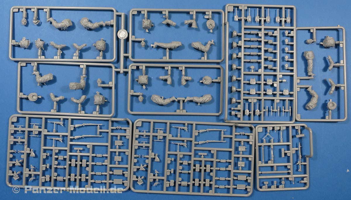 Doch damit nicht genug, denn Miniart spendiert dem Set noch reichlich Zubehör mit persönlicher Ausrüstung wie Klappspaten, Gasmaskenbehälter, Brotbeutel, Helme, usw. und haufenweise Waffen ... von Pistolen über MP bis zu Karabinern und einem MG42 - dazu Munitionsboxen und für das MG sogar einen Patronengurt.