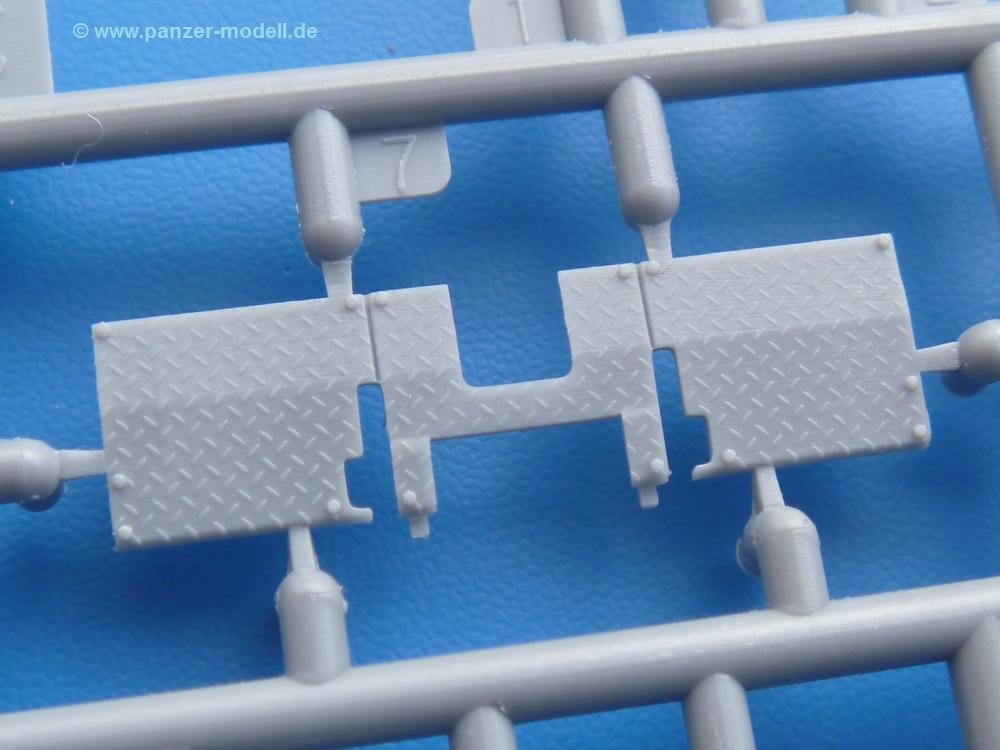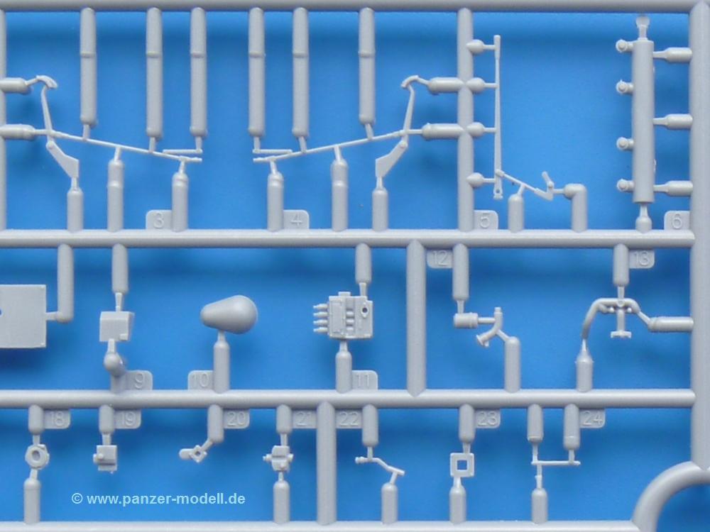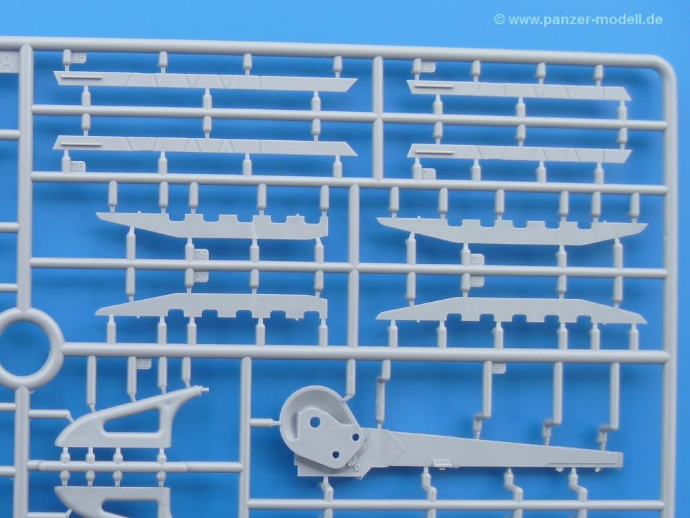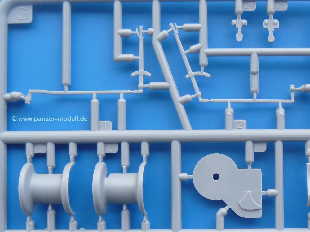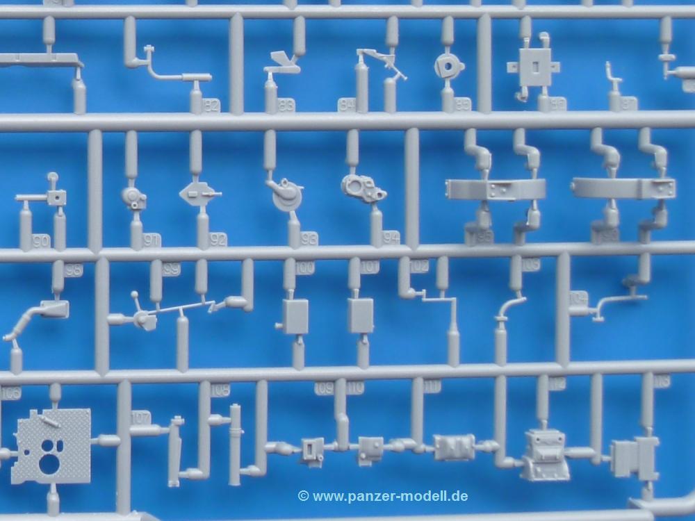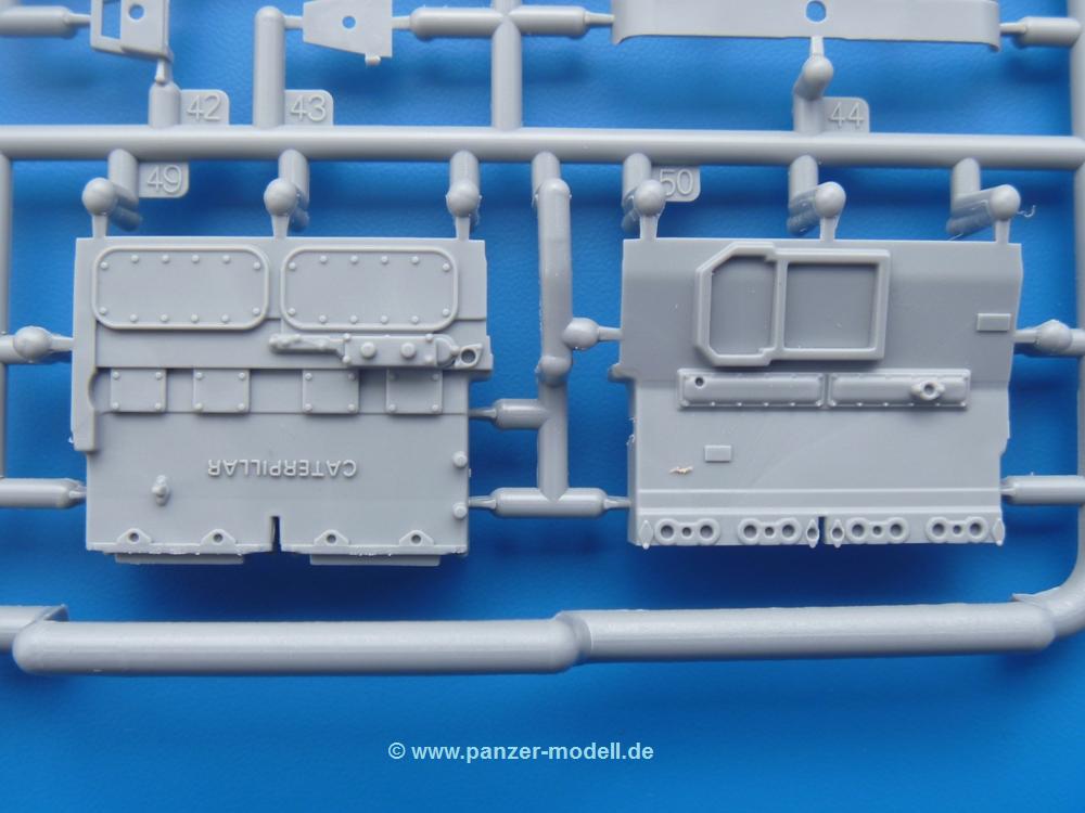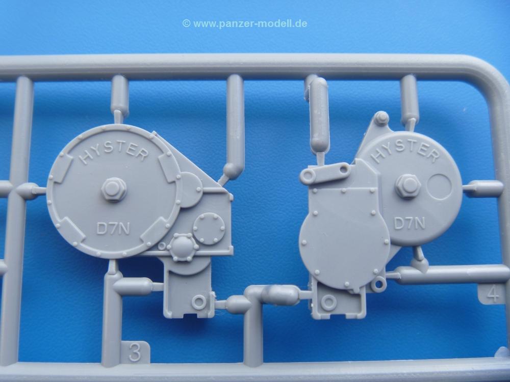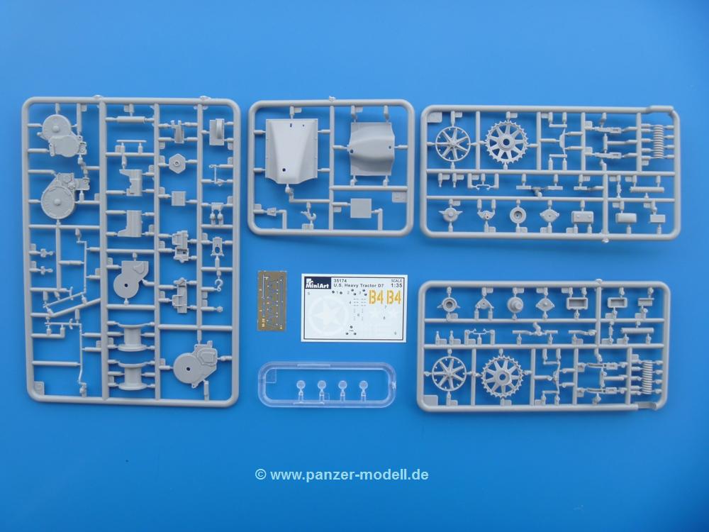 Die Teile aus hellgrauem Plastik sind sauber gespritzt, ohne Verzug und Versatz, hier und da minimaler Grat, keine Fischhäute, 1-2 minimale Sinkstellen. Auswerferspuren sind nur auf Innenseiten von Teilen vorhanden, so dass sie beim Zusammenbau verschwinden, ohn das man sie wegschleifen und verspachteln müsste.Schaut man sich Bauteile und Bauanleitung an, sieht man gleich, dass es sich bei dem D7 nur um einen Motor mit Kettenlaufwerk handelt. Fahrerraum, Verkleidungen und sonstigen Firlefanz gibt es nicht.Das Herzstück bilden die beiden Motoren. Schon der kleinere 2-Zylinder Benzinmotor macht ordentlich etwas her. Man kann sich an Details wie Bedienhebeln, Verschraubungen, Zündkerzen und erhabenen Gussnummern erfreuen. Interessantes Detail - der kleine Auspuffkrümmer mündet in den großen des Dieselmotors. Auch das Gestänge für die Anwurfkurbel auf der Motorhaube wurde nicht vergessen. Schon beim Motorenbau kommen die ersten Decals (Bedienhinwese) zum Einsatz.Auf dem Motorblock des Dieselmotors prangt in erhabenen Buchstaben der Caterpillar Schriftzug (MiniArt hat sich wohl die Markenrechte gesichert.). Zylinderkopfdeckel, Einspritzpumpe und separate -düsen, Keilriemen und -scheiben, Lüfterrad, Bedienhebel, Schläuche usw., usw. Man hat den Eindruck, dass kein Teil vergessen wurde. Der kleine Tank für den Benzinmotor findet seinen Platz an der Stirnseite des Dieselmotors. Der Ölmessstab der Ölwanne wird separat angebracht. Details über Details. Einige wenige PE Teile (3!) werden für feine Gestänge gebraucht. Technikbegeisterte werden voll auf ihre Kosten kommen.Der riesengroße Kühler besteht aus 3 Bauteilen mit sehr feinen Kühlrippen. Der Ablassschlauch am unteren Ende war beim Besprechungsmuster etwas verbogen, ist aber kein Beinbruch und lässt sich richten.Am großen Kupplungsgehäuse sitzt das Getriebe, das in den großen Getriebekasten mit den Seitenabtrieben mündet. Am Getriebkasten sitzen auch die Längsträger. Auf deren Innenseiten sind einige Auswerfermarken zu finden, aber wie gesagt - auf den Innenseiten. Auch sitzen die Anschlüße der Laufrollenwagen am Getriebkasten. Diese werden ohne Kleben eingesetzt, d.h. man kann den D7 das Beinchen heben lassen wie beim Original, wenn die große Blattfeder nicht zu störisch sein wird. Dioramenbauer werden dies begrüßen.Es wird spannend werden, die vielen Hebel, Gestänge und Pedale in die richtige Position zu bringen. Einiges wird dabei unter den fein geriffelten Bodenblechen wieder verschwinden, aber sehen wir dies mit asiatischer Philosophie - "Der Weg ist das Ziel!".Der große Luftfilter befindet sich vor den Füßen des Fahrers. Der zylindrische Körper ist aus einem Stück gefertigt, also keine Naht, wo keine Naht sein sollte. Die Flügelmuttern zum Verschluß gibt es als Einzelteile.Am Heck des Traktors wird eine D7N Hyster Seilwinde befestigt. Auch hier erhabene Buchstaben auf den Gussteilen. Sämtliche Bedienhebel vom Fahrer zur Winde sind vorhanden. Leider gibt es kein Windenseil. Man muss sich ggfs. mit Bindfaden oder anderen Materialien selbst helfen.Das Rückenteil des Fahrersitzes bildet der Tank für den Dieselmotor. Das Sitzpolster ist schön geformt mit leichten Wellen, wo der Fahrer sitzt.Die Laufrollenwagen werden aus mehreren Längs- und Querträgern zusammengesetzt. Jedes Laufrollenpaar besteht aus 4, bzw. 6 Teilen und wird drehbar bleiben. Gleiches gilt für Antriebs- und Leiträder. Nur die Stützrollen werden fest verklebt. Der Federmechanismus für die Leiträder besteht aus Innen- und Außenfedern, die sehr schön (aus Plastik) geformt sind, dass es schon wieder ein Schande ist, die Abdeckungen überhaupt zu montieren. Die Einstellspindeln für die Leiträder erhalten trapezförmige Lager aus PE Teilen. Dazu müssen die Spindeln angeschnitten und nach Montage der PE Teile wieder verklebt werden.Die einzigen Befestigungspunkte der Laufrollenwagen stellen zum einen die Gehäuse der Antriebsräder, die Auflage der Blattfeder und die dicken, bügelförmigen Halterungen dar. Letztgenannte Halterungen weisen flache Sinkstellen auf, die man aber ignorieren kann, wenn man den D7 auf seine Ketten stellt und nicht umgeworfen darstellen will.Der markante Kühlergrill gibt dem Traktor sein Gesicht. Dort schließen links und rechts Seitenbleche mit Caterpillar Aufdruck und den Hauptscheinwerfern an. Die Bleche decken aber nichts vom Motor ab. Man sieht auch nach der Endmontage zu ziemlich alles. Daran ändert auch die Motorhaube nichts. Die Scheinwerfer sind innen hohl mit angedeuteter Glühbirne und glasklaren Scheinwerfergläsern mit schöner Riffelung im Glas. Nach Montage der Haube setzt man nur noch das Aufpuffendstück und die Anlasserkurbel für den Benzinmotor auf. Bevor man die seitlichen Trittbleche montiert, sollte die Kette erst aufgezogen werden. Pro Seite nur 36 Kettenglieder, aber jedes Glied besteht aus 1 Bolzen, 2 Seitenführungen und 1 Auflage. Die Bauanleitung verspricht volle Beweglichkeit. Man muss nur vorsichtig mit dem Klebstoff umgehen.Die Abziehbilder (Decals) enthalten Bedienungsanweisungen, vereinfachte Instrumentenanzeigen, sowie Markierungen für ein Fahrzeug der US Armee im Einsatz in Frankreich, 1944. Für die zivile Ausführung in gelb braucht man nur die Bedienungsanweisungen und Instrumentenanzeigen.Die in Englisch und Russisch gehaltene 12-seitige Bauanleitung beginnt mit 2 farbigen Bemalungsanleitungen mit Decalplatzierung, gefolgt von der Teileübersicht auf Seite 2. Dann folgen 66 Bauschritte mit Explosionszeichnungen, sinnvoll und logisch aufgeteilt und aus meiner Sicht leicht verständlich. In den Bauschritten finden sich immer wieder Hinweise zu Teilbemalungen.Farbnummern werden für folgende Hersteller angegeben:- Vallejo