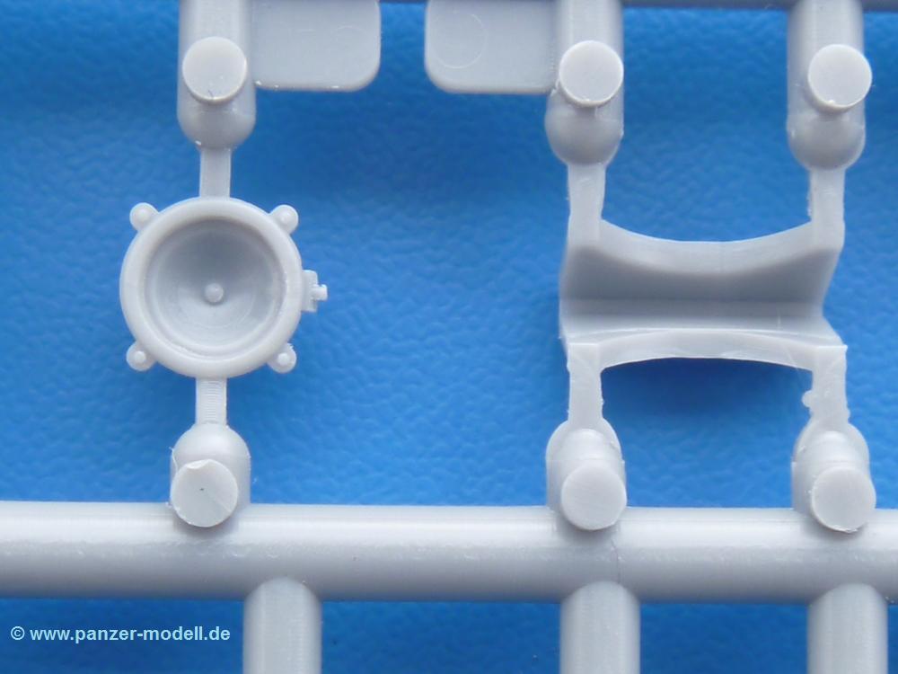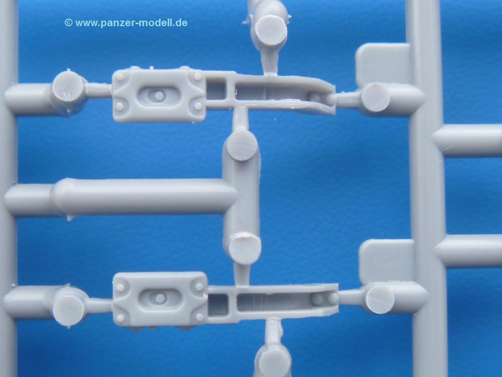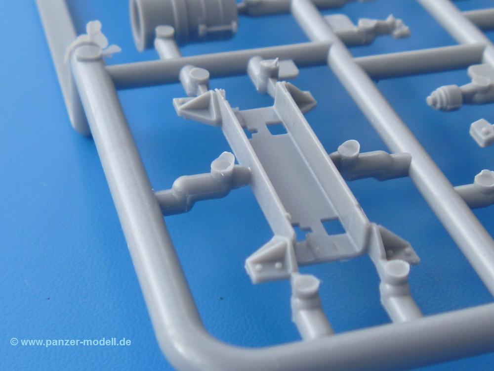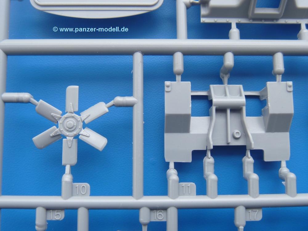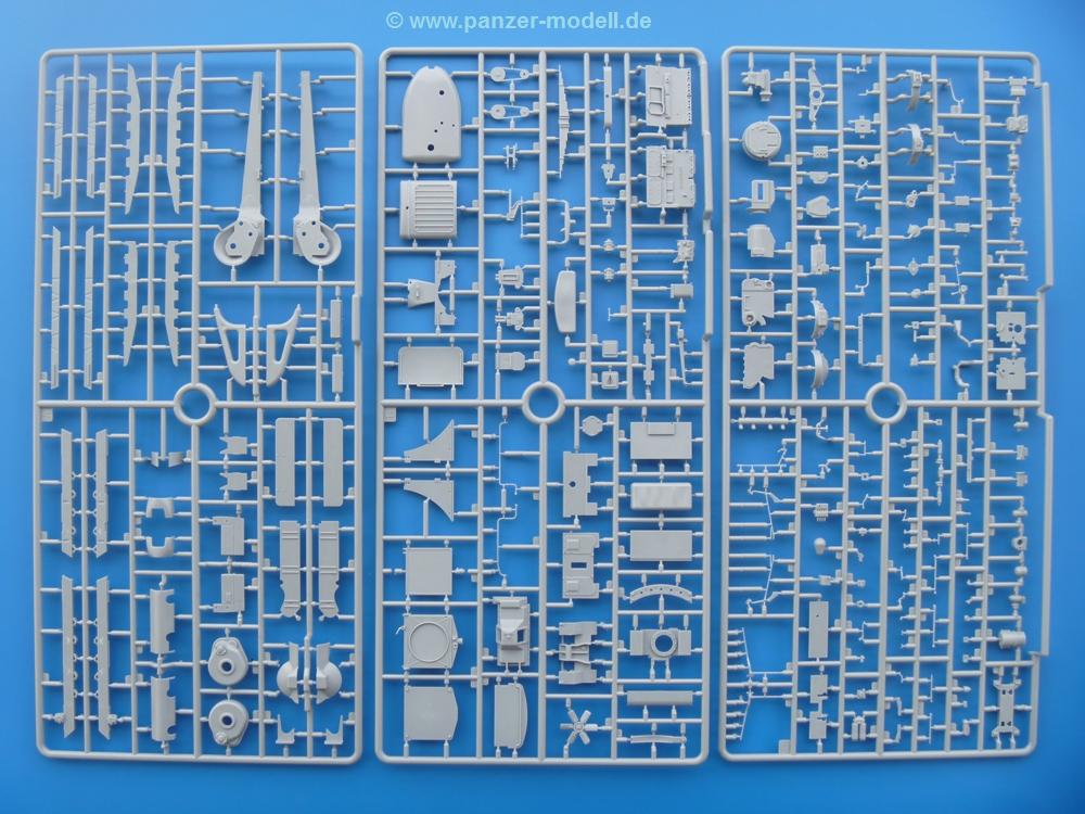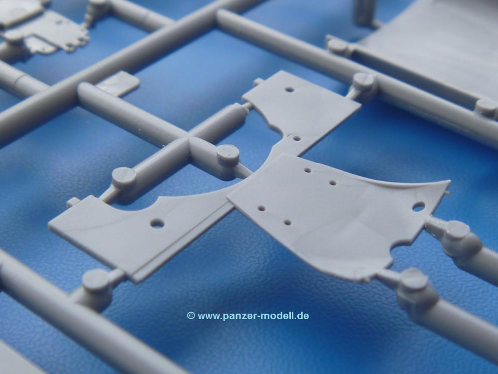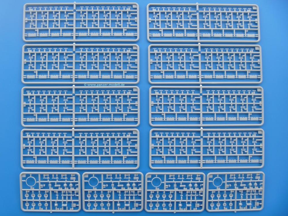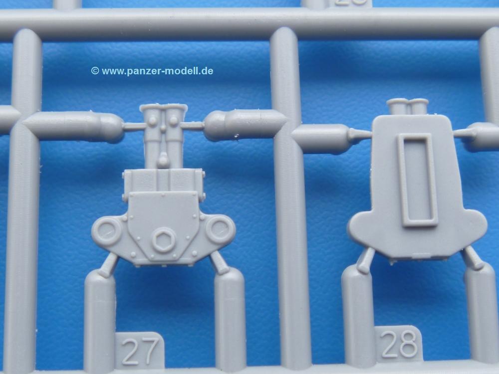 Die Teile aus hellgrauem Plastik sind sauber gespritzt, ohne Verzug und Versatz, hier und da minimaler Grat, keine Fischhäute, 1-2 minimale Sinkstellen. Auswerferspuren sind nur auf Innenseiten von Teilen vorhanden, so dass sie beim Zusammenbau verschwinden, ohn das man sie wegschleifen und verspachteln müsste.Schaut man sich Bauteile und Bauanleitung an, sieht man gleich, dass es sich bei dem D7 nur um einen Motor mit Kettenlaufwerk handelt. Fahrerraum, Verkleidungen und sonstigen Firlefanz gibt es nicht.Das Herzstück bilden die beiden Motoren. Schon der kleinere 2-Zylinder Benzinmotor macht ordentlich etwas her. Man kann sich an Details wie Bedienhebeln, Verschraubungen, Zündkerzen und erhabenen Gussnummern erfreuen. Interessantes Detail - der kleine Auspuffkrümmer mündet in den großen des Dieselmotors. Auch das Gestänge für die Anwurfkurbel auf der Motorhaube wurde nicht vergessen. Schon beim Motorenbau kommen die ersten Decals (Bedienhinwese) zum Einsatz.Auf dem Motorblock des Dieselmotors prangt in erhabenen Buchstaben der Caterpillar Schriftzug (MiniArt hat sich wohl die Markenrechte gesichert.). Zylinderkopfdeckel, Einspritzpumpe und separate -düsen, Keilriemen und -scheiben, Lüfterrad, Bedienhebel, Schläuche usw., usw. Man hat den Eindruck, dass kein Teil vergessen wurde. Der kleine Tank für den Benzinmotor findet seinen Platz an der Stirnseite des Dieselmotors. Der Ölmessstab der Ölwanne wird separat angebracht. Details über Details. Einige wenige PE Teile (3!) werden für feine Gestänge gebraucht. Technikbegeisterte werden voll auf ihre Kosten kommen.Der riesengroße Kühler besteht aus 3 Bauteilen mit sehr feinen Kühlrippen. Der Ablassschlauch am unteren Ende war beim Besprechungsmuster etwas verbogen, ist aber kein Beinbruch und lässt sich richten.Am großen Kupplungsgehäuse sitzt das Getriebe, das in den großen Getriebekasten mit den Seitenabtrieben mündet. Am Getriebkasten sitzen auch die Längsträger. Auf deren Innenseiten sind einige Auswerfermarken zu finden, aber wie gesagt - auf den Innenseiten. Auch sitzen die Anschlüße der Laufrollenwagen am Getriebkasten. Diese werden ohne Kleben eingesetzt, d.h. man kann den D7 das Beinchen heben lassen wie beim Original, wenn die große Blattfeder nicht zu störisch sein wird. Dioramenbauer werden dies begrüßen.Es wird spannend werden, die vielen Hebel, Gestänge und Pedale in die richtige Position zu bringen. Einiges wird dabei unter den fein geriffelten Bodenblechen wieder verschwinden, aber sehen wir dies mit asiatischer Philosophie - "Der Weg ist das Ziel!".Der große Luftfilter befindet sich vor den Füßen des Fahrers. Der zylindrische Körper ist aus einem Stück gefertigt, also keine Naht, wo keine Naht sein sollte. Die Flügelmuttern zum Verschluß gibt es als Einzelteile.Am Heck des Traktors wird eine D7N Hyster Seilwinde befestigt. Auch hier erhabene Buchstaben auf den Gussteilen. Sämtliche Bedienhebel vom Fahrer zur Winde sind vorhanden. Leider gibt es kein Windenseil. Man muss sich ggfs. mit Bindfaden oder anderen Materialien selbst helfen.Das Rückenteil des Fahrersitzes bildet der Tank für den Dieselmotor. Das Sitzpolster ist schön geformt mit leichten Wellen, wo der Fahrer sitzt.Die Laufrollenwagen werden aus mehreren Längs- und Querträgern zusammengesetzt. Jedes Laufrollenpaar besteht aus 4, bzw. 6 Teilen und wird drehbar bleiben. Gleiches gilt für Antriebs- und Leiträder. Nur die Stützrollen werden fest verklebt. Der Federmechanismus für die Leiträder besteht aus Innen- und Außenfedern, die sehr schön (aus Plastik) geformt sind, dass es schon wieder ein Schande ist, die Abdeckungen überhaupt zu montieren. Die Einstellspindeln für die Leiträder erhalten trapezförmige Lager aus PE Teilen. Dazu müssen die Spindeln angeschnitten und nach Montage der PE Teile wieder verklebt werden.Die einzigen Befestigungspunkte der Laufrollenwagen stellen zum einen die Gehäuse der Antriebsräder, die Auflage der Blattfeder und die dicken, bügelförmigen Halterungen dar. Letztgenannte Halterungen weisen flache Sinkstellen auf, die man aber ignorieren kann, wenn man den D7 auf seine Ketten stellt und nicht umgeworfen darstellen will.Der markante Kühlergrill gibt dem Traktor sein Gesicht. Dort schließen links und rechts Seitenbleche mit Caterpillar Aufdruck und den Hauptscheinwerfern an. Die Bleche decken aber nichts vom Motor ab. Man sieht auch nach der Endmontage zu ziemlich alles. Daran ändert auch die Motorhaube nichts. Die Scheinwerfer sind innen hohl mit angedeuteter Glühbirne und glasklaren Scheinwerfergläsern mit schöner Riffelung im Glas. Nach Montage der Haube setzt man nur noch das Aufpuffendstück und die Anlasserkurbel für den Benzinmotor auf. Bevor man die seitlichen Trittbleche montiert, sollte die Kette erst aufgezogen werden. Pro Seite nur 36 Kettenglieder, aber jedes Glied besteht aus 1 Bolzen, 2 Seitenführungen und 1 Auflage. Die Bauanleitung verspricht volle Beweglichkeit. Man muss nur vorsichtig mit dem Klebstoff umgehen.Die Abziehbilder (Decals) enthalten Bedienungsanweisungen, vereinfachte Instrumentenanzeigen, sowie Markierungen für ein Fahrzeug der US Armee im Einsatz in Frankreich, 1944. Für die zivile Ausführung in gelb braucht man nur die Bedienungsanweisungen und Instrumentenanzeigen.Die in Englisch und Russisch gehaltene 12-seitige Bauanleitung beginnt mit 2 farbigen Bemalungsanleitungen mit Decalplatzierung, gefolgt von der Teileübersicht auf Seite 2. Dann folgen 66 Bauschritte mit Explosionszeichnungen, sinnvoll und logisch aufgeteilt und aus meiner Sicht leicht verständlich. In den Bauschritten finden sich immer wieder Hinweise zu Teilbemalungen.Farbnummern werden für folgende Hersteller angegeben:- Vallejo