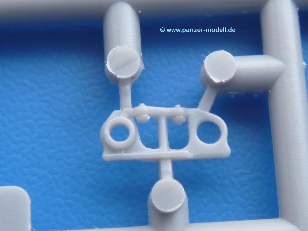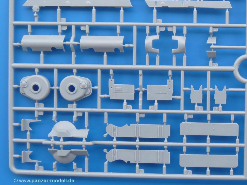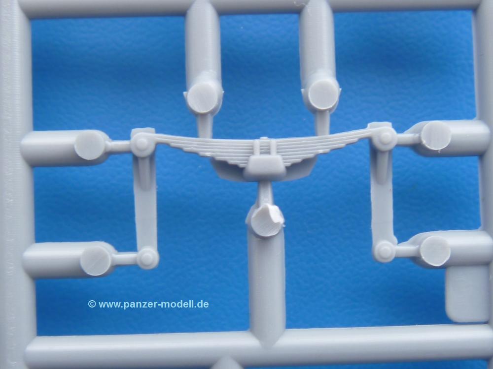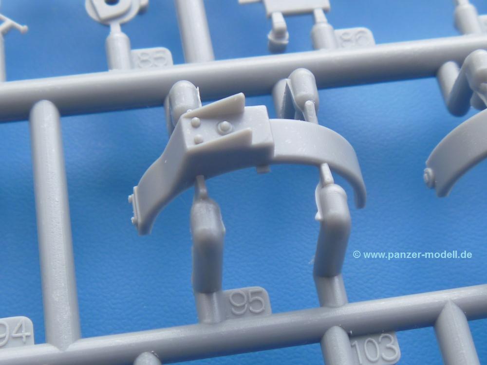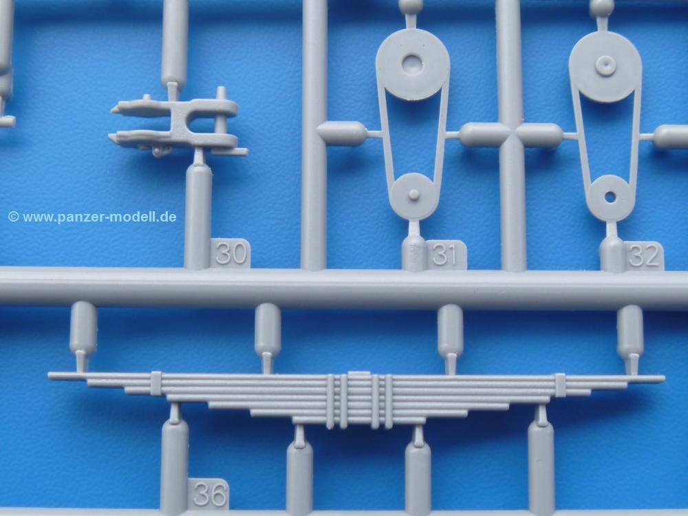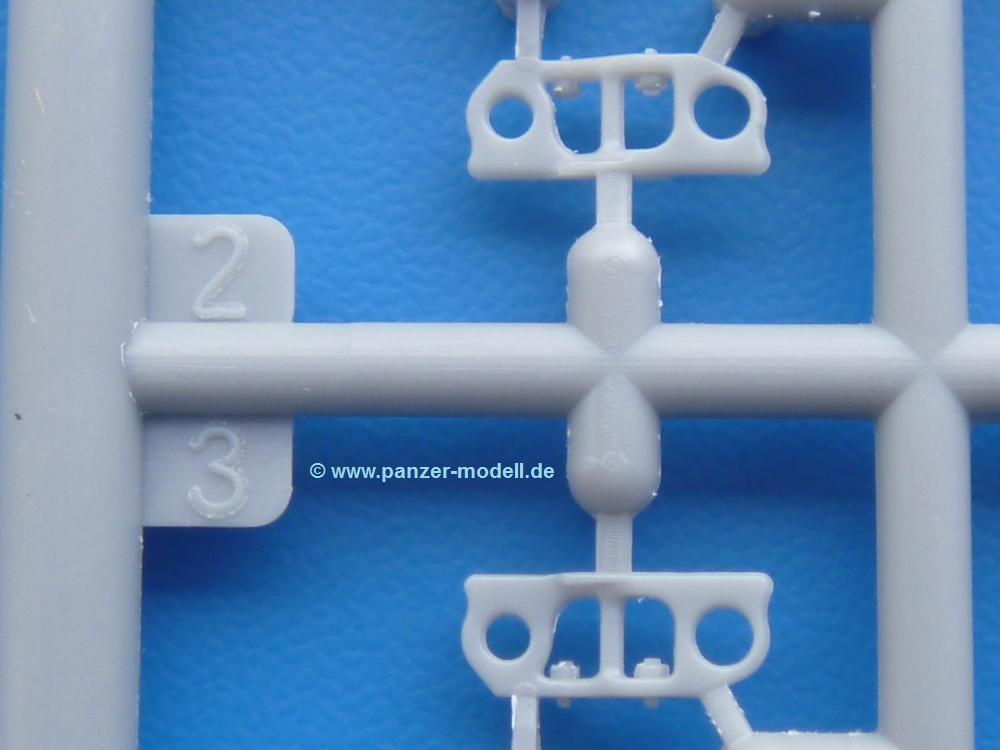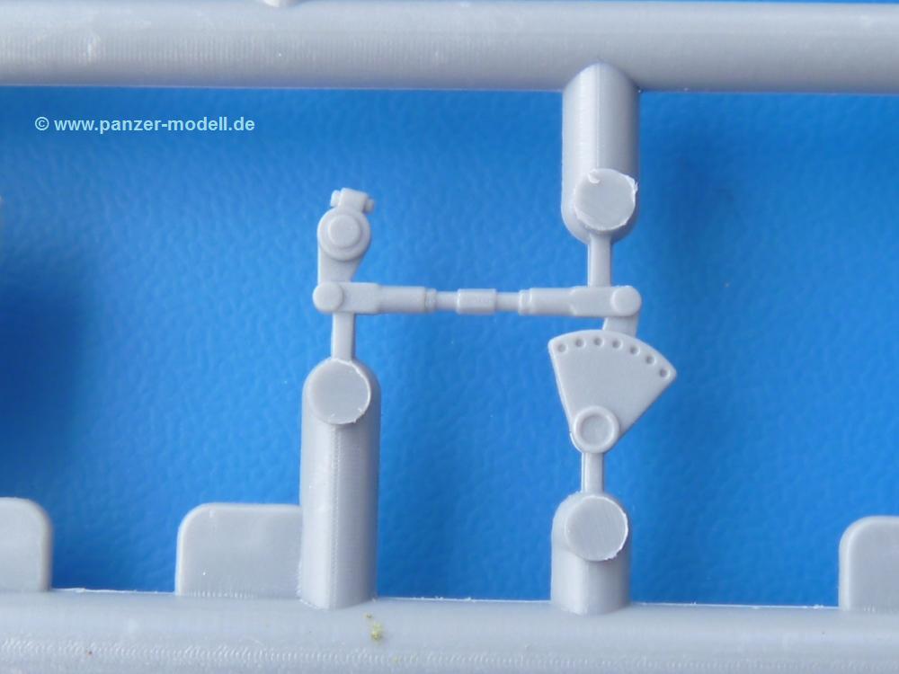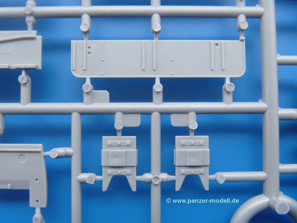 Die Teile aus hellgrauem Plastik sind sauber gespritzt, ohne Verzug und Versatz, hier und da minimaler Grat, keine Fischhäute, 1-2 minimale Sinkstellen. Auswerferspuren sind nur auf Innenseiten von Teilen vorhanden, so dass sie beim Zusammenbau verschwinden, ohn das man sie wegschleifen und verspachteln müsste.Schaut man sich Bauteile und Bauanleitung an, sieht man gleich, dass es sich bei dem D7 nur um einen Motor mit Kettenlaufwerk handelt. Fahrerraum, Verkleidungen und sonstigen Firlefanz gibt es nicht.Das Herzstück bilden die beiden Motoren. Schon der kleinere 2-Zylinder Benzinmotor macht ordentlich etwas her. Man kann sich an Details wie Bedienhebeln, Verschraubungen, Zündkerzen und erhabenen Gussnummern erfreuen. Interessantes Detail - der kleine Auspuffkrümmer mündet in den großen des Dieselmotors. Auch das Gestänge für die Anwurfkurbel auf der Motorhaube wurde nicht vergessen. Schon beim Motorenbau kommen die ersten Decals (Bedienhinwese) zum Einsatz.Auf dem Motorblock des Dieselmotors prangt in erhabenen Buchstaben der Caterpillar Schriftzug (MiniArt hat sich wohl die Markenrechte gesichert.). Zylinderkopfdeckel, Einspritzpumpe und separate -düsen, Keilriemen und -scheiben, Lüfterrad, Bedienhebel, Schläuche usw., usw. Man hat den Eindruck, dass kein Teil vergessen wurde. Der kleine Tank für den Benzinmotor findet seinen Platz an der Stirnseite des Dieselmotors. Der Ölmessstab der Ölwanne wird separat angebracht. Details über Details. Einige wenige PE Teile (3!) werden für feine Gestänge gebraucht. Technikbegeisterte werden voll auf ihre Kosten kommen.Der riesengroße Kühler besteht aus 3 Bauteilen mit sehr feinen Kühlrippen. Der Ablassschlauch am unteren Ende war beim Besprechungsmuster etwas verbogen, ist aber kein Beinbruch und lässt sich richten.Am großen Kupplungsgehäuse sitzt das Getriebe, das in den großen Getriebekasten mit den Seitenabtrieben mündet. Am Getriebkasten sitzen auch die Längsträger. Auf deren Innenseiten sind einige Auswerfermarken zu finden, aber wie gesagt - auf den Innenseiten. Auch sitzen die Anschlüße der Laufrollenwagen am Getriebkasten. Diese werden ohne Kleben eingesetzt, d.h. man kann den D7 das Beinchen heben lassen wie beim Original, wenn die große Blattfeder nicht zu störisch sein wird. Dioramenbauer werden dies begrüßen.Es wird spannend werden, die vielen Hebel, Gestänge und Pedale in die richtige Position zu bringen. Einiges wird dabei unter den fein geriffelten Bodenblechen wieder verschwinden, aber sehen wir dies mit asiatischer Philosophie - "Der Weg ist das Ziel!".Der große Luftfilter befindet sich vor den Füßen des Fahrers. Der zylindrische Körper ist aus einem Stück gefertigt, also keine Naht, wo keine Naht sein sollte. Die Flügelmuttern zum Verschluß gibt es als Einzelteile.Am Heck des Traktors wird eine D7N Hyster Seilwinde befestigt. Auch hier erhabene Buchstaben auf den Gussteilen. Sämtliche Bedienhebel vom Fahrer zur Winde sind vorhanden. Leider gibt es kein Windenseil. Man muss sich ggfs. mit Bindfaden oder anderen Materialien selbst helfen.Das Rückenteil des Fahrersitzes bildet der Tank für den Dieselmotor. Das Sitzpolster ist schön geformt mit leichten Wellen, wo der Fahrer sitzt.Die Laufrollenwagen werden aus mehreren Längs- und Querträgern zusammengesetzt. Jedes Laufrollenpaar besteht aus 4, bzw. 6 Teilen und wird drehbar bleiben. Gleiches gilt für Antriebs- und Leiträder. Nur die Stützrollen werden fest verklebt. Der Federmechanismus für die Leiträder besteht aus Innen- und Außenfedern, die sehr schön (aus Plastik) geformt sind, dass es schon wieder ein Schande ist, die Abdeckungen überhaupt zu montieren. Die Einstellspindeln für die Leiträder erhalten trapezförmige Lager aus PE Teilen. Dazu müssen die Spindeln angeschnitten und nach Montage der PE Teile wieder verklebt werden.Die einzigen Befestigungspunkte der Laufrollenwagen stellen zum einen die Gehäuse der Antriebsräder, die Auflage der Blattfeder und die dicken, bügelförmigen Halterungen dar. Letztgenannte Halterungen weisen flache Sinkstellen auf, die man aber ignorieren kann, wenn man den D7 auf seine Ketten stellt und nicht umgeworfen darstellen will.Der markante Kühlergrill gibt dem Traktor sein Gesicht. Dort schließen links und rechts Seitenbleche mit Caterpillar Aufdruck und den Hauptscheinwerfern an. Die Bleche decken aber nichts vom Motor ab. Man sieht auch nach der Endmontage zu ziemlich alles. Daran ändert auch die Motorhaube nichts. Die Scheinwerfer sind innen hohl mit angedeuteter Glühbirne und glasklaren Scheinwerfergläsern mit schöner Riffelung im Glas. Nach Montage der Haube setzt man nur noch das Aufpuffendstück und die Anlasserkurbel für den Benzinmotor auf. Bevor man die seitlichen Trittbleche montiert, sollte die Kette erst aufgezogen werden. Pro Seite nur 36 Kettenglieder, aber jedes Glied besteht aus 1 Bolzen, 2 Seitenführungen und 1 Auflage. Die Bauanleitung verspricht volle Beweglichkeit. Man muss nur vorsichtig mit dem Klebstoff umgehen.Die Abziehbilder (Decals) enthalten Bedienungsanweisungen, vereinfachte Instrumentenanzeigen, sowie Markierungen für ein Fahrzeug der US Armee im Einsatz in Frankreich, 1944. Für die zivile Ausführung in gelb braucht man nur die Bedienungsanweisungen und Instrumentenanzeigen.Die in Englisch und Russisch gehaltene 12-seitige Bauanleitung beginnt mit 2 farbigen Bemalungsanleitungen mit Decalplatzierung, gefolgt von der Teileübersicht auf Seite 2. Dann folgen 66 Bauschritte mit Explosionszeichnungen, sinnvoll und logisch aufgeteilt und aus meiner Sicht leicht verständlich. In den Bauschritten finden sich immer wieder Hinweise zu Teilbemalungen.Farbnummern werden für folgende Hersteller angegeben:- Vallejo