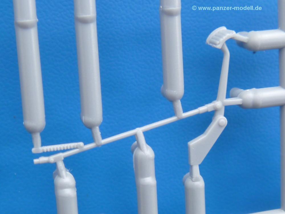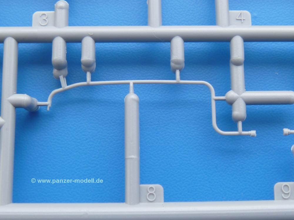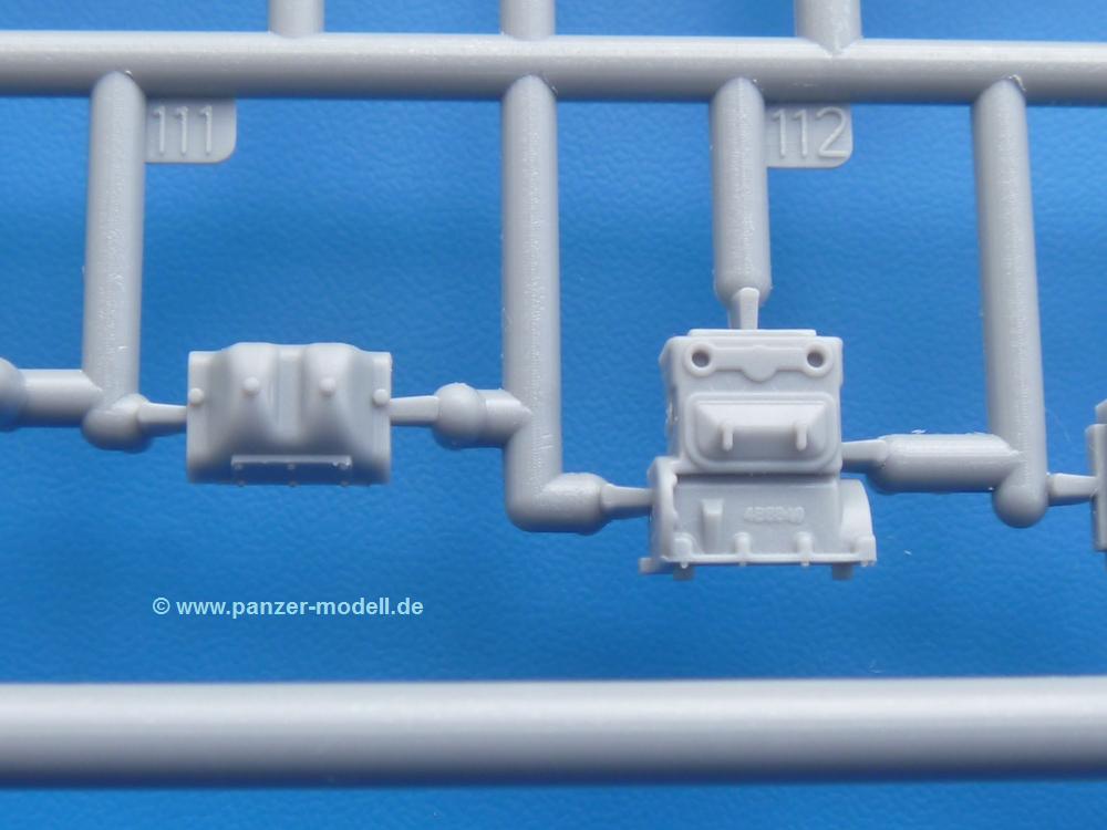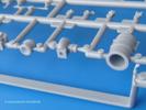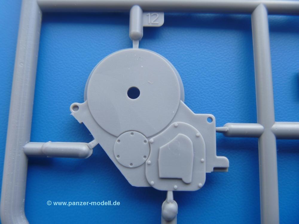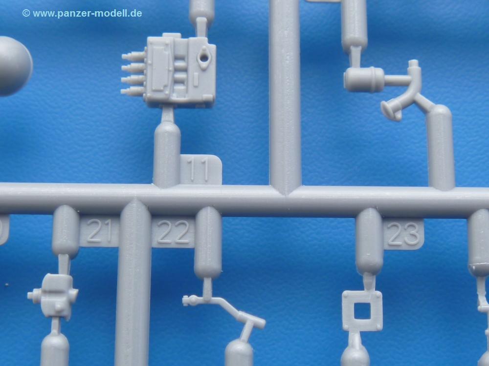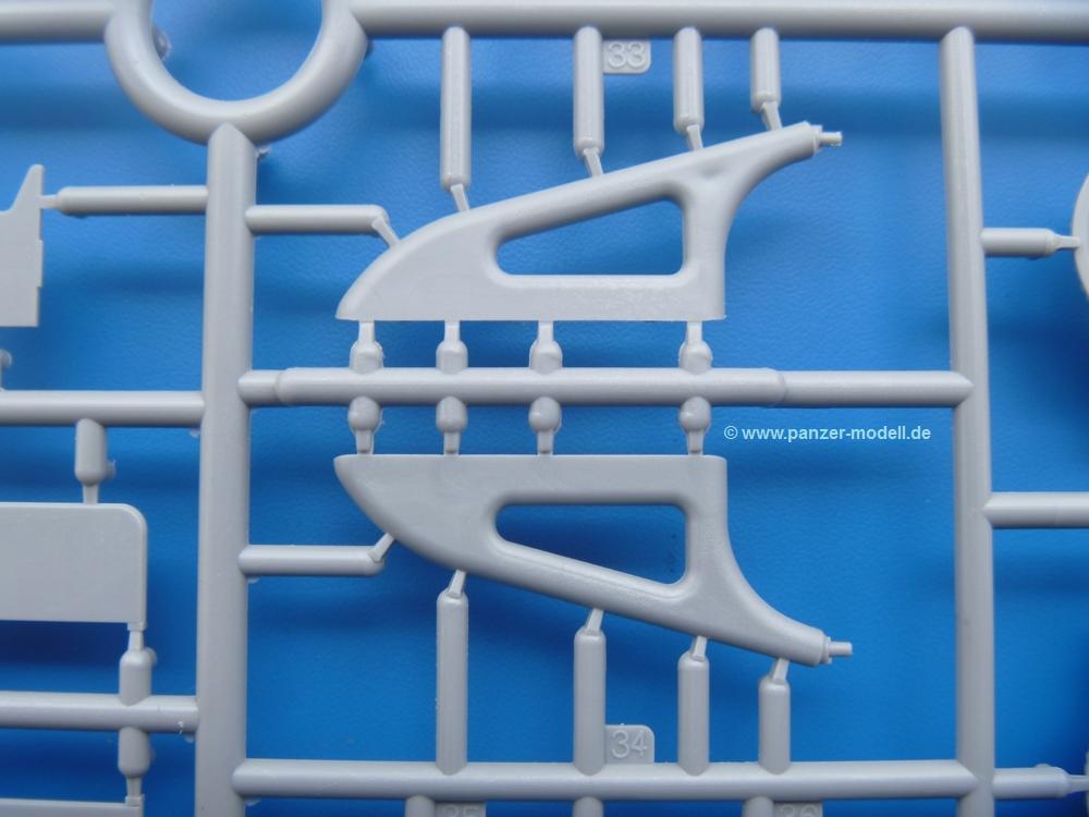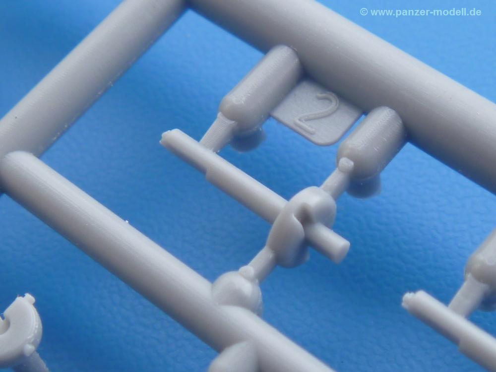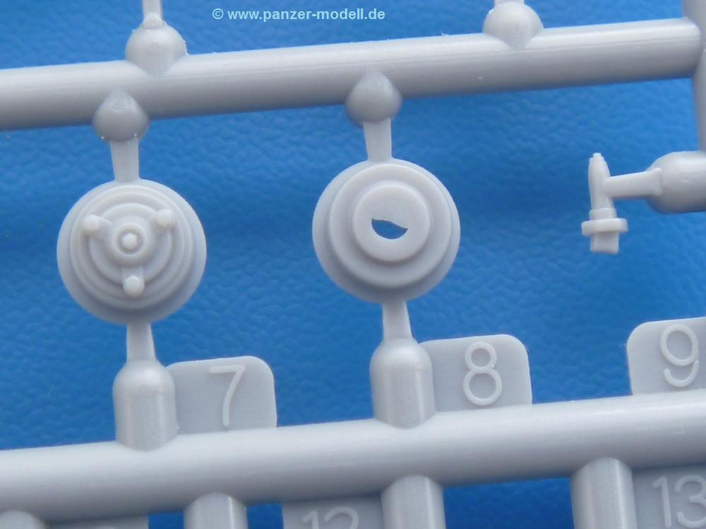 Die Teile aus hellgrauem Plastik sind sauber gespritzt, ohne Verzug und Versatz, hier und da minimaler Grat, keine Fischhäute, 1-2 minimale Sinkstellen. Auswerferspuren sind nur auf Innenseiten von Teilen vorhanden, so dass sie beim Zusammenbau verschwinden, ohn das man sie wegschleifen und verspachteln müsste.Schaut man sich Bauteile und Bauanleitung an, sieht man gleich, dass es sich bei dem D7 nur um einen Motor mit Kettenlaufwerk handelt. Fahrerraum, Verkleidungen und sonstigen Firlefanz gibt es nicht.Das Herzstück bilden die beiden Motoren. Schon der kleinere 2-Zylinder Benzinmotor macht ordentlich etwas her. Man kann sich an Details wie Bedienhebeln, Verschraubungen, Zündkerzen und erhabenen Gussnummern erfreuen. Interessantes Detail - der kleine Auspuffkrümmer mündet in den großen des Dieselmotors. Auch das Gestänge für die Anwurfkurbel auf der Motorhaube wurde nicht vergessen. Schon beim Motorenbau kommen die ersten Decals (Bedienhinwese) zum Einsatz.Auf dem Motorblock des Dieselmotors prangt in erhabenen Buchstaben der Caterpillar Schriftzug (MiniArt hat sich wohl die Markenrechte gesichert.). Zylinderkopfdeckel, Einspritzpumpe und separate -düsen, Keilriemen und -scheiben, Lüfterrad, Bedienhebel, Schläuche usw., usw. Man hat den Eindruck, dass kein Teil vergessen wurde. Der kleine Tank für den Benzinmotor findet seinen Platz an der Stirnseite des Dieselmotors. Der Ölmessstab der Ölwanne wird separat angebracht. Details über Details. Einige wenige PE Teile (3!) werden für feine Gestänge gebraucht. Technikbegeisterte werden voll auf ihre Kosten kommen.Der riesengroße Kühler besteht aus 3 Bauteilen mit sehr feinen Kühlrippen. Der Ablassschlauch am unteren Ende war beim Besprechungsmuster etwas verbogen, ist aber kein Beinbruch und lässt sich richten.Am großen Kupplungsgehäuse sitzt das Getriebe, das in den großen Getriebekasten mit den Seitenabtrieben mündet. Am Getriebkasten sitzen auch die Längsträger. Auf deren Innenseiten sind einige Auswerfermarken zu finden, aber wie gesagt - auf den Innenseiten. Auch sitzen die Anschlüße der Laufrollenwagen am Getriebkasten. Diese werden ohne Kleben eingesetzt, d.h. man kann den D7 das Beinchen heben lassen wie beim Original, wenn die große Blattfeder nicht zu störisch sein wird. Dioramenbauer werden dies begrüßen.Es wird spannend werden, die vielen Hebel, Gestänge und Pedale in die richtige Position zu bringen. Einiges wird dabei unter den fein geriffelten Bodenblechen wieder verschwinden, aber sehen wir dies mit asiatischer Philosophie - "Der Weg ist das Ziel!".Der große Luftfilter befindet sich vor den Füßen des Fahrers. Der zylindrische Körper ist aus einem Stück gefertigt, also keine Naht, wo keine Naht sein sollte. Die Flügelmuttern zum Verschluß gibt es als Einzelteile.Am Heck des Traktors wird eine D7N Hyster Seilwinde befestigt. Auch hier erhabene Buchstaben auf den Gussteilen. Sämtliche Bedienhebel vom Fahrer zur Winde sind vorhanden. Leider gibt es kein Windenseil. Man muss sich ggfs. mit Bindfaden oder anderen Materialien selbst helfen.Das Rückenteil des Fahrersitzes bildet der Tank für den Dieselmotor. Das Sitzpolster ist schön geformt mit leichten Wellen, wo der Fahrer sitzt.Die Laufrollenwagen werden aus mehreren Längs- und Querträgern zusammengesetzt. Jedes Laufrollenpaar besteht aus 4, bzw. 6 Teilen und wird drehbar bleiben. Gleiches gilt für Antriebs- und Leiträder. Nur die Stützrollen werden fest verklebt. Der Federmechanismus für die Leiträder besteht aus Innen- und Außenfedern, die sehr schön (aus Plastik) geformt sind, dass es schon wieder ein Schande ist, die Abdeckungen überhaupt zu montieren. Die Einstellspindeln für die Leiträder erhalten trapezförmige Lager aus PE Teilen. Dazu müssen die Spindeln angeschnitten und nach Montage der PE Teile wieder verklebt werden.Die einzigen Befestigungspunkte der Laufrollenwagen stellen zum einen die Gehäuse der Antriebsräder, die Auflage der Blattfeder und die dicken, bügelförmigen Halterungen dar. Letztgenannte Halterungen weisen flache Sinkstellen auf, die man aber ignorieren kann, wenn man den D7 auf seine Ketten stellt und nicht umgeworfen darstellen will.Der markante Kühlergrill gibt dem Traktor sein Gesicht. Dort schließen links und rechts Seitenbleche mit Caterpillar Aufdruck und den Hauptscheinwerfern an. Die Bleche decken aber nichts vom Motor ab. Man sieht auch nach der Endmontage zu ziemlich alles. Daran ändert auch die Motorhaube nichts. Die Scheinwerfer sind innen hohl mit angedeuteter Glühbirne und glasklaren Scheinwerfergläsern mit schöner Riffelung im Glas. Nach Montage der Haube setzt man nur noch das Aufpuffendstück und die Anlasserkurbel für den Benzinmotor auf. Bevor man die seitlichen Trittbleche montiert, sollte die Kette erst aufgezogen werden. Pro Seite nur 36 Kettenglieder, aber jedes Glied besteht aus 1 Bolzen, 2 Seitenführungen und 1 Auflage. Die Bauanleitung verspricht volle Beweglichkeit. Man muss nur vorsichtig mit dem Klebstoff umgehen.Die Abziehbilder (Decals) enthalten Bedienungsanweisungen, vereinfachte Instrumentenanzeigen, sowie Markierungen für ein Fahrzeug der US Armee im Einsatz in Frankreich, 1944. Für die zivile Ausführung in gelb braucht man nur die Bedienungsanweisungen und Instrumentenanzeigen.Die in Englisch und Russisch gehaltene 12-seitige Bauanleitung beginnt mit 2 farbigen Bemalungsanleitungen mit Decalplatzierung, gefolgt von der Teileübersicht auf Seite 2. Dann folgen 66 Bauschritte mit Explosionszeichnungen, sinnvoll und logisch aufgeteilt und aus meiner Sicht leicht verständlich. In den Bauschritten finden sich immer wieder Hinweise zu Teilbemalungen.Farbnummern werden für folgende Hersteller angegeben:- Vallejo