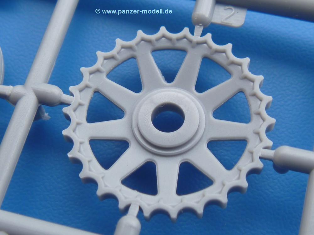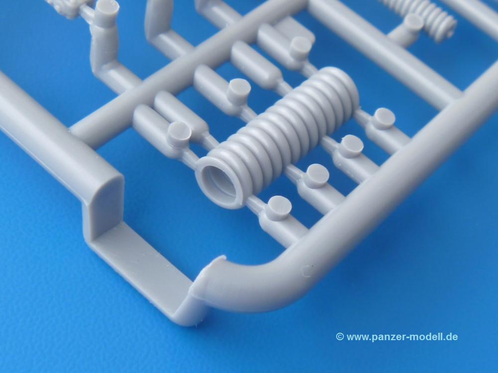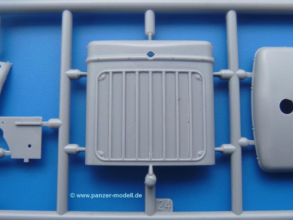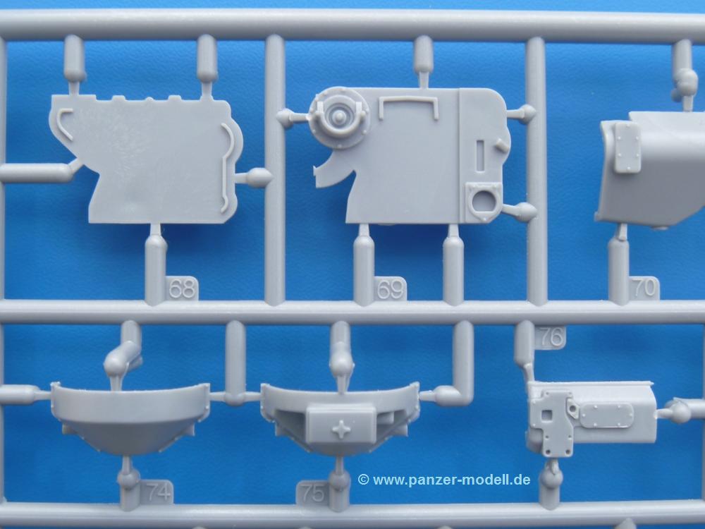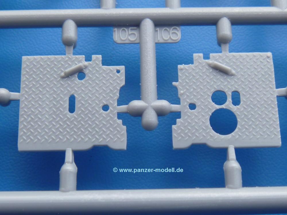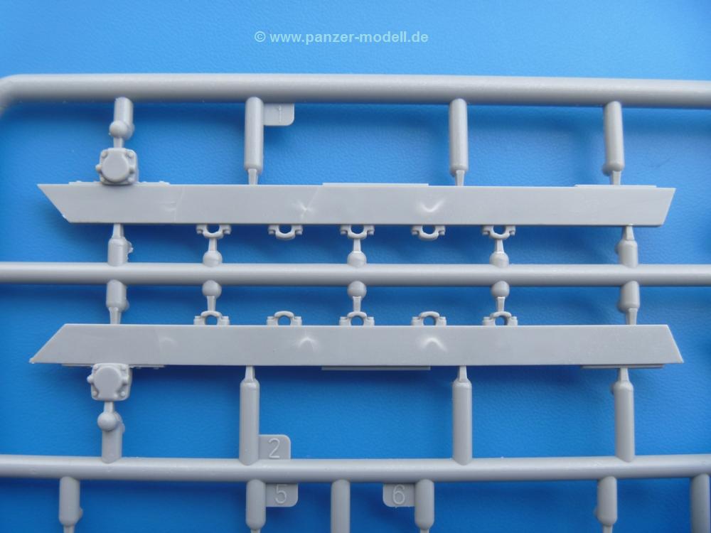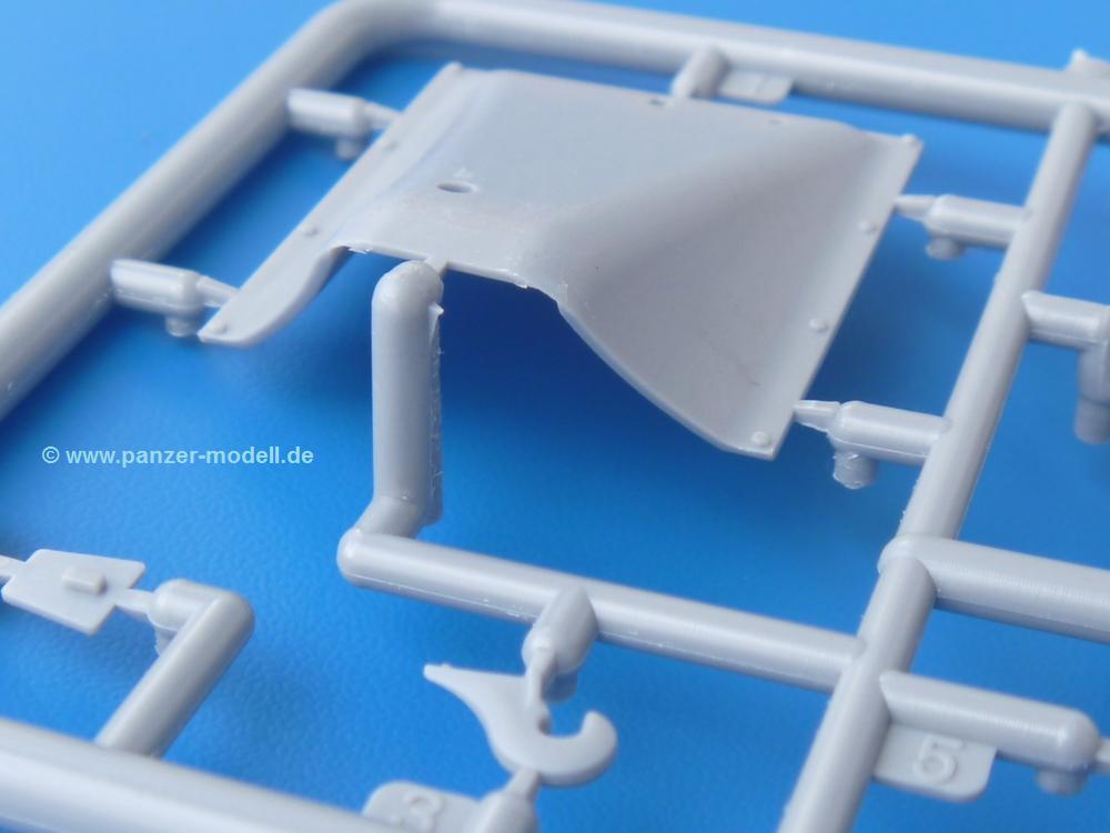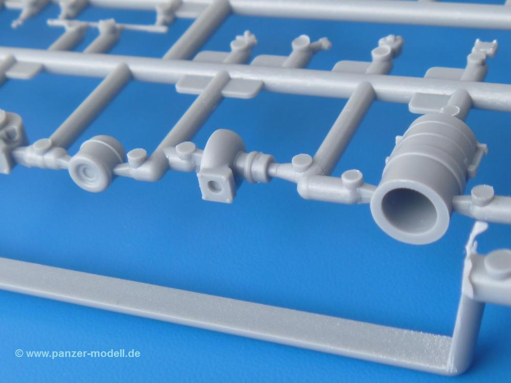 Die Teile aus hellgrauem Plastik sind sauber gespritzt, ohne Verzug und Versatz, hier und da minimaler Grat, keine Fischhäute, 1-2 minimale Sinkstellen. Auswerferspuren sind nur auf Innenseiten von Teilen vorhanden, so dass sie beim Zusammenbau verschwinden, ohn das man sie wegschleifen und verspachteln müsste.Schaut man sich Bauteile und Bauanleitung an, sieht man gleich, dass es sich bei dem D7 nur um einen Motor mit Kettenlaufwerk handelt. Fahrerraum, Verkleidungen und sonstigen Firlefanz gibt es nicht.Das Herzstück bilden die beiden Motoren. Schon der kleinere 2-Zylinder Benzinmotor macht ordentlich etwas her. Man kann sich an Details wie Bedienhebeln, Verschraubungen, Zündkerzen und erhabenen Gussnummern erfreuen. Interessantes Detail - der kleine Auspuffkrümmer mündet in den großen des Dieselmotors. Auch das Gestänge für die Anwurfkurbel auf der Motorhaube wurde nicht vergessen. Schon beim Motorenbau kommen die ersten Decals (Bedienhinwese) zum Einsatz.Auf dem Motorblock des Dieselmotors prangt in erhabenen Buchstaben der Caterpillar Schriftzug (MiniArt hat sich wohl die Markenrechte gesichert.). Zylinderkopfdeckel, Einspritzpumpe und separate -düsen, Keilriemen und -scheiben, Lüfterrad, Bedienhebel, Schläuche usw., usw. Man hat den Eindruck, dass kein Teil vergessen wurde. Der kleine Tank für den Benzinmotor findet seinen Platz an der Stirnseite des Dieselmotors. Der Ölmessstab der Ölwanne wird separat angebracht. Details über Details. Einige wenige PE Teile (3!) werden für feine Gestänge gebraucht. Technikbegeisterte werden voll auf ihre Kosten kommen.Der riesengroße Kühler besteht aus 3 Bauteilen mit sehr feinen Kühlrippen. Der Ablassschlauch am unteren Ende war beim Besprechungsmuster etwas verbogen, ist aber kein Beinbruch und lässt sich richten.Am großen Kupplungsgehäuse sitzt das Getriebe, das in den großen Getriebekasten mit den Seitenabtrieben mündet. Am Getriebkasten sitzen auch die Längsträger. Auf deren Innenseiten sind einige Auswerfermarken zu finden, aber wie gesagt - auf den Innenseiten. Auch sitzen die Anschlüße der Laufrollenwagen am Getriebkasten. Diese werden ohne Kleben eingesetzt, d.h. man kann den D7 das Beinchen heben lassen wie beim Original, wenn die große Blattfeder nicht zu störisch sein wird. Dioramenbauer werden dies begrüßen.Es wird spannend werden, die vielen Hebel, Gestänge und Pedale in die richtige Position zu bringen. Einiges wird dabei unter den fein geriffelten Bodenblechen wieder verschwinden, aber sehen wir dies mit asiatischer Philosophie - "Der Weg ist das Ziel!".Der große Luftfilter befindet sich vor den Füßen des Fahrers. Der zylindrische Körper ist aus einem Stück gefertigt, also keine Naht, wo keine Naht sein sollte. Die Flügelmuttern zum Verschluß gibt es als Einzelteile.Am Heck des Traktors wird eine D7N Hyster Seilwinde befestigt. Auch hier erhabene Buchstaben auf den Gussteilen. Sämtliche Bedienhebel vom Fahrer zur Winde sind vorhanden. Leider gibt es kein Windenseil. Man muss sich ggfs. mit Bindfaden oder anderen Materialien selbst helfen.Das Rückenteil des Fahrersitzes bildet der Tank für den Dieselmotor. Das Sitzpolster ist schön geformt mit leichten Wellen, wo der Fahrer sitzt.Die Laufrollenwagen werden aus mehreren Längs- und Querträgern zusammengesetzt. Jedes Laufrollenpaar besteht aus 4, bzw. 6 Teilen und wird drehbar bleiben. Gleiches gilt für Antriebs- und Leiträder. Nur die Stützrollen werden fest verklebt. Der Federmechanismus für die Leiträder besteht aus Innen- und Außenfedern, die sehr schön (aus Plastik) geformt sind, dass es schon wieder ein Schande ist, die Abdeckungen überhaupt zu montieren. Die Einstellspindeln für die Leiträder erhalten trapezförmige Lager aus PE Teilen. Dazu müssen die Spindeln angeschnitten und nach Montage der PE Teile wieder verklebt werden.Die einzigen Befestigungspunkte der Laufrollenwagen stellen zum einen die Gehäuse der Antriebsräder, die Auflage der Blattfeder und die dicken, bügelförmigen Halterungen dar. Letztgenannte Halterungen weisen flache Sinkstellen auf, die man aber ignorieren kann, wenn man den D7 auf seine Ketten stellt und nicht umgeworfen darstellen will.Der markante Kühlergrill gibt dem Traktor sein Gesicht. Dort schließen links und rechts Seitenbleche mit Caterpillar Aufdruck und den Hauptscheinwerfern an. Die Bleche decken aber nichts vom Motor ab. Man sieht auch nach der Endmontage zu ziemlich alles. Daran ändert auch die Motorhaube nichts. Die Scheinwerfer sind innen hohl mit angedeuteter Glühbirne und glasklaren Scheinwerfergläsern mit schöner Riffelung im Glas. Nach Montage der Haube setzt man nur noch das Aufpuffendstück und die Anlasserkurbel für den Benzinmotor auf. Bevor man die seitlichen Trittbleche montiert, sollte die Kette erst aufgezogen werden. Pro Seite nur 36 Kettenglieder, aber jedes Glied besteht aus 1 Bolzen, 2 Seitenführungen und 1 Auflage. Die Bauanleitung verspricht volle Beweglichkeit. Man muss nur vorsichtig mit dem Klebstoff umgehen.Die Abziehbilder (Decals) enthalten Bedienungsanweisungen, vereinfachte Instrumentenanzeigen, sowie Markierungen für ein Fahrzeug der US Armee im Einsatz in Frankreich, 1944. Für die zivile Ausführung in gelb braucht man nur die Bedienungsanweisungen und Instrumentenanzeigen.Die in Englisch und Russisch gehaltene 12-seitige Bauanleitung beginnt mit 2 farbigen Bemalungsanleitungen mit Decalplatzierung, gefolgt von der Teileübersicht auf Seite 2. Dann folgen 66 Bauschritte mit Explosionszeichnungen, sinnvoll und logisch aufgeteilt und aus meiner Sicht leicht verständlich. In den Bauschritten finden sich immer wieder Hinweise zu Teilbemalungen.Farbnummern werden für folgende Hersteller angegeben:- Vallejo