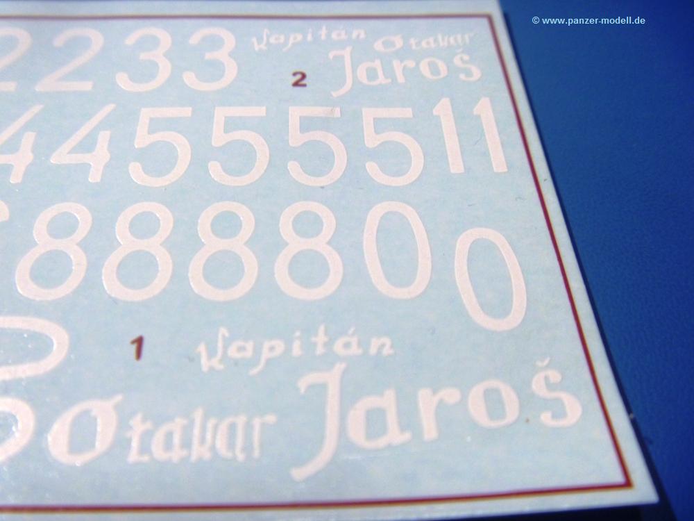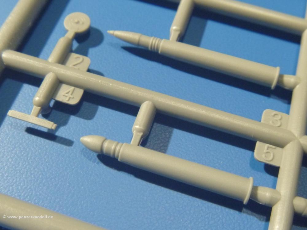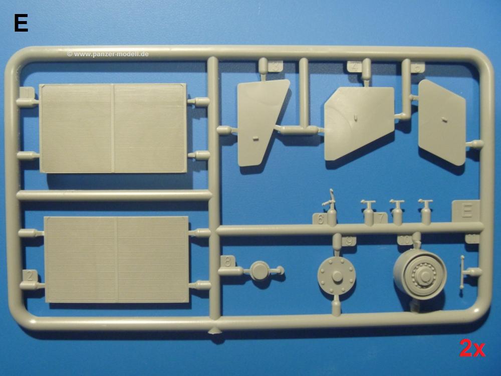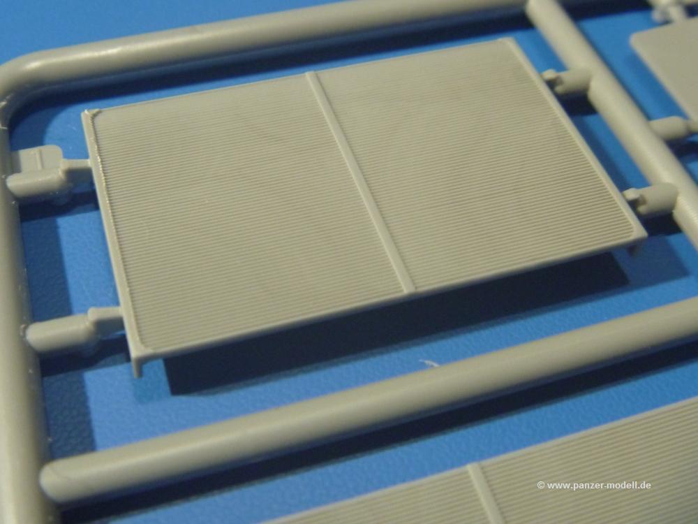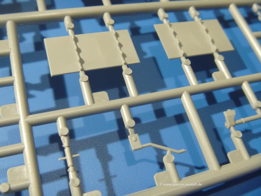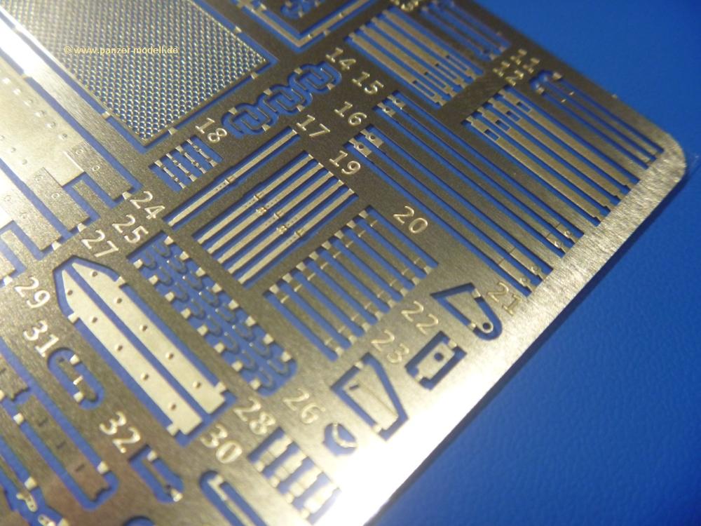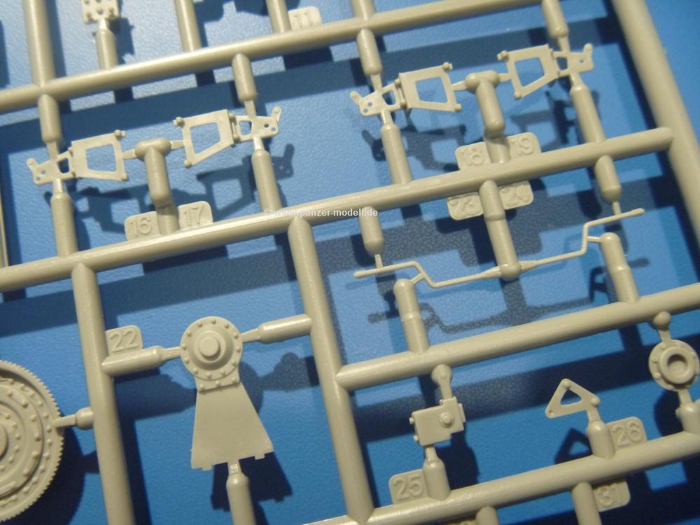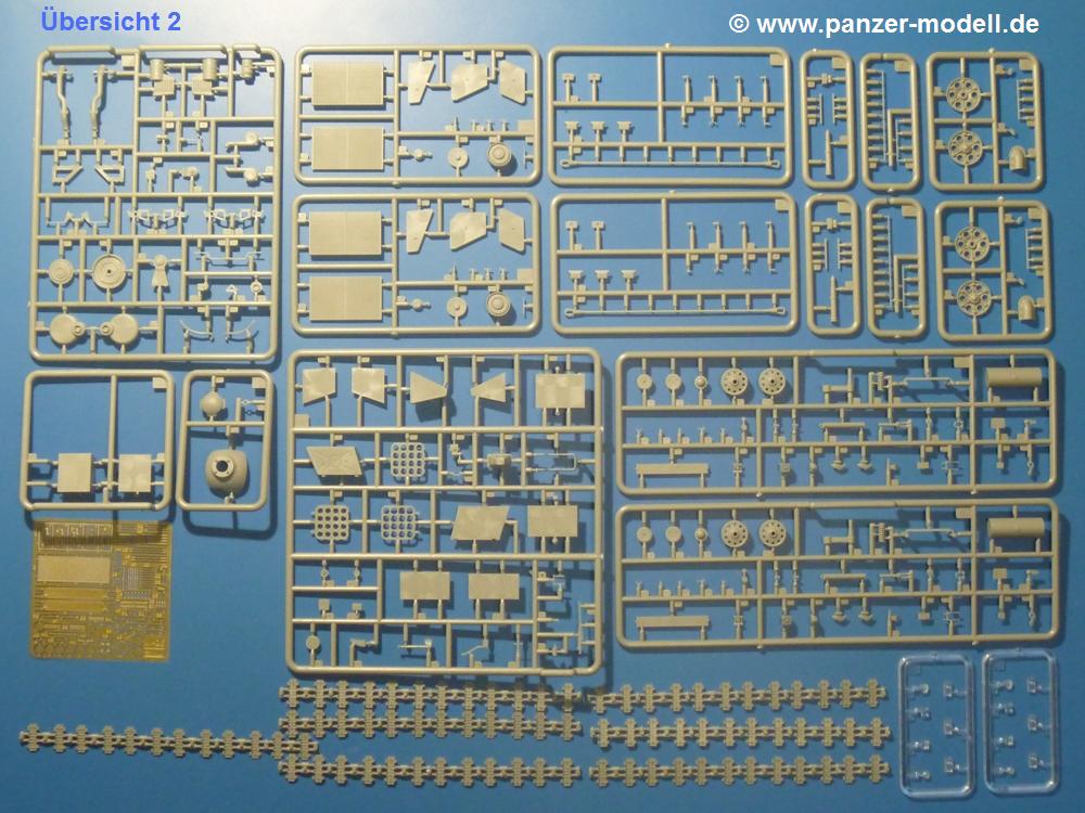 Die Teile aus hellgrauem Plastik sind sauber gespritzt, ohne Verzug und Versatz, hier und da minimaler Grat, keine Fischhäute. Auswerferspuren sind kaum zu sehen und nur auf Innenseiten von Teilen vorhanden, so dass sie beim Zusammenbau verschwinden, ohn das man sie wegschleifen und verspachteln müsste. Viel Vorsicht muss man aufwenden, um manche filigrane Teile wie Gestänge zerstörungsfrei von den Spritzlingen zu lösen.Tja, wie beschreibt man in aller Kürze einen Bausatz, bei dem man sich dermaßen im Detail verlieren kann? Ich habe mich diesmal für ein paar Fotos mehr entschieden und versuche, mich textlich kurz zu fassen.Motor und Getriebe sind im wahrsten Sinne ein Bausatz für sich, so dass es diese mittlerweile auch unter 35205 separat zu kaufen gibt. Lagerböcke, Zylinderköpfe, Zuluft-, Abgaskanäle, Auspuffrohre, Kühlschläuche, Kühler, Lichtmaschine, Einspritzpumpe, Elektromotor für Lüfterad, Lüfterrad, Luftfilter, Steuerstangen, Lenkbremsen - aus meiner Sicht fast alles da bis auf Einspritzleitungen und Verkabelung. Auf dem Wannenboden angegossen findet man vom Fahrerplatz bis zu den Lenkbremsen das entsprechende Gestänge. Die Tanks sind mit Einfüllschrauben versehen und auch die eingepressten Versteifungsrippen sind vorhanden. Schaut man sich die Oberwanne dann mal an, findet man so einige Schraubenlöcher, die dort zu finden sind, wo Motor-, bzw. Kühlerabdeckungen normalerweise angebracht sind. Wenn man also z.B. für eine Wartungsszene die Abdeckungen weglässt, sind die Schraubenlöcher da. Eine absolut realistische Darstellung. Die Zu- und Abluft sind offen. Hier kann man die Windleitbleche entsprechend positioniert einbauen. Den Zuluftdeckel über dem Lüfterrad bekommt man in 2 Varianten. Einmal in Vollplastik mit feiner Gitterstruktur und einmal durchbrochen. In die Öffnung werden dann aus PE-Teilen der Halterahmen und das Gitter eingesetzt. Die große Heckplatte, die auch abgeklappt angebaut werden kann, enthält die Öffnungen für die Auspuffrohre und eine große Wartungsöffnung. Auch hier findet man an den entsprechenden Stellen Schraubenlöcher, wenn man diese Deckel auflassen möchte. An der Innenseite der Heckplatte sind die Verschraubungen der Auspuffpanzerungen vorhanden.Im Kampfraum ist natürlich auch viel los. Der Fahrerplatz ist voll ausgestattet - Sitz, Bedien- und Schalthebel, Pedale, Armaturen. Die Fahrersehklappe bekommt Winkelspiegel aus Klarsichtmaterial. Alle Aussen- und Innendetails inkl. Verriegelungen sind vorhanden. Baut man die Klappe offen, muss man nur das Öffnergestänge entsprechend anbauen. Für die vier verschiedenen Munitionsarten gibt es entsprechende Halterungen. Der Bausatz enthält 60 Patronen, die nicht unbedingt alle verbaut werden müssen, wenn man einen gewissen Verbrauch darstellen möchte. Trommelmagazine für MG/MP mit PE Halterung sind vorhanden, nur die passenden Waffen dazu habe ich nicht gefunden. Dafür gibt es aber eine gehörige Anzahl Nahkampfstopfen, die separat verbaut werden. Optiken wie z.B. Zielfernrohr und Kommandantenoptik sind mit allen Innen- und Aussendetails in Vollplastik vorhanden. Die zahlreichen Winkelspiegel bestehen aus Klarsichtmaterial und werden mit PE-Bügeln weiter detailliert. Auch die vergitterten Innenraumleuchten sind glasklar. Neben der Munition nimmt den meisten Platz die Kanone ein. Verschluss, Verschlussblock, Rohrbremsen, Richtelemente, Richtschützensitz, Zielfernrohr, Hülsenabweiser, -sack, Rohrlager, um nur ein paar Details zu nennen. Die Verschraubung der Kanonenlagerung ist auch auf der Innenseite der Frontplatte wiedergegeben. Das Rohr ist aus einem Stück gegossen und an der Mündung ca. 3mm tief "aufgebohrt". Die Gussstruktur der Blende und Bledenlagerung weiß sehr zu gefallen.Das Fahrgestell beginnt bereits im Inneren mit den Federkästen, in die die schönen Druckfedern eingebaut werden. Alle Schwingarme sind separat ausgeführt. Die Räder sind rumherum detailliert und können drehbar angebaut werden. Die Kettenglieder werden ineinander geklipst und sollten theoretisch auch beweglich bleiben, wenn die feinen Stifte das aushalten. Ein genauer Blick auf die Glieder zeigt uns Gussnummern auf Innen- und Aussenseiten.Die 4 Aussentanks sind sehr fein detailliert. Bei den hinteren beiden hat man die Wahl, ob man die Tankhälften mit angegossenen Halterbändern anbringt, die Tanks weglässt und nur die Haltebänder aus PE-Teilen anbringt oder ob man die Tanks ohne angegossene Halterbänder nimmt und dann mit den PE-Bändern befestigt. Die Griffe an den Enden der Tanks sind aus PE-Material. Die 12 Eisgreifer werden auf den Kettenabdeckungen mittels einer Kombination aus Plastikösen und PE-Bändern befestigt. Gleiches gilt für die eingerollte Plane. Die Plastikösen sind winzig und werden genügend Vorsicht und Geduld fordern. Hupe und Lampe sind an PE Halterungen befestigt. Die Lampe ist innen hohl und mit einem geriffelten Klarsichtglas versehen. Werkzeug wie Schaufel und Säge ist ebenso vorhanden wie die Abschleppseile. Alle Luken lassen sich offen oder geschlossen anbauen und sind entsprechend beidseitig detailliert.Es sind Abziehbilder (Decals) für 2 (eigentlich 3) Varianten dabei.