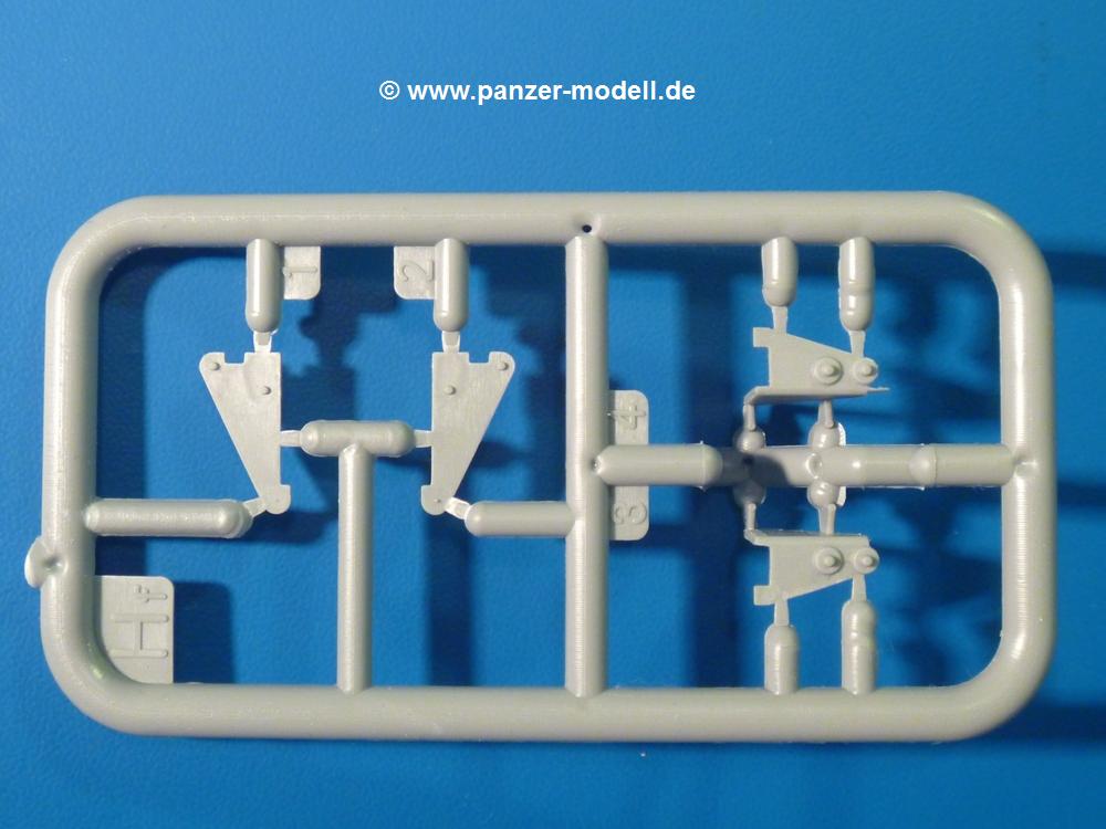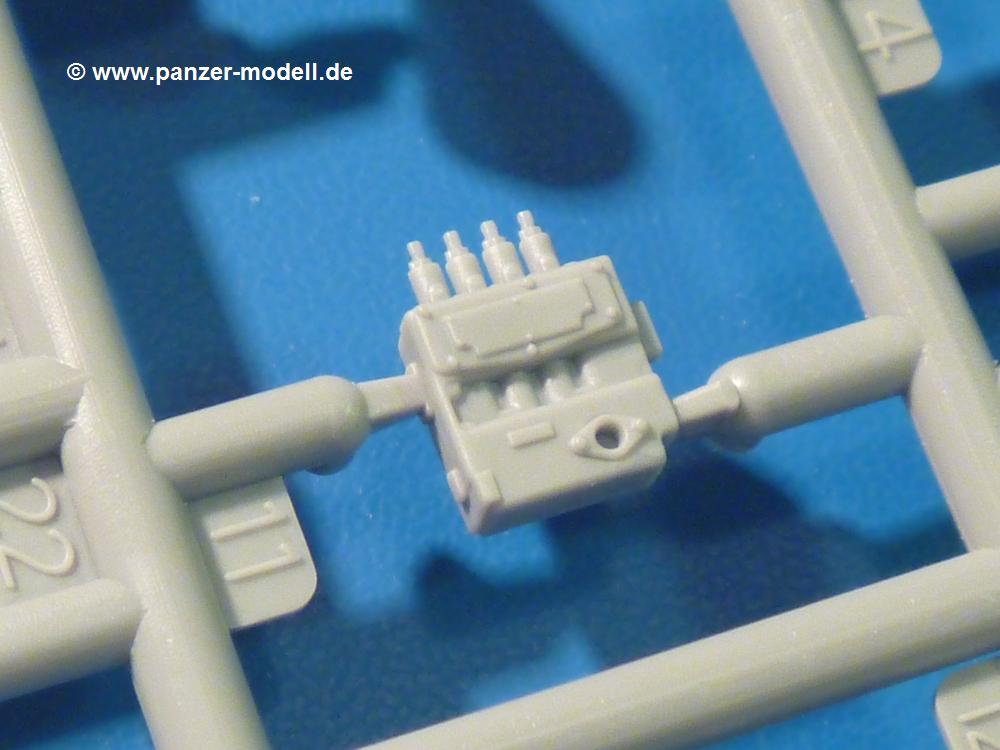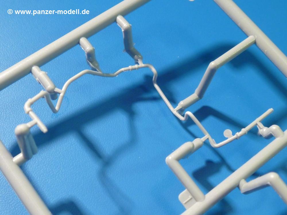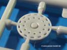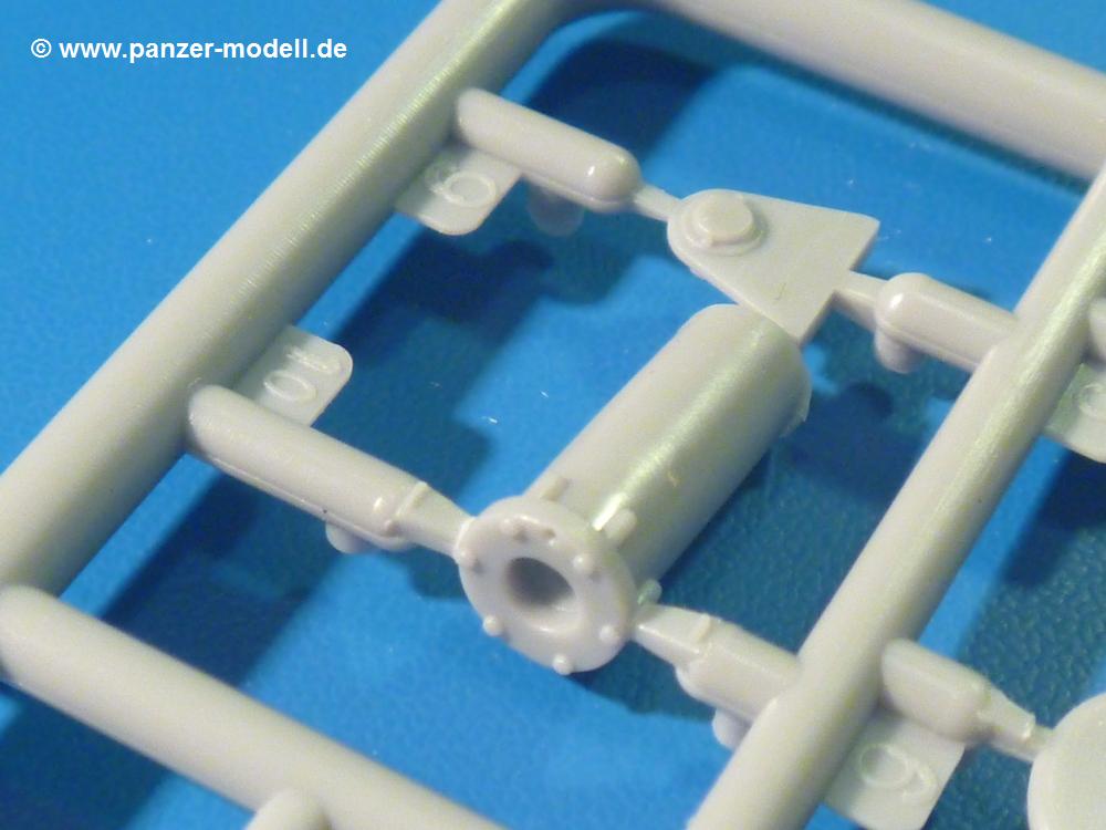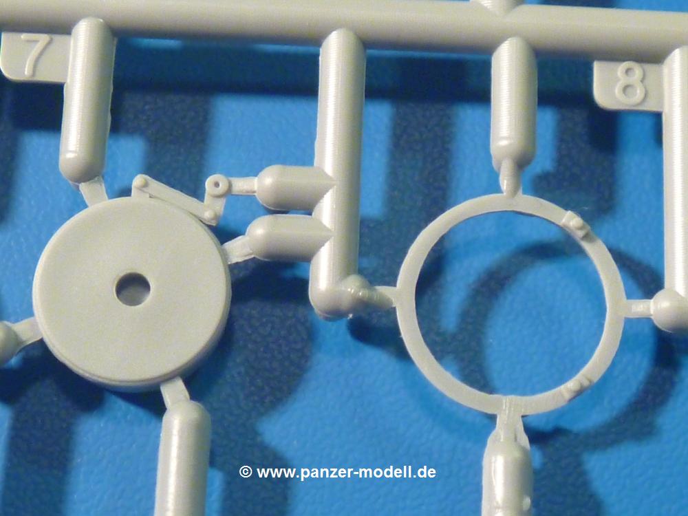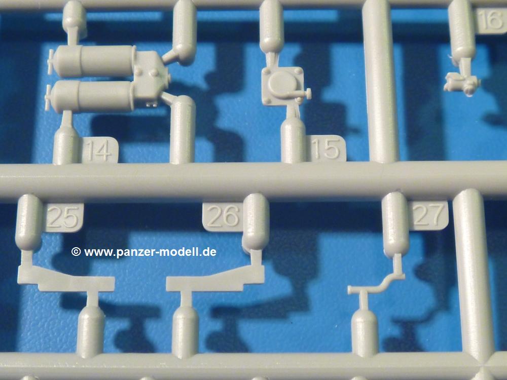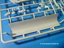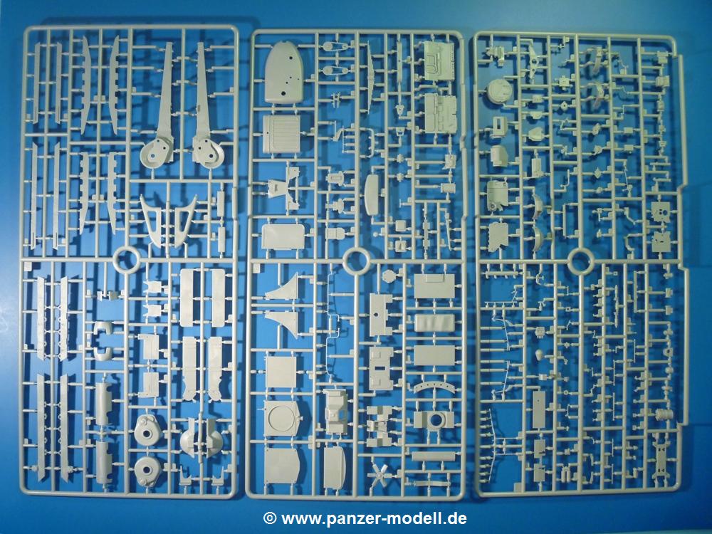 Die Teile aus hellgrauem Plastik sind sauber gespritzt, ohne Verzug und Versatz, hier und da minimaler Grat, keine Fischhäute, 1-2 minimale Sinkstellen. Auswerferspuren sind nur auf Innenseiten von Teilen vorhanden, so dass sie beim Zusammenbau verschwinden, ohn das man sie wegschleifen und verspachteln müsste. Viel Vorsicht muss man aufwenden, um manche filigrane Teile wie Gestänge zerstörungsfrei von den Spritzlingen zu lösen.Das Herzstück bilden die beiden Motoren. Schon der kleinere 2-Zylinder Benzinmotor macht ordentlich etwas her. Man kann sich an Details wie Bedienhebeln, Verschraubungen, Zündkerzen und erhabenen Gussnummern erfreuen. Interessantes Detail - der kleine Auspuffkrümmer mündet in den großen des Dieselmotors. Auch das Gestänge für die Anwurfkurbel auf der Motorhaube wurde nicht vergessen. Schon beim Motorenbau kommen die ersten Decals (Bedienhinweise) zum Einsatz. Das Auspuffendrohr erhält, anders als bei den Vorgängerversionen, einen dicken SchalldämpferAuf dem Motorblock des Dieselmotors prangt in erhabenen Buchstaben der Caterpillar Schriftzug. Zylinderkopfdeckel, Einspritzpumpe und separate -düsen, Keilriemen und -scheiben, Lüfterrad, Bedienhebel, Schläuche usw., usw. Man hat den Eindruck, dass kein Teil vergessen wurde. Der kleine Tank für den Benzinmotor findet seinen Platz an der Stirnseite des Dieselmotors. Der Ölmessstab der Ölwanne wird separat angebracht. Details über Details. Einige wenige PE Teile (3!) werden für feine Gestänge gebraucht. Technikbegeisterte werden voll auf ihre Kosten kommen und da es sich hier um eine teilgepanzerte Version handelt, beliebn als die schönen Details auch sichtbar.Der markante Kühler besteht aus 3 Bauteilen mit sehr feinen Kühlrippen.Am großen Kupplungsgehäuse sitzt das Getriebe, das in den großen Getriebekasten mit den Seitenabtrieben mündet. Am Getriebkasten sitzen auch die Längsträger. Auf deren Innenseiten sind einige Auswerfermarken zu finden, aber wie gesagt - auf den Innenseiten. Auch sitzen die Anschlüße der Laufrollenwagen am Getriebkasten. Diese werden ohne Kleben eingesetzt, d.h. man kann den D7 das Beinchen heben lassen wie beim Original, wenn die große Blattfeder nicht zu störisch sein wird. Dioramenbauer werden dies begrüßen.Es wird spannend werden, die vielen Hebel, Gestänge und Pedale in die richtige Position zu bringen. Einiges wird dabei unter den fein geriffelten Bodenblechen wieder verschwinden, aber sehen wir dies mit asiatischer Philosophie - "Der Weg ist das Ziel!".Der große Luftfilter befindet sich vor den Füßen des Fahrers. Der zylindrische Körper ist aus einem Stück gefertigt, also keine Naht, wo keine Naht sein sollte. Die Flügelmuttern zum Verschluß gibt es als Einzelteile.Am Heck werden die unteren Seiltrommeln der LeTourneau R7 Kraftsteuerung angebracht. Dies sind wohl die Überreste des LeTourneau XD7 Bulldozers, die nach Umrüstung auf Hydraulikbedienung des Räumschildes überiggeblieben sind und auch oft auf Originalaufnahmen noch zu sehen sind.Das Rückenteil des Fahrersitzes bildet der Tank für den Dieselmotor. Das Sitzpolster ist schön geformt mit leichten Wellen, wo der Fahrer sitzt. Der Fahrerplatz wird durch einen gepanzerten Aufbau geschützt. Er besteht aus den einzeln zusammenzufügenden Panzerplatten. Türen und Sichtluken werden separat angebaut und können geöffnet oder geschlossen dargestellt werden. Türgriffe und Bedienhebel der Sichtluken sind selbstverständlich vorhanden.Die Laufrollenwagen werden aus mehreren Längs- und Querträgern zusammengesetzt. Jedes Laufrollenpaar besteht aus 4, bzw. 6 Teilen und wird drehbar bleiben. Gleiches gilt für Antriebs- und Leiträder. Nur die Stützrollen werden fest verklebt. Der Federmechanismus für die Leiträder besteht aus Innen- und Außenfedern, die sehr schön (aus Plastik) geformt sind, dass es schon wieder ein Schande ist, die Abdeckungen überhaupt zu montieren. Die Einstellspindeln für die Leiträder erhalten trapezförmige Lager aus PE Teilen. Dazu müssen die Spindeln abgeschnitten und nach Montage der PE Teile wieder verklebt werden.Die einzigen Befestigungspunkte der Laufrollenwagen stellen zum einen die Gehäuse der Antriebsräder, die Auflage der Blattfeder und die dicken, bügelförmigen Halterungen dar.Der markante Kühlergrill gibt dem Traktor sein Gesicht. Er wird noch einmal durch ein zusätzliches Lochblech von vorn her geschützt. Links und rechts des Grills chließen Seitenbleche mit Caterpillar Aufdruck und den Hauptscheinwerfern an. Die Bleche decken aber nichts vom Motor ab. Man sieht auch nach der Endmontage zu ziemlich alles. Daran ändert auch die Motorhaube nichts. Die Scheinwerfer sind innen hohl mit angedeuteter Glühbirne und glasklaren Scheinwerfergläsern mit schöner Riffelung im Glas. Nach Montage der Haube setzt man nur noch das Aufpuffendstück und die Anlasserkurbel für den Benzinmotor auf. Bevor man die seitlichen Trittbleche montiert, sollte die Kette erst aufgezogen werden. Pro Seite nur 36 Kettenglieder, aber jedes Glied besteht aus 1 Bolzen, 2 Seitenführungen und 1 Auflage. Die Bauanleitung verspricht volle Beweglichkeit. Man muss nur vorsichtig mit dem Klebstoff umgehen.Ein Modell für sich stellt der LaPlant-Choate R71 Trailbuilder dar. Darunter ist die hydraulisch-verstellbare Räumschaufel zu verstehen. Die Hydraulikzylinder greifen über Hebel auf den C-Rahmen zu, der den Räumschild trägt. Auch wenn die Anleitung Klebstoff an Gelenken verbietet, sehe ich aber nicht, wie der Räumschild angehoben werden kann, wenn sich die Kolbenstangen der Hydraulikzylinder nicht ausfahren lassen. Allerdings bieten sich verschiedene Gestaltungsmöglichkeiten. Der überbreite Schild lässt sich in Geradeausstellung oder jeweils 30 Grad nach links oder rechts versetzt bauen. Mit den Zylindern allein ist es nicht getan. Hydraulikölbehälter und auch alle Leitungen zu den Zylindern und den Steuerelementen sind vorhanden.Die Abziehbilder (Decals) entha