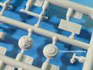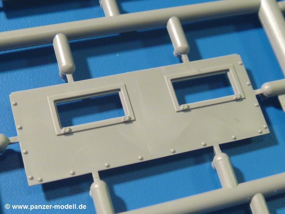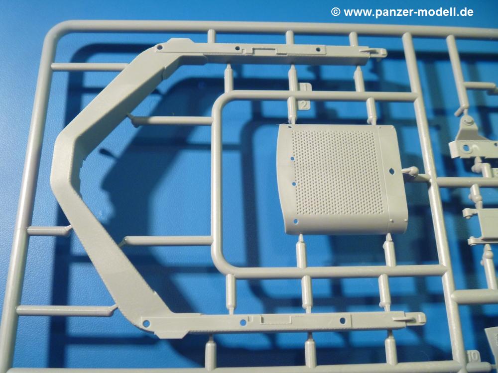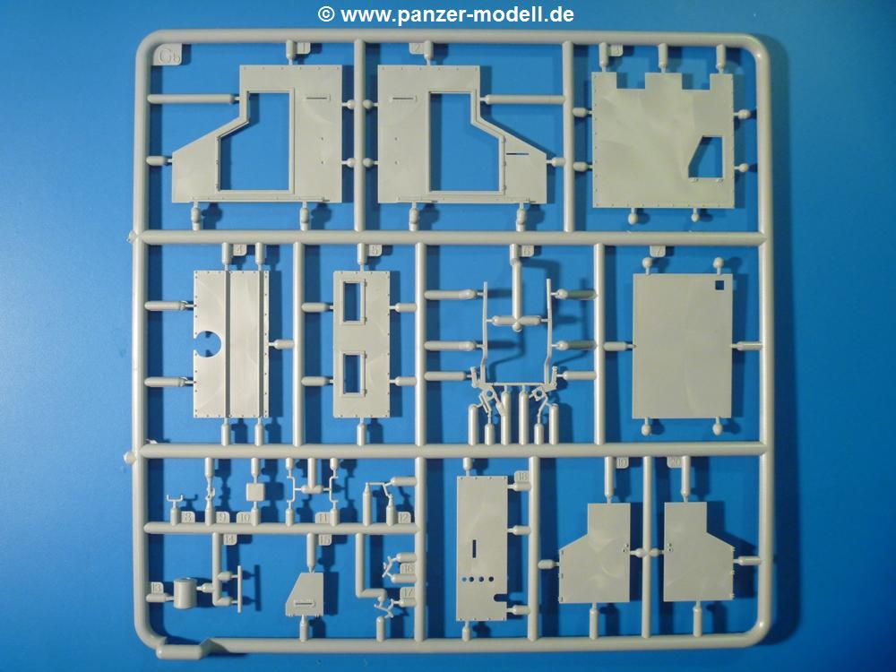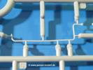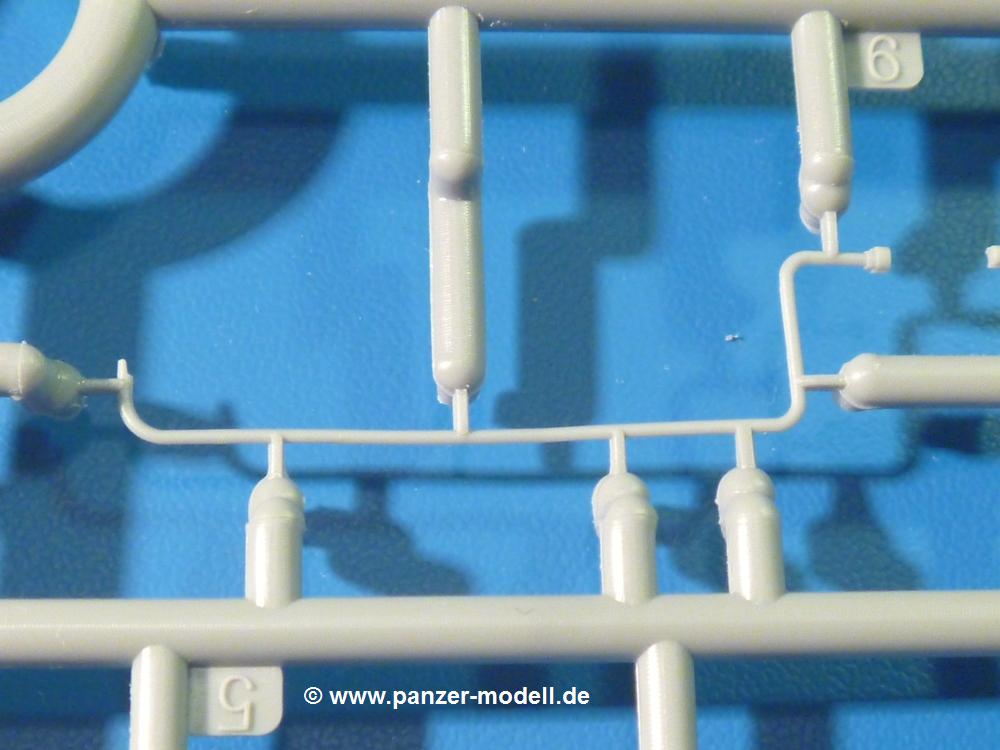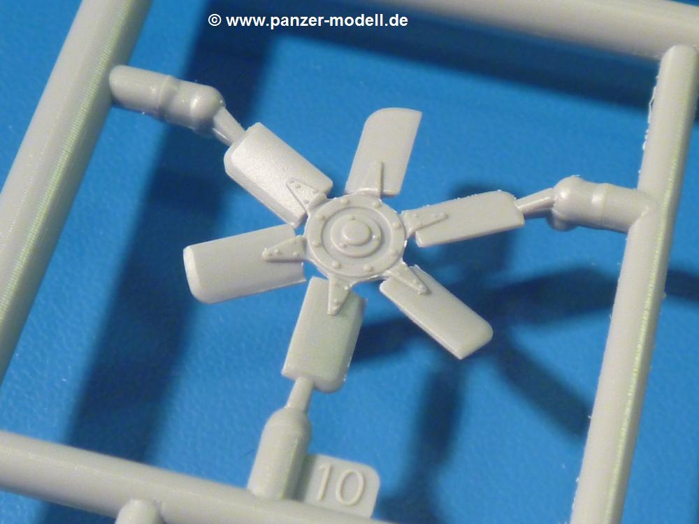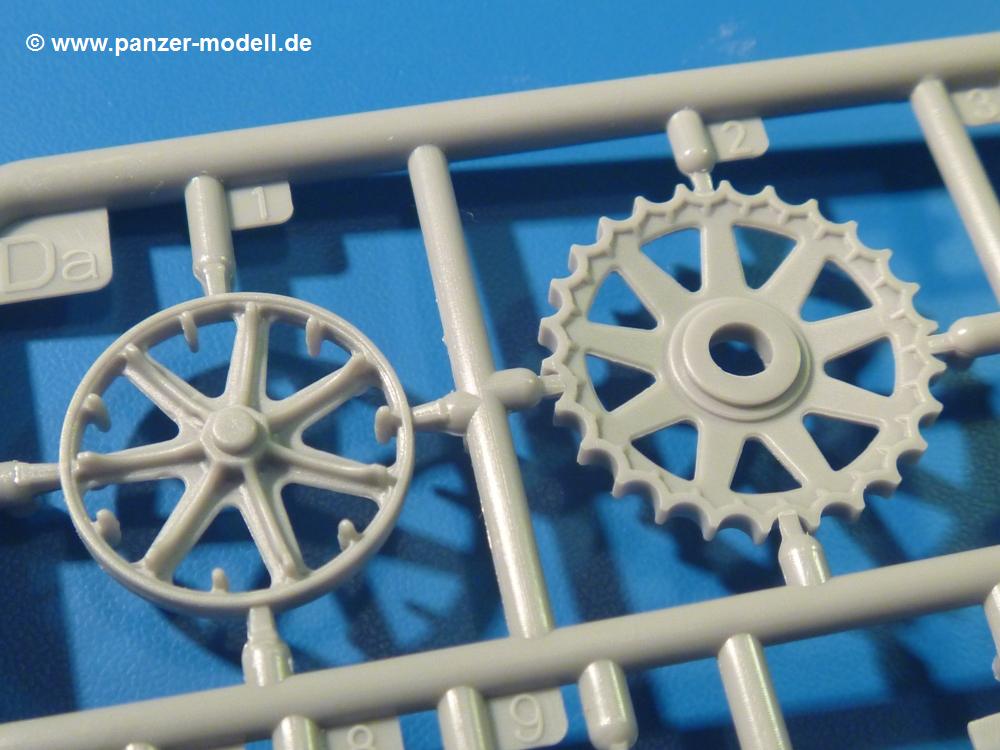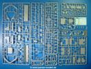 Die Teile aus hellgrauem Plastik sind sauber gespritzt, ohne Verzug und Versatz, hier und da minimaler Grat, keine Fischhäute, 1-2 minimale Sinkstellen. Auswerferspuren sind nur auf Innenseiten von Teilen vorhanden, so dass sie beim Zusammenbau verschwinden, ohn das man sie wegschleifen und verspachteln müsste. Viel Vorsicht muss man aufwenden, um manche filigrane Teile wie Gestänge zerstörungsfrei von den Spritzlingen zu lösen.Das Herzstück bilden die beiden Motoren. Schon der kleinere 2-Zylinder Benzinmotor macht ordentlich etwas her. Man kann sich an Details wie Bedienhebeln, Verschraubungen, Zündkerzen und erhabenen Gussnummern erfreuen. Interessantes Detail - der kleine Auspuffkrümmer mündet in den großen des Dieselmotors. Auch das Gestänge für die Anwurfkurbel auf der Motorhaube wurde nicht vergessen. Schon beim Motorenbau kommen die ersten Decals (Bedienhinweise) zum Einsatz. Das Auspuffendrohr erhält, anders als bei den Vorgängerversionen, einen dicken SchalldämpferAuf dem Motorblock des Dieselmotors prangt in erhabenen Buchstaben der Caterpillar Schriftzug. Zylinderkopfdeckel, Einspritzpumpe und separate -düsen, Keilriemen und -scheiben, Lüfterrad, Bedienhebel, Schläuche usw., usw. Man hat den Eindruck, dass kein Teil vergessen wurde. Der kleine Tank für den Benzinmotor findet seinen Platz an der Stirnseite des Dieselmotors. Der Ölmessstab der Ölwanne wird separat angebracht. Details über Details. Einige wenige PE Teile (3!) werden für feine Gestänge gebraucht. Technikbegeisterte werden voll auf ihre Kosten kommen und da es sich hier um eine teilgepanzerte Version handelt, beliebn als die schönen Details auch sichtbar.Der markante Kühler besteht aus 3 Bauteilen mit sehr feinen Kühlrippen.Am großen Kupplungsgehäuse sitzt das Getriebe, das in den großen Getriebekasten mit den Seitenabtrieben mündet. Am Getriebkasten sitzen auch die Längsträger. Auf deren Innenseiten sind einige Auswerfermarken zu finden, aber wie gesagt - auf den Innenseiten. Auch sitzen die Anschlüße der Laufrollenwagen am Getriebkasten. Diese werden ohne Kleben eingesetzt, d.h. man kann den D7 das Beinchen heben lassen wie beim Original, wenn die große Blattfeder nicht zu störisch sein wird. Dioramenbauer werden dies begrüßen.Es wird spannend werden, die vielen Hebel, Gestänge und Pedale in die richtige Position zu bringen. Einiges wird dabei unter den fein geriffelten Bodenblechen wieder verschwinden, aber sehen wir dies mit asiatischer Philosophie - "Der Weg ist das Ziel!".Der große Luftfilter befindet sich vor den Füßen des Fahrers. Der zylindrische Körper ist aus einem Stück gefertigt, also keine Naht, wo keine Naht sein sollte. Die Flügelmuttern zum Verschluß gibt es als Einzelteile.Am Heck werden die unteren Seiltrommeln der LeTourneau R7 Kraftsteuerung angebracht. Dies sind wohl die Überreste des LeTourneau XD7 Bulldozers, die nach Umrüstung auf Hydraulikbedienung des Räumschildes überiggeblieben sind und auch oft auf Originalaufnahmen noch zu sehen sind.Das Rückenteil des Fahrersitzes bildet der Tank für den Dieselmotor. Das Sitzpolster ist schön geformt mit leichten Wellen, wo der Fahrer sitzt. Der Fahrerplatz wird durch einen gepanzerten Aufbau geschützt. Er besteht aus den einzeln zusammenzufügenden Panzerplatten. Türen und Sichtluken werden separat angebaut und können geöffnet oder geschlossen dargestellt werden. Türgriffe und Bedienhebel der Sichtluken sind selbstverständlich vorhanden.Die Laufrollenwagen werden aus mehreren Längs- und Querträgern zusammengesetzt. Jedes Laufrollenpaar besteht aus 4, bzw. 6 Teilen und wird drehbar bleiben. Gleiches gilt für Antriebs- und Leiträder. Nur die Stützrollen werden fest verklebt. Der Federmechanismus für die Leiträder besteht aus Innen- und Außenfedern, die sehr schön (aus Plastik) geformt sind, dass es schon wieder ein Schande ist, die Abdeckungen überhaupt zu montieren. Die Einstellspindeln für die Leiträder erhalten trapezförmige Lager aus PE Teilen. Dazu müssen die Spindeln abgeschnitten und nach Montage der PE Teile wieder verklebt werden.Die einzigen Befestigungspunkte der Laufrollenwagen stellen zum einen die Gehäuse der Antriebsräder, die Auflage der Blattfeder und die dicken, bügelförmigen Halterungen dar.Der markante Kühlergrill gibt dem Traktor sein Gesicht. Er wird noch einmal durch ein zusätzliches Lochblech von vorn her geschützt. Links und rechts des Grills chließen Seitenbleche mit Caterpillar Aufdruck und den Hauptscheinwerfern an. Die Bleche decken aber nichts vom Motor ab. Man sieht auch nach der Endmontage zu ziemlich alles. Daran ändert auch die Motorhaube nichts. Die Scheinwerfer sind innen hohl mit angedeuteter Glühbirne und glasklaren Scheinwerfergläsern mit schöner Riffelung im Glas. Nach Montage der Haube setzt man nur noch das Aufpuffendstück und die Anlasserkurbel für den Benzinmotor auf. Bevor man die seitlichen Trittbleche montiert, sollte die Kette erst aufgezogen werden. Pro Seite nur 36 Kettenglieder, aber jedes Glied besteht aus 1 Bolzen, 2 Seitenführungen und 1 Auflage. Die Bauanleitung verspricht volle Beweglichkeit. Man muss nur vorsichtig mit dem Klebstoff umgehen.Ein Modell für sich stellt der LaPlant-Choate R71 Trailbuilder dar. Darunter ist die hydraulisch-verstellbare Räumschaufel zu verstehen. Die Hydraulikzylinder greifen über Hebel auf den C-Rahmen zu, der den Räumschild trägt. Auch wenn die Anleitung Klebstoff an Gelenken verbietet, sehe ich aber nicht, wie der Räumschild angehoben werden kann, wenn sich die Kolbenstangen der Hydraulikzylinder nicht ausfahren lassen. Allerdings bieten sich verschiedene Gestaltungsmöglichkeiten. Der überbreite Schild lässt sich in Geradeausstellung oder jeweils 30 Grad nach links oder rechts versetzt bauen. Mit den Zylindern allein ist es nicht getan. Hydraulikölbehälter und auch alle Leitungen zu den Zylindern und den Steuerelementen sind vorhanden.Die Abziehbilder (Decals) entha