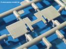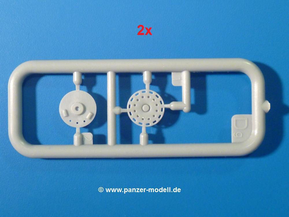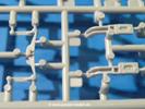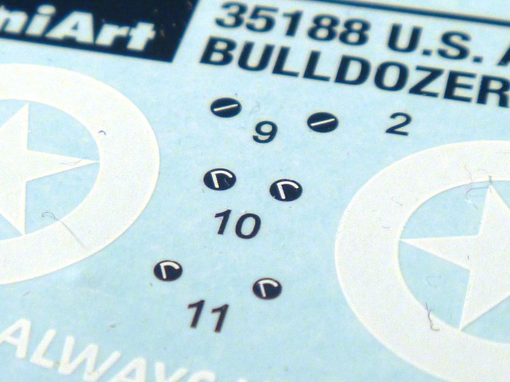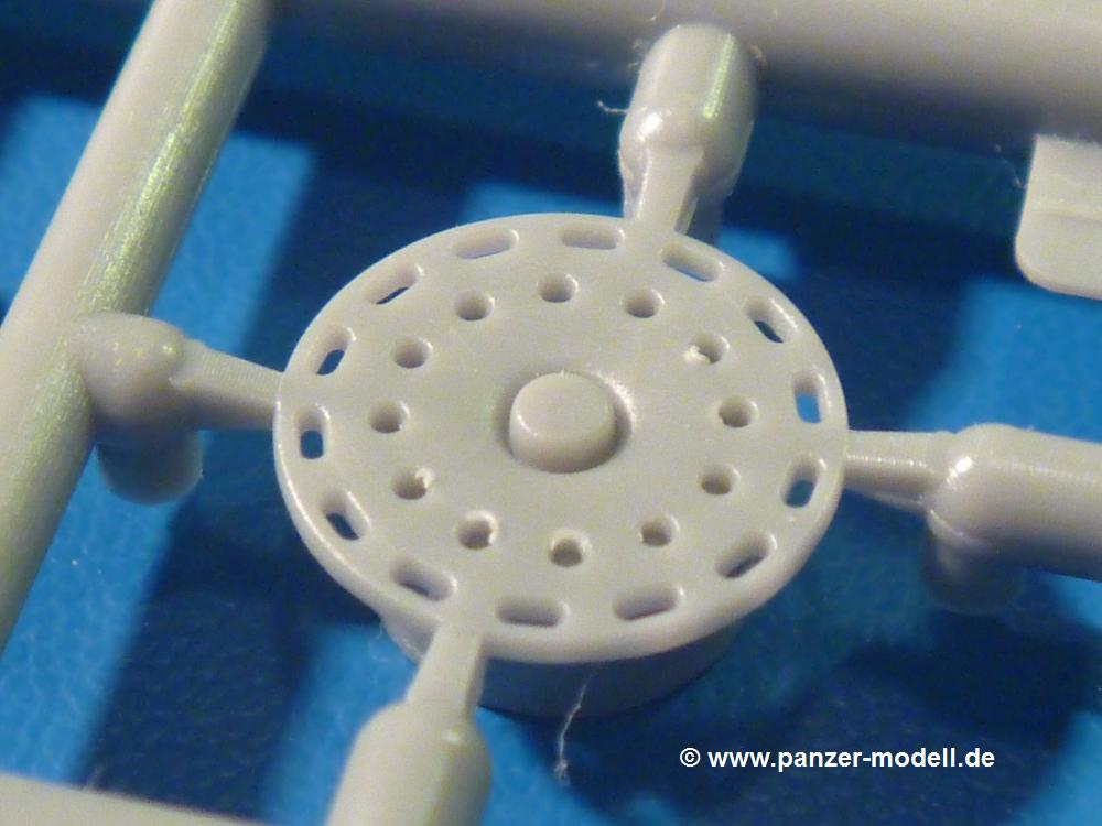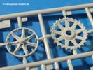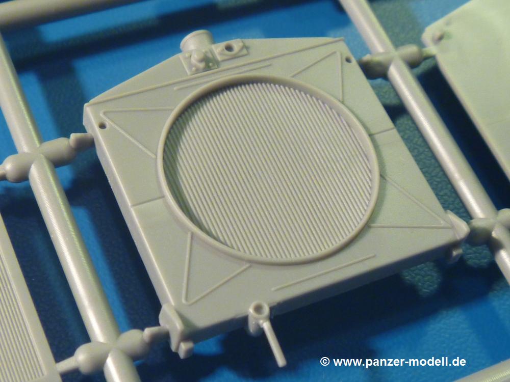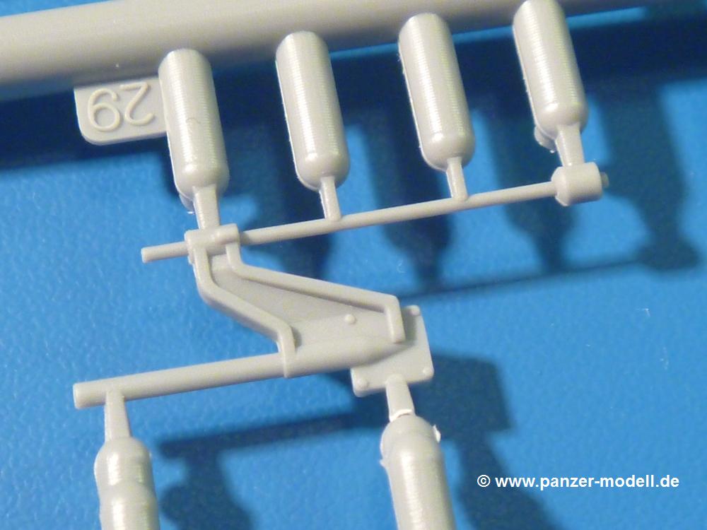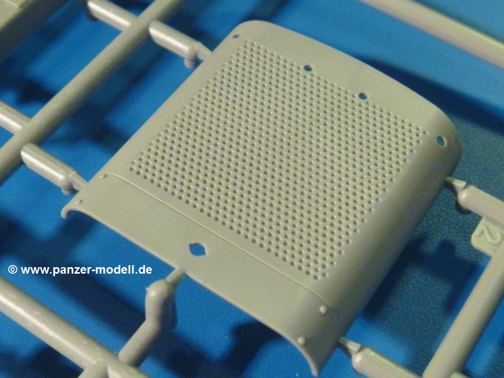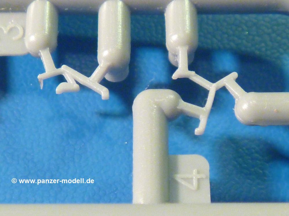 Die Teile aus hellgrauem Plastik sind sauber gespritzt, ohne Verzug und Versatz, hier und da minimaler Grat, keine Fischhäute, 1-2 minimale Sinkstellen. Auswerferspuren sind nur auf Innenseiten von Teilen vorhanden, so dass sie beim Zusammenbau verschwinden, ohn das man sie wegschleifen und verspachteln müsste. Viel Vorsicht muss man aufwenden, um manche filigrane Teile wie Gestänge zerstörungsfrei von den Spritzlingen zu lösen.Das Herzstück bilden die beiden Motoren. Schon der kleinere 2-Zylinder Benzinmotor macht ordentlich etwas her. Man kann sich an Details wie Bedienhebeln, Verschraubungen, Zündkerzen und erhabenen Gussnummern erfreuen. Interessantes Detail - der kleine Auspuffkrümmer mündet in den großen des Dieselmotors. Auch das Gestänge für die Anwurfkurbel auf der Motorhaube wurde nicht vergessen. Schon beim Motorenbau kommen die ersten Decals (Bedienhinweise) zum Einsatz. Das Auspuffendrohr erhält, anders als bei den Vorgängerversionen, einen dicken SchalldämpferAuf dem Motorblock des Dieselmotors prangt in erhabenen Buchstaben der Caterpillar Schriftzug. Zylinderkopfdeckel, Einspritzpumpe und separate -düsen, Keilriemen und -scheiben, Lüfterrad, Bedienhebel, Schläuche usw., usw. Man hat den Eindruck, dass kein Teil vergessen wurde. Der kleine Tank für den Benzinmotor findet seinen Platz an der Stirnseite des Dieselmotors. Der Ölmessstab der Ölwanne wird separat angebracht. Details über Details. Einige wenige PE Teile (3!) werden für feine Gestänge gebraucht. Technikbegeisterte werden voll auf ihre Kosten kommen und da es sich hier um eine teilgepanzerte Version handelt, beliebn als die schönen Details auch sichtbar.Der markante Kühler besteht aus 3 Bauteilen mit sehr feinen Kühlrippen.Am großen Kupplungsgehäuse sitzt das Getriebe, das in den großen Getriebekasten mit den Seitenabtrieben mündet. Am Getriebkasten sitzen auch die Längsträger. Auf deren Innenseiten sind einige Auswerfermarken zu finden, aber wie gesagt - auf den Innenseiten. Auch sitzen die Anschlüße der Laufrollenwagen am Getriebkasten. Diese werden ohne Kleben eingesetzt, d.h. man kann den D7 das Beinchen heben lassen wie beim Original, wenn die große Blattfeder nicht zu störisch sein wird. Dioramenbauer werden dies begrüßen.Es wird spannend werden, die vielen Hebel, Gestänge und Pedale in die richtige Position zu bringen. Einiges wird dabei unter den fein geriffelten Bodenblechen wieder verschwinden, aber sehen wir dies mit asiatischer Philosophie - "Der Weg ist das Ziel!".Der große Luftfilter befindet sich vor den Füßen des Fahrers. Der zylindrische Körper ist aus einem Stück gefertigt, also keine Naht, wo keine Naht sein sollte. Die Flügelmuttern zum Verschluß gibt es als Einzelteile.Am Heck werden die unteren Seiltrommeln der LeTourneau R7 Kraftsteuerung angebracht. Dies sind wohl die Überreste des LeTourneau XD7 Bulldozers, die nach Umrüstung auf Hydraulikbedienung des Räumschildes überiggeblieben sind und auch oft auf Originalaufnahmen noch zu sehen sind.Das Rückenteil des Fahrersitzes bildet der Tank für den Dieselmotor. Das Sitzpolster ist schön geformt mit leichten Wellen, wo der Fahrer sitzt. Der Fahrerplatz wird durch einen gepanzerten Aufbau geschützt. Er besteht aus den einzeln zusammenzufügenden Panzerplatten. Türen und Sichtluken werden separat angebaut und können geöffnet oder geschlossen dargestellt werden. Türgriffe und Bedienhebel der Sichtluken sind selbstverständlich vorhanden.Die Laufrollenwagen werden aus mehreren Längs- und Querträgern zusammengesetzt. Jedes Laufrollenpaar besteht aus 4, bzw. 6 Teilen und wird drehbar bleiben. Gleiches gilt für Antriebs- und Leiträder. Nur die Stützrollen werden fest verklebt. Der Federmechanismus für die Leiträder besteht aus Innen- und Außenfedern, die sehr schön (aus Plastik) geformt sind, dass es schon wieder ein Schande ist, die Abdeckungen überhaupt zu montieren. Die Einstellspindeln für die Leiträder erhalten trapezförmige Lager aus PE Teilen. Dazu müssen die Spindeln abgeschnitten und nach Montage der PE Teile wieder verklebt werden.Die einzigen Befestigungspunkte der Laufrollenwagen stellen zum einen die Gehäuse der Antriebsräder, die Auflage der Blattfeder und die dicken, bügelförmigen Halterungen dar.Der markante Kühlergrill gibt dem Traktor sein Gesicht. Er wird noch einmal durch ein zusätzliches Lochblech von vorn her geschützt. Links und rechts des Grills chließen Seitenbleche mit Caterpillar Aufdruck und den Hauptscheinwerfern an. Die Bleche decken aber nichts vom Motor ab. Man sieht auch nach der Endmontage zu ziemlich alles. Daran ändert auch die Motorhaube nichts. Die Scheinwerfer sind innen hohl mit angedeuteter Glühbirne und glasklaren Scheinwerfergläsern mit schöner Riffelung im Glas. Nach Montage der Haube setzt man nur noch das Aufpuffendstück und die Anlasserkurbel für den Benzinmotor auf. Bevor man die seitlichen Trittbleche montiert, sollte die Kette erst aufgezogen werden. Pro Seite nur 36 Kettenglieder, aber jedes Glied besteht aus 1 Bolzen, 2 Seitenführungen und 1 Auflage. Die Bauanleitung verspricht volle Beweglichkeit. Man muss nur vorsichtig mit dem Klebstoff umgehen.Ein Modell für sich stellt der LaPlant-Choate R71 Trailbuilder dar. Darunter ist die hydraulisch-verstellbare Räumschaufel zu verstehen. Die Hydraulikzylinder greifen über Hebel auf den C-Rahmen zu, der den Räumschild trägt. Auch wenn die Anleitung Klebstoff an Gelenken verbietet, sehe ich aber nicht, wie der Räumschild angehoben werden kann, wenn sich die Kolbenstangen der Hydraulikzylinder nicht ausfahren lassen. Allerdings bieten sich verschiedene Gestaltungsmöglichkeiten. Der überbreite Schild lässt sich in Geradeausstellung oder jeweils 30 Grad nach links oder rechts versetzt bauen. Mit den Zylindern allein ist es nicht getan. Hydraulikölbehälter und auch alle Leitungen zu den Zylindern und den Steuerelementen sind vorhanden.Die Abziehbilder (Decals) entha