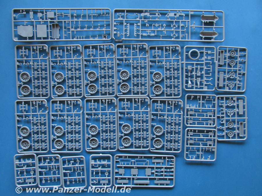 Man muss allerdings dazu sagen, dass der Großteil der Spritzlinge klein und nur mit wenigen Teilen sind. Dennoch ist die Teileanzahl des Bausatzes mit über 650 schon recht gewaltig. Das liegt nicht nur an der beweglichen Einzelgliedkette sondern auch am Innenraum und des Motors!
