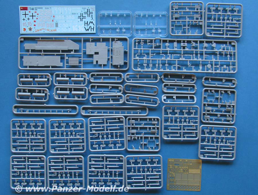 Im Bausatz enthalten sind insgesamt 55(!) Spritzlinge in grau, 2 Spritzlinge in durchsichtigem Plastik, 6 Stränge mit Kettengliedern,eine PE Platine und ein Decalbogen.