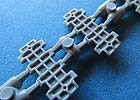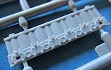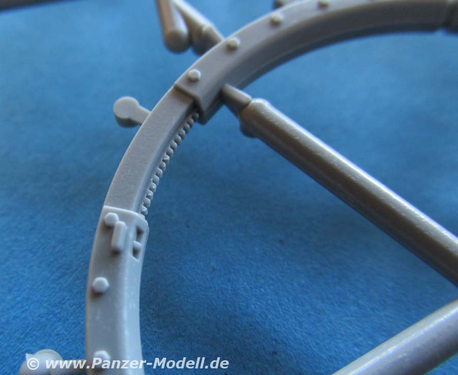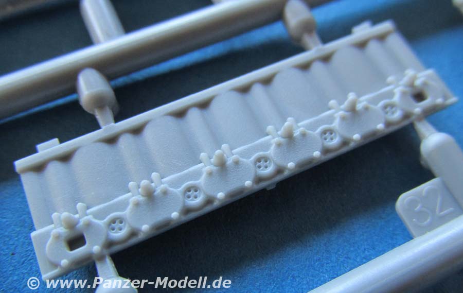Die Einzelgliedkette macht einen guten Eindruck, wennauch der Zusammenbau ziemlich aufwändig erscheint. Die Details und Darstellung der Kettenglieder sind sehr gut, sogar eine Gussnummer ist auf jedem Glied zu finden. Aber jedes Kettenglied muss von 4 Angüssen getrennt und versäubert werden. Die Kettengleider werden abwechselnd mit einem Glied mit und einem ohne Führungszahn zusammengesteckt - ja gesteckt. Angeblich sollen die Ketten ohne Klebstoff einfach zusammengeklickt werden und bleiben beweglich.