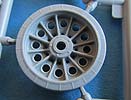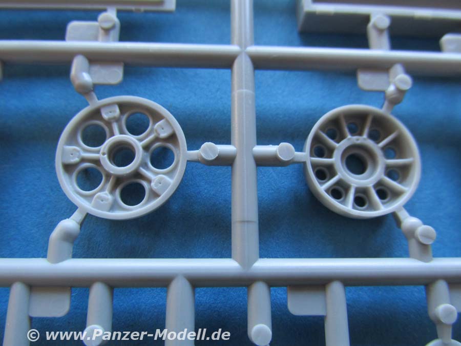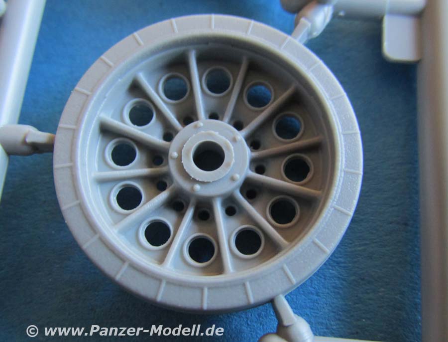 Das Laufwerk setzt sich aus schönen Doppellaifrollen, sowie Treib und Leiträdern zusammen. Hier sticht beim Vergleich mit Originalfotos (Dank an Dierk Schmidt) ins Auge, dass das Leitrad offenbar zu groß ist - und beim Blick auf die Fotos des gebauten Modells bei Miniart erweckt den Eindruck, dass das Laufwerk insgesamt zu stark eingefedert dargestellt ist - letzteres kann der findige Modellbauer sicher korrigieren.