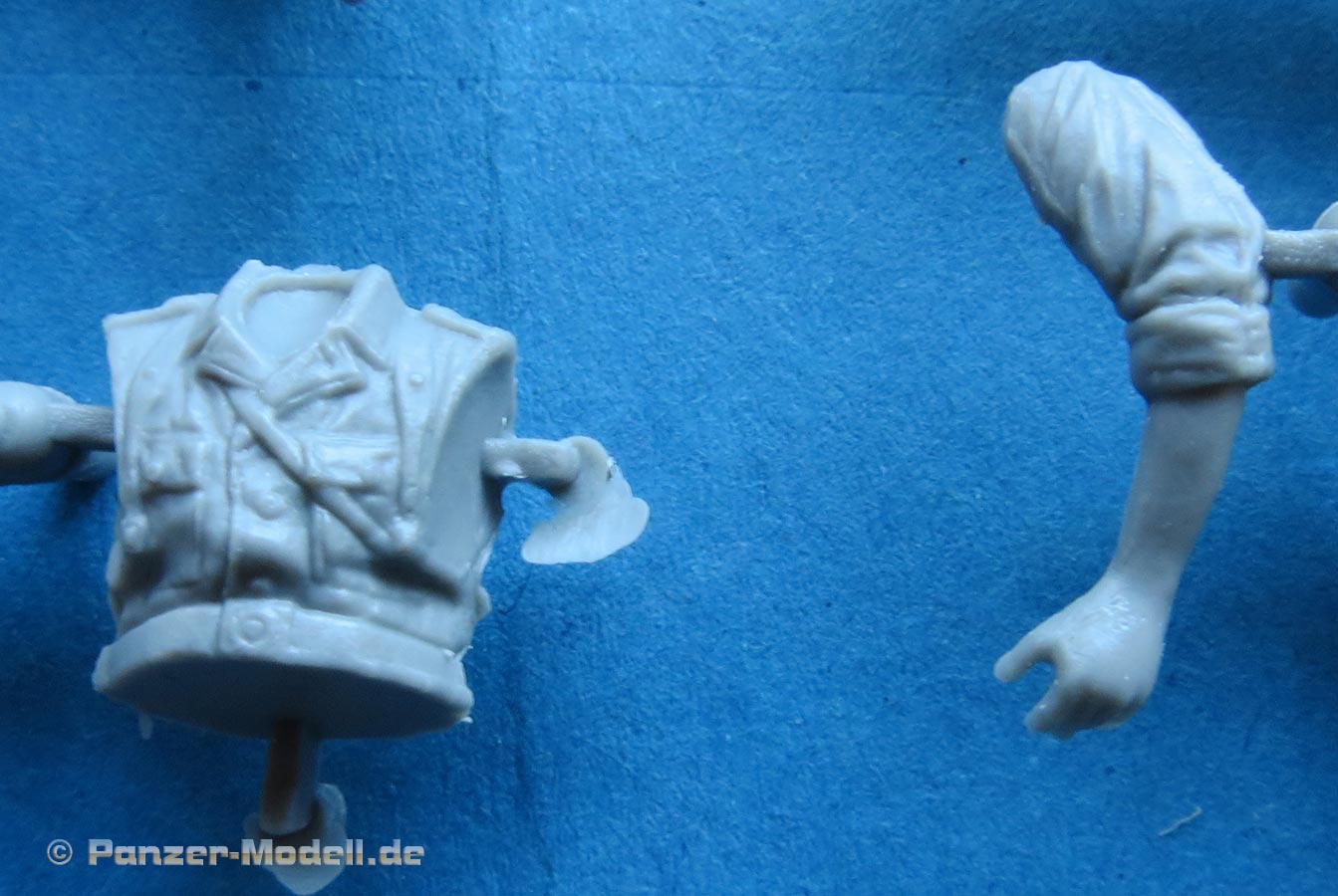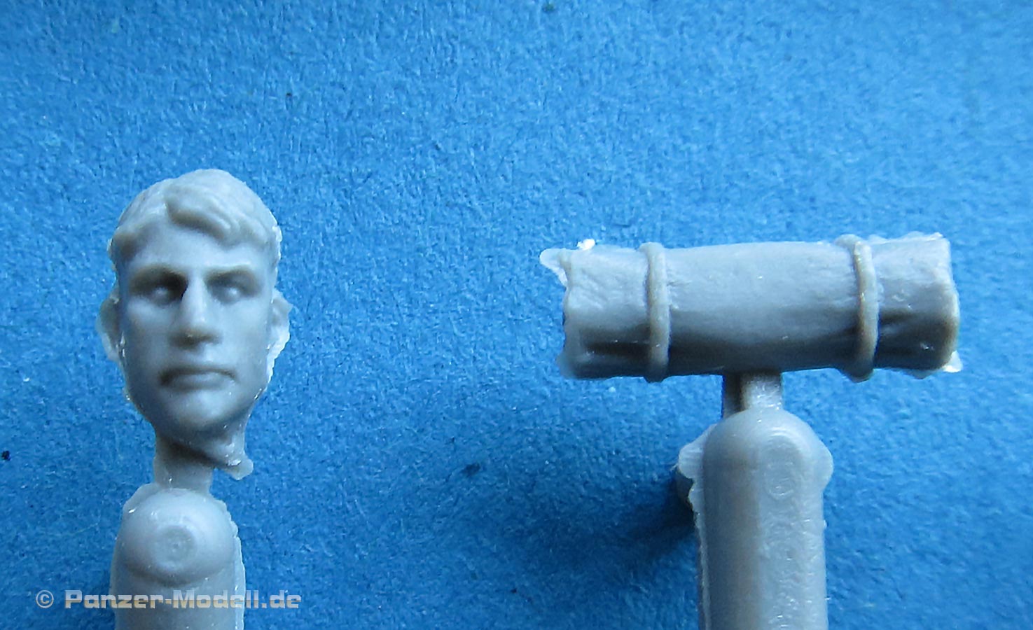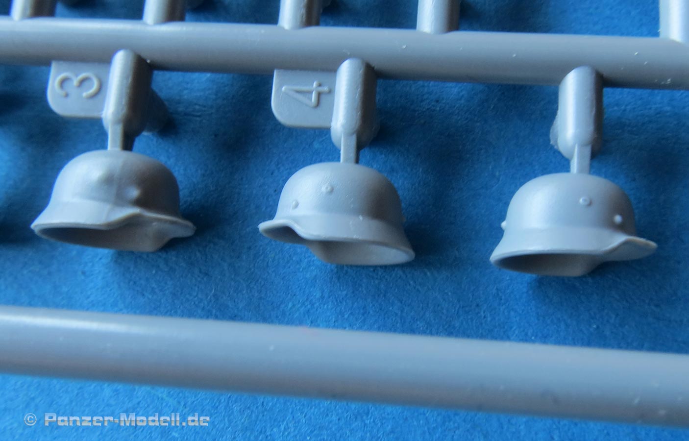 MiniArt hat uns schon mit vielen, interessanten und nützlichen Figurensets versorgt. Heute haben wir einen Satz mit 4 deutschen Infanteristen bei des Rast. Wieder tut sich Miniart hervor indem es auch abseits der ausgetretenen Pfade die Bedürfnisse bedient und somit neben den üblichen Figurenposen nun eben auch Soldaten in der Etappe zeigt. Die Teile aus grauem Plastik sind sauber gespritzt, ohne Verzug und Versatz, keine Sinkstellen. Die Angüsse sind akzeptabel und so gesetzt, dass sie beim Abtrennen vom Spritzling und beim Versäubern keine Probleme bereiten. Ja, Nahaufnahmen können brutal sein, aber der Grat an der Formtrennnaht ist sehr fein und wird sich schon beim Anblick des Bastelmessers verabschieden. Die Gesichter der Soldaten sind individuell gestaltet, mit gut gemachten Gesichtszügen, vor allem wenn man die Unzulänglichkeiten von Spritzguss dabei berücksichtigt werden. Auch schön ist die Darstellung der Haare, denn alle 4 Köpfe sind ohne Kopfbedeckung gemacht, was den lockeren Pausenchrakter der Szene unterstreicht. Insgesamt ein sehr schönes Set, das so manche Szene auflockern kann.