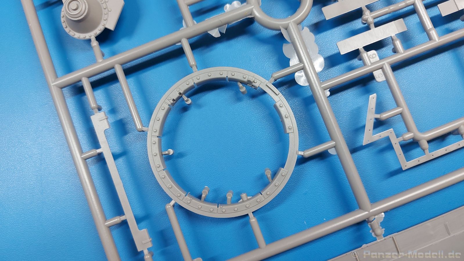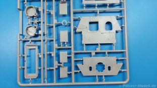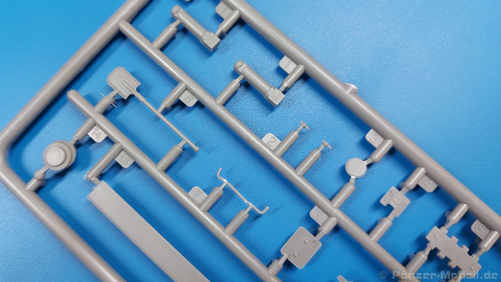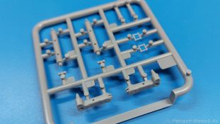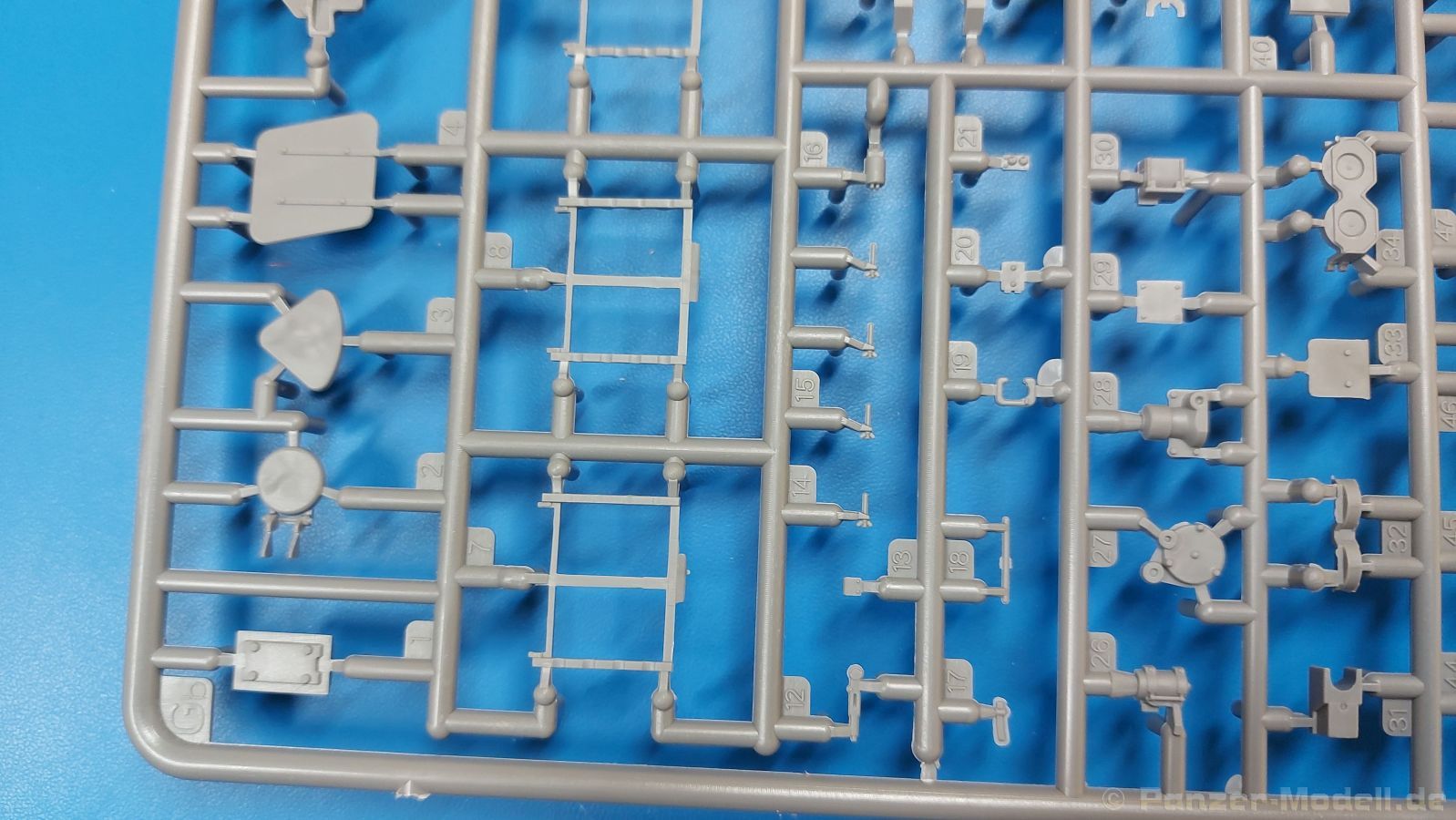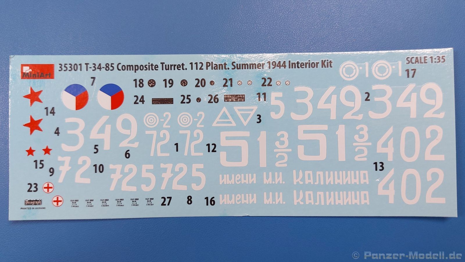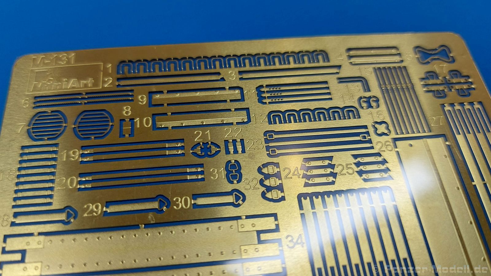 Das Original: Es gibt wohl kaum einen Militärmodellbauer, der den sowjetischen T-34 nicht kennt. Als einer der meistgebauten und am längsten im Einsatz befindlichen Panzer kann man ihn nicht übersehen. Seine Produktion zog sich von 1940 bis 1955 mit über 60.000 gebauten Exemplaren, die große Masse davon in den Jahren 1940-45. Seine schräge Panzerung war ein Novum der Zeit und bereitete den deutschen Gegnern einiges Kopfzerbrechen. Anfangs war er mit 2 MG und einer 76mm Kanone ausgerüstet, ab 1944 bekam er einen größeren Turm mit 85mm Kanone und ebenfalls 2 MG. Sein 500 PS Motor konnte ihn auf über 50 km/h beschleunigen. Der Bausatz: Die ukrainische Firma MiniArt startete mit etlichen Modellen auf Basis des T-34 Fahrgestells wie die SU-122 und SU-85 Bausätzen, Laufwerken, Ketten und dem Motor V-2-34 samt Getriebe. Mittlerweile gibt es auch vom T-34 selbst jede Menge Bausätze mit und ohne Interior (T-34/85 MiniArt). Heute beschäftigen wir uns mit dem innen und außen voll ausgestatteten Bausatz Nr. 35301, dessen Original gegen Ende des 2. Weltkrieges eingesetzt wurde. Der 385 x 240 x 90 mm groÃe Karton mit Stülpdeckel ist bis zum Rand vollgestopft mit 76(!) hellgrauen, 2 Klarsichtspritzlingen, 1 PE-Platine und einem Decalsheet. MiniArt hat sich über die Jahre einen echten Namen gemacht und ist unter den Herstellern im Plastikmodellbau nicht mehr wegzudenken. Das spiegelt sich in der Qualität wider. Sauber gespritzte und filigrane Teile sind die Norm. Verzug oder Versatz konnte ich nicht entdecken. Dennoch gibt es etwas Grat, größer zum Glück nur an Gießästen, feiner Grat nur hier und da. Ich denke mal, dass einige Formen für mehrere verschiedene Bausätze genutzt wurden und so ein paar Durchgänge mehr hinter sich haben. Die Auswerfer sind fast ausnahmslos auf die Spritzrahmen gesetzt, so dass die Teile so gut wie keine Spuren davon aufweisen, bzw. nur an Stellen, die nach dem Zusammenbau nicht mehr zu sehen sind. Die Wanne ist unterteilt in Boden, Seiten- und Trennwände, welches den Einbau der Inneneinrichtung erheblich erleichtert. Motor und Getriebe gibt es ja als Bausatz Nr. 35205 separat zu kaufen. Hier fehlt nichts! Lagerböcke, Zylinderköpfe, Zuluft-, Abgaskanäle, Auspuffrohre, Kühlschläuche, Kühler, Lichtmaschine, Einspritzpumpe, Elektromotor für Lüfterrad, Lüfterrad, Luftfilter, Steuerstangen, Lenkbremsen - aus meiner Sicht fast alles da bis auf Einspritzleitungen und Verkabelung. Die Struktur der Kühlerrippen ist sehr fein. Dies gilt auch für den Zahnkranz des Lüfterrades. Auf dem Wannenboden angegossen findet man vom Fahrerplatz bis zu den Lenkbremsen das entsprechende Gestänge. Die Tanks sind mit Einfüllschrauben versehen und auch die eingepressten Versteifungsrippen sind vorhanden. Schaut man sich die Oberwanne dann mal an, findet man so einige Schraubenlöcher, die dort zu finden sind, wo Motor-, bzw. Kühlerabdeckungen normalerweise angebracht sind. Wenn man also z.B. für eine Wartungsszene die Abdeckungen weglässt, sind die Schraubenlöcher da. Eine absolut realistische Darstellung. Die Zu- und Abluftöffnungen sind durchbrochen. Hier kann man die Windleitbleche entsprechend positioniert einbauen. Den Zuluftdeckel über dem Lüfterrad hat man durchbrochen dargestellt. In die Öffnung werden dann aus PE-Teilen der Halterahmen und das Gitter eingesetzt. Die große Heckplatte, die auch abgeklappt angebaut werden kann, enthält die Öffnungen für die Auspuffrohre und eine große Wartungsöffnung. Auch hier findet man an den entsprechenden Stellen Schraubenlöcher, wenn man diese Deckel auflassen möchte. An der Innenseite der Heckplatte sind die Verschraubungen der Auspuffpanzerungen vorhanden. Der Kampfraum unterteilt sich in den Platz für Fahrer/Bug-MG Schütze und den Turmbereich. Der Fahrerplatz ist voll ausgestattet - Sitz, Bedien- und Schalthebel, Pedale, Armaturen, Feuerlöscher, Axt, Hammer, Halterungen mit Trommelmagazinen für das Bug-MG, Pressluftflaschen und jede Menge Gestänge. Für den Armaturen sind Decals im Bausatz enthalten. Die Fahrerluke bekommt Winkelspiegel aus Klarsichtmaterial. Alle Außen- und Innendetails inkl. Verriegelungen sind vorhanden. Baut man die Klappe offen, muss man nur den entsprechenden Öffnerzylinder anbauen. Über der Fahrerluke erkennt man die Kopfpolsterung für den Fahrer. Das Bug-MG kann wohl voll beweglich mit der Kugelblende eingebaut werden. Hier wollen 8 Teile sauber zusammengefügt werden. Sehr schön die Struktur des MG-Doms. In der Wanne unter dem Turm finden große Munitionsbehälter Platz, die gleichzeitig den Laufboden der Turmbesatzung darstellen. Die Rückwand zwischen Kampf- und Motorraum ist schon mit allerlei Details versehen. Für die vier verschiedenen Munitionsarten gibt es entsprechende Halterungen sowohl in der Wanne als auch im Turm. Der Bausatz enthält 24 sichtbare Patronen. Die 16 im Turmheck sind einzeln. Man kann da also welche weglassen, um etwas Verbrauch darzustellen. Da sind wir also beim Turm, der sich von anderen Türmen unterscheidet, wenn man die untere Turmkante beachtet. Während sie normalerweise rundum gerundet ist, ist sie beim zusammengesetzten (composite)œ Turm im Heckbereich gerade heruntergezogen. Das Turmdach zeigt uns im Inneren zwei sehr schöne Lüfter, die mit PE-Gittern versehen werden. Zudem gibt es noch einige angegossene Leitungen, die zu Kampfraumleuchten aus Klarsichtmaterial führen. Ebenfalls aus kristallklarem Material sind die Winkelspiegel im Dach und der Kommandatenluke und die Sichtblöcke der Kommandantenkuppel. Sowohl Kommandantenluke als auch Ladeschützenluke können offen oder geschlossen gebaut werden. Kleines Gimmick - die Verriegelungsnase der Ladeschützenluke bei hochgestellter Luke. Die inneren Turmseitenwände werden mit Schaltkästen, Werkzeug, Munitionshalterungen ausgestattet, bevor man die Wände in den Turm einklebt. So kann man diese bereits vorher problemlos bemalen, ohne dann im Turm kämpfenœ zu müssen. Was 