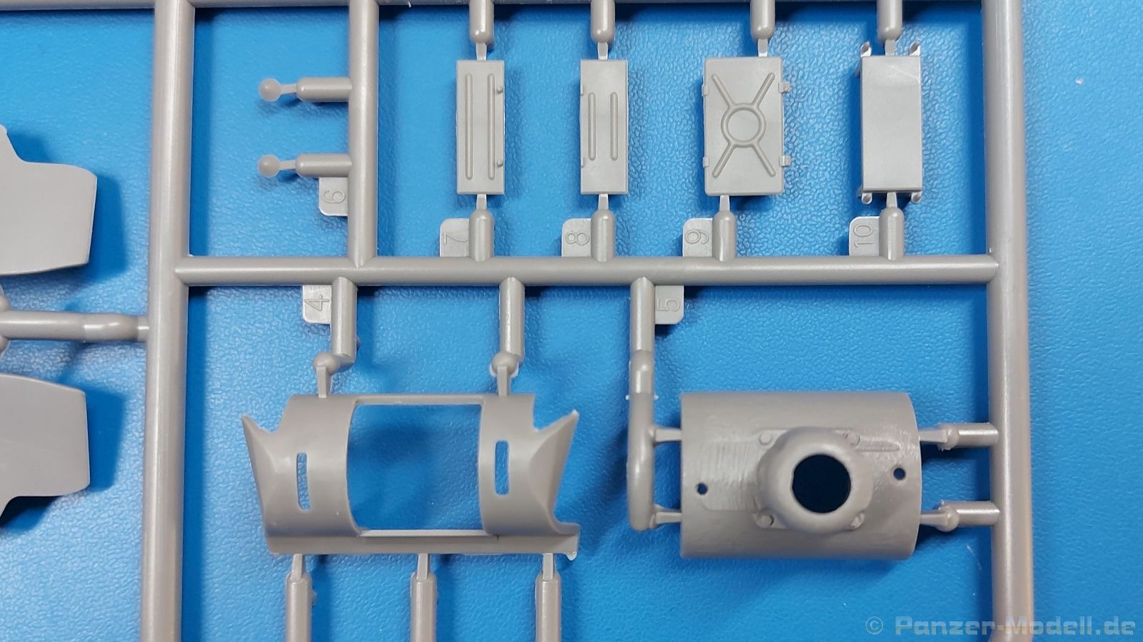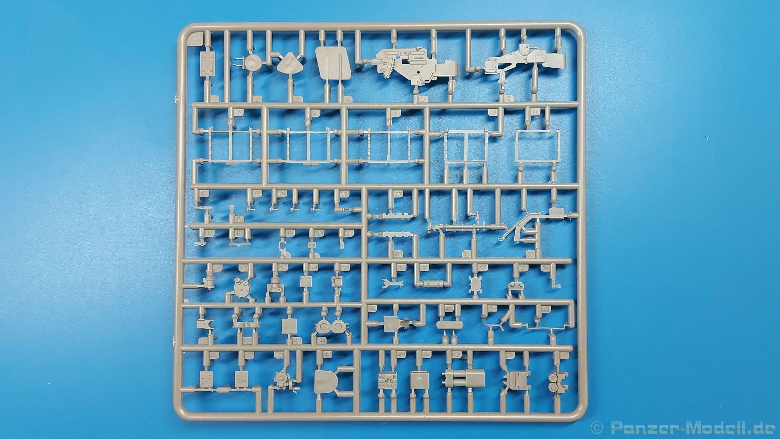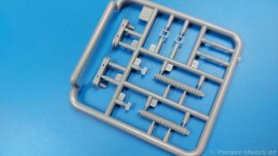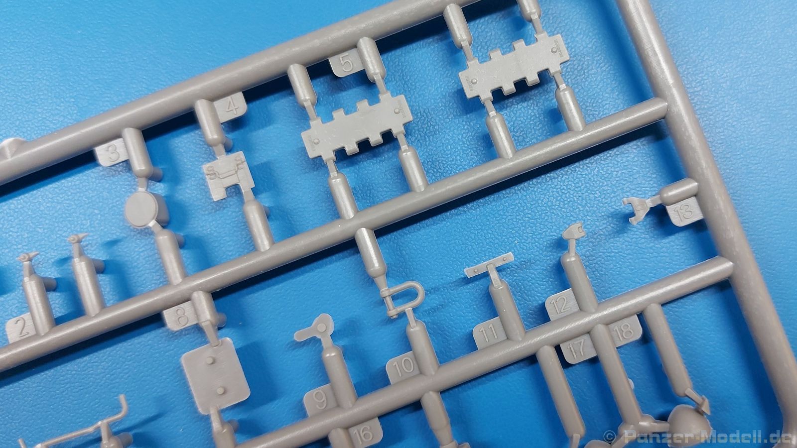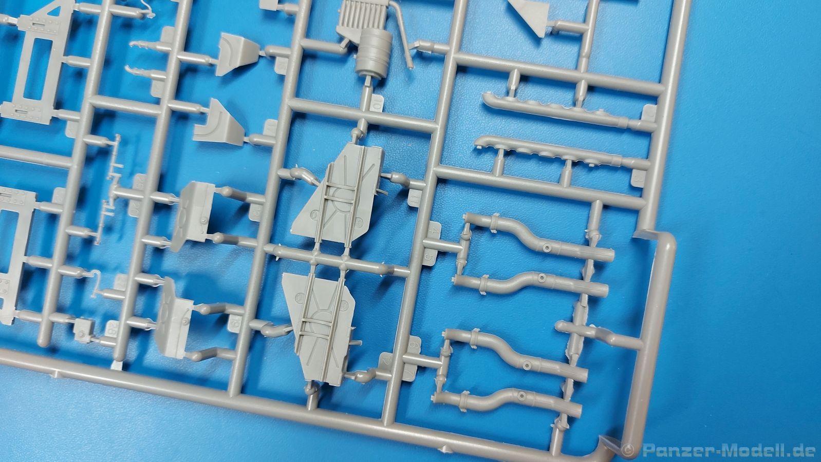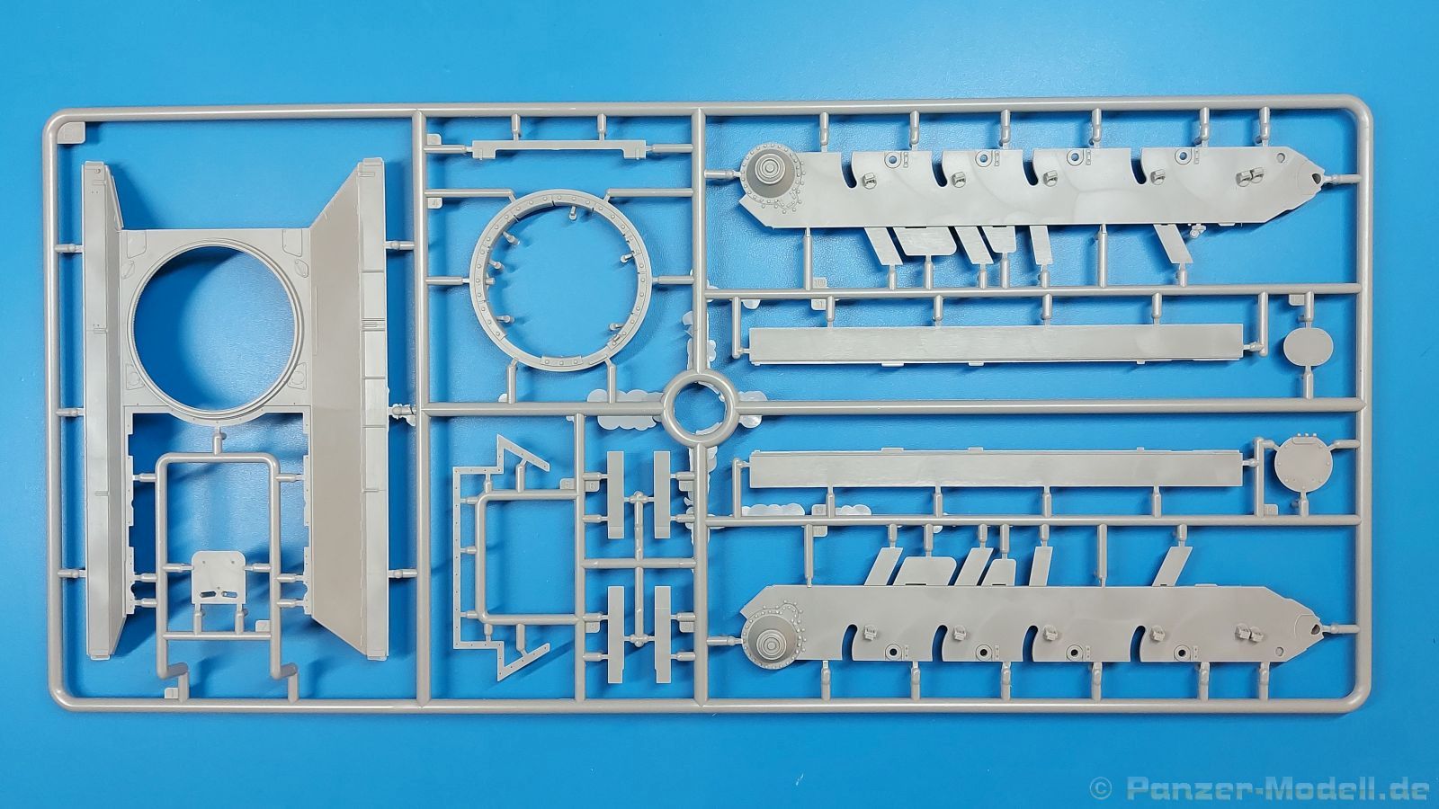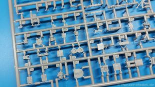 Das Original: Es gibt wohl kaum einen Militärmodellbauer, der den sowjetischen T-34 nicht kennt. Als einer der meistgebauten und am längsten im Einsatz befindlichen Panzer kann man ihn nicht übersehen. Seine Produktion zog sich von 1940 bis 1955 mit über 60.000 gebauten Exemplaren, die große Masse davon in den Jahren 1940-45. Seine schräge Panzerung war ein Novum der Zeit und bereitete den deutschen Gegnern einiges Kopfzerbrechen. Anfangs war er mit 2 MG und einer 76mm Kanone ausgerüstet, ab 1944 bekam er einen größeren Turm mit 85mm Kanone und ebenfalls 2 MG. Sein 500 PS Motor konnte ihn auf über 50 km/h beschleunigen. Der Bausatz: Die ukrainische Firma MiniArt startete mit etlichen Modellen auf Basis des T-34 Fahrgestells wie die SU-122 und SU-85 Bausätzen, Laufwerken, Ketten und dem Motor V-2-34 samt Getriebe. Mittlerweile gibt es auch vom T-34 selbst jede Menge Bausätze mit und ohne Interior (T-34/85 MiniArt). Heute beschäftigen wir uns mit dem innen und außen voll ausgestatteten Bausatz Nr. 35301, dessen Original gegen Ende des 2. Weltkrieges eingesetzt wurde. Der 385 x 240 x 90 mm groÃe Karton mit Stülpdeckel ist bis zum Rand vollgestopft mit 76(!) hellgrauen, 2 Klarsichtspritzlingen, 1 PE-Platine und einem Decalsheet. MiniArt hat sich über die Jahre einen echten Namen gemacht und ist unter den Herstellern im Plastikmodellbau nicht mehr wegzudenken. Das spiegelt sich in der Qualität wider. Sauber gespritzte und filigrane Teile sind die Norm. Verzug oder Versatz konnte ich nicht entdecken. Dennoch gibt es etwas Grat, größer zum Glück nur an Gießästen, feiner Grat nur hier und da. Ich denke mal, dass einige Formen für mehrere verschiedene Bausätze genutzt wurden und so ein paar Durchgänge mehr hinter sich haben. Die Auswerfer sind fast ausnahmslos auf die Spritzrahmen gesetzt, so dass die Teile so gut wie keine Spuren davon aufweisen, bzw. nur an Stellen, die nach dem Zusammenbau nicht mehr zu sehen sind. Die Wanne ist unterteilt in Boden, Seiten- und Trennwände, welches den Einbau der Inneneinrichtung erheblich erleichtert. Motor und Getriebe gibt es ja als Bausatz Nr. 35205 separat zu kaufen. Hier fehlt nichts! Lagerböcke, Zylinderköpfe, Zuluft-, Abgaskanäle, Auspuffrohre, Kühlschläuche, Kühler, Lichtmaschine, Einspritzpumpe, Elektromotor für Lüfterrad, Lüfterrad, Luftfilter, Steuerstangen, Lenkbremsen - aus meiner Sicht fast alles da bis auf Einspritzleitungen und Verkabelung. Die Struktur der Kühlerrippen ist sehr fein. Dies gilt auch für den Zahnkranz des Lüfterrades. Auf dem Wannenboden angegossen findet man vom Fahrerplatz bis zu den Lenkbremsen das entsprechende Gestänge. Die Tanks sind mit Einfüllschrauben versehen und auch die eingepressten Versteifungsrippen sind vorhanden. Schaut man sich die Oberwanne dann mal an, findet man so einige Schraubenlöcher, die dort zu finden sind, wo Motor-, bzw. Kühlerabdeckungen normalerweise angebracht sind. Wenn man also z.B. für eine Wartungsszene die Abdeckungen weglässt, sind die Schraubenlöcher da. Eine absolut realistische Darstellung. Die Zu- und Abluftöffnungen sind durchbrochen. Hier kann man die Windleitbleche entsprechend positioniert einbauen. Den Zuluftdeckel über dem Lüfterrad hat man durchbrochen dargestellt. In die Öffnung werden dann aus PE-Teilen der Halterahmen und das Gitter eingesetzt. Die große Heckplatte, die auch abgeklappt angebaut werden kann, enthält die Öffnungen für die Auspuffrohre und eine große Wartungsöffnung. Auch hier findet man an den entsprechenden Stellen Schraubenlöcher, wenn man diese Deckel auflassen möchte. An der Innenseite der Heckplatte sind die Verschraubungen der Auspuffpanzerungen vorhanden. Der Kampfraum unterteilt sich in den Platz für Fahrer/Bug-MG Schütze und den Turmbereich. Der Fahrerplatz ist voll ausgestattet - Sitz, Bedien- und Schalthebel, Pedale, Armaturen, Feuerlöscher, Axt, Hammer, Halterungen mit Trommelmagazinen für das Bug-MG, Pressluftflaschen und jede Menge Gestänge. Für den Armaturen sind Decals im Bausatz enthalten. Die Fahrerluke bekommt Winkelspiegel aus Klarsichtmaterial. Alle Außen- und Innendetails inkl. Verriegelungen sind vorhanden. Baut man die Klappe offen, muss man nur den entsprechenden Öffnerzylinder anbauen. Über der Fahrerluke erkennt man die Kopfpolsterung für den Fahrer. Das Bug-MG kann wohl voll beweglich mit der Kugelblende eingebaut werden. Hier wollen 8 Teile sauber zusammengefügt werden. Sehr schön die Struktur des MG-Doms. In der Wanne unter dem Turm finden große Munitionsbehälter Platz, die gleichzeitig den Laufboden der Turmbesatzung darstellen. Die Rückwand zwischen Kampf- und Motorraum ist schon mit allerlei Details versehen. Für die vier verschiedenen Munitionsarten gibt es entsprechende Halterungen sowohl in der Wanne als auch im Turm. Der Bausatz enthält 24 sichtbare Patronen. Die 16 im Turmheck sind einzeln. Man kann da also welche weglassen, um etwas Verbrauch darzustellen. Da sind wir also beim Turm, der sich von anderen Türmen unterscheidet, wenn man die untere Turmkante beachtet. Während sie normalerweise rundum gerundet ist, ist sie beim zusammengesetzten (composite)œ Turm im Heckbereich gerade heruntergezogen. Das Turmdach zeigt uns im Inneren zwei sehr schöne Lüfter, die mit PE-Gittern versehen werden. Zudem gibt es noch einige angegossene Leitungen, die zu Kampfraumleuchten aus Klarsichtmaterial führen. Ebenfalls aus kristallklarem Material sind die Winkelspiegel im Dach und der Kommandatenluke und die Sichtblöcke der Kommandantenkuppel. Sowohl Kommandantenluke als auch Ladeschützenluke können offen oder geschlossen gebaut werden. Kleines Gimmick - die Verriegelungsnase der Ladeschützenluke bei hochgestellter Luke. Die inneren Turmseitenwände werden mit Schaltkästen, Werkzeug, Munitionshalterungen ausgestattet, bevor man die Wände in den Turm einklebt. So kann man diese bereits vorher problemlos bemalen, ohne dann im Turm kämpfenœ zu müssen. Was 