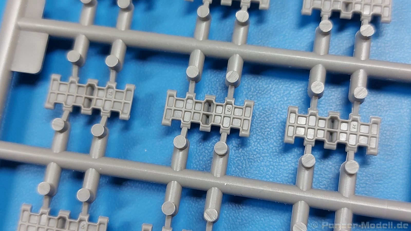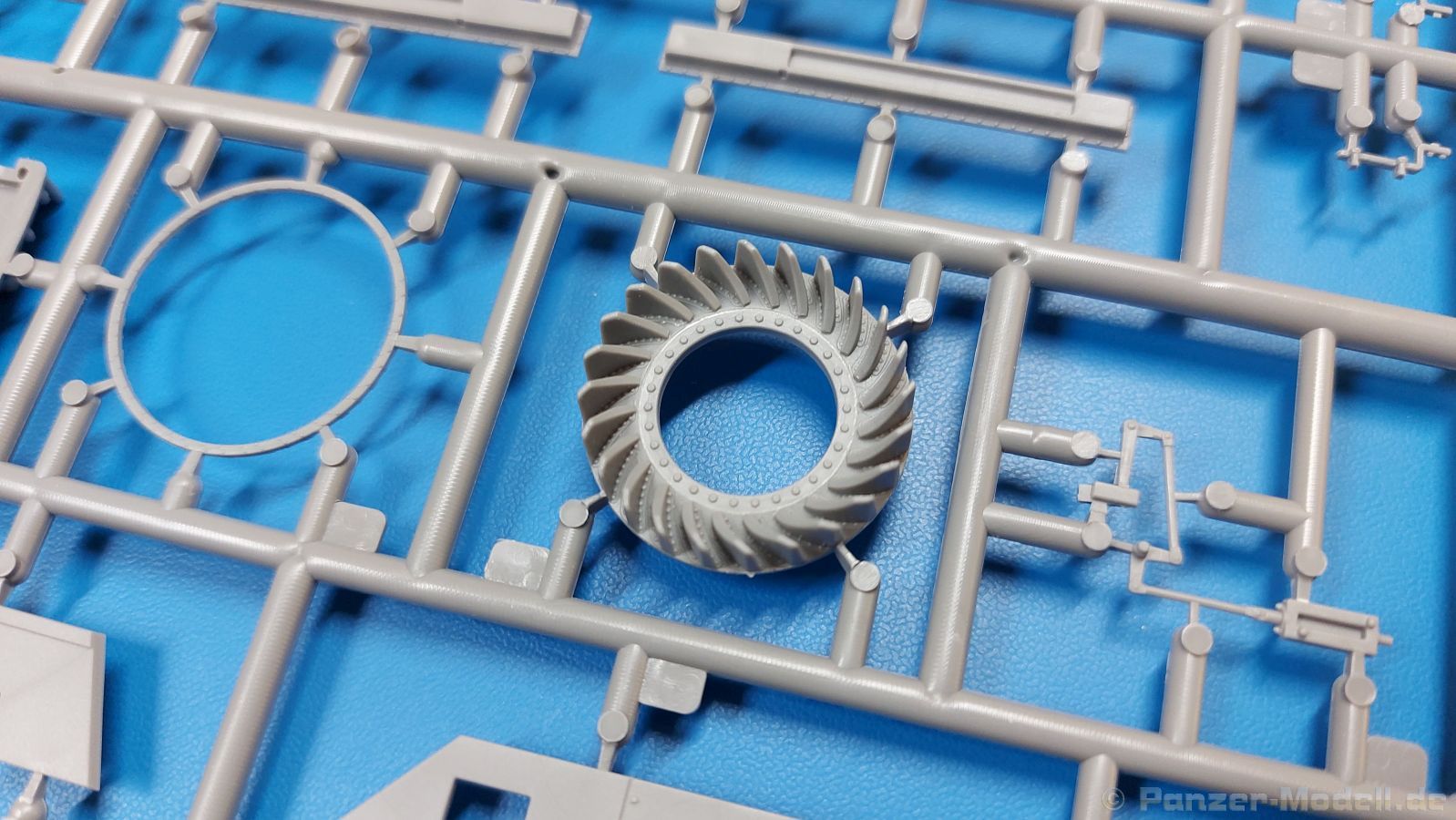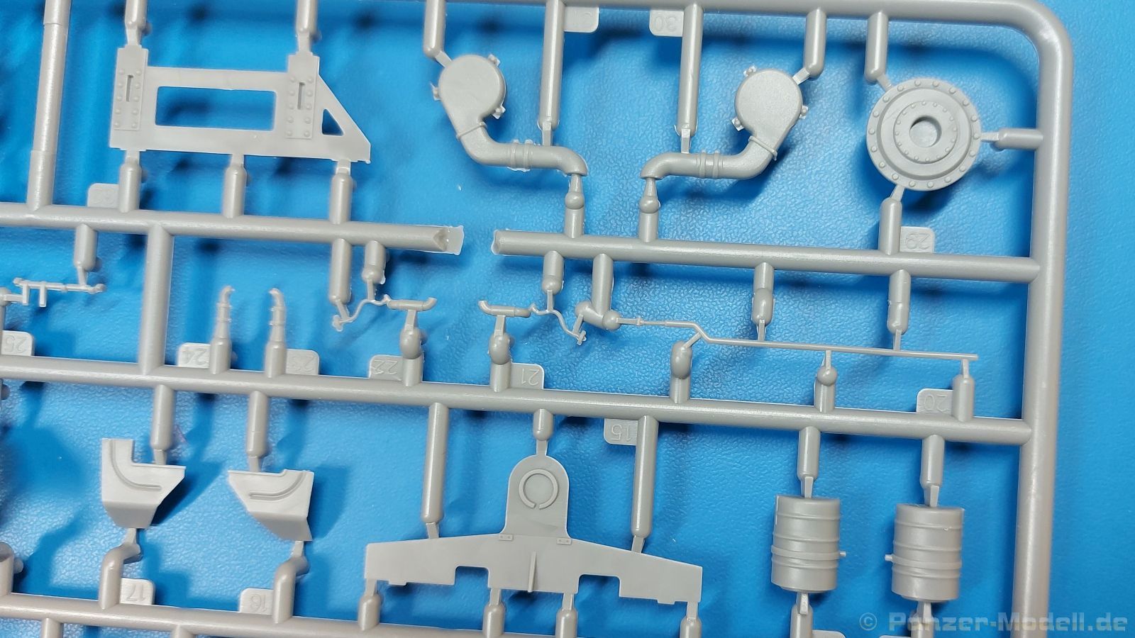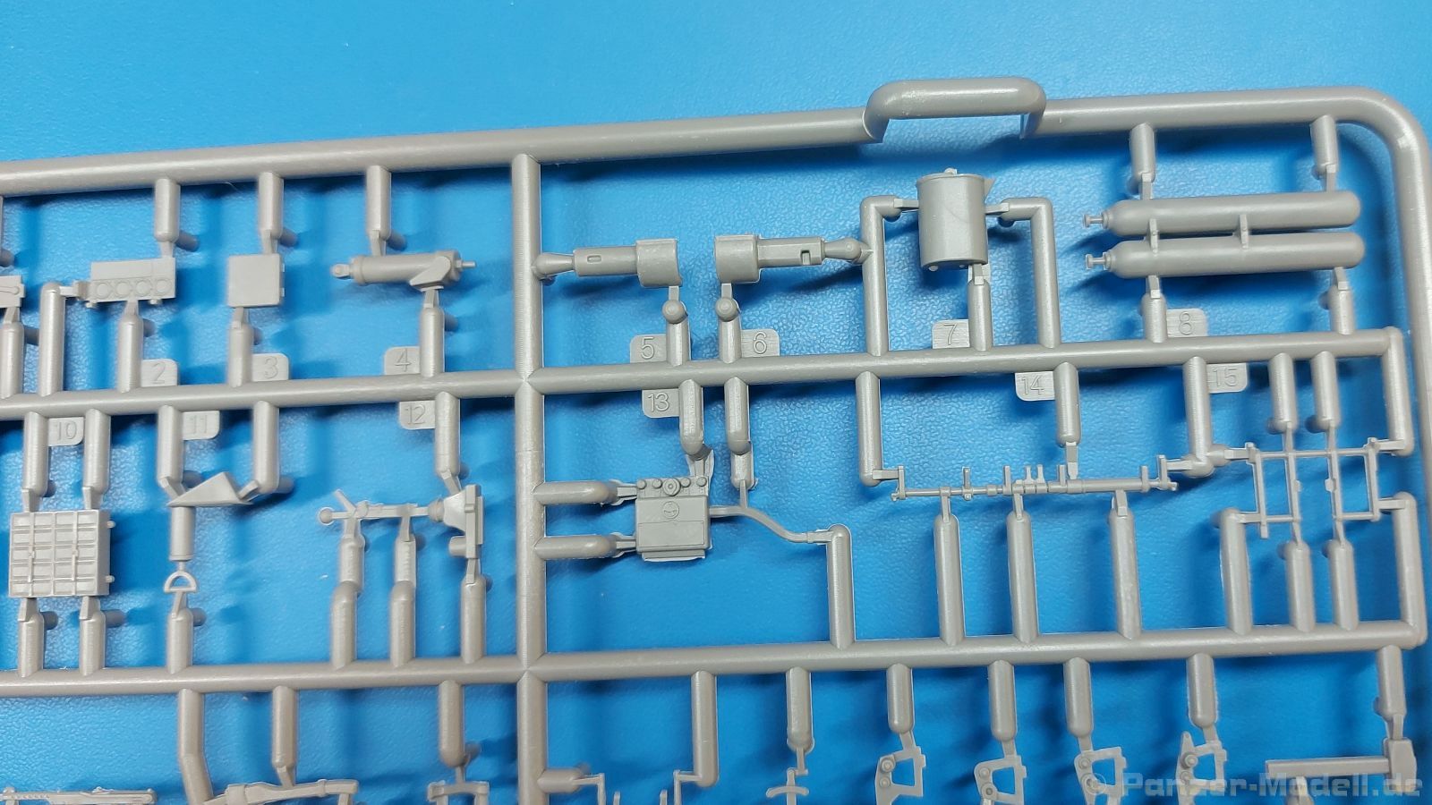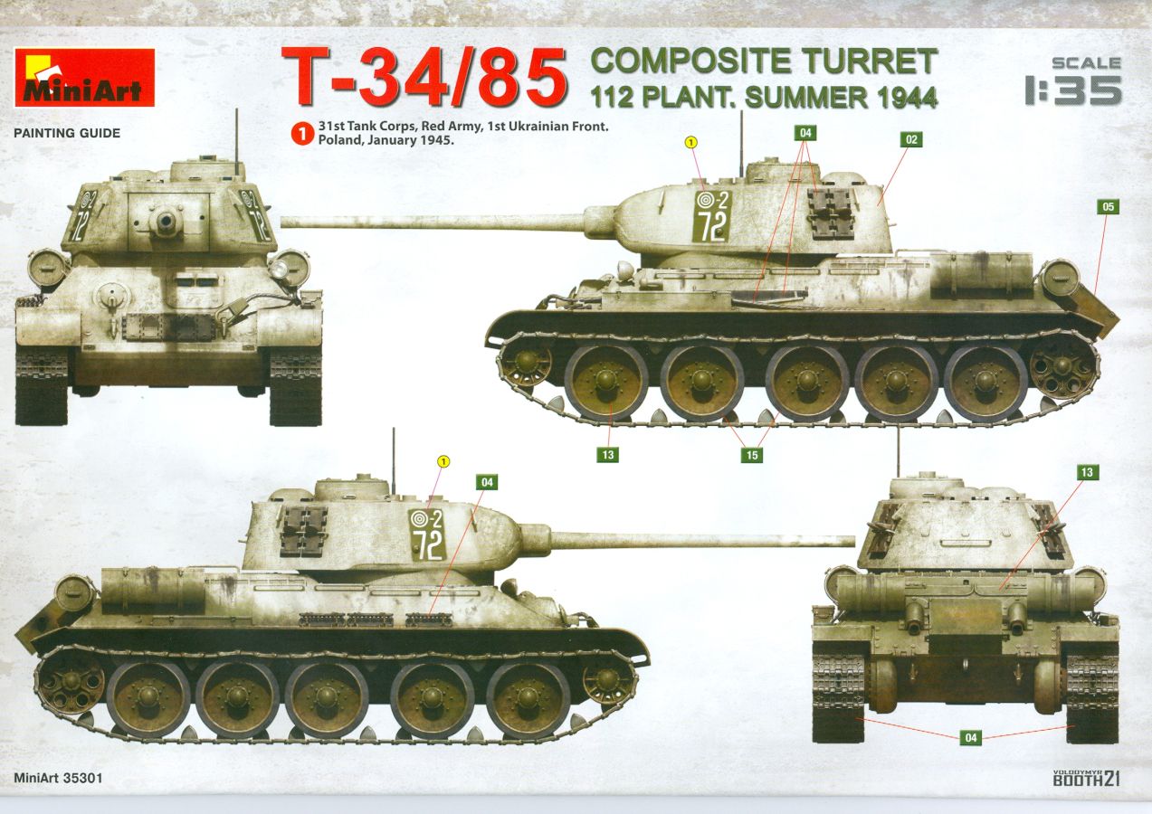 Das Original: Es gibt wohl kaum einen Militärmodellbauer, der den sowjetischen T-34 nicht kennt. Als einer der meistgebauten und am längsten im Einsatz befindlichen Panzer kann man ihn nicht übersehen. Seine Produktion zog sich von 1940 bis 1955 mit über 60.000 gebauten Exemplaren, die große Masse davon in den Jahren 1940-45. Seine schräge Panzerung war ein Novum der Zeit und bereitete den deutschen Gegnern einiges Kopfzerbrechen. Anfangs war er mit 2 MG und einer 76mm Kanone ausgerüstet, ab 1944 bekam er einen größeren Turm mit 85mm Kanone und ebenfalls 2 MG. Sein 500 PS Motor konnte ihn auf über 50 km/h beschleunigen. Der Bausatz: Die ukrainische Firma MiniArt startete mit etlichen Modellen auf Basis des T-34 Fahrgestells wie die SU-122 und SU-85 Bausätzen, Laufwerken, Ketten und dem Motor V-2-34 samt Getriebe. Mittlerweile gibt es auch vom T-34 selbst jede Menge Bausätze mit und ohne Interior (T-34/85 MiniArt). Heute beschäftigen wir uns mit dem innen und außen voll ausgestatteten Bausatz Nr. 35301, dessen Original gegen Ende des 2. Weltkrieges eingesetzt wurde. Der 385 x 240 x 90 mm groÃe Karton mit Stülpdeckel ist bis zum Rand vollgestopft mit 76(!) hellgrauen, 2 Klarsichtspritzlingen, 1 PE-Platine und einem Decalsheet. MiniArt hat sich über die Jahre einen echten Namen gemacht und ist unter den Herstellern im Plastikmodellbau nicht mehr wegzudenken. Das spiegelt sich in der Qualität wider. Sauber gespritzte und filigrane Teile sind die Norm. Verzug oder Versatz konnte ich nicht entdecken. Dennoch gibt es etwas Grat, größer zum Glück nur an Gießästen, feiner Grat nur hier und da. Ich denke mal, dass einige Formen für mehrere verschiedene Bausätze genutzt wurden und so ein paar Durchgänge mehr hinter sich haben. Die Auswerfer sind fast ausnahmslos auf die Spritzrahmen gesetzt, so dass die Teile so gut wie keine Spuren davon aufweisen, bzw. nur an Stellen, die nach dem Zusammenbau nicht mehr zu sehen sind. Die Wanne ist unterteilt in Boden, Seiten- und Trennwände, welches den Einbau der Inneneinrichtung erheblich erleichtert. Motor und Getriebe gibt es ja als Bausatz Nr. 35205 separat zu kaufen. Hier fehlt nichts! Lagerböcke, Zylinderköpfe, Zuluft-, Abgaskanäle, Auspuffrohre, Kühlschläuche, Kühler, Lichtmaschine, Einspritzpumpe, Elektromotor für Lüfterrad, Lüfterrad, Luftfilter, Steuerstangen, Lenkbremsen - aus meiner Sicht fast alles da bis auf Einspritzleitungen und Verkabelung. Die Struktur der Kühlerrippen ist sehr fein. Dies gilt auch für den Zahnkranz des Lüfterrades. Auf dem Wannenboden angegossen findet man vom Fahrerplatz bis zu den Lenkbremsen das entsprechende Gestänge. Die Tanks sind mit Einfüllschrauben versehen und auch die eingepressten Versteifungsrippen sind vorhanden. Schaut man sich die Oberwanne dann mal an, findet man so einige Schraubenlöcher, die dort zu finden sind, wo Motor-, bzw. Kühlerabdeckungen normalerweise angebracht sind. Wenn man also z.B. für eine Wartungsszene die Abdeckungen weglässt, sind die Schraubenlöcher da. Eine absolut realistische Darstellung. Die Zu- und Abluftöffnungen sind durchbrochen. Hier kann man die Windleitbleche entsprechend positioniert einbauen. Den Zuluftdeckel über dem Lüfterrad hat man durchbrochen dargestellt. In die Öffnung werden dann aus PE-Teilen der Halterahmen und das Gitter eingesetzt. Die große Heckplatte, die auch abgeklappt angebaut werden kann, enthält die Öffnungen für die Auspuffrohre und eine große Wartungsöffnung. Auch hier findet man an den entsprechenden Stellen Schraubenlöcher, wenn man diese Deckel auflassen möchte. An der Innenseite der Heckplatte sind die Verschraubungen der Auspuffpanzerungen vorhanden. Der Kampfraum unterteilt sich in den Platz für Fahrer/Bug-MG Schütze und den Turmbereich. Der Fahrerplatz ist voll ausgestattet - Sitz, Bedien- und Schalthebel, Pedale, Armaturen, Feuerlöscher, Axt, Hammer, Halterungen mit Trommelmagazinen für das Bug-MG, Pressluftflaschen und jede Menge Gestänge. Für den Armaturen sind Decals im Bausatz enthalten. Die Fahrerluke bekommt Winkelspiegel aus Klarsichtmaterial. Alle Außen- und Innendetails inkl. Verriegelungen sind vorhanden. Baut man die Klappe offen, muss man nur den entsprechenden Öffnerzylinder anbauen. Über der Fahrerluke erkennt man die Kopfpolsterung für den Fahrer. Das Bug-MG kann wohl voll beweglich mit der Kugelblende eingebaut werden. Hier wollen 8 Teile sauber zusammengefügt werden. Sehr schön die Struktur des MG-Doms. In der Wanne unter dem Turm finden große Munitionsbehälter Platz, die gleichzeitig den Laufboden der Turmbesatzung darstellen. Die Rückwand zwischen Kampf- und Motorraum ist schon mit allerlei Details versehen. Für die vier verschiedenen Munitionsarten gibt es entsprechende Halterungen sowohl in der Wanne als auch im Turm. Der Bausatz enthält 24 sichtbare Patronen. Die 16 im Turmheck sind einzeln. Man kann da also welche weglassen, um etwas Verbrauch darzustellen. Da sind wir also beim Turm, der sich von anderen Türmen unterscheidet, wenn man die untere Turmkante beachtet. Während sie normalerweise rundum gerundet ist, ist sie beim zusammengesetzten (composite)œ Turm im Heckbereich gerade heruntergezogen. Das Turmdach zeigt uns im Inneren zwei sehr schöne Lüfter, die mit PE-Gittern versehen werden. Zudem gibt es noch einige angegossene Leitungen, die zu Kampfraumleuchten aus Klarsichtmaterial führen. Ebenfalls aus kristallklarem Material sind die Winkelspiegel im Dach und der Kommandatenluke und die Sichtblöcke der Kommandantenkuppel. Sowohl Kommandantenluke als auch Ladeschützenluke können offen oder geschlossen gebaut werden. Kleines Gimmick - die Verriegelungsnase der Ladeschützenluke bei hochgestellter Luke. Die inneren Turmseitenwände werden mit Schaltkästen, Werkzeug, Munitionshalterungen ausgestattet, bevor man die Wände in den Turm einklebt. So kann man diese bereits vorher problemlos bemalen, ohne dann im Turm kämpfenœ zu müssen. Was 