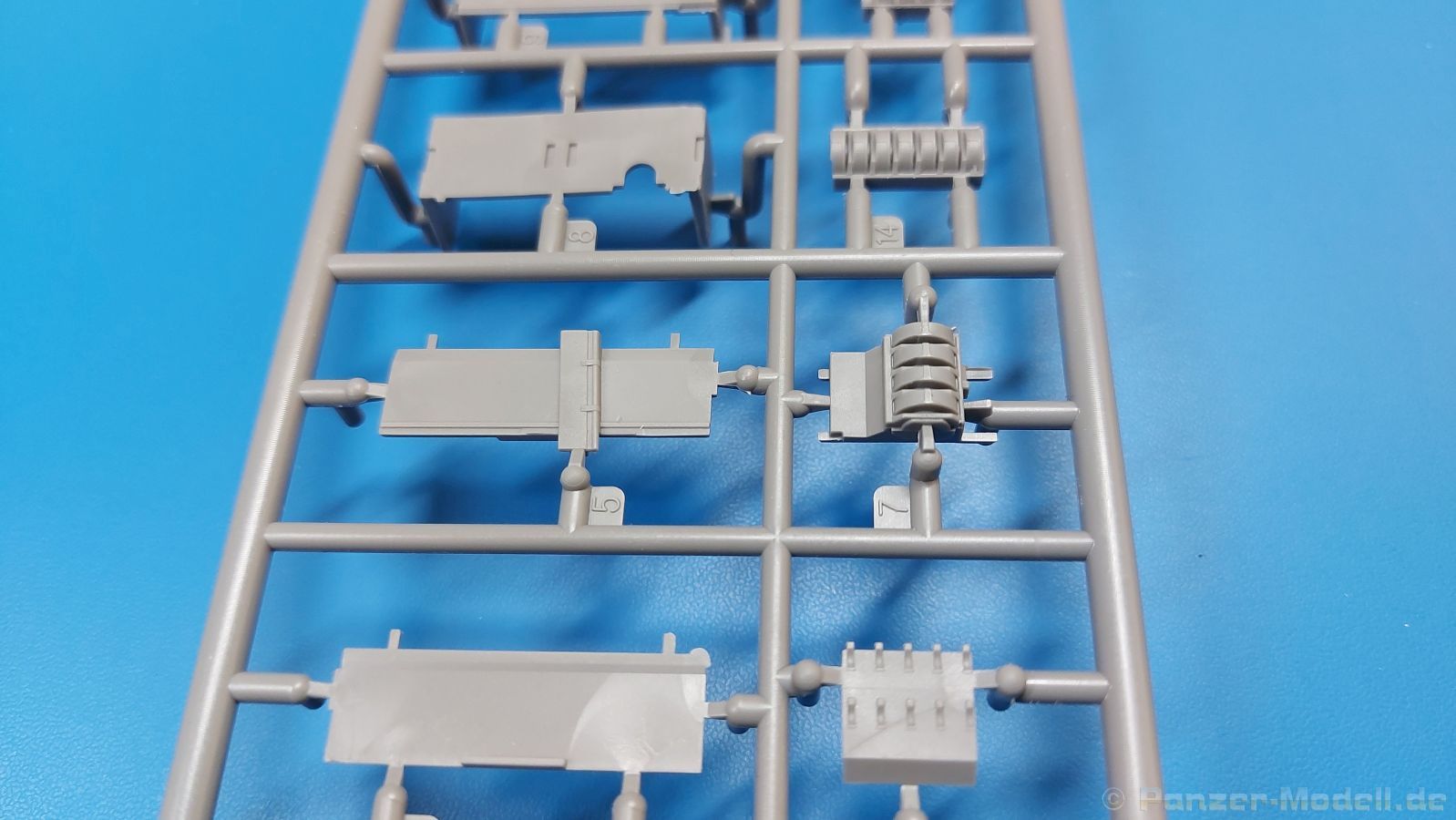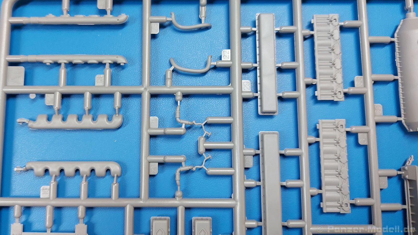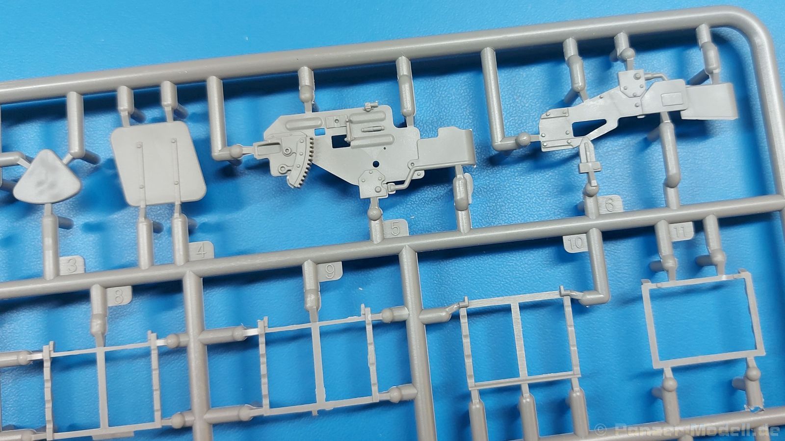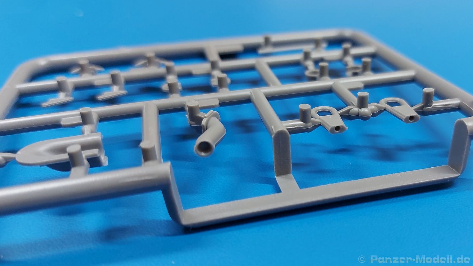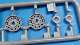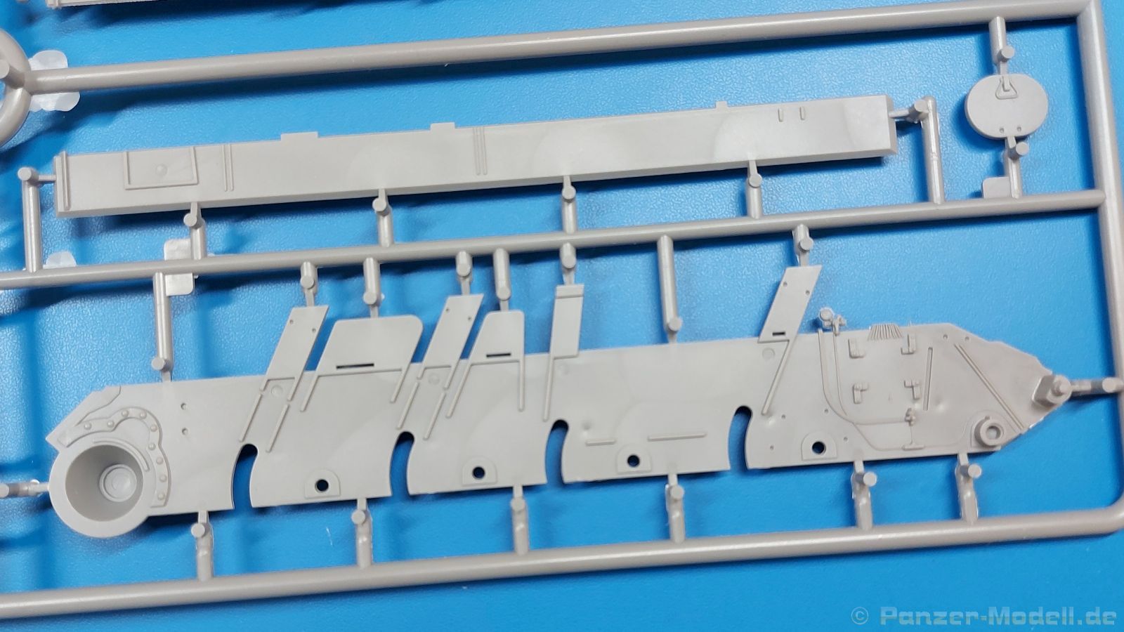 Das Original: Es gibt wohl kaum einen Militärmodellbauer, der den sowjetischen T-34 nicht kennt. Als einer der meistgebauten und am längsten im Einsatz befindlichen Panzer kann man ihn nicht übersehen. Seine Produktion zog sich von 1940 bis 1955 mit über 60.000 gebauten Exemplaren, die große Masse davon in den Jahren 1940-45. Seine schräge Panzerung war ein Novum der Zeit und bereitete den deutschen Gegnern einiges Kopfzerbrechen. Anfangs war er mit 2 MG und einer 76mm Kanone ausgerüstet, ab 1944 bekam er einen größeren Turm mit 85mm Kanone und ebenfalls 2 MG. Sein 500 PS Motor konnte ihn auf über 50 km/h beschleunigen. Der Bausatz: Die ukrainische Firma MiniArt startete mit etlichen Modellen auf Basis des T-34 Fahrgestells wie die SU-122 und SU-85 Bausätzen, Laufwerken, Ketten und dem Motor V-2-34 samt Getriebe. Mittlerweile gibt es auch vom T-34 selbst jede Menge Bausätze mit und ohne Interior (T-34/85 MiniArt). Heute beschäftigen wir uns mit dem innen und außen voll ausgestatteten Bausatz Nr. 35301, dessen Original gegen Ende des 2. Weltkrieges eingesetzt wurde. Der 385 x 240 x 90 mm groÃe Karton mit Stülpdeckel ist bis zum Rand vollgestopft mit 76(!) hellgrauen, 2 Klarsichtspritzlingen, 1 PE-Platine und einem Decalsheet. MiniArt hat sich über die Jahre einen echten Namen gemacht und ist unter den Herstellern im Plastikmodellbau nicht mehr wegzudenken. Das spiegelt sich in der Qualität wider. Sauber gespritzte und filigrane Teile sind die Norm. Verzug oder Versatz konnte ich nicht entdecken. Dennoch gibt es etwas Grat, größer zum Glück nur an Gießästen, feiner Grat nur hier und da. Ich denke mal, dass einige Formen für mehrere verschiedene Bausätze genutzt wurden und so ein paar Durchgänge mehr hinter sich haben. Die Auswerfer sind fast ausnahmslos auf die Spritzrahmen gesetzt, so dass die Teile so gut wie keine Spuren davon aufweisen, bzw. nur an Stellen, die nach dem Zusammenbau nicht mehr zu sehen sind. Die Wanne ist unterteilt in Boden, Seiten- und Trennwände, welches den Einbau der Inneneinrichtung erheblich erleichtert. Motor und Getriebe gibt es ja als Bausatz Nr. 35205 separat zu kaufen. Hier fehlt nichts! Lagerböcke, Zylinderköpfe, Zuluft-, Abgaskanäle, Auspuffrohre, Kühlschläuche, Kühler, Lichtmaschine, Einspritzpumpe, Elektromotor für Lüfterrad, Lüfterrad, Luftfilter, Steuerstangen, Lenkbremsen - aus meiner Sicht fast alles da bis auf Einspritzleitungen und Verkabelung. Die Struktur der Kühlerrippen ist sehr fein. Dies gilt auch für den Zahnkranz des Lüfterrades. Auf dem Wannenboden angegossen findet man vom Fahrerplatz bis zu den Lenkbremsen das entsprechende Gestänge. Die Tanks sind mit Einfüllschrauben versehen und auch die eingepressten Versteifungsrippen sind vorhanden. Schaut man sich die Oberwanne dann mal an, findet man so einige Schraubenlöcher, die dort zu finden sind, wo Motor-, bzw. Kühlerabdeckungen normalerweise angebracht sind. Wenn man also z.B. für eine Wartungsszene die Abdeckungen weglässt, sind die Schraubenlöcher da. Eine absolut realistische Darstellung. Die Zu- und Abluftöffnungen sind durchbrochen. Hier kann man die Windleitbleche entsprechend positioniert einbauen. Den Zuluftdeckel über dem Lüfterrad hat man durchbrochen dargestellt. In die Öffnung werden dann aus PE-Teilen der Halterahmen und das Gitter eingesetzt. Die große Heckplatte, die auch abgeklappt angebaut werden kann, enthält die Öffnungen für die Auspuffrohre und eine große Wartungsöffnung. Auch hier findet man an den entsprechenden Stellen Schraubenlöcher, wenn man diese Deckel auflassen möchte. An der Innenseite der Heckplatte sind die Verschraubungen der Auspuffpanzerungen vorhanden. Der Kampfraum unterteilt sich in den Platz für Fahrer/Bug-MG Schütze und den Turmbereich. Der Fahrerplatz ist voll ausgestattet - Sitz, Bedien- und Schalthebel, Pedale, Armaturen, Feuerlöscher, Axt, Hammer, Halterungen mit Trommelmagazinen für das Bug-MG, Pressluftflaschen und jede Menge Gestänge. Für den Armaturen sind Decals im Bausatz enthalten. Die Fahrerluke bekommt Winkelspiegel aus Klarsichtmaterial. Alle Außen- und Innendetails inkl. Verriegelungen sind vorhanden. Baut man die Klappe offen, muss man nur den entsprechenden Öffnerzylinder anbauen. Über der Fahrerluke erkennt man die Kopfpolsterung für den Fahrer. Das Bug-MG kann wohl voll beweglich mit der Kugelblende eingebaut werden. Hier wollen 8 Teile sauber zusammengefügt werden. Sehr schön die Struktur des MG-Doms. In der Wanne unter dem Turm finden große Munitionsbehälter Platz, die gleichzeitig den Laufboden der Turmbesatzung darstellen. Die Rückwand zwischen Kampf- und Motorraum ist schon mit allerlei Details versehen. Für die vier verschiedenen Munitionsarten gibt es entsprechende Halterungen sowohl in der Wanne als auch im Turm. Der Bausatz enthält 24 sichtbare Patronen. Die 16 im Turmheck sind einzeln. Man kann da also welche weglassen, um etwas Verbrauch darzustellen. Da sind wir also beim Turm, der sich von anderen Türmen unterscheidet, wenn man die untere Turmkante beachtet. Während sie normalerweise rundum gerundet ist, ist sie beim zusammengesetzten (composite)œ Turm im Heckbereich gerade heruntergezogen. Das Turmdach zeigt uns im Inneren zwei sehr schöne Lüfter, die mit PE-Gittern versehen werden. Zudem gibt es noch einige angegossene Leitungen, die zu Kampfraumleuchten aus Klarsichtmaterial führen. Ebenfalls aus kristallklarem Material sind die Winkelspiegel im Dach und der Kommandatenluke und die Sichtblöcke der Kommandantenkuppel. Sowohl Kommandantenluke als auch Ladeschützenluke können offen oder geschlossen gebaut werden. Kleines Gimmick - die Verriegelungsnase der Ladeschützenluke bei hochgestellter Luke. Die inneren Turmseitenwände werden mit Schaltkästen, Werkzeug, Munitionshalterungen ausgestattet, bevor man die Wände in den Turm einklebt. So kann man diese bereits vorher problemlos bemalen, ohne dann im Turm kämpfenœ zu müssen. Was 