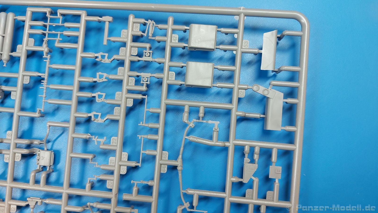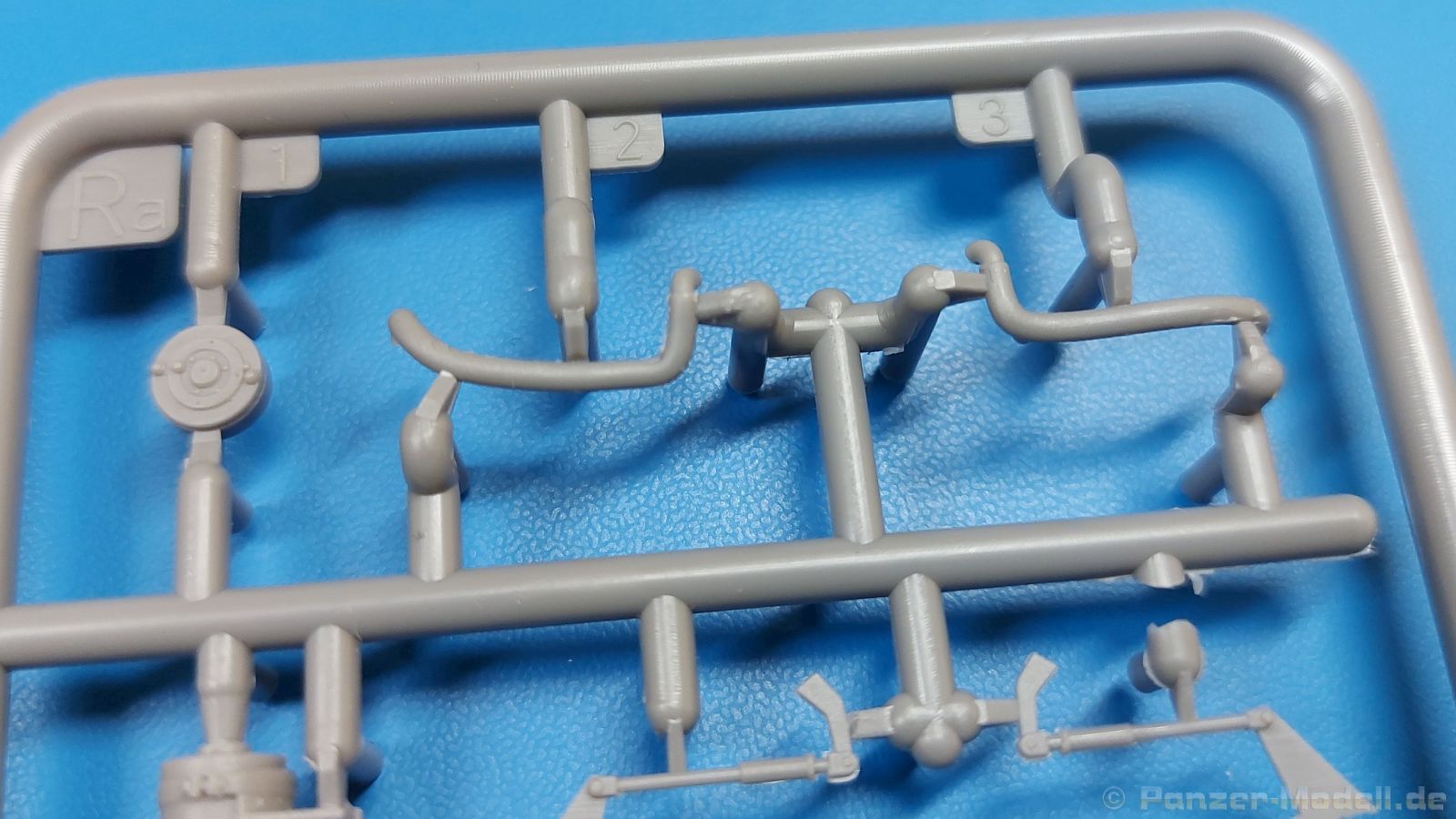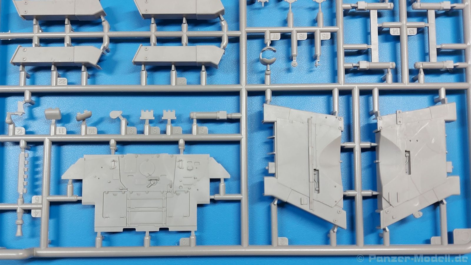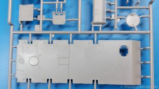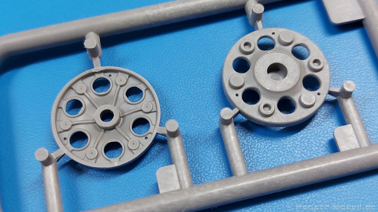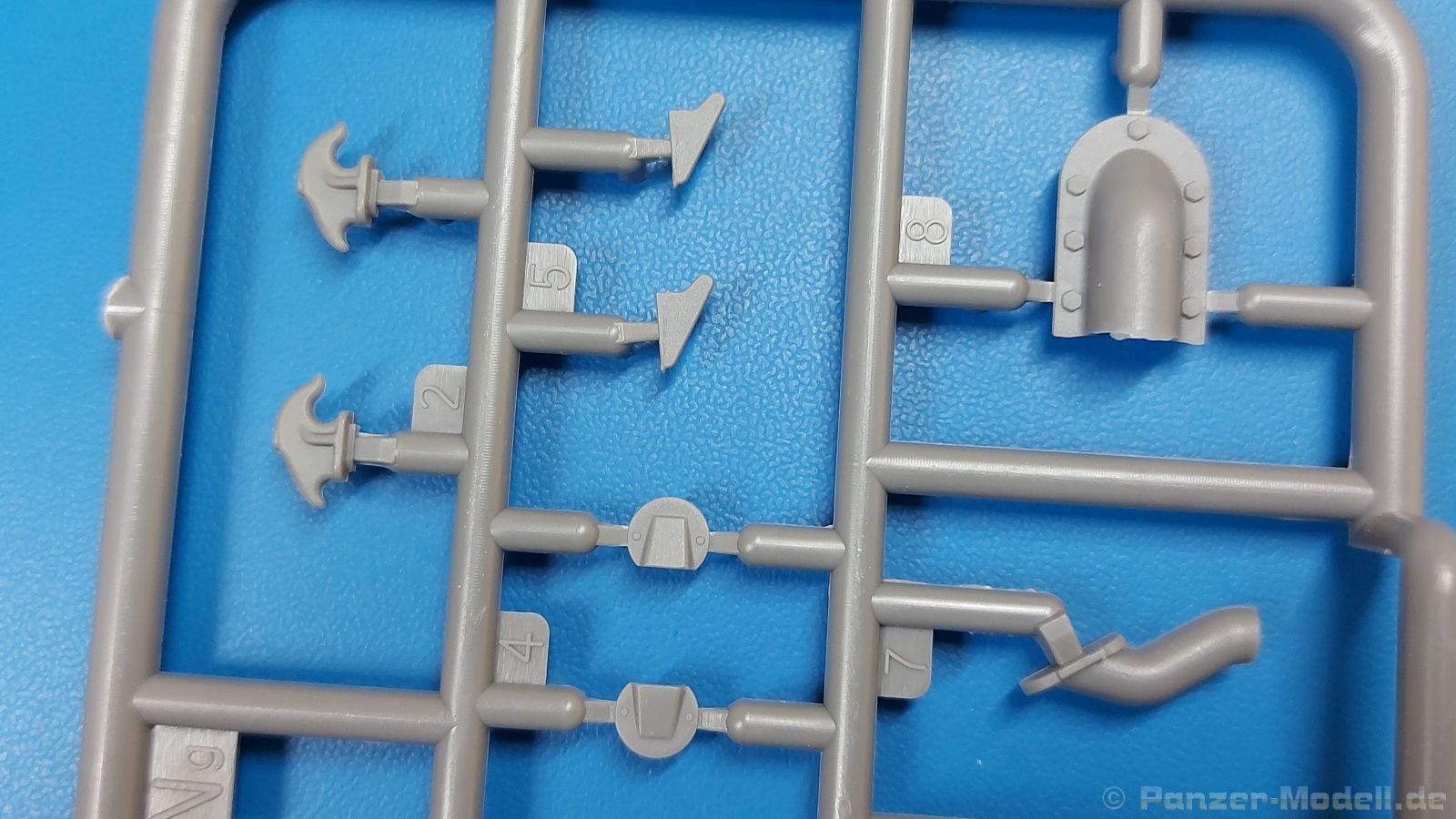 Das Original: Es gibt wohl kaum einen Militärmodellbauer, der den sowjetischen T-34 nicht kennt. Als einer der meistgebauten und am längsten im Einsatz befindlichen Panzer kann man ihn nicht übersehen. Seine Produktion zog sich von 1940 bis 1955 mit über 60.000 gebauten Exemplaren, die große Masse davon in den Jahren 1940-45. Seine schräge Panzerung war ein Novum der Zeit und bereitete den deutschen Gegnern einiges Kopfzerbrechen. Anfangs war er mit 2 MG und einer 76mm Kanone ausgerüstet, ab 1944 bekam er einen größeren Turm mit 85mm Kanone und ebenfalls 2 MG. Sein 500 PS Motor konnte ihn auf über 50 km/h beschleunigen. Der Bausatz: Die ukrainische Firma MiniArt startete mit etlichen Modellen auf Basis des T-34 Fahrgestells wie die SU-122 und SU-85 Bausätzen, Laufwerken, Ketten und dem Motor V-2-34 samt Getriebe. Mittlerweile gibt es auch vom T-34 selbst jede Menge Bausätze mit und ohne Interior (T-34/85 MiniArt). Heute beschäftigen wir uns mit dem innen und außen voll ausgestatteten Bausatz Nr. 35301, dessen Original gegen Ende des 2. Weltkrieges eingesetzt wurde. Der 385 x 240 x 90 mm groÃe Karton mit Stülpdeckel ist bis zum Rand vollgestopft mit 76(!) hellgrauen, 2 Klarsichtspritzlingen, 1 PE-Platine und einem Decalsheet. MiniArt hat sich über die Jahre einen echten Namen gemacht und ist unter den Herstellern im Plastikmodellbau nicht mehr wegzudenken. Das spiegelt sich in der Qualität wider. Sauber gespritzte und filigrane Teile sind die Norm. Verzug oder Versatz konnte ich nicht entdecken. Dennoch gibt es etwas Grat, größer zum Glück nur an Gießästen, feiner Grat nur hier und da. Ich denke mal, dass einige Formen für mehrere verschiedene Bausätze genutzt wurden und so ein paar Durchgänge mehr hinter sich haben. Die Auswerfer sind fast ausnahmslos auf die Spritzrahmen gesetzt, so dass die Teile so gut wie keine Spuren davon aufweisen, bzw. nur an Stellen, die nach dem Zusammenbau nicht mehr zu sehen sind. Die Wanne ist unterteilt in Boden, Seiten- und Trennwände, welches den Einbau der Inneneinrichtung erheblich erleichtert. Motor und Getriebe gibt es ja als Bausatz Nr. 35205 separat zu kaufen. Hier fehlt nichts! Lagerböcke, Zylinderköpfe, Zuluft-, Abgaskanäle, Auspuffrohre, Kühlschläuche, Kühler, Lichtmaschine, Einspritzpumpe, Elektromotor für Lüfterrad, Lüfterrad, Luftfilter, Steuerstangen, Lenkbremsen - aus meiner Sicht fast alles da bis auf Einspritzleitungen und Verkabelung. Die Struktur der Kühlerrippen ist sehr fein. Dies gilt auch für den Zahnkranz des Lüfterrades. Auf dem Wannenboden angegossen findet man vom Fahrerplatz bis zu den Lenkbremsen das entsprechende Gestänge. Die Tanks sind mit Einfüllschrauben versehen und auch die eingepressten Versteifungsrippen sind vorhanden. Schaut man sich die Oberwanne dann mal an, findet man so einige Schraubenlöcher, die dort zu finden sind, wo Motor-, bzw. Kühlerabdeckungen normalerweise angebracht sind. Wenn man also z.B. für eine Wartungsszene die Abdeckungen weglässt, sind die Schraubenlöcher da. Eine absolut realistische Darstellung. Die Zu- und Abluftöffnungen sind durchbrochen. Hier kann man die Windleitbleche entsprechend positioniert einbauen. Den Zuluftdeckel über dem Lüfterrad hat man durchbrochen dargestellt. In die Öffnung werden dann aus PE-Teilen der Halterahmen und das Gitter eingesetzt. Die große Heckplatte, die auch abgeklappt angebaut werden kann, enthält die Öffnungen für die Auspuffrohre und eine große Wartungsöffnung. Auch hier findet man an den entsprechenden Stellen Schraubenlöcher, wenn man diese Deckel auflassen möchte. An der Innenseite der Heckplatte sind die Verschraubungen der Auspuffpanzerungen vorhanden. Der Kampfraum unterteilt sich in den Platz für Fahrer/Bug-MG Schütze und den Turmbereich. Der Fahrerplatz ist voll ausgestattet - Sitz, Bedien- und Schalthebel, Pedale, Armaturen, Feuerlöscher, Axt, Hammer, Halterungen mit Trommelmagazinen für das Bug-MG, Pressluftflaschen und jede Menge Gestänge. Für den Armaturen sind Decals im Bausatz enthalten. Die Fahrerluke bekommt Winkelspiegel aus Klarsichtmaterial. Alle Außen- und Innendetails inkl. Verriegelungen sind vorhanden. Baut man die Klappe offen, muss man nur den entsprechenden Öffnerzylinder anbauen. Über der Fahrerluke erkennt man die Kopfpolsterung für den Fahrer. Das Bug-MG kann wohl voll beweglich mit der Kugelblende eingebaut werden. Hier wollen 8 Teile sauber zusammengefügt werden. Sehr schön die Struktur des MG-Doms. In der Wanne unter dem Turm finden große Munitionsbehälter Platz, die gleichzeitig den Laufboden der Turmbesatzung darstellen. Die Rückwand zwischen Kampf- und Motorraum ist schon mit allerlei Details versehen. Für die vier verschiedenen Munitionsarten gibt es entsprechende Halterungen sowohl in der Wanne als auch im Turm. Der Bausatz enthält 24 sichtbare Patronen. Die 16 im Turmheck sind einzeln. Man kann da also welche weglassen, um etwas Verbrauch darzustellen. Da sind wir also beim Turm, der sich von anderen Türmen unterscheidet, wenn man die untere Turmkante beachtet. Während sie normalerweise rundum gerundet ist, ist sie beim zusammengesetzten (composite)œ Turm im Heckbereich gerade heruntergezogen. Das Turmdach zeigt uns im Inneren zwei sehr schöne Lüfter, die mit PE-Gittern versehen werden. Zudem gibt es noch einige angegossene Leitungen, die zu Kampfraumleuchten aus Klarsichtmaterial führen. Ebenfalls aus kristallklarem Material sind die Winkelspiegel im Dach und der Kommandatenluke und die Sichtblöcke der Kommandantenkuppel. Sowohl Kommandantenluke als auch Ladeschützenluke können offen oder geschlossen gebaut werden. Kleines Gimmick - die Verriegelungsnase der Ladeschützenluke bei hochgestellter Luke. Die inneren Turmseitenwände werden mit Schaltkästen, Werkzeug, Munitionshalterungen ausgestattet, bevor man die Wände in den Turm einklebt. So kann man diese bereits vorher problemlos bemalen, ohne dann im Turm kämpfenœ zu müssen. Was 