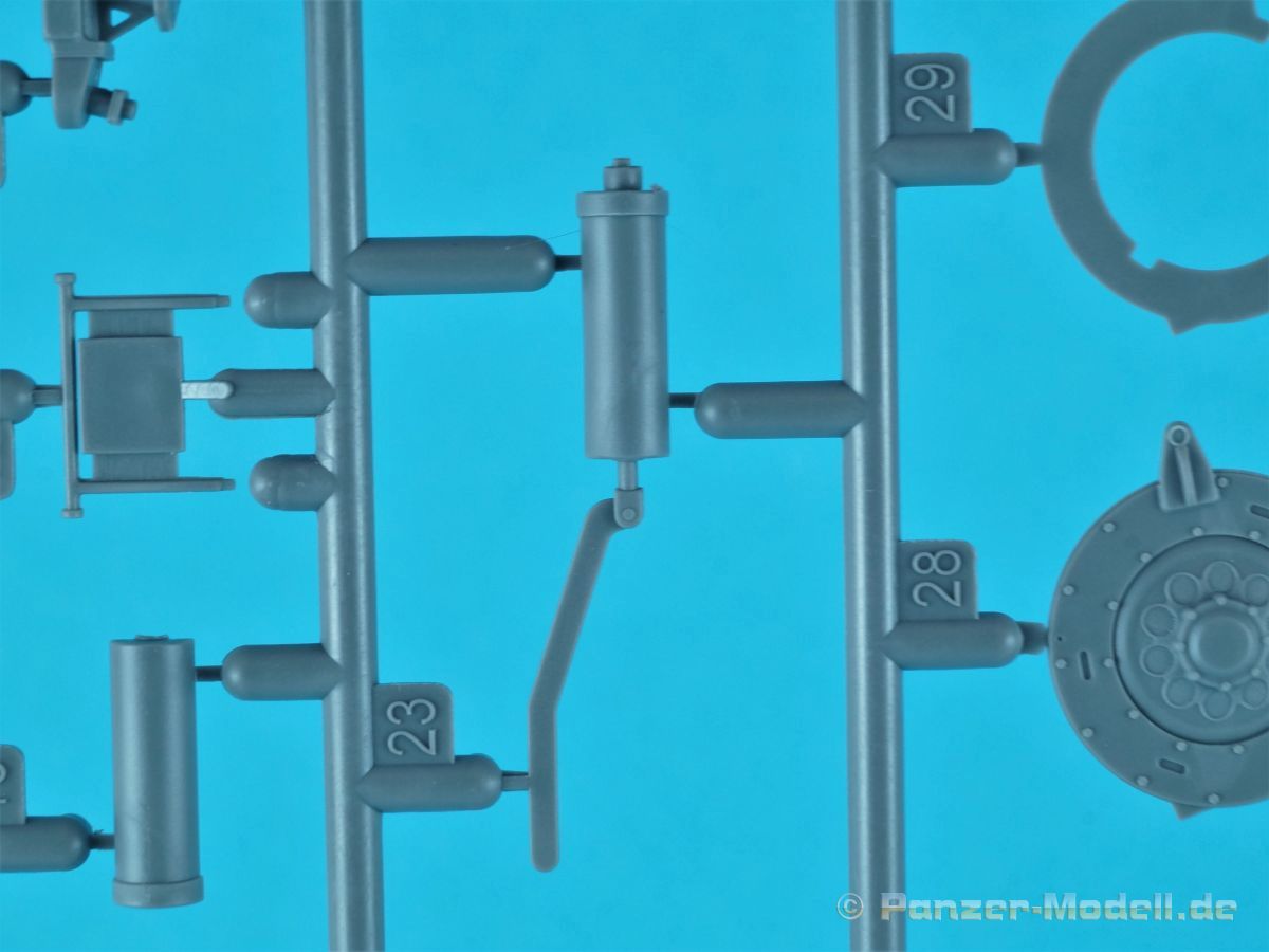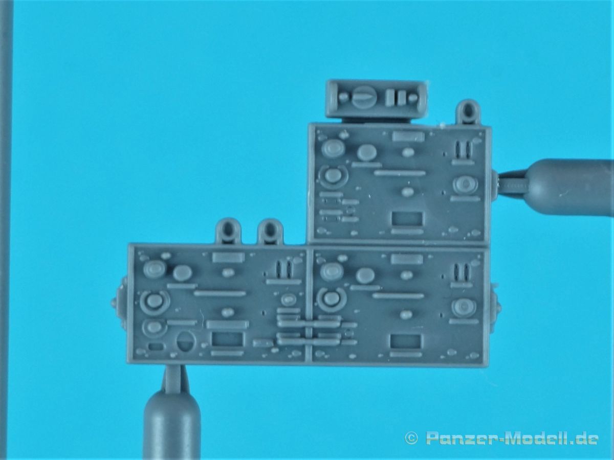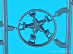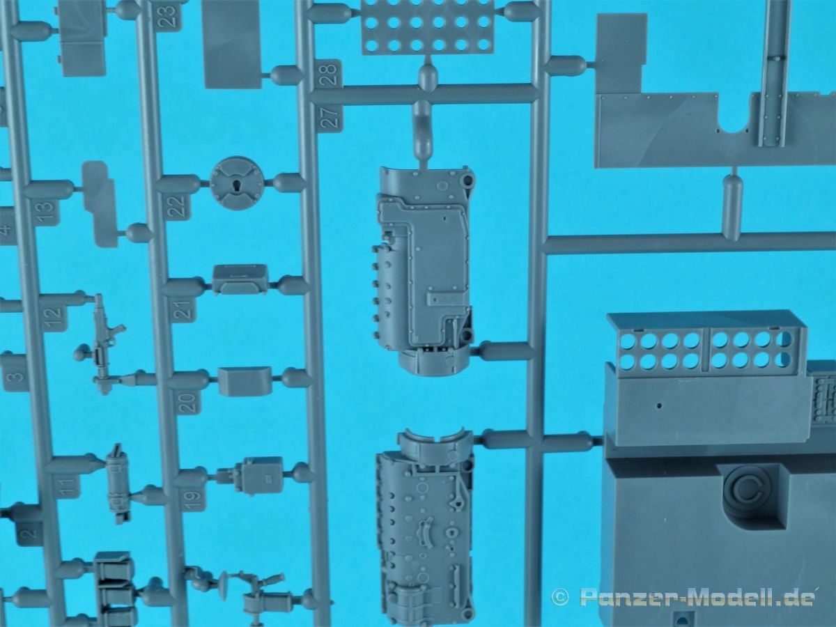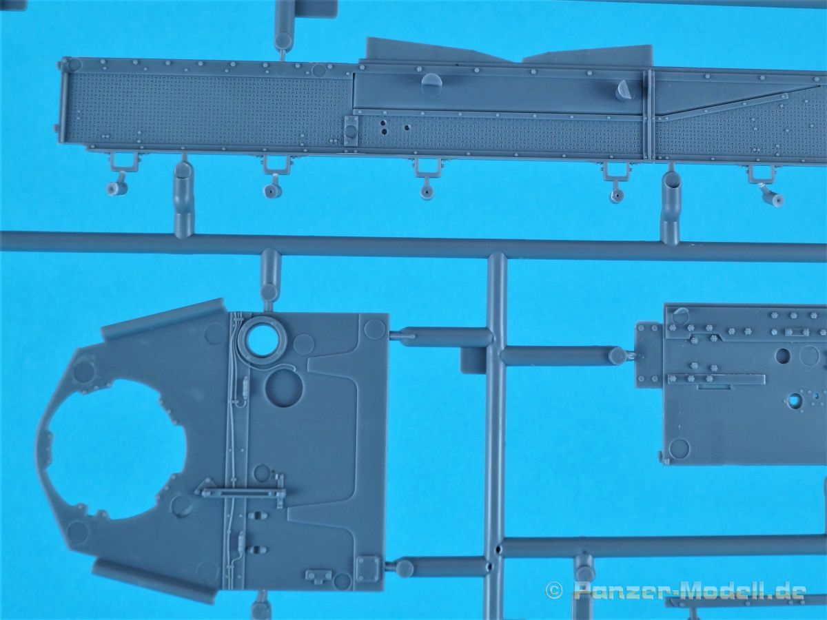 Unter der o.g. Nummer gibt es von MiniArt einen weiteren Panzer IV mit Inneneinrichtung. Diesmal eine mittlere „J“ Ausführung. Wenn ich mich nicht vertan habe offenbart sich der Inhalt der Bausatzschachtel (mit einer attraktiven Boxart versehen) mit 42 grauen und einem transparenten Spritzling. Dazu 22 Reihen mit den Kettengliedern und vier Rahmen Verbindungsbolzen. Eine Lehre für die Kettenmontage ist ebenfalls vorhanden. Alles wird abgerundet durch zwei PE-Platinen, einem umfangreichen Decalbogen und selbstmurmelnd der Bauanleitung. Bei der ersten Durchsicht der Bauteile zeigt sich eine sehr gute und hohe Qualität. Absolut auf der Höhe der Zeit! Keine Auswerfermarken in sichtbaren Bereichen, keine Formenversatz und auch keine Fischhäute… Was will man mehr? Die Unterwanne setzt sich aus mehreren Teilen zusammen. Das macht aber auch Sinn, denn so kann auf der toll strukturierten Bodenplatte vieles der Inneneinrichtung gut verbaut werden. Bei der Montage der Seitenteile würde es schon eng werden… Die Inneneinrichtung ist absolut top umgesetzt. Alles in hervorragendem Guß und mit einer sehr schönen Detailfülle. MiniArt scheint seine Hausaufgaben gemacht zu haben. Augenscheinlich fehlt hier nichts… Der Boden des Kampfraums mit den Tanks, die Munitionshalterungen, die teilweise offen oder geschlossen darstellbar sind und auch die einzelnen Granaten (inklusiv der passenden Decals!) die in verschiedenen Varianten vorliegen. Eine wahre Freude. Die Stellagen für die Bereitschaftsmunition wurden auch nicht vergessen. Weitere Pluspunkte holt sich der Kit mit den Antriebskomponenten. Vom Kardan über den reich detaillierten Getriebeblock mit den entsprechenden Wellen zu den Seitenvorgelegen und den Lenkbremsen. Alles mehrteilig und extrem detailliert in der Ausführung. Sehr gut im Spritzguß umgesetzt sind auch die Funkgeräte. Die Ausstattung des Fahrer- und Funkerplatzes ist ebenfalls auf hohem Niveau und sieht auch vollständig aus. Die Pedalerie, die Lenkhebel, die Sitze, die verschiedenen Instrumente (Decals!) und weitere Anbauteile hinterlassen einen weiteren positiven Gesamteindruck. Doch das ist nur der Anfang. Hinter dem Brandschott zum Motorraum finden wir einen mehrteiligen Motor von Maybach. Sehr detailliert und mit allen weiteren Anbau- und Anschlußteilen versehen. Für sich genommen ein richtiges Schmuckstück. Kühler, Lüfterelemente und weiter Kleinteile vervollständigen das Ensemble. Rund 40 Baustufen sind abzuarbeiten bis die Bodenplatte mit den Seitenteilen der Panzerwanne verbunden werden kann. Alle aufgeprägten Details, z.B. die Nieten, überzeugen auch hier. Korrekte Details gibt es auch an der Heckwand. Die Auspuffrohre/Flammenvernichter, erfreulicherweise in einem Stück und hohl gegossen, machen ebenfalls einen ausgezeichneten Eindruck. Die Glacisplatte liegt einzeln bei. Drei Öffnungen können optional offen oder geschlossen gebaut werden. Alle Luken sind auf der Innenseite ebenfalls detailliert dargestellt. Das gilt im kommenden Zusammenbau auch für alle weiteren Platten und Luken. So hat der Modellbauer so ziemlich alle Optionen zur Verfügung. Die Deckplatte des Panzerkastenaufbaus ist einteilig. Auch in diesem Fall können alle Luken offen (die Inneneinrichtung dankt es dir!) oder geschlossen gebaut werden. Mit dem Laufwerk kommt ein weiteres Highlight auf uns zu. Eine ganze Reihe von Optionsteilen (Z.B. verschiedene Leiträder und unterschiedliche Versionen an Stützrollen) stehen zur Auswahl. Alle Komponenten weisen wiederum scharfe Details auf. Auf den Rollenwagen, die man auch beweglich bauen kann, sind Produktionsnummern und Herstelleraufdrucke zu finden. Die Laufrollen überzeugen ebenfalls mit der Darstellung der Details. Zwei Optionen hat der Modellbauer bei den Nabenabdeckungen. Ohne Fehl auch der Schriftzug „Continental“ und Größenangaben auf den Gummibandagen. Ganz toll. Keine Abstriche sind auch bei den Ketten zu finden. Recht human in der Versäuberung, top umgesetzt, ohne Auswerferstellen mit aufgeprägten Produktionsziffern. Die Kette kann beweglich gebaut werden. Dazu werden von jeder Seite zwei Bolzen eingeschoben. Wenig Klebstoff ist das Gebot der Stunde. Zum einfacheren Bau liegt dem Kit eine Lehre bei. Die Front-, Seiten- und Heckbleche des Panzerkastenaufbaus werden einzeln angeklebt; hier muss man natürlich aufpassen und sehr sauber arbeiten damit dieser abschließend verzugs- und spaltenfrei aufgesetzt werden kann. Punkten können auch die Kettenabdeckbleche mit der sehr schönen Riffelblechstruktur. Optionen für die Werkzeuge und anzubringenden Ausrüstungsgegenstände gibt es auch in diesem Bereich. Thomaschürzen und Handgranatenschutzgitter liegen dem Bausatz als fein geätzte PE-Gitter bei und machen einen hervorragenden Eindruck. Die Schürzenelemente sind einzeln und lassen so dem Modellbauer gestalterische Möglichkeiten ob alle oder fehlende Elemente am Modell dargestellt werden. Die Halterungen setzen sich angenehmerweise aus relativ wenigen Plastikteilen inklusive der einteiligen Haltestange zusammen. Eine komplette und bis ins Detail überzeugende Inneneinrichtung zeichnet ebenfalls den Turm aus. Der Turm an sich baut sich aus dem Turmunterteil und dem mehrteiligen Oberteil sowie der Kanonenblende zusammen. Turmbühne, fein geriffelte Bodenplatte, Richt- und Sichtmittel, Sitze und auch die im Turm verborgenen Teile für die 7,5cm KwK L/48 finden sich im Inneren. Auch im Außenbereich kann der Turm überzeugen, z.B. mit den versenkten Schraubenköpfen… Für den optionalen Anbau auf dem Turmdach liefert MiniArt sogar einen Orterkompass mit dazugehörigem Decal. Tolle Sache! Die Öffnung der Nahverteidigungswaffe wurde auch nicht vergessen. Die zweiteiligen Seitenluken und natürlich auch die Luke der Kommandantenkuppel lassen sich offen darstellen - sei es um Figuren zu platzieren oder weitere Blicke auf das schöne Innenleben zu ermöglichen. Für die Turmbewaffnung stehen zwei verschiedene Blenden 