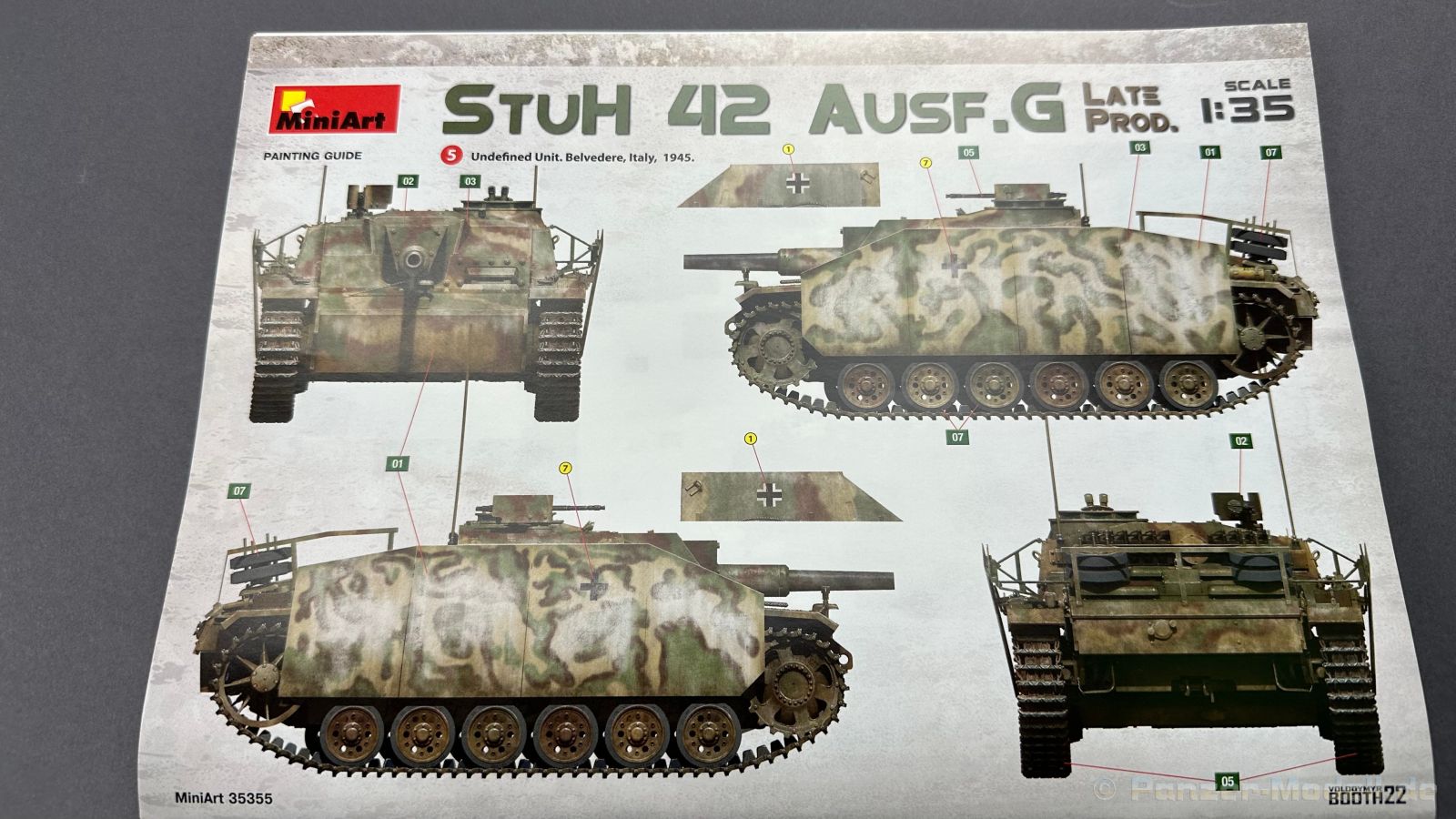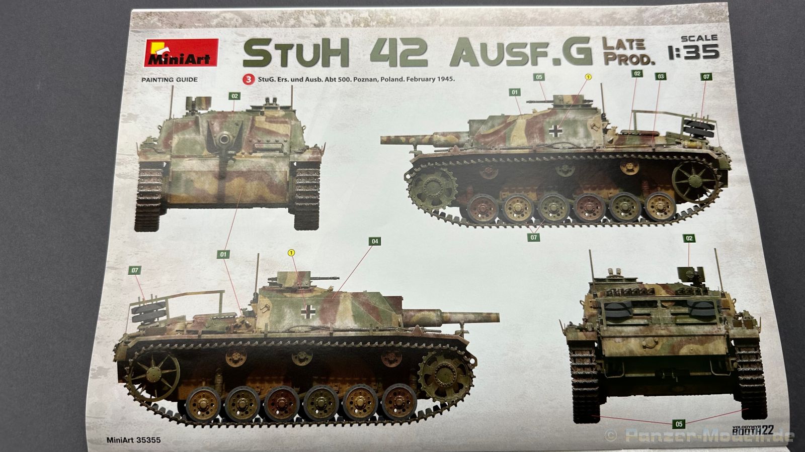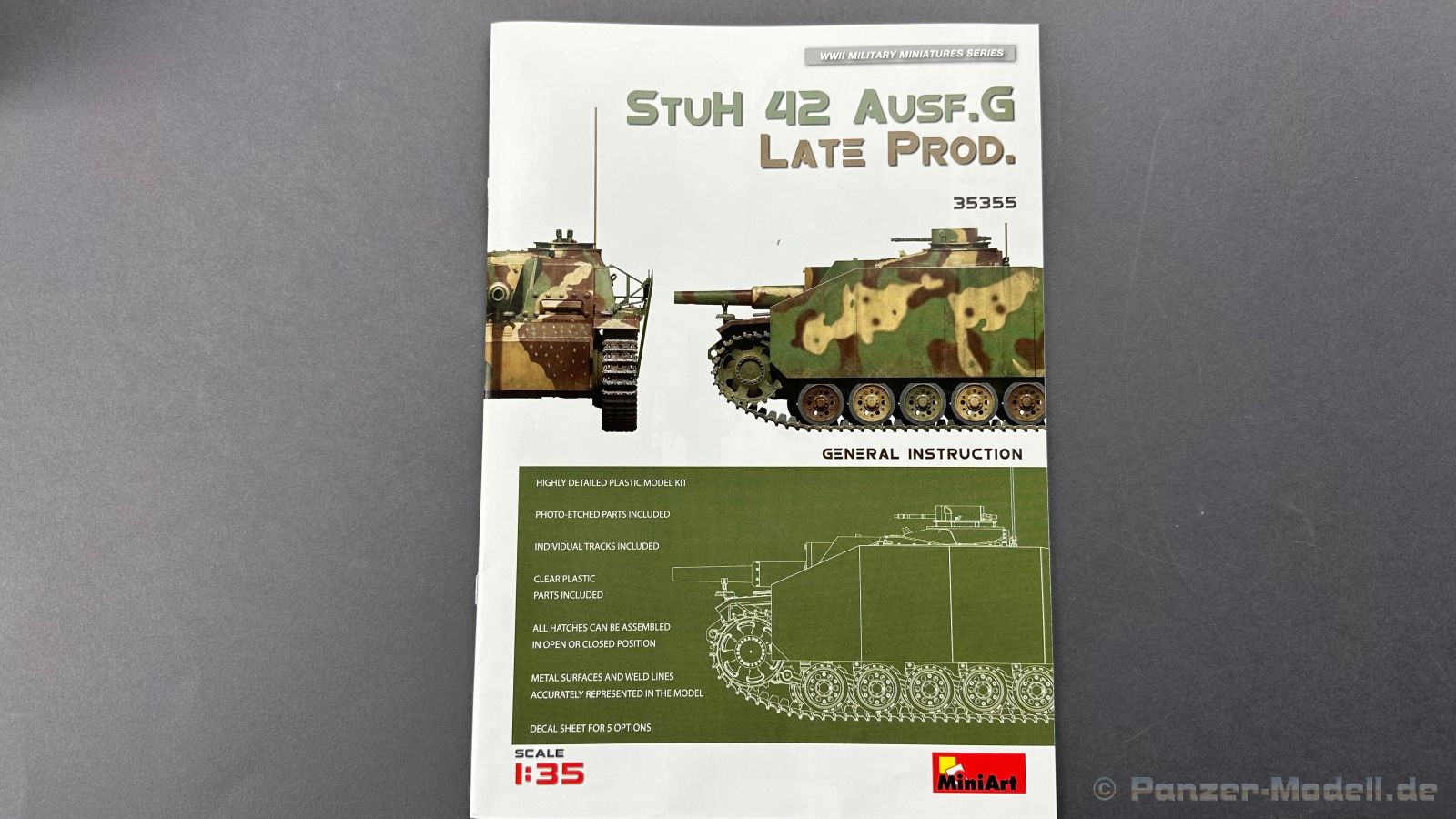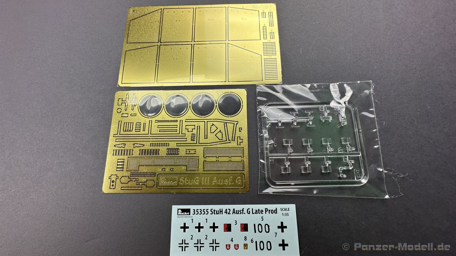 Nach diversen Sturmgeschützen aus dem Hause Mini Art, habe ich mich auf die späte Variante der Sturmhaubitze sehr gefreut, warum, das schreibe ich gerne weiter unten ï Kommen wir zuerst zu etwas Geschichtlich, die ersten Prototypen der Sturmhaubitze 42, kurz StuH 42 wurden im Jahre erstmals 1942 gebaut, anstatt der 7,5 cm StuK verbaute man eine 10,5 cm Haubitze die aus der 10,5 cm le Fh abgeleitet wurde, dazu wurde natürlich auch der Innenraum für die Munition um bzw. angepasst. Ziel war es eine mobile Unterstützung für die Infanterie zu haben. Bis zum Ende des Krieges wurden 1317 Exemplare von Alkett gebaut. Komme ich nun zum Bausatz, in dem Stülpkarton mit der sehr ansprechenden Boxart, befinden sich 37 Spritzlinge, die in einem mittleren Grauton gehalten sind, hört sich zuerst nach vielen Teilen an, aber von den 37 Spritzlingen entfallen alleine für die Ketten schon 12 Stück. Weiterhin haben wir einen kleinen Spritzling mit Glasklaren, durchsichtigen Kunststoff für die Lampen und Optiken, 2 Ätzteilplatinen, eine für allerlei Anbauteile und eine für die Schürzen. Insgesamt sind 5 Decalcarianten enthalten, die sich wie folgt gliedern: