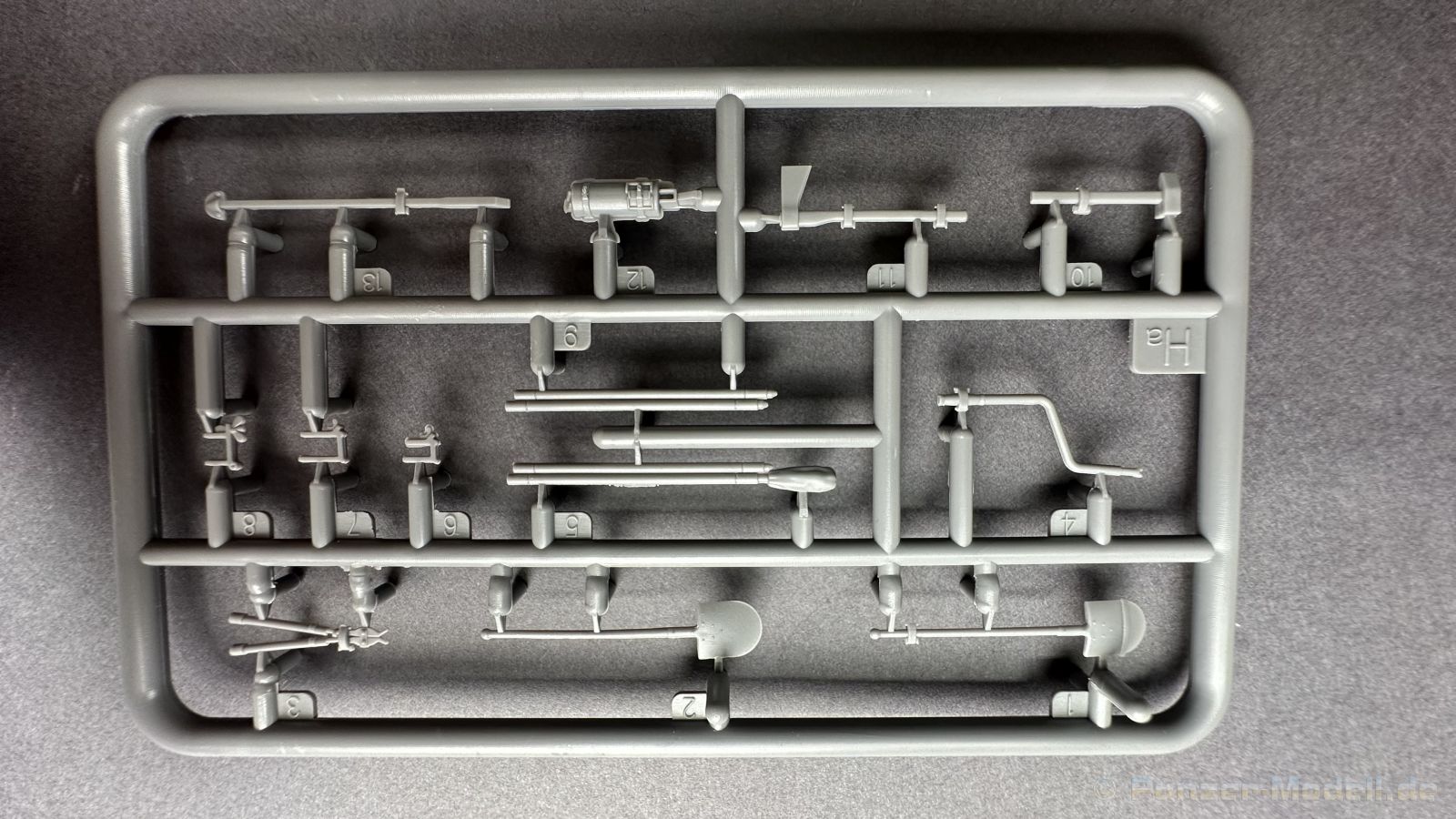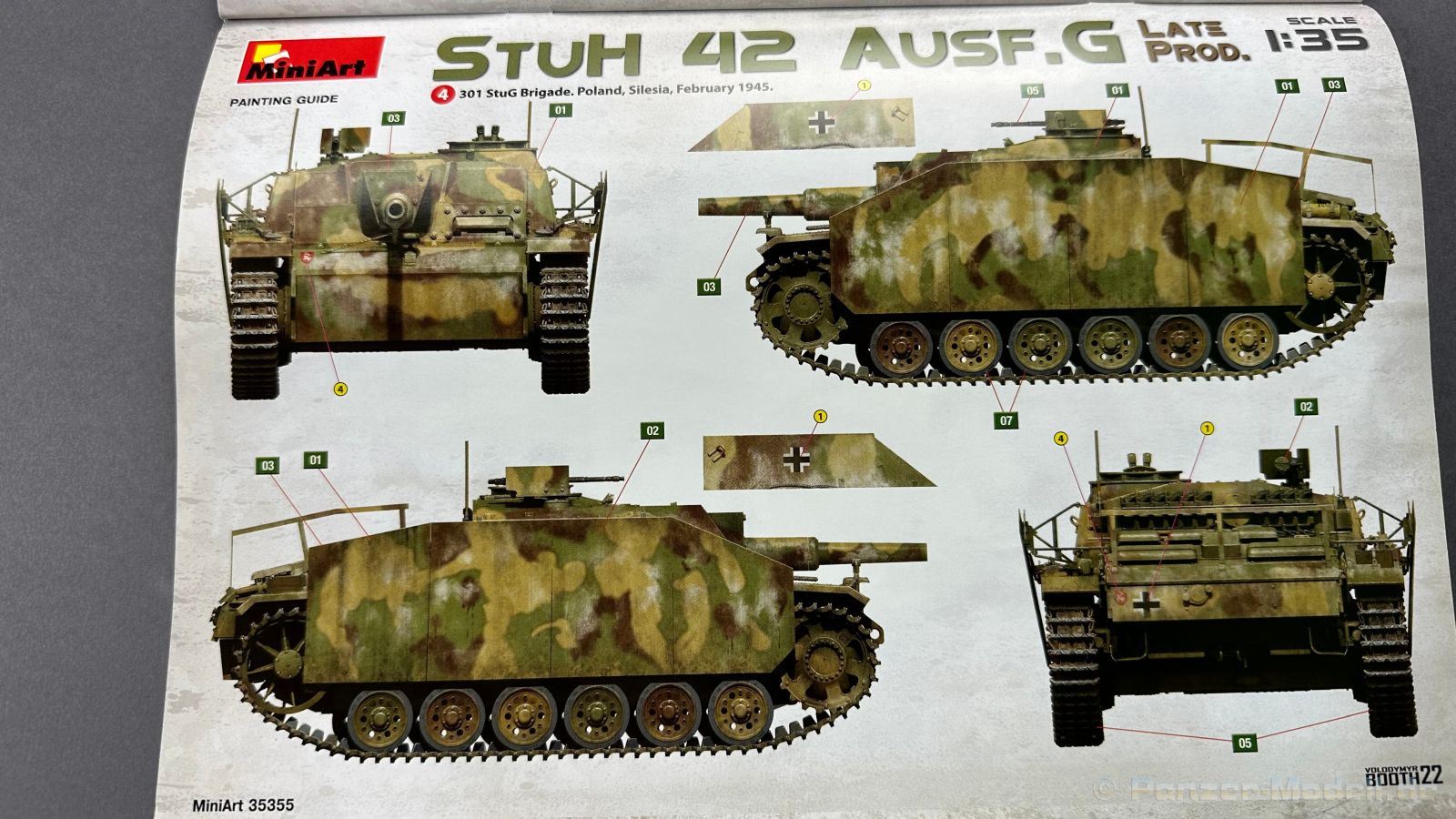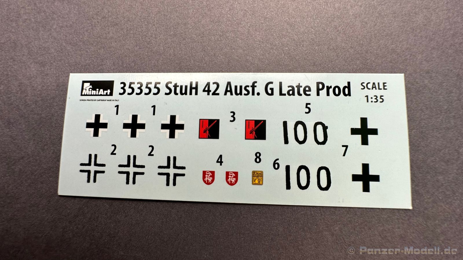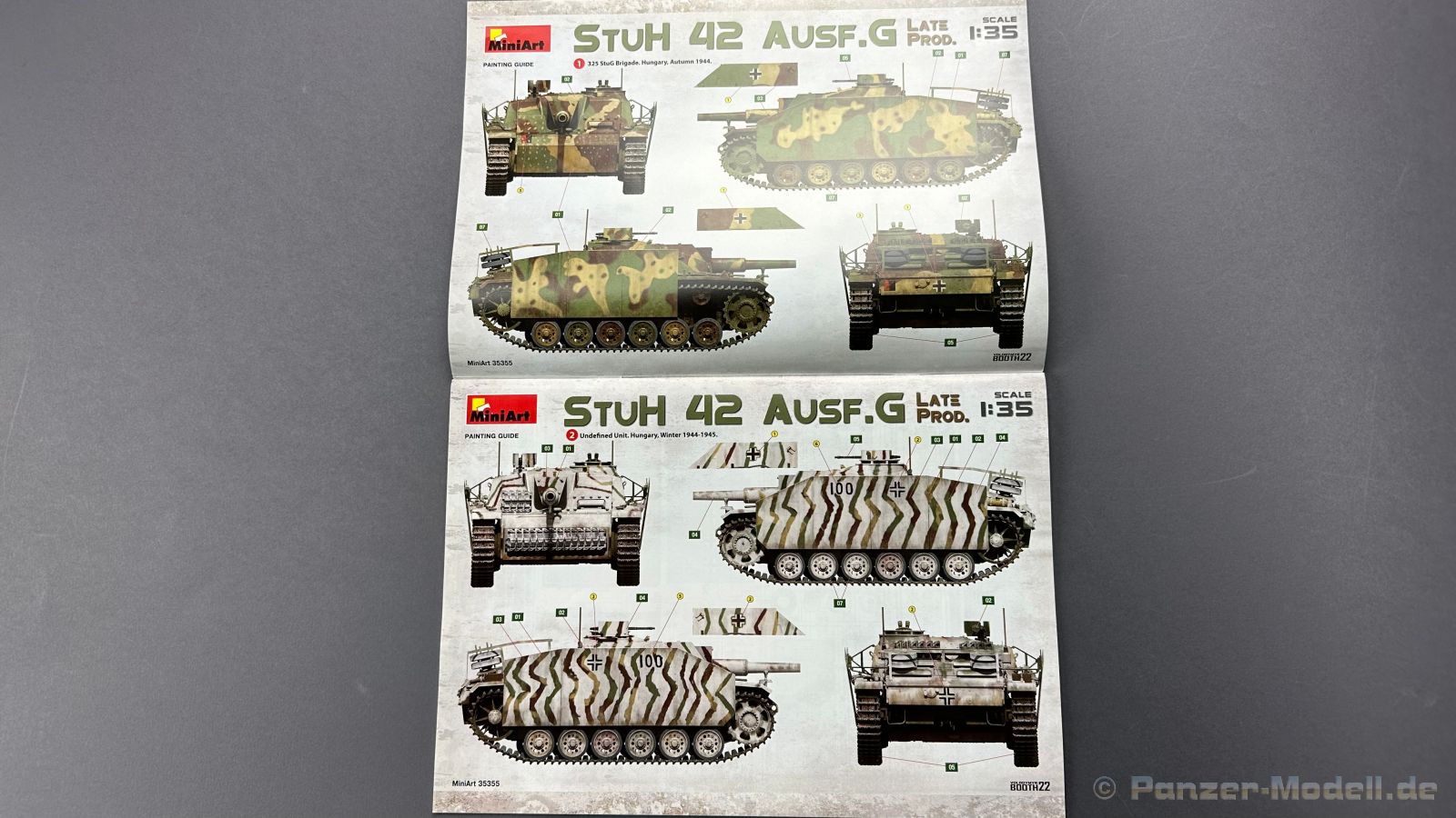 Nach diversen Sturmgeschützen aus dem Hause Mini Art, habe ich mich auf die späte Variante der Sturmhaubitze sehr gefreut, warum, das schreibe ich gerne weiter unten ï Kommen wir zuerst zu etwas Geschichtlich, die ersten Prototypen der Sturmhaubitze 42, kurz StuH 42 wurden im Jahre erstmals 1942 gebaut, anstatt der 7,5 cm StuK verbaute man eine 10,5 cm Haubitze die aus der 10,5 cm le Fh abgeleitet wurde, dazu wurde natürlich auch der Innenraum für die Munition um bzw. angepasst. Ziel war es eine mobile Unterstützung für die Infanterie zu haben. Bis zum Ende des Krieges wurden 1317 Exemplare von Alkett gebaut. Komme ich nun zum Bausatz, in dem Stülpkarton mit der sehr ansprechenden Boxart, befinden sich 37 Spritzlinge, die in einem mittleren Grauton gehalten sind, hört sich zuerst nach vielen Teilen an, aber von den 37 Spritzlingen entfallen alleine für die Ketten schon 12 Stück. Weiterhin haben wir einen kleinen Spritzling mit Glasklaren, durchsichtigen Kunststoff für die Lampen und Optiken, 2 Ätzteilplatinen, eine für allerlei Anbauteile und eine für die Schürzen. Insgesamt sind 5 Decalcarianten enthalten, die sich wie folgt gliedern: