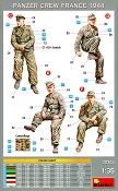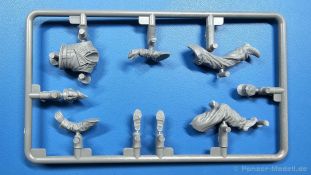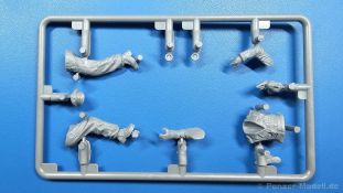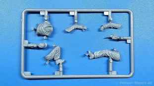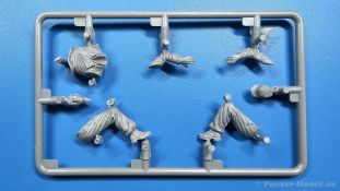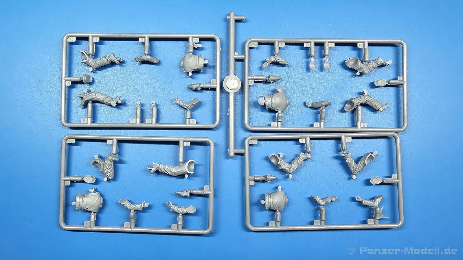 MiniArt hat sich wieder Figuren aus der Zeit des späten 2. Weltkrieges angenommen. Es handelt sich um 4 Panzersoldaten der Waffen-SS in Frankreich im Jahr 1944, die auf/am Fahrzeug sitzen. Sie tragen zu der Zeit übliche Tarnuniformen. In der 260 x 160 x 35 mm großen, seitlich zu öffnenden Schachtel befinden sich 4 hellgraue Spritzlinge. Auf der Rückseite der Schachtel sehen wir farbige Abbildungen der Figuren. Teilenummern und Markierungen zeigen, wo die Teile hingehören. Ein kleines, farbiges Quadrat zeigt einen Ausschnitt des angedachten Tarnmusters. Bemalungshinweise und eine Farbtabelle für Vallejo, Mr. Color, AK RC, Mission Models, AMMO MIG und Tamiya Farben befinden sich unterhalb der Anleitung. Die Teile aus grauem Plastik sind gut ausgespritzt, ohne Verzug und Versatz, keine Sinkstellen. Die Angüsse sind akzeptabel und so gesetzt, dass sie beim Abtrennen vom Spritzling und beim Versäubern keine Probleme bereiten. Fertigungsbedingt findet man feinen Grat der Formtrennnaht. In der Nahaufnahme sieht es schlimmer aus als es ist. Mit Bastelmesser, einer feinen Feile oder Schleifpapier lässt sich diese leicht entfernen. Jede Figur besteht aus Rumpf, Armen, Beinen, Kopf und Kopfbedeckung. Beim Kommandanten finden wir zusätzlich die Ohrmuscheln des Kopfhörers. Den Bügel und die Verkabelung dafür muss man selbst herstellen. Eine andere Figur bekommt für ihre Schuhe separate Sohlen. Es gibt keine weiteren Ausrüstungsgegenstände. Von den Haltungen her befinden sich die Soldaten im sicheren Raum z.B. bei einer Marschpause. Für Spritzguss sind die Gesichter gut gestaltet, der Faltenwurf der Uniform kommt glaubhaft rüber. Details wie Hosennähte, die typischen Kragen, Uniformabzeichen, Koppelschloss, Funksprechsatz und Abzeichen an der Schirmmütze des Kommandanten sind hervorstechende Merkmale. Ein feines Set, um einem Panzer mehr Leben zu geben. In Deutschland werden die Figuren zwischen 12 und 15 Euro gehandelt.