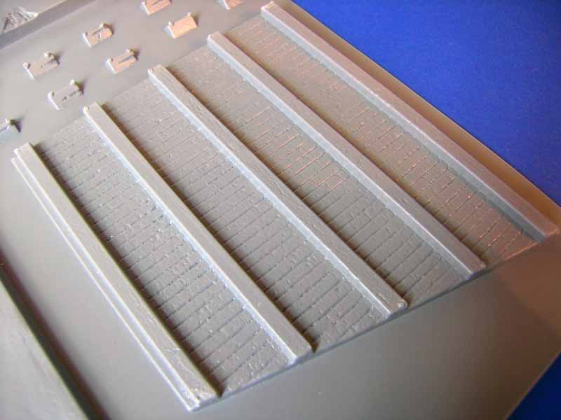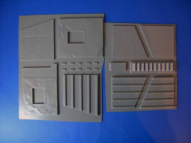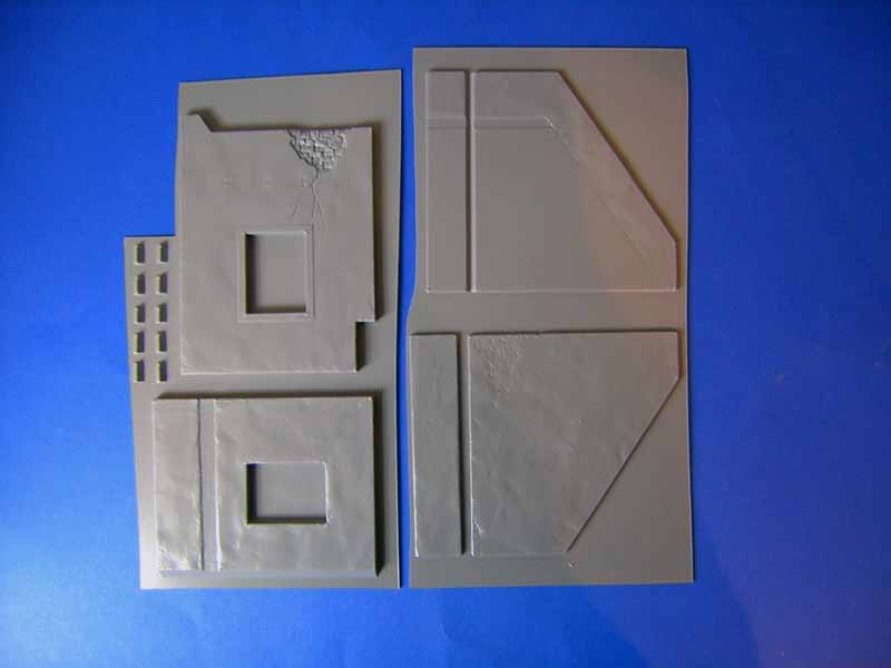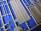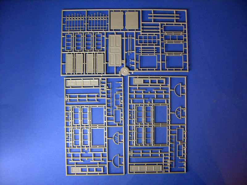 Das Gebäude kann sowohl für Dioramen aus der Zeit des zweiten Weltkriegs bis hin zur heutigen Zeit verwendet werden und bietet so unzählige Möglichkeiten. Es handelt sich hierbei nicht um eine Ruine, sondern um ein intaktes, zweistöckiges Haus mit folgenden Abmessungen: Länge 222 mm, Breite 125 mm, Höhe 224 mm. Insgesamt sind 130 Bauteile enthalten. Die Mauern und Wände bestehen aus Tiefziehbauteilen während für die Details und Accessoires, wie Türen, Fenster, Jalousien usw. Spritzgussbauteile zur Anwendung kommen. Das fertige Gebäude verfügt auf der Außenseite über einen Balkon sowie eine Außentreppe die den Zugang zur oberen Etage ermöglicht. Auf der Innenseite entstehen vier einzelne Räume, die allesamt innen detailliert und mit unterschiedlichen Fußbodenbelägen aus Fliesen dargestellt sind. Die Unterkonstruktion der Zimmerdecken zeigt eine Lage aus Holzbalken. Das fertige Gebäude ist hinten offen und ermöglicht so den Einblick auf die Innenräume. Die Gesamtkonstruktion ist bereits so ausgelegt dass das Haus später im Diorama schräg zu den Kanten der Grundplatte aufgestellt wird. Man braucht sich hier also keine Gedanken mehr um einen eventuellen Zuschnitt zu machen. Das hat der Hersteller bereits berücksichtigt und für uns erledigt. Der Aufstellwinkel zu den Kanten der Dioramengrundplatte beträgt ca. 50° . Die Spritzgussteile für Fenster und Türen weisen an einigen Bauteile leichte Gusshäute auf. Besonders bei den Außenjalousien kommt hier Nacharbeit auf den Modellbauer zu, siehe Detailfoto. Die Türen sind gut detailliert und weisen sogar ein feine Holzstruktur auf, verfügen aber im sichtbaren Bereich auch über einige Auswerferstellen die nicht ganz einfach zu entfernen sein werden, siehe Detailfoto. Darüber hinaus lassen sich die Türen und Fenster wahlweise offen oder geschlossen darstellen. Allerdings liegt für die Darstellung der Fensterscheiben kein klares Plastikmaterial bei. Das muss man sich im Bedarfsfall selbst beschaffen Die Bauanleitung besteht aus einem doppelseitig bedruckten DIN A4 Blatt und zeigt den Bau in 25 sehr übersichtlichen Baustufen mit schwarz-weiß Zeichnungen. Da dürften kaum Schwierigkeiten auftauchen. Fazit: Mit einem Verkaufspreis von nur 20,50 EUR ist dieser Bausatz uneingeschränkt zu empfehlen. Besonders im Vergleich zu Gebäudebausätzen aus Gipskeramik ist der Detailreichtum und die Ausstattung unschlagbar.