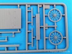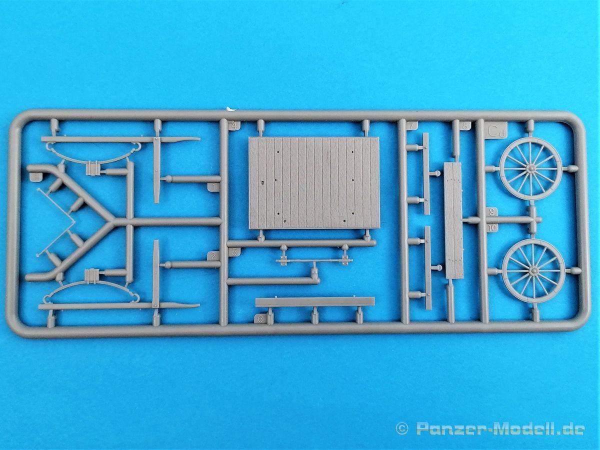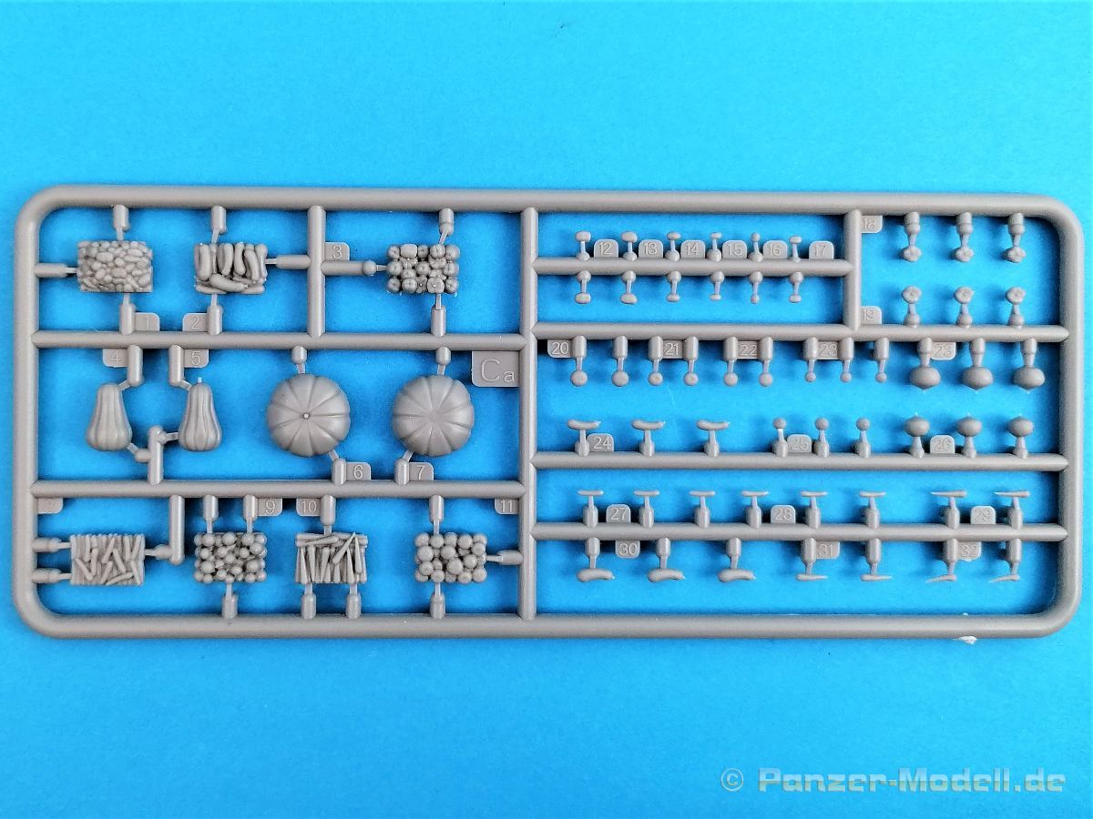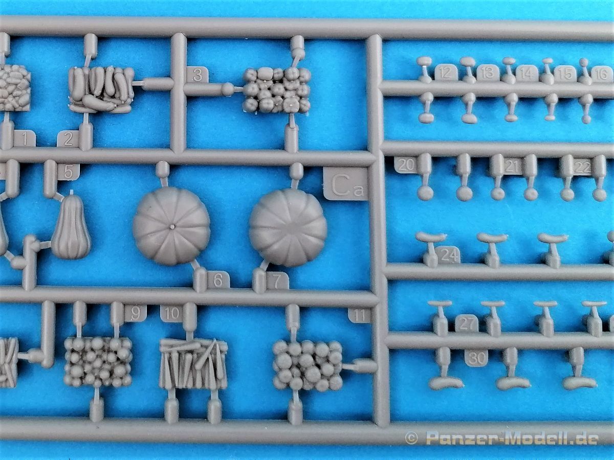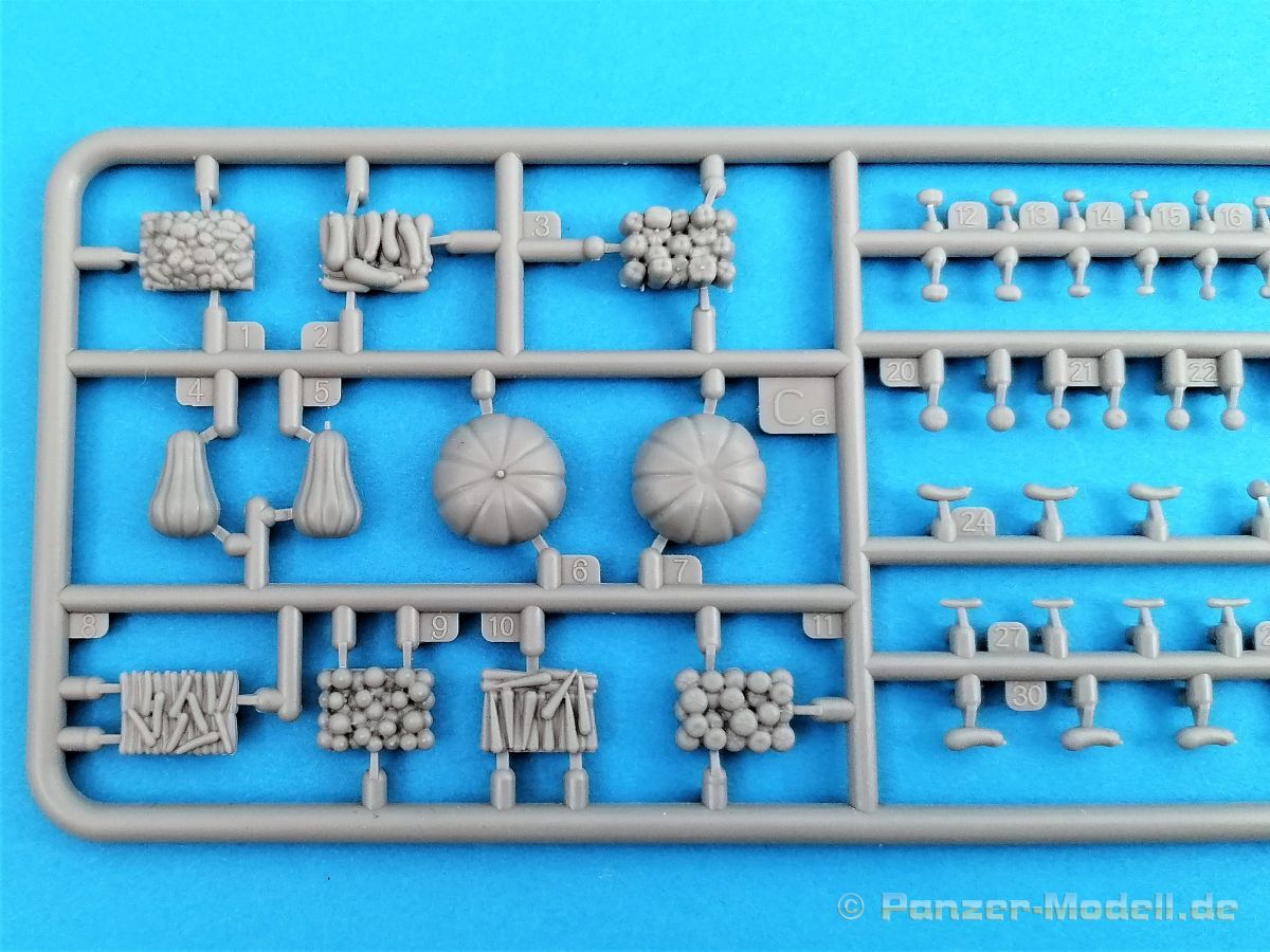 MiniArt schafft es immer wieder durch Kombination von “alten” Spritzlingen aber auch durch Ergänzungen einen “neuen” Kit auf den Weg zu schicken. Uns soll es nicht stören. Der o.g. Kit stammt aus den “Buildings & Accessories Series”. Die typische 26x16x3,5 cm große Faltschachtel enthält insgesamt vier hellgraue Spritzlinge zum Bau eines Gemüsekarrens mit Beladung. Die Teile sind absolut sauber gespritzt, ohne Auswerferspuren, Versatz, Sinkstellen oder Fischhäute. Spritzling Cd enthält alle Teile die zum Bau des Karrens benötigt werden. Filigrane Räder mit klar erkennbaren Radreifen und feinen Speichen überzeugen auf der ganzen Linie. Auch die Bretterstruktur der Ladefläche kommt sehr gut. Filigran und überzeugend auch die Federung der Achse. Herausfordernd dürfte sich das Abtrennen der Achse und der Verstrebung erweisen, da diese Teile extrem fein gegossen sind. Zwei weitere Rahmen (Cf) halten jeweils die Teile für vier Gemüsekisten. Ober- und Unterteil gibt es jeweils extra. Auch hier ist die Feinheit überzeugend. Und damit kommen wir zum letzten Spritzling der allerlei Vitamine J u.ä. für uns bereithält. Für sieben der acht Kisten gibt es ein schön detailliertes Innenleben mit Auberginen, Kartoffeln, Gurken, Karotten und weiterer Gemüsesorten. Für die leere Kiste wird eine Befüllung mit roter Beete vorgeschlagen. Dazu noch eine Reihe von einzelnen Gemüsesorten mit denen die Kisten weiter aufgefüllt werden können. Und als Gimmick gibt es noch zwei Kürbisse die man neben oder vor dem Karren platzieren kann. Alles top umgesetzt. Auf der Rückseite der Schachtel befindet sich die übersichtliche Bauanleitung inklusive Bemalungshinweisen. Die Farbtabelle zeigt Farbnummern für folgende Hersteller: