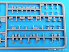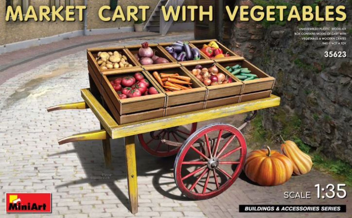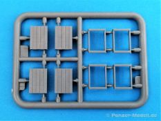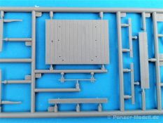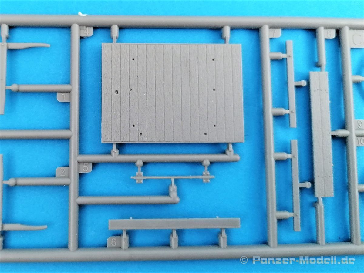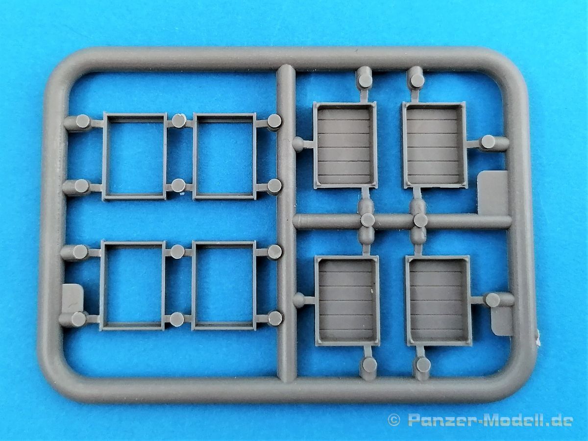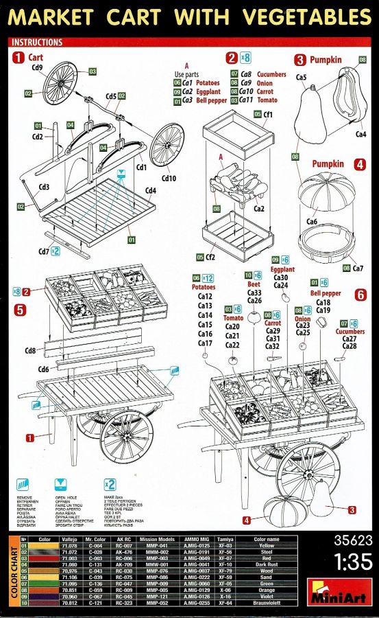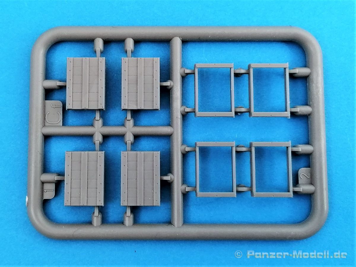 MiniArt schafft es immer wieder durch Kombination von “alten” Spritzlingen aber auch durch Ergänzungen einen “neuen” Kit auf den Weg zu schicken. Uns soll es nicht stören. Der o.g. Kit stammt aus den “Buildings & Accessories Series”. Die typische 26x16x3,5 cm große Faltschachtel enthält insgesamt vier hellgraue Spritzlinge zum Bau eines Gemüsekarrens mit Beladung. Die Teile sind absolut sauber gespritzt, ohne Auswerferspuren, Versatz, Sinkstellen oder Fischhäute. Spritzling Cd enthält alle Teile die zum Bau des Karrens benötigt werden. Filigrane Räder mit klar erkennbaren Radreifen und feinen Speichen überzeugen auf der ganzen Linie. Auch die Bretterstruktur der Ladefläche kommt sehr gut. Filigran und überzeugend auch die Federung der Achse. Herausfordernd dürfte sich das Abtrennen der Achse und der Verstrebung erweisen, da diese Teile extrem fein gegossen sind. Zwei weitere Rahmen (Cf) halten jeweils die Teile für vier Gemüsekisten. Ober- und Unterteil gibt es jeweils extra. Auch hier ist die Feinheit überzeugend. Und damit kommen wir zum letzten Spritzling der allerlei Vitamine J u.ä. für uns bereithält. Für sieben der acht Kisten gibt es ein schön detailliertes Innenleben mit Auberginen, Kartoffeln, Gurken, Karotten und weiterer Gemüsesorten. Für die leere Kiste wird eine Befüllung mit roter Beete vorgeschlagen. Dazu noch eine Reihe von einzelnen Gemüsesorten mit denen die Kisten weiter aufgefüllt werden können. Und als Gimmick gibt es noch zwei Kürbisse die man neben oder vor dem Karren platzieren kann. Alles top umgesetzt. Auf der Rückseite der Schachtel befindet sich die übersichtliche Bauanleitung inklusive Bemalungshinweisen. Die Farbtabelle zeigt Farbnummern für folgende Hersteller: