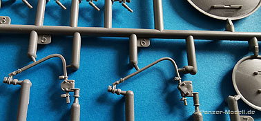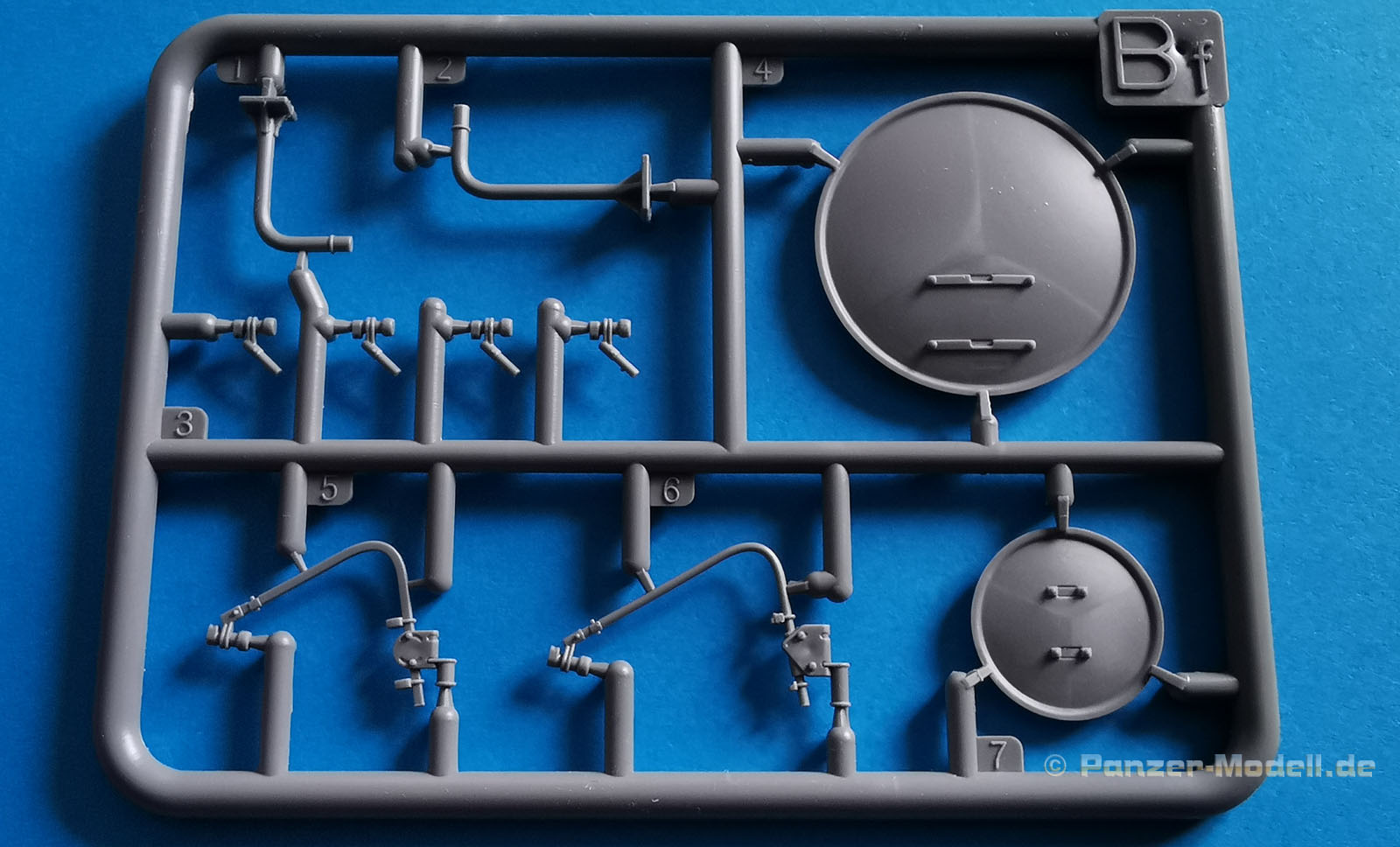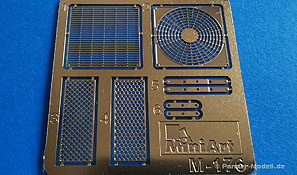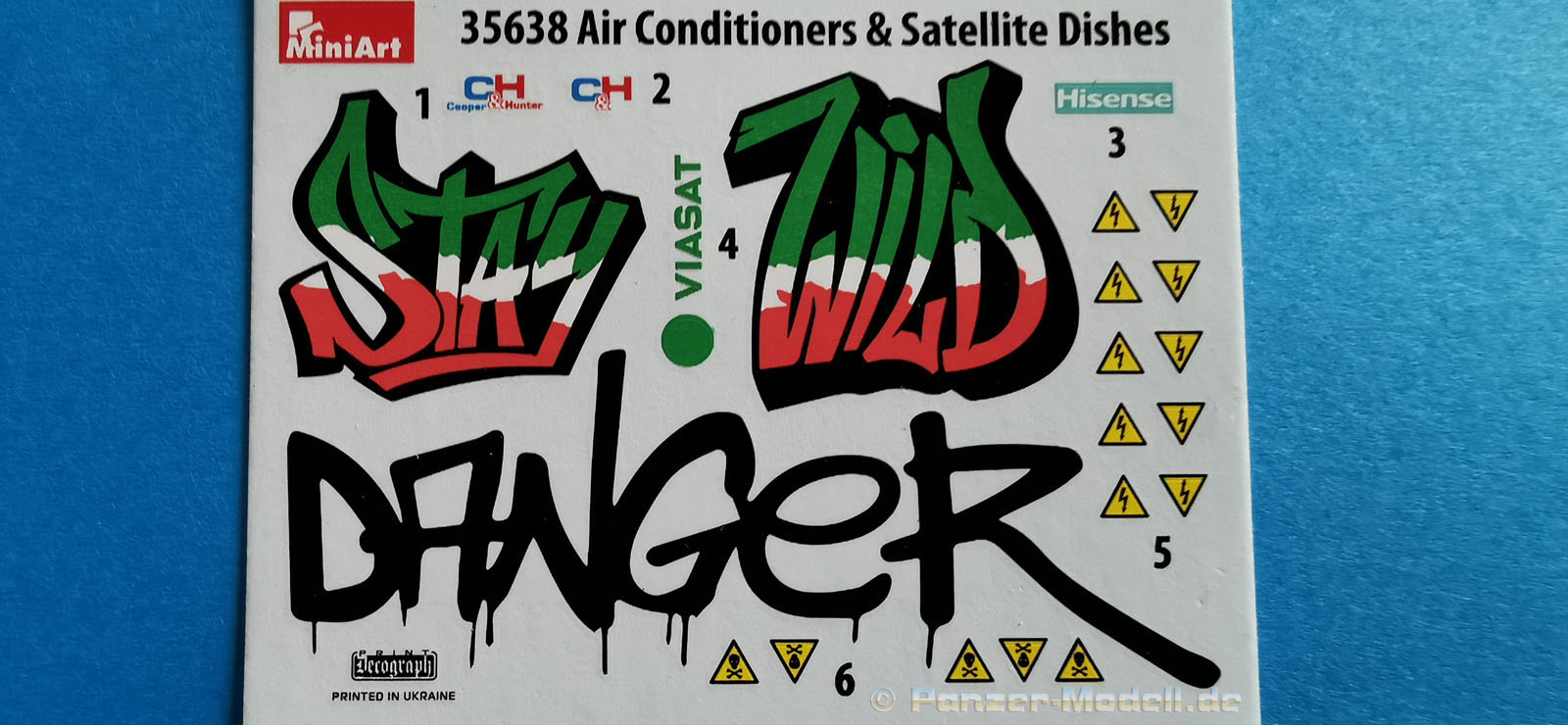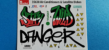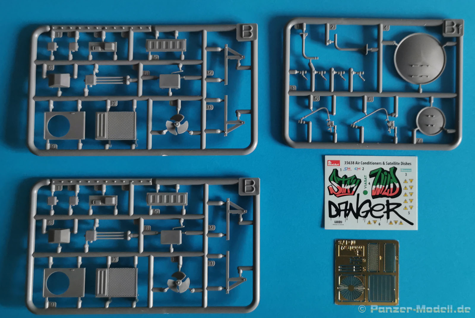 MiniArt bietet mit der Art. Nr. 35638 ein kleines aber feines Zubehörset an. Im Set enthalten sind drei Rahmen mit dunkelgrauen Spritzgussbauteilen, ein Decal Sheet sowie eine kleine Platine mit Photoätzteilen. Mit dem Bausatzinhalt können zwei Satellitenschüsseln mit Anbauteilen, zwei extern an Gebäuden montierten Klimageräte, zwei elektrische Schaltkästen sowie sechs elektrische Anschluss- / Verteilerdosen gebaut werden. Das Decal Sheet beinhaltet die nötige Beschriftung für die Elektronikbauteile, für die Satellitenschüsseln sowie zwei Graffittis in englischer Sprache. Einmal den Schriftzug DANGER und einmal den Schriftzug STAY WILD. Während der Spritzrahmen Bf zwei unterschiedliche Satellitenschüsseln mit unterschiedlichen Wandhalterungen bietet so sind die beiden Spritzrahmen B für die Klimageräte exakt gleich. Dennenoch bietet der Bausatz die Möglichkeit auch die Klimageräte optisch unterschiedlich darzustellen. Das geschieht durch die Verwendung der Photoätzteile. Hier liegen nämlich als Optionsteile (PE1 & PE2) unterschiedliche Gitterabdeckungen für die Lüfter bei. Auch die seitlichen Gitterabdeckungen (PE3 & PE4) sind optisch unterschiedlich dargestellt und bieten so Variationsmöglichkeiten. Eine Bauanleitung befindet sich auf der Rückseite der Bausatzpackung. Sie zeigt sehr übersichtlich die Montage, die Bemalung sowie die Platzierung der Decals. Farbangaben sind vorhanden für Vallejo, Mr. Color, AK Real Color, Mission Models, Ammo by Mig und Tamiya. Die Fertigungsqualität der Spritzgussbauteile ist absolut Top! Feinste scharfkantige Details, fast keine Gussgrate vorhanden und relativ kleine Angüsse sind hier zu nennen.Und wenn man dann noch sieht dass bei den beiden Schaltkästen sogar das Innenleben dargestellt ist und man die Kästen wahlweise offen oder geschlossen darstellen kann... Was will man mehr? Dieser Bausatz richtet sich an die Dioramenbauer, durch die zwangsweise Verwendung der Photoätzteile und Filigranität der Bauteile sollte schon eine gewisse Modellbauerfahrung vorhanden sein.