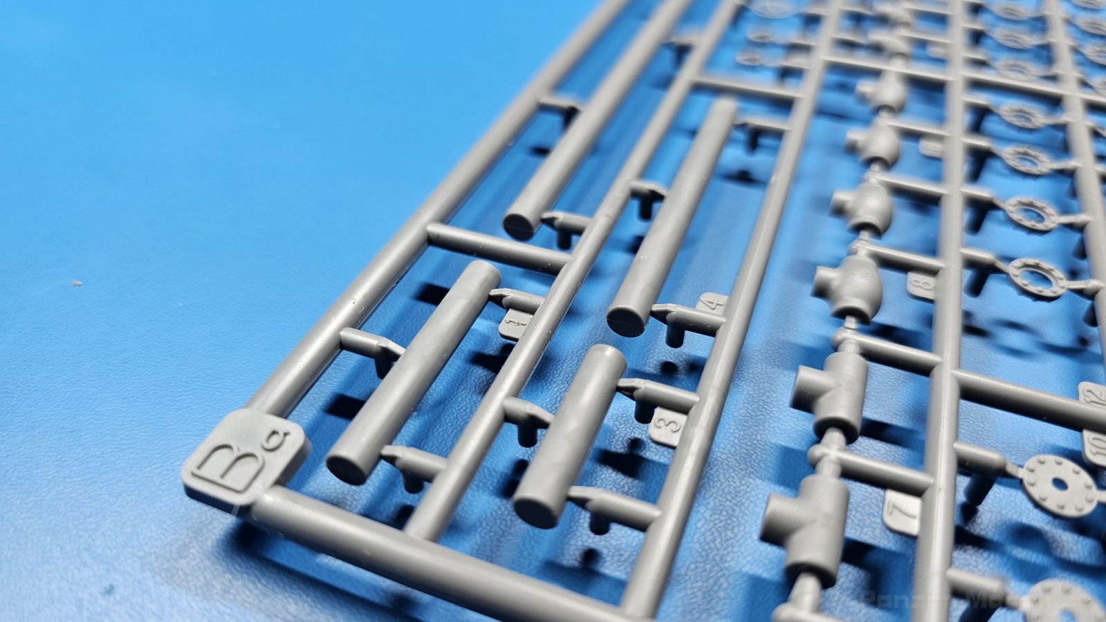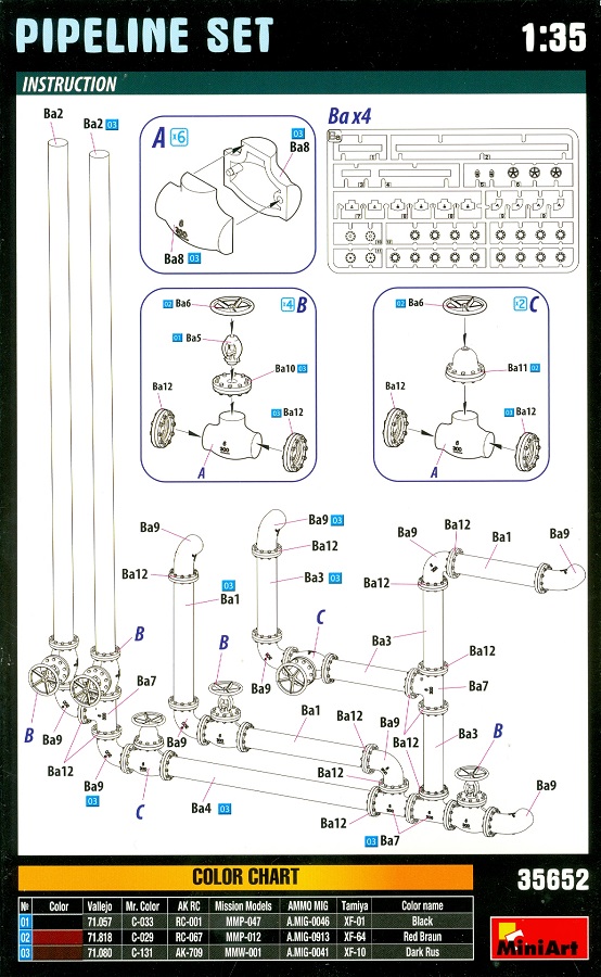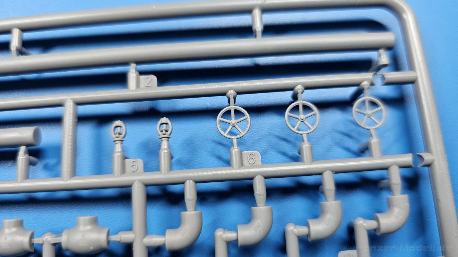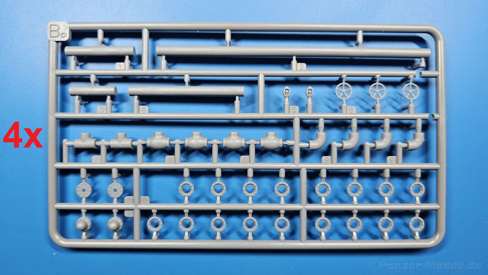 Wo sind die Rohrleitungsbauer unter Euch? MiniArt spart Euch jetzt Kräfte, denn jetzt könnt Ihr auch den Rohrleitungsbau mit leichtem Material in 1:35 vornehmen. Die 260 x 160 x 35 mm große Faltschachtel enthält vier identische, hellgraue Spritzlinge. Jeder Spritzling enthält 4 verschiedene lange Rohrstücke, Verbindungsflansche, Ventile samt Handrädern, T-förmige Verbindungsstücke und 90° Kniestücke. Die Teile sind sauber gespritzt, ohne Auswerferspuren, Versatz, Sinkstellen oder Fischhäute. Die Rohr-, Knie- und T-Stücke sollen zwar Rohrelemente darstellen, sind aber aus Vollmaterial hergestellt, was nur stören würde, wenn man ein offenes Rohrende darstellen möchte. Und selbst dann hilft ein großer Bohrer, das schnell zu öffnen. Die im Original gegossenen Teile sind erhabenen Gussnummern versehen. Es gibt zwei Ventilarten, die sich durch den Ventilkopf unterscheiden. Das Kartonbild und die Bauanleitung geben Beispiele, wie man die Rohre verbinden könnte, aber da ist der eigenen Fantasie keine Grenze gesetzt, zumal der Karton auch mehr teile enthält als auf dem Bild zu sehen. Auf der Rückseite der Schachtel befindet sich die Teileübersicht und die übersichtliche Bauanleitung inklusive Bemalungshinweisen. Die Farbtabelle zeigt Farbnummern für folgende Hersteller: - Vallejo Ideal für ein Fabrikdiorama, aber auch als Lkw-Ladung denkbar, finden wir ein einfaches und gleichzeitig gut detailliertes Set im Karton. Der Preis liegt in Deutschland um die 11-14 Euro.