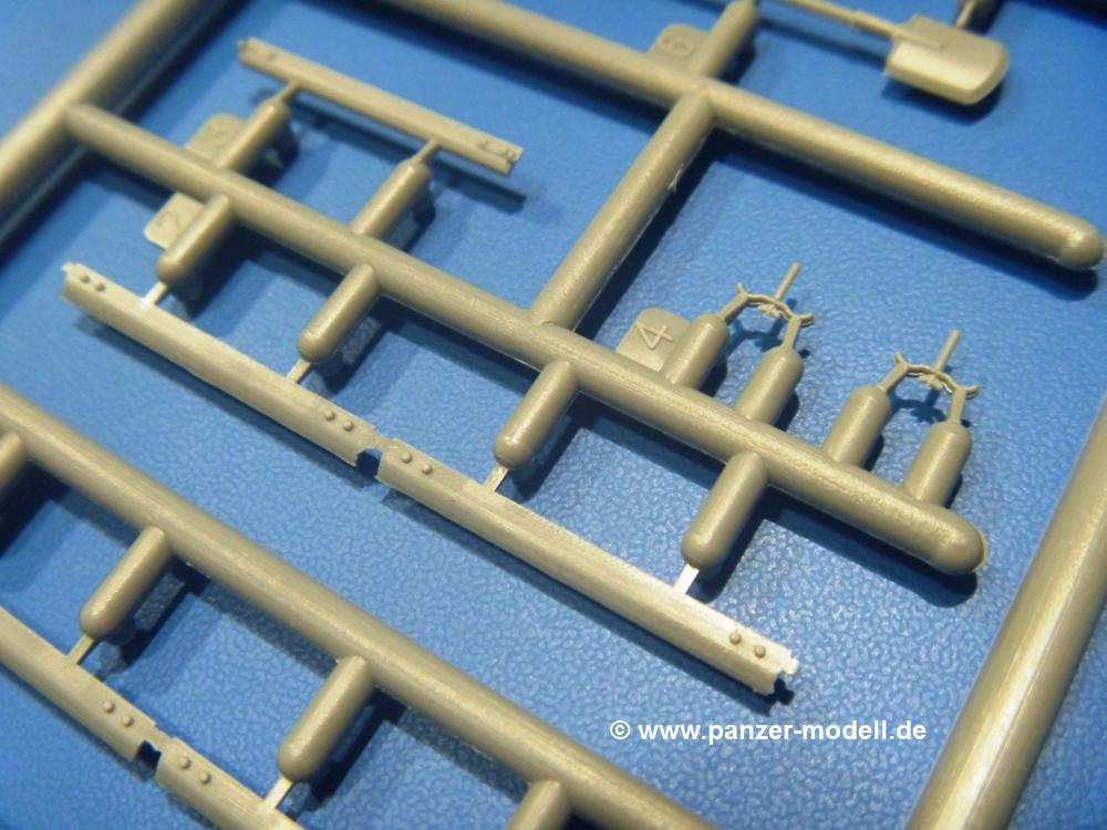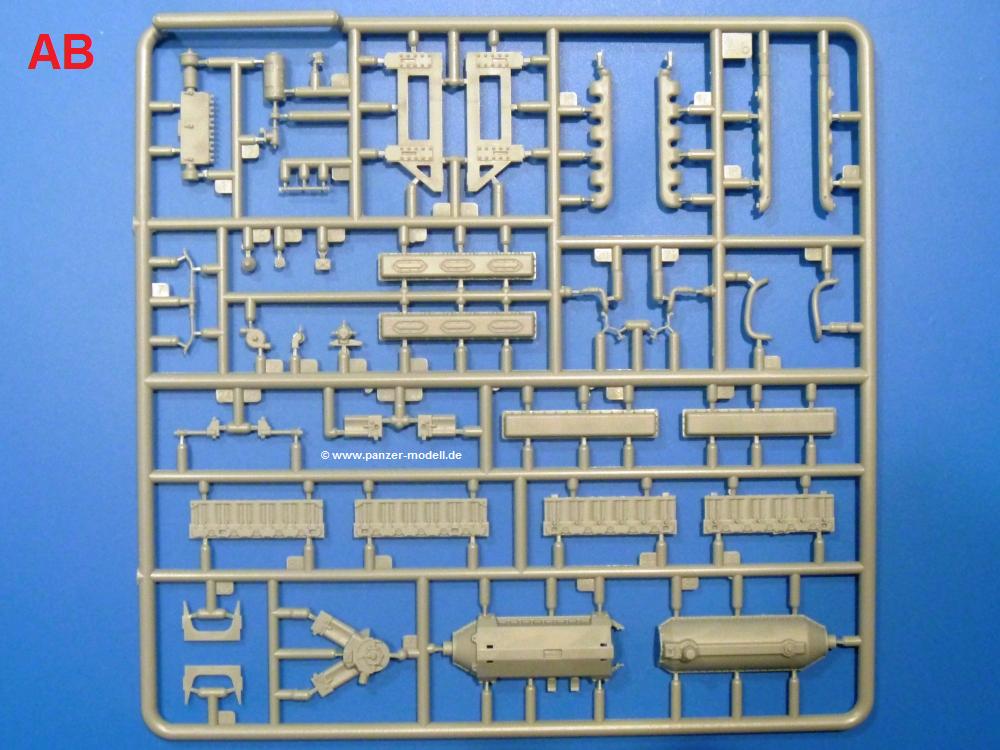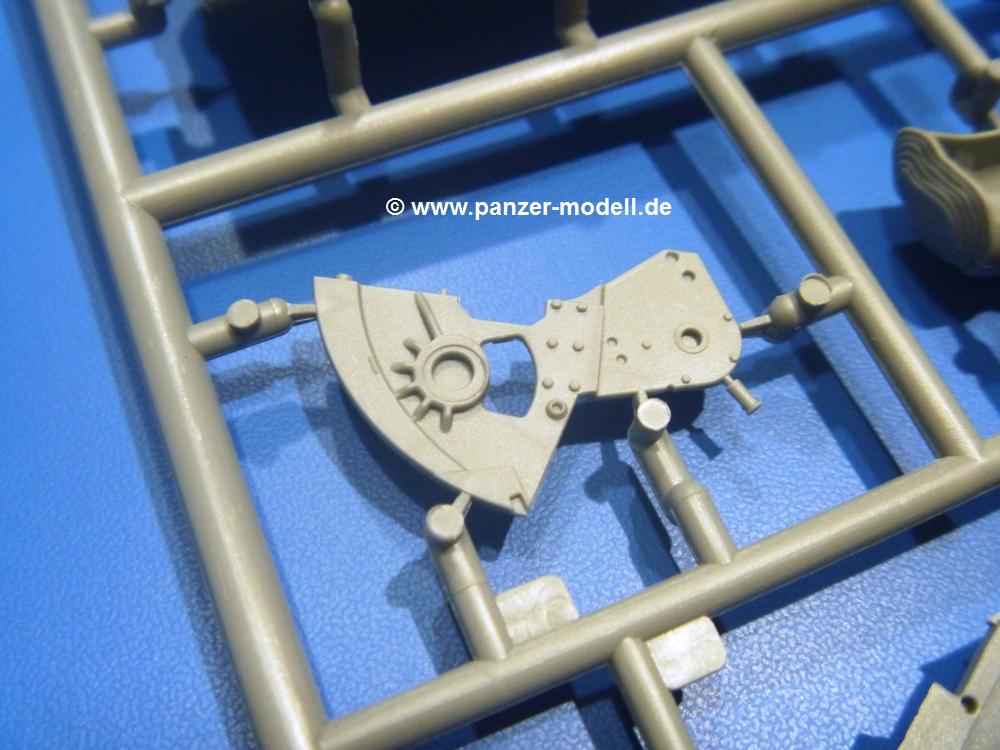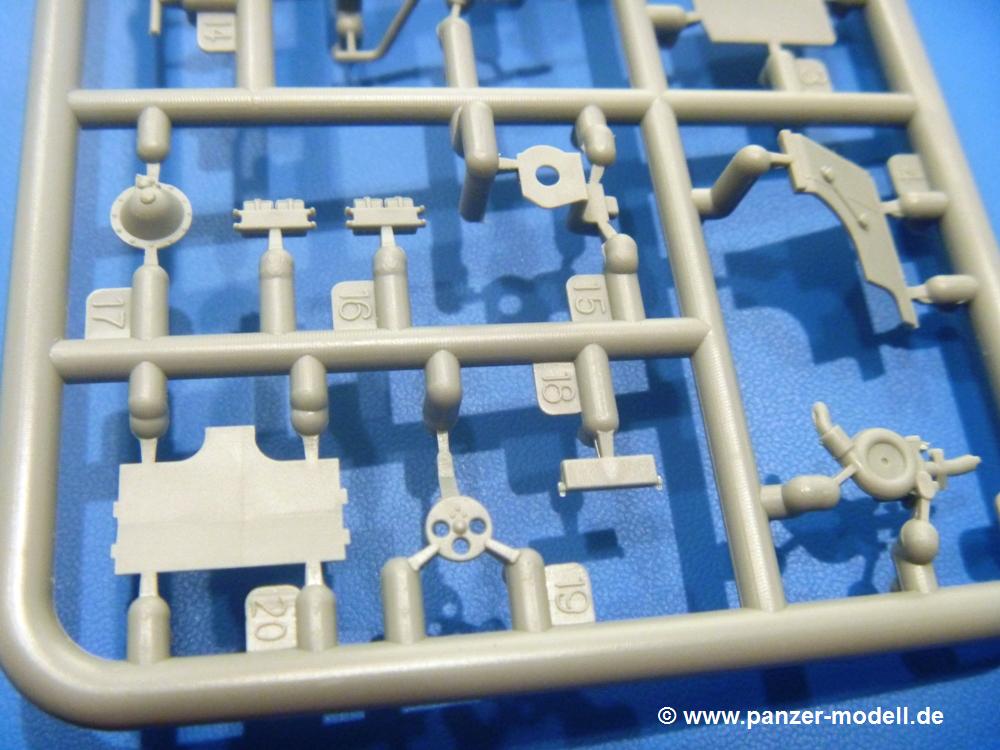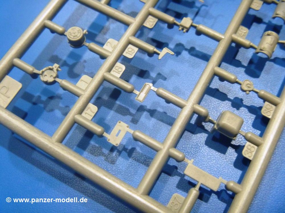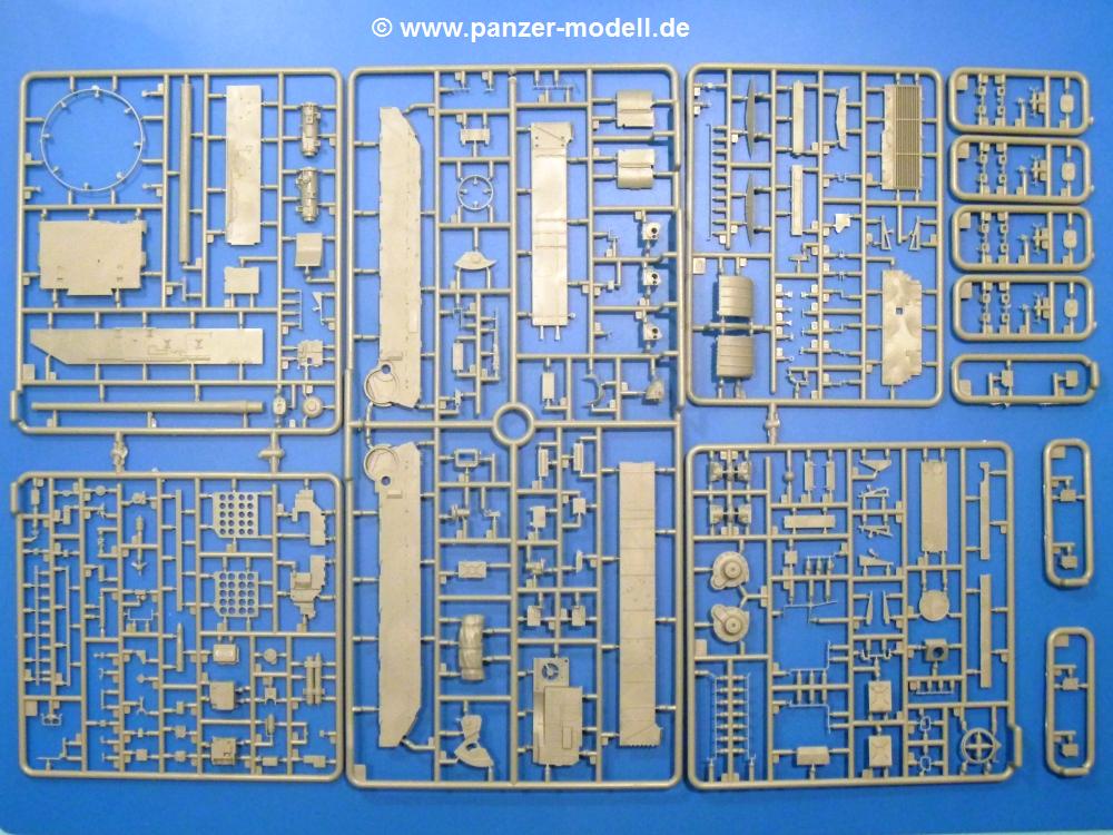 Die Teile aus hellgrauem Plastik sind sauber gespritzt, ohne Verzug und Versatz, hier und da minimaler Grat, keine Fischhäute. Auswerferspuren sind kaum zu sehen und nur auf Innenseiten von Teilen vorhanden, so dass sie beim Zusammenbau verschwinden, ohne das man sie wegschleifen und verspachteln müsste. Viel Vorsicht muss man aufwenden, um manche filigrane Teile wie Gestänge und Leitungen zerstörungsfrei von den Spritzlingen zu lösen.Was wird nun geboten? "Jede Menge!" kann man schon zu Anfang sagen. Separate Drehstäbe, Schwingarmlager, Schwingarme und die Notausstiegluke finden ihren Platz im Wannenboden. Neben der Notausstiegsluke findet man auch Öffnung und Verschlussdeckel zum Grabenbeschuss. Die 5 Bodenbleche des Kampfraumbodens sind sehr schön wiedergegeben. Der Fahrerplatz ist mit Lenk-, Schalthebeln, Pedalen und mehrteiligem Fahrersitz ausgestattet. Rechts vom Fahrer findet man einen großen Staukasten, an den der Munitionsbunker für 20 Schuss separate 100 mm Munition angrenzt. An die Wanneninnenwände werden so einige Instrumente, Munitions-, Schalt- und Staukästen angebaut. Auch weitere 100 mm Munition und eine Feuerlöschanlage gibt es. Dazu kommt ein separater Handfeuerlöscher.Der 12-Zylinder V-Dieselmotor enthält viele Details wie die Einspritzpumpe, Ein- und Auslasskanäle, Lichtmaschine, Anlasser, Luftfilterkasten mit untergebautem Zyklonluftfilter, Anlasskompressor, Kraftstofffilter, Turbo und verschiedene Leitungen. Nur die Einspritzleitungen von der Einspritzpumpe zu den Düsen muss man selbst (z.B. aus feinem Draht) herstellen. Die Motortrennwand ist schon gut detailliert. Zusätzliche Teile sind ein MG-Munitionsbehälter, eine 100 mm Patrone, ein Schaltkasten. Das Gimmick hier ist der Kampfraumlüfter mit dem PE-Gitter.Auch im Turm wurde kein Detail ausgelassen. Rohrbremsen, Verschlussblock und Hülsenabweiser erwartet man auf alle Fälle. Der Verschluss als separates Teil erlaubt das Einlegen von 100 mm Munition, Bediengestänge ist vorhanden. Höhen- und Seitenrichtmaschine sind samt ihrer Elektromotoren sauber wiedergegeben. Die Sitze der Besatzung sind ebenso da wie die Munitionshalterungen samt der separaten Munition und dem Funkgerät. Das koaxiale MG mit Munitions- und Hülsenfangkasten ist reichlich detailliert. Das Zielfernrohr des Richtschützen und die Nachtsichtoptik sind schon kleine Bausätze für sich. Wenn ich mit nicht verzählt habe, kommen bei der Kommandantenluke je nach Variation bis zu 29(!) Teile zusammen - Winkelspiegel, Scheibenwischer, Bediengriffe, Suchscheinwerfer etc.Auch Außen ist so einiges los. Für die Kraftstofftanks auf den Kettenabdeckungen gibt es separate Leitungen. Den Wetterschutz für den Fahrer kann man aufgebaut mit Glaseinsatz, Scheibenwischer und Bedienhebel dafür aufbauen oder zusammengefaltet auf der gerollten Plane am Turmheck platzieren. Die Plane wird von PE-Bändern gehalten. Das Fla-MG setzt sich aus fast 30 Teilen zusammen. Hier gibt es auch ein Stück Munitionsgurt. Die Kanonenblende kann man wahlweise ohne oder mit Blendenplane einbauen. Je nach Wahl unterscheidet sich dann der Anbau des Schießscheinwerfers. Entscheidet man sich für die Nachtkampfvariante des Scheinwerfers, darf man innen auch eine Glühlampe aus Klarsichtmaterial einsetzen. Apropos Nachtkampfvariante - die Bauanleitung gibt dafür Optionen vor. Für den Nachtkampf also offene Such- und Schießscheinwerfer und eingebaute Nachtkampfoptik oder für den Tagkampf mit Deckeln verschlossen.Für das Fahrgestell gilt, wenn man die Schwingarme nicht feststellt, bleibt es beweglich, so dass man es z.B. an Dioramengelände anpassen kann. Die Einzelgliederkette kommt einem da entgegen. Wirft man einen genaueren Blick auf die Glieder, wird man die feinen Gussnummern erkennen. Bei den Laufrollen hat man die Wahl zwischen den älteren Spinnennetzrädern oder den moderneren 5-Speichenrädern. Der Bemalungsplan zeigt den T-54 aber immer nur mit 5-Speichenrädern.Es sind Abziehbilder (Decals) für 4 Versionen dabei.