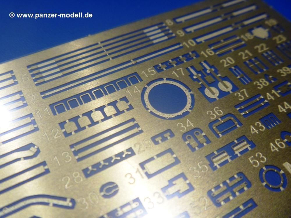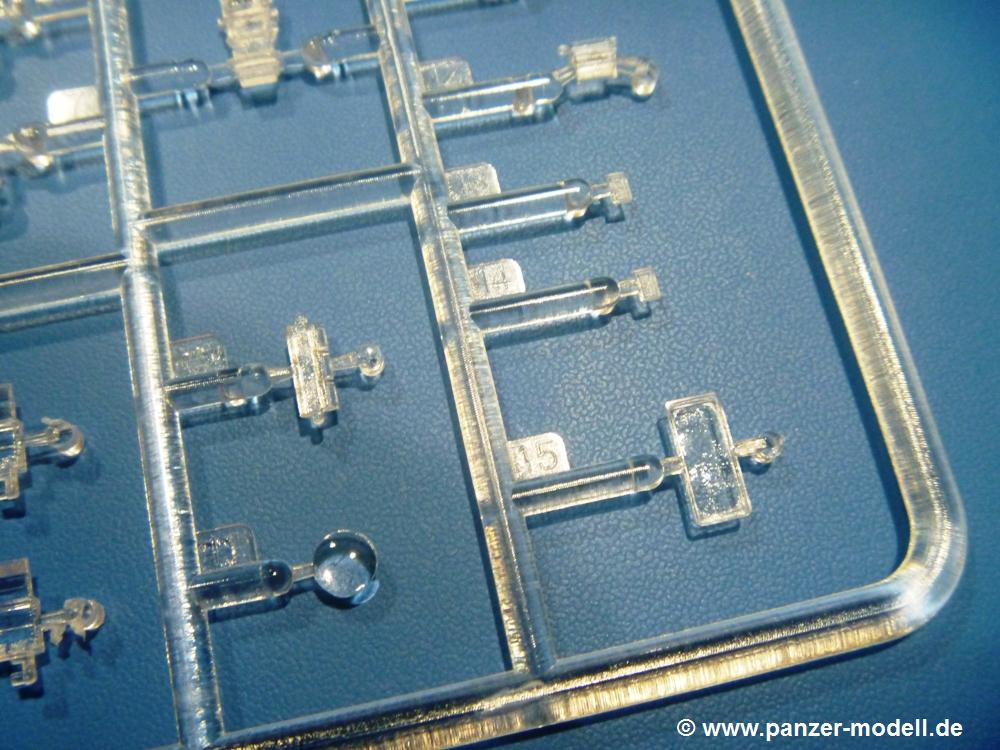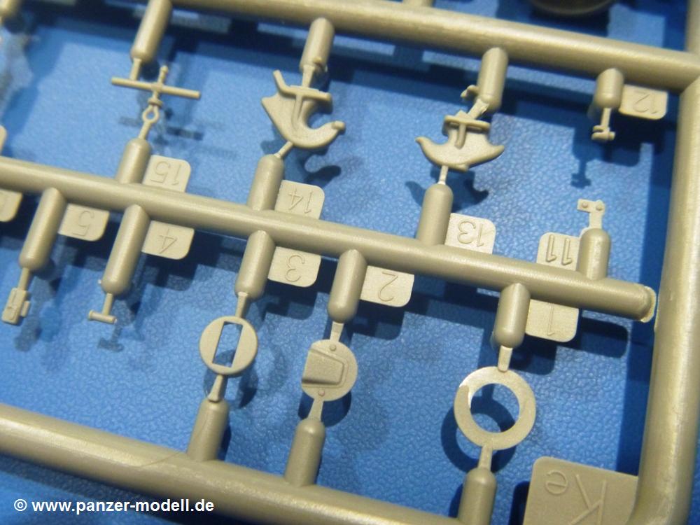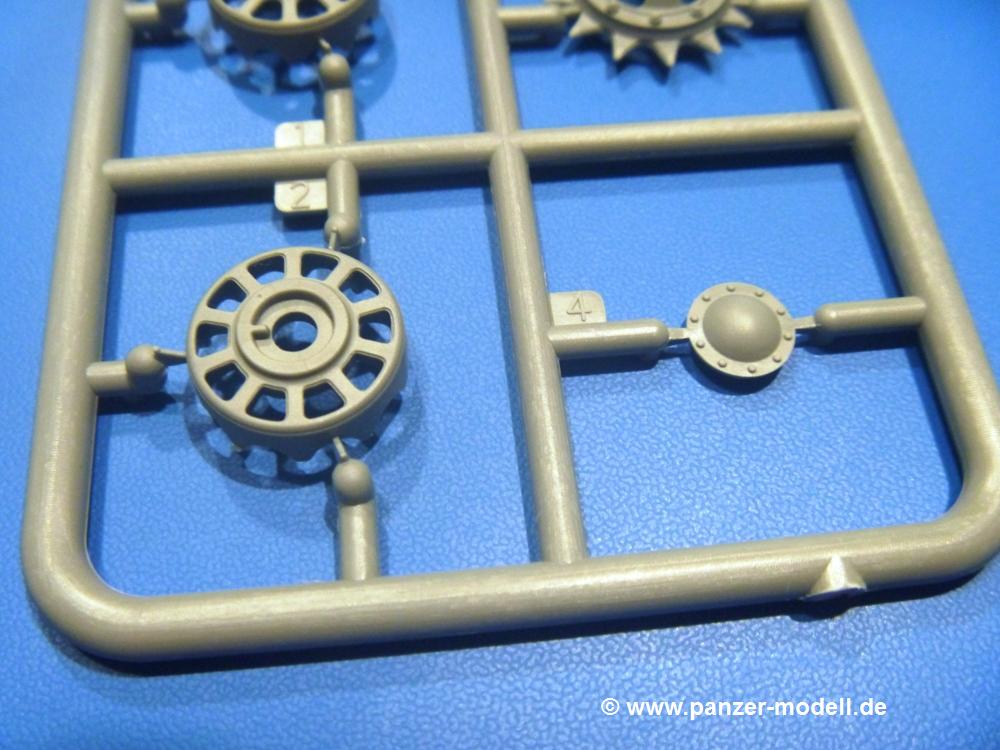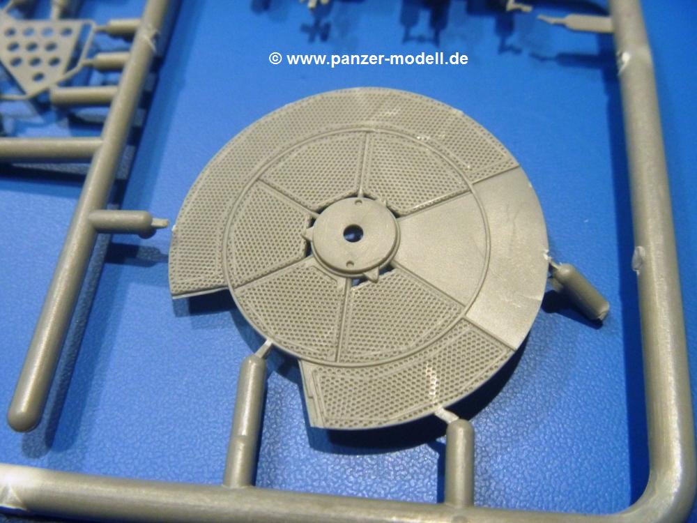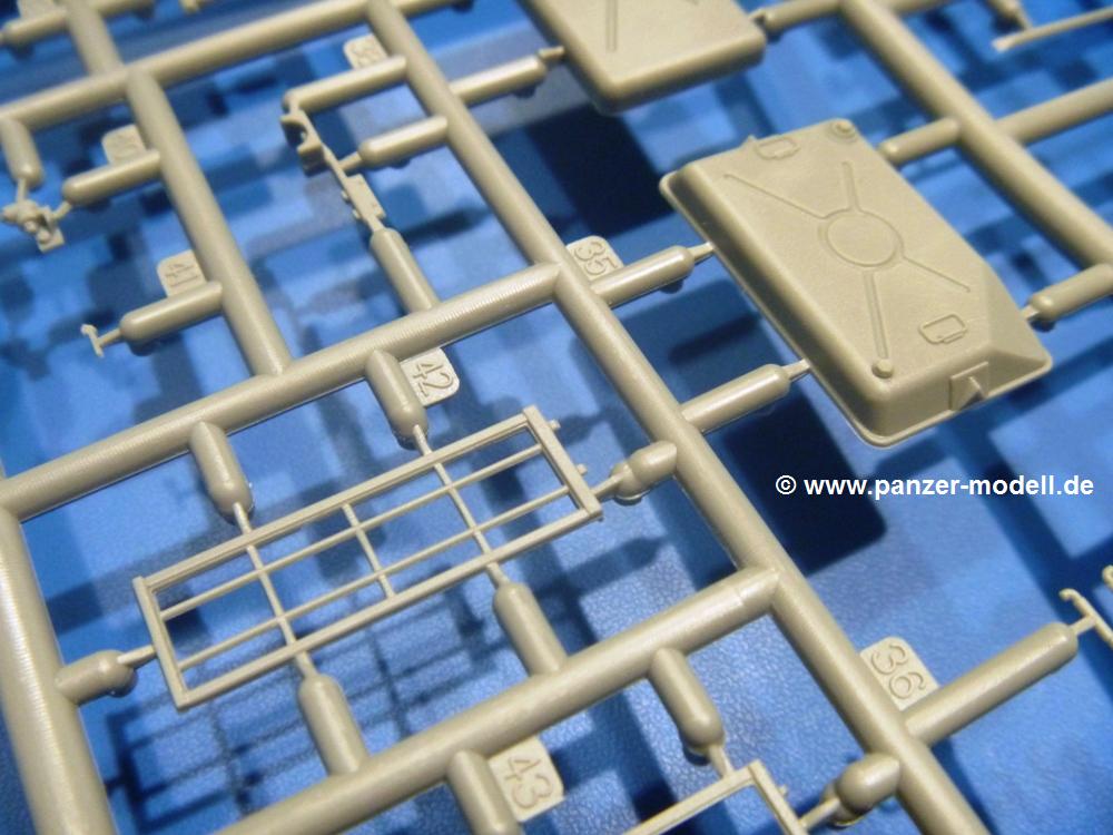 Die Teile aus hellgrauem Plastik sind sauber gespritzt, ohne Verzug und Versatz, hier und da minimaler Grat, keine Fischhäute. Auswerferspuren sind kaum zu sehen und nur auf Innenseiten von Teilen vorhanden, so dass sie beim Zusammenbau verschwinden, ohne das man sie wegschleifen und verspachteln müsste. Viel Vorsicht muss man aufwenden, um manche filigrane Teile wie Gestänge und Leitungen zerstörungsfrei von den Spritzlingen zu lösen.Was wird nun geboten? "Jede Menge!" kann man schon zu Anfang sagen. Separate Drehstäbe, Schwingarmlager, Schwingarme und die Notausstiegluke finden ihren Platz im Wannenboden. Neben der Notausstiegsluke findet man auch Öffnung und Verschlussdeckel zum Grabenbeschuss. Die 5 Bodenbleche des Kampfraumbodens sind sehr schön wiedergegeben. Der Fahrerplatz ist mit Lenk-, Schalthebeln, Pedalen und mehrteiligem Fahrersitz ausgestattet. Rechts vom Fahrer findet man einen großen Staukasten, an den der Munitionsbunker für 20 Schuss separate 100 mm Munition angrenzt. An die Wanneninnenwände werden so einige Instrumente, Munitions-, Schalt- und Staukästen angebaut. Auch weitere 100 mm Munition und eine Feuerlöschanlage gibt es. Dazu kommt ein separater Handfeuerlöscher.Der 12-Zylinder V-Dieselmotor enthält viele Details wie die Einspritzpumpe, Ein- und Auslasskanäle, Lichtmaschine, Anlasser, Luftfilterkasten mit untergebautem Zyklonluftfilter, Anlasskompressor, Kraftstofffilter, Turbo und verschiedene Leitungen. Nur die Einspritzleitungen von der Einspritzpumpe zu den Düsen muss man selbst (z.B. aus feinem Draht) herstellen. Die Motortrennwand ist schon gut detailliert. Zusätzliche Teile sind ein MG-Munitionsbehälter, eine 100 mm Patrone, ein Schaltkasten. Das Gimmick hier ist der Kampfraumlüfter mit dem PE-Gitter.Auch im Turm wurde kein Detail ausgelassen. Rohrbremsen, Verschlussblock und Hülsenabweiser erwartet man auf alle Fälle. Der Verschluss als separates Teil erlaubt das Einlegen von 100 mm Munition, Bediengestänge ist vorhanden. Höhen- und Seitenrichtmaschine sind samt ihrer Elektromotoren sauber wiedergegeben. Die Sitze der Besatzung sind ebenso da wie die Munitionshalterungen samt der separaten Munition und dem Funkgerät. Das koaxiale MG mit Munitions- und Hülsenfangkasten ist reichlich detailliert. Das Zielfernrohr des Richtschützen und die Nachtsichtoptik sind schon kleine Bausätze für sich. Wenn ich mit nicht verzählt habe, kommen bei der Kommandantenluke je nach Variation bis zu 29(!) Teile zusammen - Winkelspiegel, Scheibenwischer, Bediengriffe, Suchscheinwerfer etc.Auch Außen ist so einiges los. Für die Kraftstofftanks auf den Kettenabdeckungen gibt es separate Leitungen. Den Wetterschutz für den Fahrer kann man aufgebaut mit Glaseinsatz, Scheibenwischer und Bedienhebel dafür aufbauen oder zusammengefaltet auf der gerollten Plane am Turmheck platzieren. Die Plane wird von PE-Bändern gehalten. Das Fla-MG setzt sich aus fast 30 Teilen zusammen. Hier gibt es auch ein Stück Munitionsgurt. Die Kanonenblende kann man wahlweise ohne oder mit Blendenplane einbauen. Je nach Wahl unterscheidet sich dann der Anbau des Schießscheinwerfers. Entscheidet man sich für die Nachtkampfvariante des Scheinwerfers, darf man innen auch eine Glühlampe aus Klarsichtmaterial einsetzen. Apropos Nachtkampfvariante - die Bauanleitung gibt dafür Optionen vor. Für den Nachtkampf also offene Such- und Schießscheinwerfer und eingebaute Nachtkampfoptik oder für den Tagkampf mit Deckeln verschlossen.Für das Fahrgestell gilt, wenn man die Schwingarme nicht feststellt, bleibt es beweglich, so dass man es z.B. an Dioramengelände anpassen kann. Die Einzelgliederkette kommt einem da entgegen. Wirft man einen genaueren Blick auf die Glieder, wird man die feinen Gussnummern erkennen. Bei den Laufrollen hat man die Wahl zwischen den älteren Spinnennetzrädern oder den moderneren 5-Speichenrädern. Der Bemalungsplan zeigt den T-54 aber immer nur mit 5-Speichenrädern.Es sind Abziehbilder (Decals) für 4 Versionen dabei.