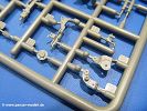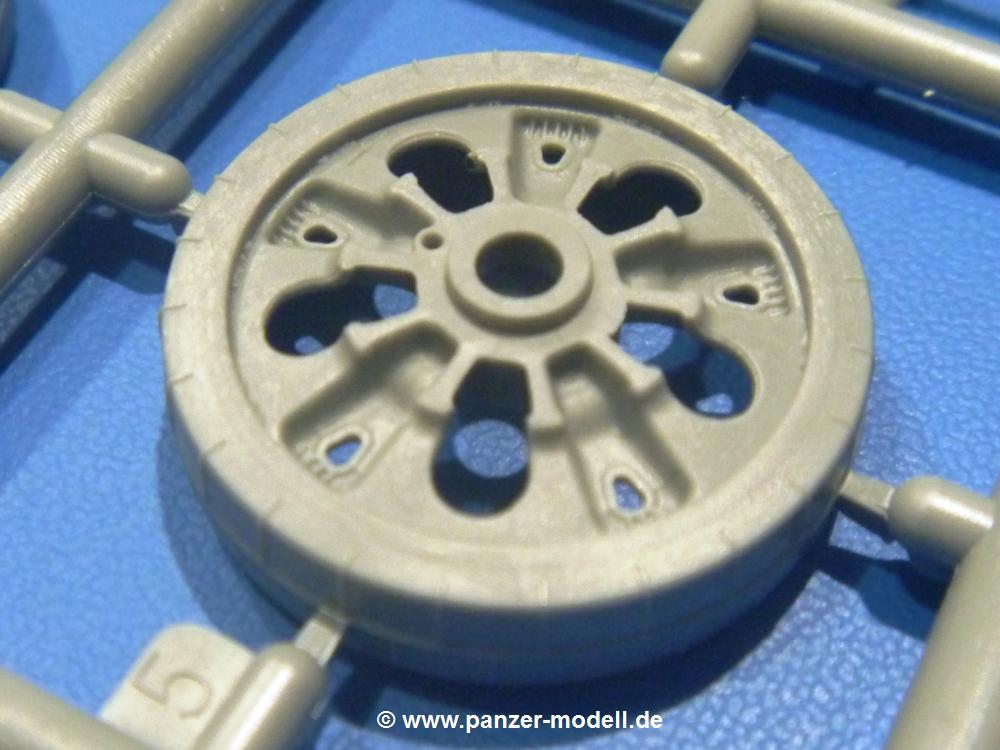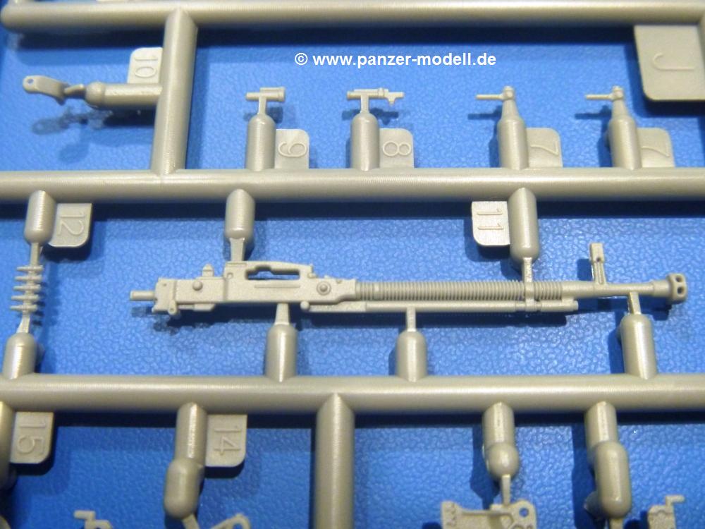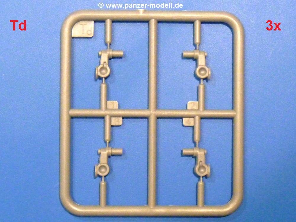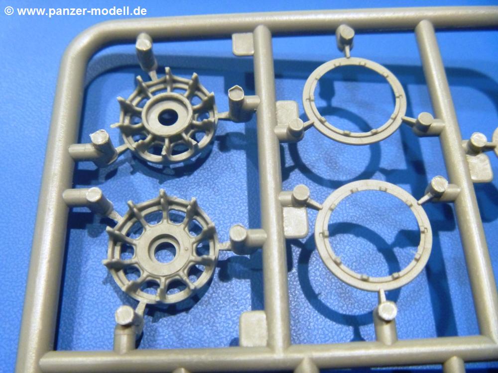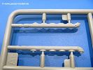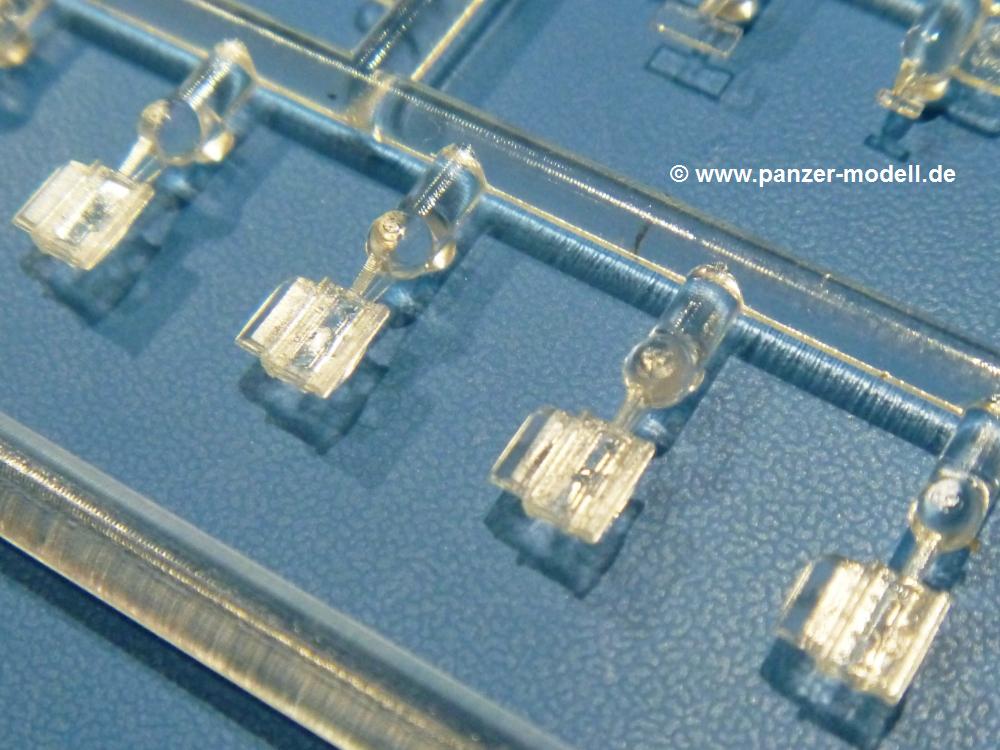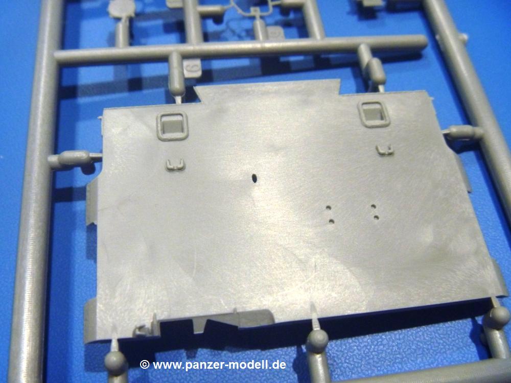 Die Teile aus hellgrauem Plastik sind sauber gespritzt, ohne Verzug und Versatz, hier und da minimaler Grat, keine Fischhäute. Auswerferspuren sind kaum zu sehen und nur auf Innenseiten von Teilen vorhanden, so dass sie beim Zusammenbau verschwinden, ohne das man sie wegschleifen und verspachteln müsste. Viel Vorsicht muss man aufwenden, um manche filigrane Teile wie Gestänge und Leitungen zerstörungsfrei von den Spritzlingen zu lösen.Was wird nun geboten? "Jede Menge!" kann man schon zu Anfang sagen. Separate Drehstäbe, Schwingarmlager, Schwingarme und die Notausstiegluke finden ihren Platz im Wannenboden. Neben der Notausstiegsluke findet man auch Öffnung und Verschlussdeckel zum Grabenbeschuss. Die 5 Bodenbleche des Kampfraumbodens sind sehr schön wiedergegeben. Der Fahrerplatz ist mit Lenk-, Schalthebeln, Pedalen und mehrteiligem Fahrersitz ausgestattet. Rechts vom Fahrer findet man einen großen Staukasten, an den der Munitionsbunker für 20 Schuss separate 100 mm Munition angrenzt. An die Wanneninnenwände werden so einige Instrumente, Munitions-, Schalt- und Staukästen angebaut. Auch weitere 100 mm Munition und eine Feuerlöschanlage gibt es. Dazu kommt ein separater Handfeuerlöscher.Der 12-Zylinder V-Dieselmotor enthält viele Details wie die Einspritzpumpe, Ein- und Auslasskanäle, Lichtmaschine, Anlasser, Luftfilterkasten mit untergebautem Zyklonluftfilter, Anlasskompressor, Kraftstofffilter, Turbo und verschiedene Leitungen. Nur die Einspritzleitungen von der Einspritzpumpe zu den Düsen muss man selbst (z.B. aus feinem Draht) herstellen. Die Motortrennwand ist schon gut detailliert. Zusätzliche Teile sind ein MG-Munitionsbehälter, eine 100 mm Patrone, ein Schaltkasten. Das Gimmick hier ist der Kampfraumlüfter mit dem PE-Gitter.Auch im Turm wurde kein Detail ausgelassen. Rohrbremsen, Verschlussblock und Hülsenabweiser erwartet man auf alle Fälle. Der Verschluss als separates Teil erlaubt das Einlegen von 100 mm Munition, Bediengestänge ist vorhanden. Höhen- und Seitenrichtmaschine sind samt ihrer Elektromotoren sauber wiedergegeben. Die Sitze der Besatzung sind ebenso da wie die Munitionshalterungen samt der separaten Munition und dem Funkgerät. Das koaxiale MG mit Munitions- und Hülsenfangkasten ist reichlich detailliert. Das Zielfernrohr des Richtschützen und die Nachtsichtoptik sind schon kleine Bausätze für sich. Wenn ich mit nicht verzählt habe, kommen bei der Kommandantenluke je nach Variation bis zu 29(!) Teile zusammen - Winkelspiegel, Scheibenwischer, Bediengriffe, Suchscheinwerfer etc.Auch Außen ist so einiges los. Für die Kraftstofftanks auf den Kettenabdeckungen gibt es separate Leitungen. Den Wetterschutz für den Fahrer kann man aufgebaut mit Glaseinsatz, Scheibenwischer und Bedienhebel dafür aufbauen oder zusammengefaltet auf der gerollten Plane am Turmheck platzieren. Die Plane wird von PE-Bändern gehalten. Das Fla-MG setzt sich aus fast 30 Teilen zusammen. Hier gibt es auch ein Stück Munitionsgurt. Die Kanonenblende kann man wahlweise ohne oder mit Blendenplane einbauen. Je nach Wahl unterscheidet sich dann der Anbau des Schießscheinwerfers. Entscheidet man sich für die Nachtkampfvariante des Scheinwerfers, darf man innen auch eine Glühlampe aus Klarsichtmaterial einsetzen. Apropos Nachtkampfvariante - die Bauanleitung gibt dafür Optionen vor. Für den Nachtkampf also offene Such- und Schießscheinwerfer und eingebaute Nachtkampfoptik oder für den Tagkampf mit Deckeln verschlossen.Für das Fahrgestell gilt, wenn man die Schwingarme nicht feststellt, bleibt es beweglich, so dass man es z.B. an Dioramengelände anpassen kann. Die Einzelgliederkette kommt einem da entgegen. Wirft man einen genaueren Blick auf die Glieder, wird man die feinen Gussnummern erkennen. Bei den Laufrollen hat man die Wahl zwischen den älteren Spinnennetzrädern oder den moderneren 5-Speichenrädern. Der Bemalungsplan zeigt den T-54 aber immer nur mit 5-Speichenrädern.Es sind Abziehbilder (Decals) für 4 Versionen dabei.