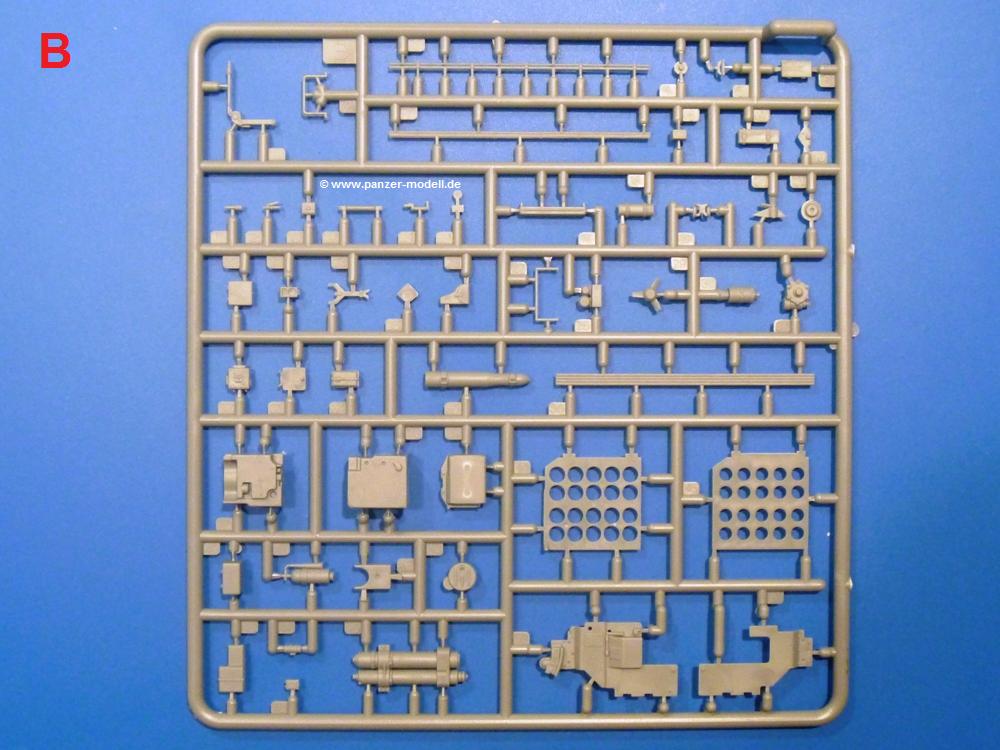 Der Bausatz: Zwar gab es bereits recht alte Bausätze des T-54 von anderen Herstellern, aber erst MiniArt hat sich etwas intensiver mit diesem Typ beschäftigt. So ist der T-54B, den wir uns heute anschauen werden, neben den bereits erschienenen T-54-1, -2, -3, nur einer aus der großen Reihe. Panzer-Modell.de hat sich den Panzer ohne Inneneinrichtung (MiniArt Nr. 37019) bereits angeschaut, so dass der Schwerpunkt dieses AUSGEPACKT auf der Inneneinrichtung liegt.Der Karton ist 385 x 240 x 100 mm groß und randvoll gefüllt mit 89(!) hellgrauen, 2 Klarsichtspritzlingen, 2 PE-Platinen und einem Decalsheet. Insgesamt werden 1.187 Teile zu verbauen sein.Schauen wir in der Übersicht, was uns das Modell bietet: