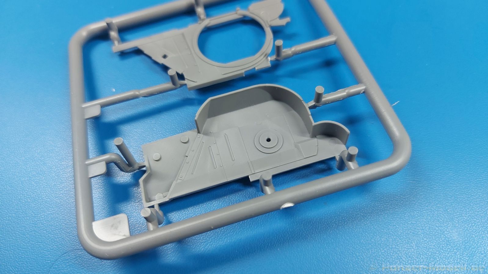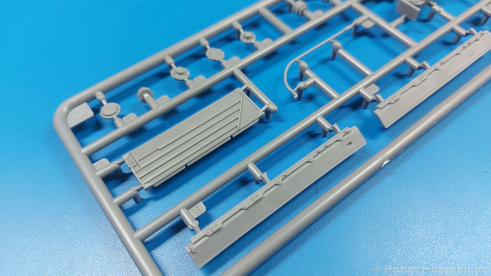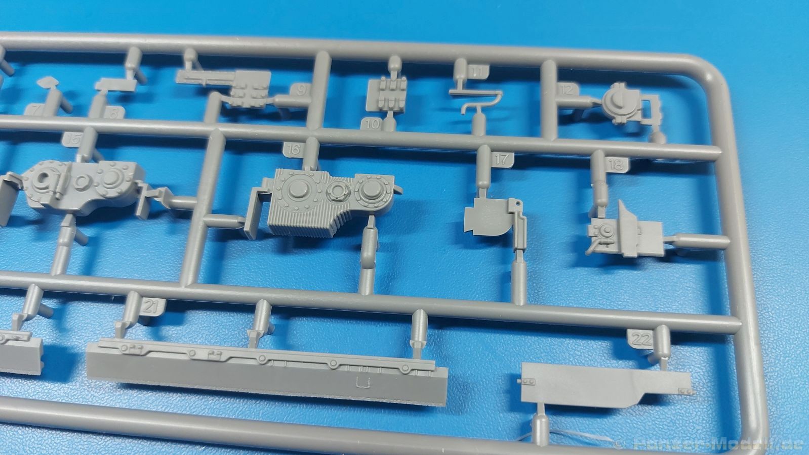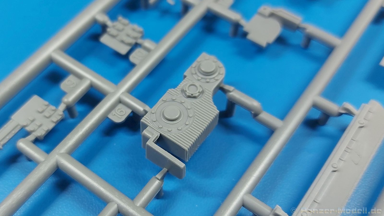 Bereits 2017 begann MiniArt mit seiner exzellenten Reihe von T-54/T-55 Bausätzen, viele davon auch mit „fast“ vollständiger Inneneinrichtung. Aus unerfindlichem Grund ließ man aber damals im Motorraum die hintere Baugruppe mit Getriebe und Kühleinheit weg. Diese Lücke schließt man mit diesem T-54 early transmission set für die folgenden MiniArt Interior Bausätze: · 37003 T-54-1 Soviet Medium Tank · 37004 T-54-2 Mod. 1949 Soviet Medium Tank · 37007 T-54-3 Soviet Medium Tank Mod 1951 · 37028 SLA APC T-54 w/Dozer Blade (und für andere Bausätze mit T-54 Late Transmission Set, Transmission set for T-55/T-55A) geschlossen werden. Im 290 x 190 x 45 mm großen Karton finden wir 7 hellgraue Spritzlinge und eine Bauanleitung. Die Qualität ist, wie von MiniArt gewöhnt, hoch und drückt sich in sauber gespritzten Teilen aus, ohne Verzug oder Versatz aus. Ein wenig Grat findet sich an den Lamellen des Lüftergrätings, den aber man aber leicht mit Standardbastelwerkzeug entfernen kann. Großartige Details sind vorzufinden, die in einem Diorama eines zerstörten Fahrzeuges oder bei der Wartung/Reparatur gut zur Geltung kommen können. Da wären die Verschraubungen des Getriebegehäuses, vieler Wartungsdeckel und der Flansche zu nennen, die Vernietungen der Lenkbremsbeläge, die sauberen Zähne sichtbarer Zahnräder, die feinen Lamellen des Kühlers, Leitungen, Gestänge und natürlich das tolle Lüfterrad. Die Spritzlinge Ay, Bv, Dt, Dv und Dz sind baugleich mit den aus dem Set 37066. Spritzling Cv enthält die Teile für die frühe Version. Ich bin mit den technischen Details des Originals nicht so vertraut. Meiner Ansicht nach haben wir Baugruppen für das Getriebe mit angeflanschten Lenkbremsen, den Kühler, die Kühlmittelpumpe, den Lüfter mit Lüfterrad und Kühlmittelbehälter. Wir freuen uns natürlich darüber, wenn T-54 Experten uns bestätigen oder korrigieren könnten. Die Bauanleitung hat 24 Seiten. Allerdings weisen die letzten 2 Seiten nur auf weitere MiniArt Bausätze hin und haben mit dem Bau nichts zu tun. Das Deckblatt zeigt ein farbiges Bild der zusammengesetzten Baugruppen, sowie eine Auflistung der Bausätze, für die der Bausatz vorgesehen ist. Eine Bemalungsanleitung und eine Farbtabelle mit Farbnummern für Vallejo-, Mr. Color-, AK RC-, Mission Models-, AMMO Mig- und Tamiya-Farben finden wir auf der zweiten, Arbeitshinweise, Spritzlingübersicht und Symbolerklärungen auf der dritten Seite. Vor der eigentlichen Bauanleitung erwartet uns eine Sequenz mit 5 Schritten, wie die Teile in den Motorraum einzubauen sind. Die eigentliche Bauanleitung für die Baugruppen hat nur 16 Schritte. Der weiteren Bauschritte beziehen sich auf die einzelnen Modelle, für die das Set vorgesehen ist. Hier wird auch angegeben, welche Teile aus dem Original-Bausatz auszutauschen sind und auf welchen Bauschritt in der Originalanleitung man sich bezieht. Für die Bausätze 37003 und 37004 allein gibt es jeweils 5 Seiten, für die verbliebenen 5 Bausätze gibt es zusammengefasst auch 5 Seiten. Es werden Alternativen für offenes und geschlossenes Kühlergräting angeboten, aber ich sehe die offene Variante als alternativlos an. Auch alleinstehend ein Hingucker! Ein Anfänger könnte wohl damit zurechtkommen, aber in Verbindung mit den Interior-Bausätzen sollte man ein gewisses Maß an Erfahrung mitbringen. Zum Aufwerten der vorgenannten MiniArt Bausätze auf jeden Fall empfehlenswert. Der Preis in Deutschland liegt augenblicklich um die 16-18 Euro.