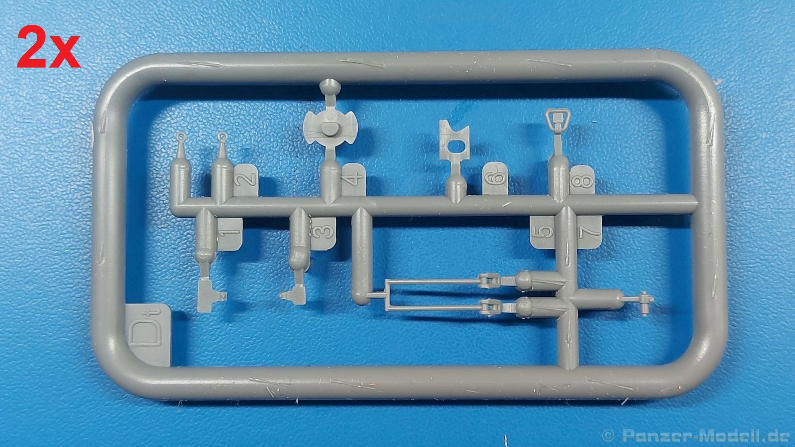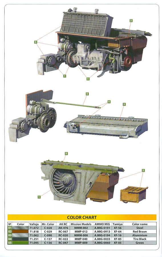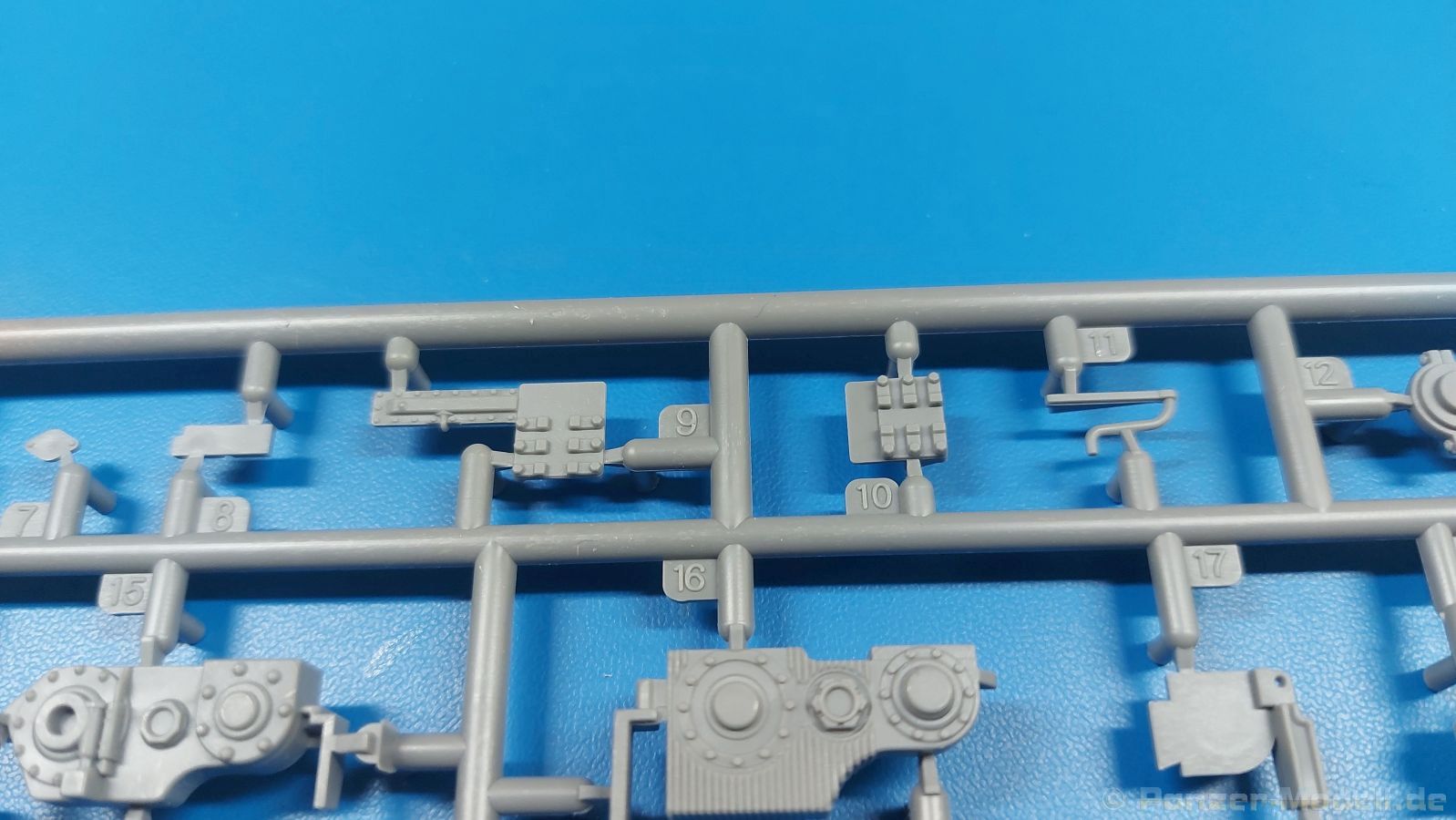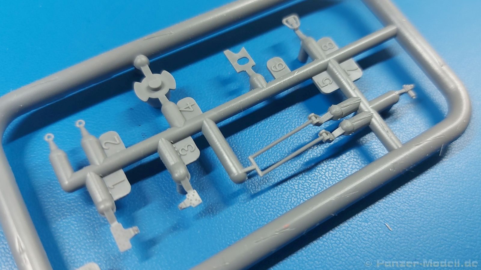 Bereits 2017 begann MiniArt mit seiner exzellenten Reihe von T-54/T-55 Bausätzen, viele davon auch mit „fast“ vollständiger Inneneinrichtung. Aus unerfindlichem Grund ließ man aber damals im Motorraum die hintere Baugruppe mit Getriebe und Kühleinheit weg. Diese Lücke schließt man mit diesem T-54 early transmission set für die folgenden MiniArt Interior Bausätze: · 37003 T-54-1 Soviet Medium Tank · 37004 T-54-2 Mod. 1949 Soviet Medium Tank · 37007 T-54-3 Soviet Medium Tank Mod 1951 · 37028 SLA APC T-54 w/Dozer Blade (und für andere Bausätze mit T-54 Late Transmission Set, Transmission set for T-55/T-55A) geschlossen werden. Im 290 x 190 x 45 mm großen Karton finden wir 7 hellgraue Spritzlinge und eine Bauanleitung. Die Qualität ist, wie von MiniArt gewöhnt, hoch und drückt sich in sauber gespritzten Teilen aus, ohne Verzug oder Versatz aus. Ein wenig Grat findet sich an den Lamellen des Lüftergrätings, den aber man aber leicht mit Standardbastelwerkzeug entfernen kann. Großartige Details sind vorzufinden, die in einem Diorama eines zerstörten Fahrzeuges oder bei der Wartung/Reparatur gut zur Geltung kommen können. Da wären die Verschraubungen des Getriebegehäuses, vieler Wartungsdeckel und der Flansche zu nennen, die Vernietungen der Lenkbremsbeläge, die sauberen Zähne sichtbarer Zahnräder, die feinen Lamellen des Kühlers, Leitungen, Gestänge und natürlich das tolle Lüfterrad. Die Spritzlinge Ay, Bv, Dt, Dv und Dz sind baugleich mit den aus dem Set 37066. Spritzling Cv enthält die Teile für die frühe Version. Ich bin mit den technischen Details des Originals nicht so vertraut. Meiner Ansicht nach haben wir Baugruppen für das Getriebe mit angeflanschten Lenkbremsen, den Kühler, die Kühlmittelpumpe, den Lüfter mit Lüfterrad und Kühlmittelbehälter. Wir freuen uns natürlich darüber, wenn T-54 Experten uns bestätigen oder korrigieren könnten. Die Bauanleitung hat 24 Seiten. Allerdings weisen die letzten 2 Seiten nur auf weitere MiniArt Bausätze hin und haben mit dem Bau nichts zu tun. Das Deckblatt zeigt ein farbiges Bild der zusammengesetzten Baugruppen, sowie eine Auflistung der Bausätze, für die der Bausatz vorgesehen ist. Eine Bemalungsanleitung und eine Farbtabelle mit Farbnummern für Vallejo-, Mr. Color-, AK RC-, Mission Models-, AMMO Mig- und Tamiya-Farben finden wir auf der zweiten, Arbeitshinweise, Spritzlingübersicht und Symbolerklärungen auf der dritten Seite. Vor der eigentlichen Bauanleitung erwartet uns eine Sequenz mit 5 Schritten, wie die Teile in den Motorraum einzubauen sind. Die eigentliche Bauanleitung für die Baugruppen hat nur 16 Schritte. Der weiteren Bauschritte beziehen sich auf die einzelnen Modelle, für die das Set vorgesehen ist. Hier wird auch angegeben, welche Teile aus dem Original-Bausatz auszutauschen sind und auf welchen Bauschritt in der Originalanleitung man sich bezieht. Für die Bausätze 37003 und 37004 allein gibt es jeweils 5 Seiten, für die verbliebenen 5 Bausätze gibt es zusammengefasst auch 5 Seiten. Es werden Alternativen für offenes und geschlossenes Kühlergräting angeboten, aber ich sehe die offene Variante als alternativlos an. Auch alleinstehend ein Hingucker! Ein Anfänger könnte wohl damit zurechtkommen, aber in Verbindung mit den Interior-Bausätzen sollte man ein gewisses Maß an Erfahrung mitbringen. Zum Aufwerten der vorgenannten MiniArt Bausätze auf jeden Fall empfehlenswert. Der Preis in Deutschland liegt augenblicklich um die 16-18 Euro.