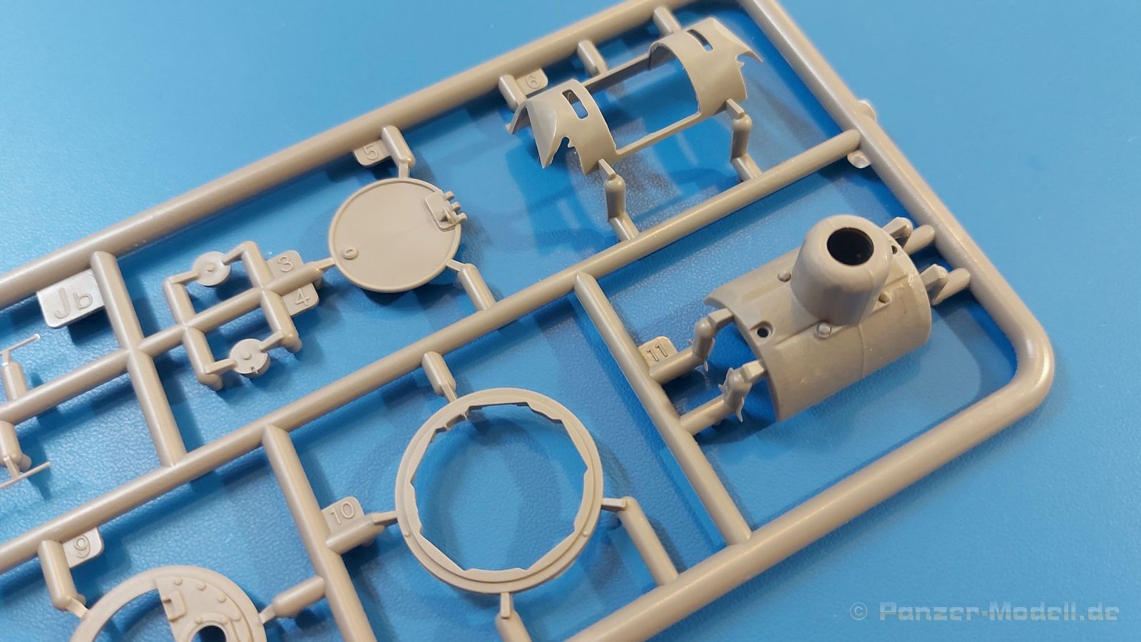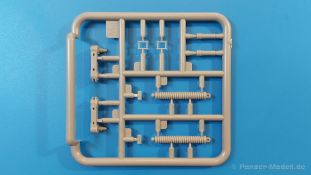 Das Original: Es gibt wohl kaum einen Militärmodellbauer, der den sowjetischen T-34 nicht kennt. Als einer der meistgebauten und am längsten im Einsatz befindlichen Panzer kann man ihn nicht übersehen. Seine Produktion zog sich von 1940 bis 1955 mit über 60.000 gebauten Exemplaren, die große Masse davon in den Jahren 1940-45. Seine schräge Panzerung war ein Novum der Zeit und bereitete den deutschen Gegnern einiges Kopfzerbrechen. Anfangs war er mit 2 MG und einer 76mm Kanone ausgerüstet, ab 1944 bekam er einen größeren Turm mit 85mm Kanone und ebenfalls 2 MG. Sein 500 PS Motor konnte ihn auf über 50 km/h beschleunigen. Der Bausatz: Unter der MiniArt Nummer 37069 gibt es bereits die tschechoslowakische Version mit voller Inneneinrichtung. Heute liegt vor uns der abgespeckte Bausatz ohne Inneneinrichtung. Der 385 x 240 x 75 mm große Karton enthält immer noch 62(!) hellgraue, 2 Klarsichtspritzlinge, 1 PE-Platine und ein Decalsheet (+Zusatzblatt). Wie bereits bei früheren T-34 Bausätzen von MiniArt sind sauber gespritzte und filigrane Teile sind die Norm. Verzug oder Versatz konnte ich nicht entdecken. Bemerkenswerten Grat konnte ich jetzt nur an den Laufrollen entdecken. Ich denke mal, dass die Formen ein paar Durchgänge mehr hinter sich haben, da ja auch andere Bausätze die gleichen Räder nutzen. Die Auswerfer sind ausnahmslos auf die Spritzrahmen gesetzt, so dass die Teile keine Spuren davon aufweisen. Auch wenn es keine Inneneinrichtung gibt, sind Innendetails an Wannenboden und Wänden zu finden, da es die gleichen Teile wie aus dem Interior-Bausatz sind. Die Wanne ist unterteilt in Boden, Bug-, Heck-, Seiten- und Trennwände. Die Bugplatte wird mit Seilhaken und funktionierenden Riegeln versehen. Ein interessantes Detail: je nach Version wird eine Kabelführung und ein Notek-Scheinwerfer montiert, wie man ihn von Wehrmachtsfahrzeugen kennt. Die Fahrerluke hat Details auf beiden Seiten inklusive Winkelspiegeln aus Klarsichtmaterial. Der Dom des Bug-MGs zeigt eine schöne Gussstruktur. Das MG mit Kugelblende kann beweglich eingebaut werden. Die Heckplatte mit den markanten Schraubenköpfen wird mit den, an den Enden ausgehöhlten, Auspuffrohren versehen und die runde Wartungsklappe angebracht. Nur für die Version 3 montiert man die kleinen, hinten querliegenden Kraftstoffbehälter. Auch die hinteren Seilhaken bekommen funktionierende Riegel aus PE und Plastik. Alle Versionen des Modelles erhalten die typischen Kraftstoffbehälter an den Seiten, zwei rechts, einer links mit feindetaillierten Halterungen, die mit PE Bändern verfeinert werden. Die Griffe an den Enden der Tanks sind ebenfalls aus PE-Material. Die typischen Eisgreifer sind natürlich dabei. Insgesamt 18 werden in 3 Paketen mittels PE-Ösen und -bändern auf der echten Kettenabdeckung angebracht. Für die beiden Abschleppseile gibt es nur die Seilkauschen. Die Seile stellt man selbst her. Der hintere Staukasten auf der rechten Kettenabdeckung kann ebenso wie der baugleiche vorn auf der linken Kettenabdeckung auch offen gebaut werden. Die linke Seite zeigt einige Merkmale der Nachkriegs-T34. Die sonst trompetenförmige Hupe wird durch ein kleineres Exemplar ersetzt, das an einer PW-Halterung montiert wird. Der einzige Fahrscheinwerfer ist innen hohl und wird mit einem geriffelten Klarsichtglas und einem Schutzgitter aus PE versehen. Für das Gitter gibt es eine Biegehilfe am Spritzling Da. Die große Säge kennt man bereits, die beiden Stahlseile ohne Kauschen in Halterungen sind mir ebenso neu am T34 wie auch das einsame Rücklicht in einer konischen Panzerung. Das Motordeck ist wie bei den Interior-Modellen mit allen separaten Lüfterklappen und Gittern versehen. Das große, hintere Gitter wird aus einem PE-Rahmen und -gitter ausgebaut. Das Fahrgestell beginnt bereits im Inneren mit den Federkästen, in die die schönen Druckfedern eingebaut werden. Alle Schwingarme sind separat ausgeführt. Die Räder mit Spinnwebspeichen und runden Durchbrüchen sehen sehr gut aus. Es liegt auch ein Laufrollenpaar mit Scheibenfelgen dabei, welches anstelle der linken, mittleren Laufrolle beim Bau der Version 6 benötigt wird. Leit- und Antriebsräder sind ebenfalls mit Durchbrüchen und Spinnwebspeichen versehen. Die Kettenglieder werden immer je ein Glied mit und eins ohne Führungszahn ineinander geklipst und sollten theoretisch auch beweglich bleiben, wenn die feinen Stifte das aushalten. Ein genauer Blick auf die Glieder zeigt uns nicht nur das Waffelmuster außen, sondern auch feine Gussnummern auf jedem Glied. Kommen wir zum Turm. Im Turm finden sich nur noch die Innenwände, das Rohrlager, der Verschluss und das koaxiale MG. Aus kristallklarem Material sind die Winkelspiegel im Dach und der Kommandantenluke und die Sichtblöcke der Kommandantenkuppel. Sowohl Kommandantenluke als auch Ladeschützenluke können offen oder geschlossen gebaut werden. Das Kanonenrohr ist aus einem Stück gegossen und an der Mündung ca. 3mm tief "aufgebohrt". Die Struktur des Turmes selbst und der Blende kommen glaubhaft rüber. Außen am Turm gibt es die üblichen Handgriffe. Haken zum Turmanheben, Nahverteidigungsstopfen, eine Antenne sowie die Panzerung der Dachlüfter sind weitere Details. Diesem Modell legt MiniArt Abziehbilder (Decals) für 7 Fahrzeuge und ein kleines Zusatzblatt mit tschechischen Kokarden bei. Die Decals sind seidenmatt mit wenig Rand.