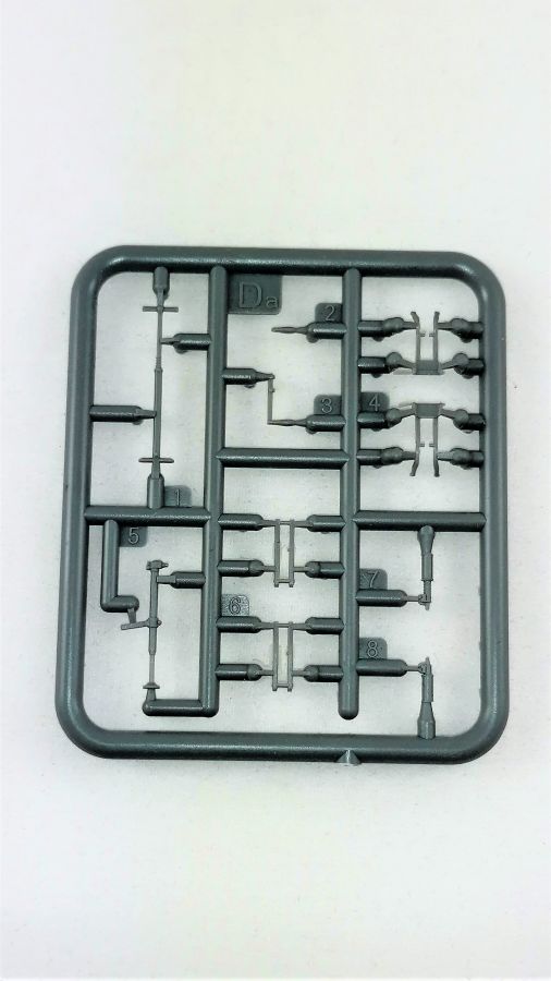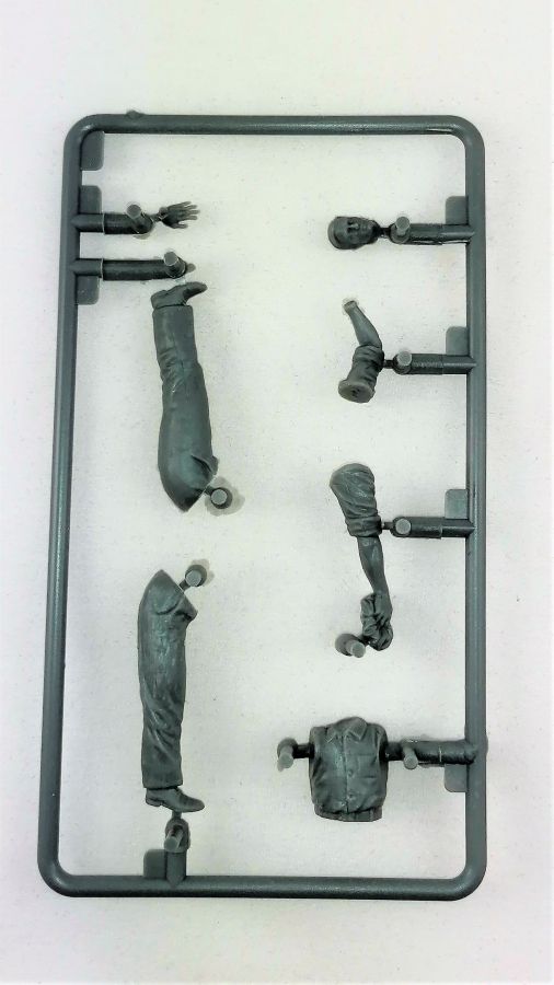 Die für MiniArt typische, etwas labile Schüttbox beherbergt fünf in grauem Polystrol gespritzte Rahmen. Vier davon entfallen auf die Figuren, ein weiterer enthält diverse Teile für Wagenheber, Luftpumpe etc.