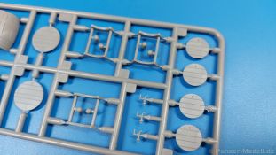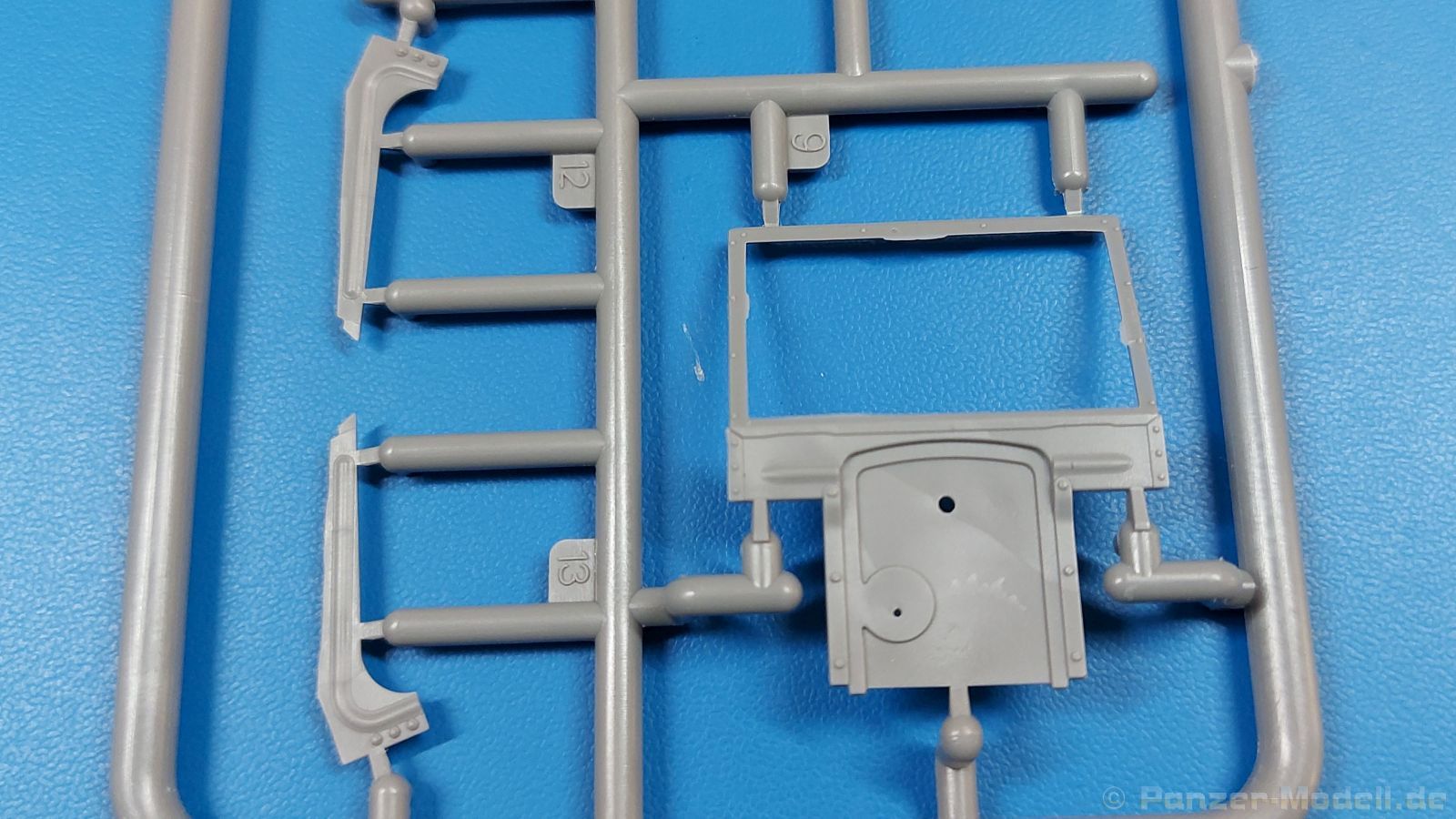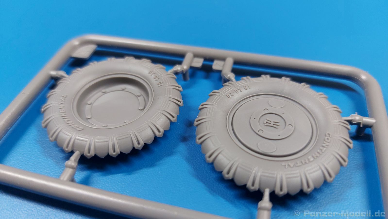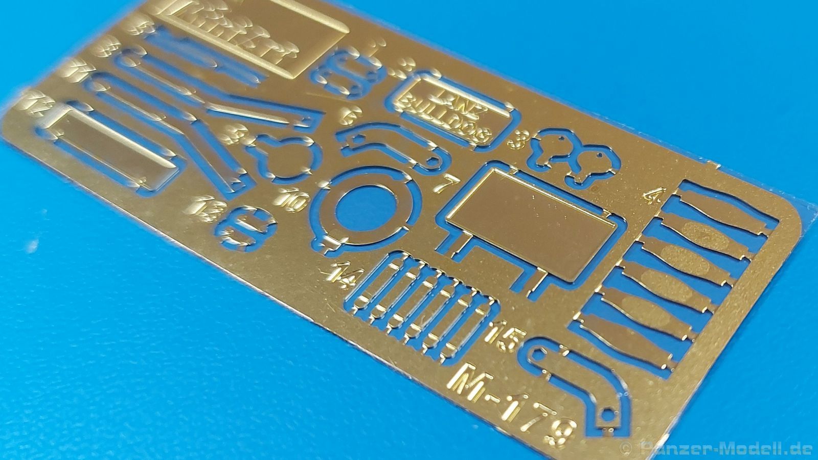 Das Original: Der Bulldog war eigentlich ein für den Einzylinder Glühkopfmotor, mit dem Säge-, Mühlen-, Steinbrecher- und Dreschmaschinen angetrieben wurden, bis man entdeckte, dass sich der Motor auch für Ackerschlepper eignet. Der Schlepper der Firma Lanz mit der Bezeichnung D8506, auch Ackerluft-Bulldog genannt, wurde zwischen 1934 und 1955 hergestellt und wog über 3 Tonnen. Sein 10 Liter Motor mit 30 bzw. 35 PS (22kW/25,6 kW) konnte ihn bis 17,7 km/h beschleunigen. Unter anderem kann er mit Gasöl, Schweröl, Diesel, Petroleum und Pflanzenöl betrieben werden (Vielstoffmotor). In der Landwirtschaft eingesetzt wurde er zum Ziehen von Lasten und bedienen landwirtschaftlicher Geräte eingesetzt, aber auch die Wehrmacht hat ihn genutzt. Der Bausatz: Von der ukrainischen Firma MiniArt gibt es inzwischen etliche Modelle des Lanz Bulldog in 1:35, teils solo, teils mit Anhänger, die sich z.B. in der Bereifung, der Auslegung der Luftansaugung oder der Auspuffanlage unterscheiden. Der 385 x 240 x 60 mm große Stülpdeckelkarton enthält in eine Klarsichttüte verpackt für… · den Traktor: 9 hellgraue, 1 Klarsichtspritzling, 2 Plastikreifen, 1 PE-Platine MiniArt bietet gute Qualität! Man erblickt sauber gespritzte und filigrane Teile. Verzug oder Versatz konnte ich nicht entdecken. Es gibt etwas feinen Grat, wie z.B. auf den Laufflächen der großen Traktorhinterreifen, aber der verschwindet, sobald er das Bastelmesser sieht. Die Auswerfer sind fast ausnahmslos auf die Spritzrahmen gesetzt, so dass die Teile so gut wie keine Spuren davon aufweisen, bzw. nur an Stellen, die nach dem Zusammenbau nicht mehr zu sehen sind. Da der Bulldog in rahmenloser Blockbauweise hergestellt wurde, gibt es große Teile für den Block, der Motor, Getriebe und Hinterachse aufnimmt. So einige Wartungsdeckel mit ihrer prominenten Verschraubung sind bereits angegossen. Es gibt auch einige Kleinteile, die aufgebohrt werden müssen, wenn man die außenliegenden (Kraftstoff? Öl?) Leitungen, die aus Draht selbst hergestellt werden müssten, anbringen möchte. Auffällig ist der Glühkopf, der mit PEs und einer Sechskantmutter weiter detailliert wird. Am Heck gibt es noch eine einfache Anhängekupplung. Der Einsteckbolzen, um den beiliegenden Anhänger anzuhängen, ist bereits mit eingegossen. Da muss man dann improvisieren. Außenliegende Gestänge und Federn liegen als separate Teile bei. Die Motorhaube besteht aus Front-, Rücken-, Seitenteilen und der oberen Abdeckung, die noch 3 Wartungsdeckel erhält. Die Seitenteile wiesen eine sehr schöne Gitterstruktur und Schraubenköpfe im Kühlerbereich auf beiden Seiten auf. Am Rückenteil ist diesmal der Rahmen für die Windschutzscheibe bereits angegossen. Er bekommt noch kleine Seitenflügel. Die Scheibe selbst ist aus kristallklarem Klarsichtmaterial. Einen Scheibenwischer aus PE gibt es auch noch. Natürlich bekommt die Front das Lanz Bulldog PE, das genügend Tiefe hat, dass man die Buchstaben und den Rand leicht anmalen kann. Der D 8506 hat den hochaufragenden Luftansaugstutzen an der linken Seite, der an Teil Eb12 anschließt. Da auch das Seitenteil für die Version ohne den Stutzen dabei ist, darauf achten, dass man nichts verwechselt! Interessant wird auch die Plattform für den Fahrer. Das Riffelblech ist sehr gut dargestellt, aber… es gibt nur ein Pedal, das Kupplungspedal! Keine Angst MiniArt ist da kein Fehler unterlaufen, denn gemäß meiner kurzen Recherche wird dieser Bulldog wohl mit dem Handbremshebel links vom Fahrersitz gebremst und auch festgestellt. Zum Beschleunigen gibt es einen Handgashebel, der an der rechten Seite der Plattform angebracht wird. Der Schalthebel mit Kugelknauf für 3 Vorwärts- und 1 Rückwärtsgang ist natürlich auch dabei. Der Fahrer hat einen schönen, gelochten Schalensitz mit einfacher Rückenlehne. Der Sitz ist mit einem Blechstreifen an der Plattform angebracht und sitzt auf einer Feder auf. Lenkstange und -rad sind zwar dabei, werden aber unter bestimmten Umständen weggelassen. Mehr dazu später. Unter der Plattform wird noch ein Staukasten angebracht, dessen Deckel einen schönen Flügelmutterverschluss zeigt. Die hinteren, sehr ausladenden Kotflügel bilden gleichzeitig hinten offene Seitenwände für den Fahrer. Auf die Kotflügel kommen Rücklichter mit klaren Gläsern und weiteres PE-Gestänge sichert die Kotflügel nach vorn. Innen werden zwei Stützstangen für das Dach angebracht. Das Dach ist auch innen struktiert. Am Gestänge der Kotflügel wird eine hinten querliegende, gelochte Traverse angebracht, die zur Aufnahme von landwirtschaftlichen Gerätschaften dient. Die Vorderachse besteht aus dem Querträger, den Gelenkköpfen, Lenkgestänge und Stabilisatoren. Gemäß dem Aufbau der Teile ist ein möglicher Lenkeinschlag nicht vorgesehen. Auch eine kleinere Anhängevorrichtung mit angegossenem Kupplungsbolzen gibt es. An der linken Seite wird der große Luftansaugstutzen mit Regenschutz und der noch größere Auspuff angebracht. Der Auspuff kommt diesmal ohne PE-Schelle aus. Das Endrohr ist einige Millimeter ausgehöhlt. Die Hinterräder haben beim D 8506 Gummireifen, die am Modell aus Felgeninnen- und Außenseiten mit angegossenen Reifenflanken, die wiederum einen Teil des Profils darstellen und separaten Laufflächen mit dem Rest des groben Profils. Die Vorderräder setzen sich aus je 5 Teilen zusammen, drei Scheiben, die durch ihre Form gut die Profiltiefe wiedergeben und wie bei den Hinterrädern Felgeninnen- und Außenseiten mit angegossenen Reifenflanken. Alle Reifenflanken tragen in erhabenen Buchstaben den Herstellernamen Continental und die Reifengrößen. Auch die Vorderräder bekommen viertelkreisförmige Kotflügel, die an zwei querliegenden Stangen angebracht werden. Auf die Kotflügel klebt man eine weitere Querstange, die die ausgehöhlten Scheinwerfer mit innenliegenden Leuchtkörpern beinhalten. Fein geriffelte Klarsichtscheiben schließen die Schweinwerfer. Links und rechts zwische