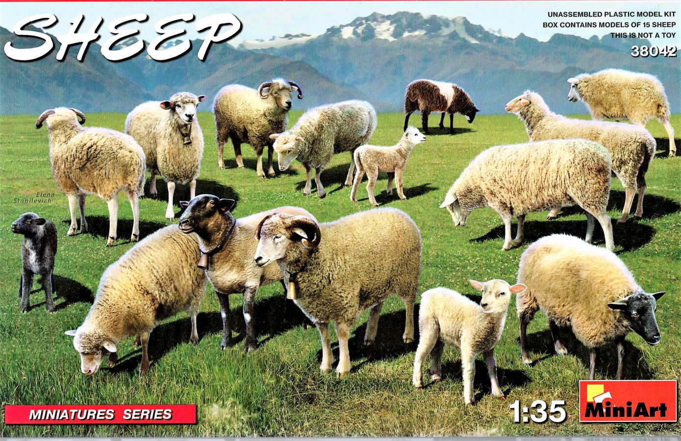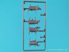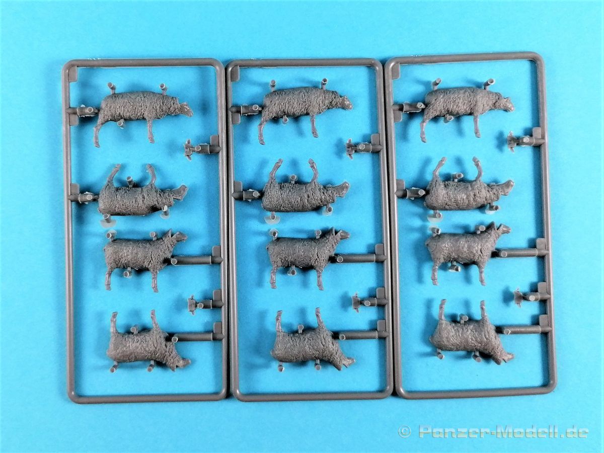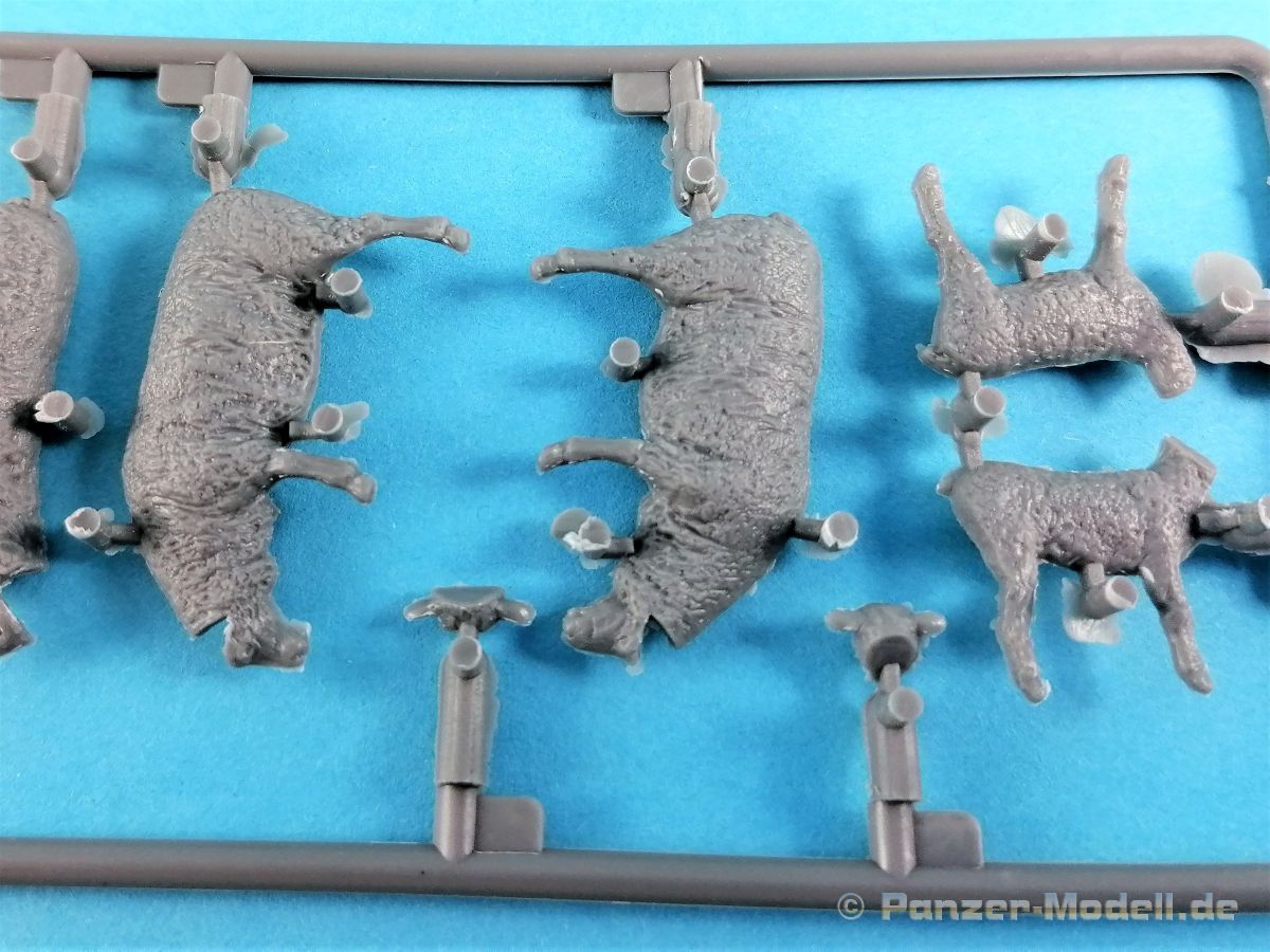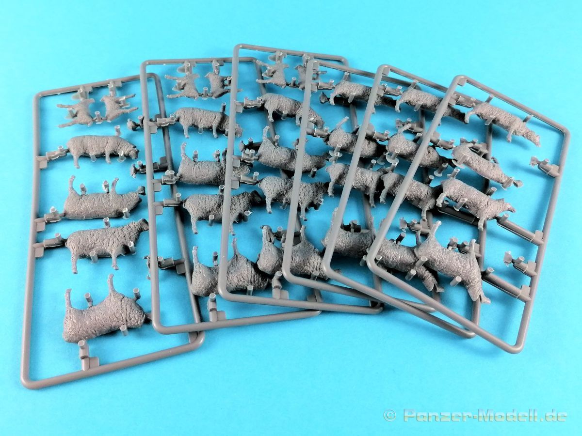 In der 260 x 160 x 35 mm großen, seitlich zu öffnenden Schachtel befinden sich sechs hellgraue Spritzlinge im Plastikbeutel. Jeweils drei davon sind identisch. Der Inhalt des Kits lässt den Bau von insgesamt fünfzehn Schafen zu. Das sind Böcke, Muttertiere und Jungtiere. Der Guß der Teile ist recht ansprechend und kommt in der typischen Qualität von MiniArt daher. Das heißt es sind einige Versäuberungen nötig und verschiedene Grate und Formtrennlinien zu egalisieren. Beim Zusammenbau dürfte gerade der Rückenbereich etwas erhöhte Aufmerksamkeit benötigen. Alle Tiere sind in stehender Haltung gegossen und können durchaus überzeugen. Liegende Schafe sind leider nicht vorhanden. Schade. Die Bau- und Bemalungsanleitung finden wir auf der Rückseite der Schachtel. Diese stammen von Vallejo, Mr. Color, AK RC, Mission Models, AMIG und Tamiya. Ein feines kleines Set von MiniArt. Zudem sind die Schafe universell einzusetzten sind. Gerne noch mehr Viechereien!