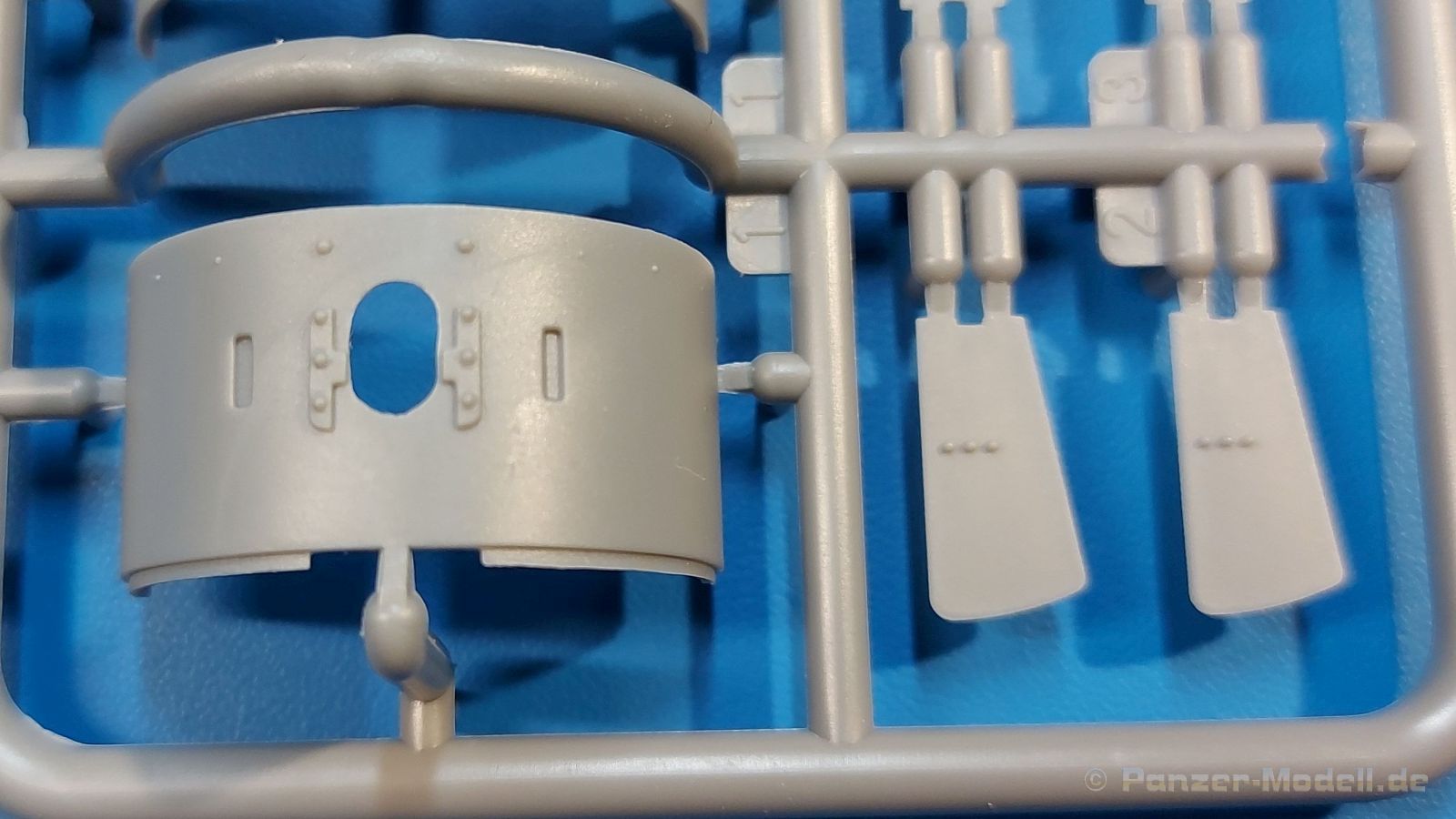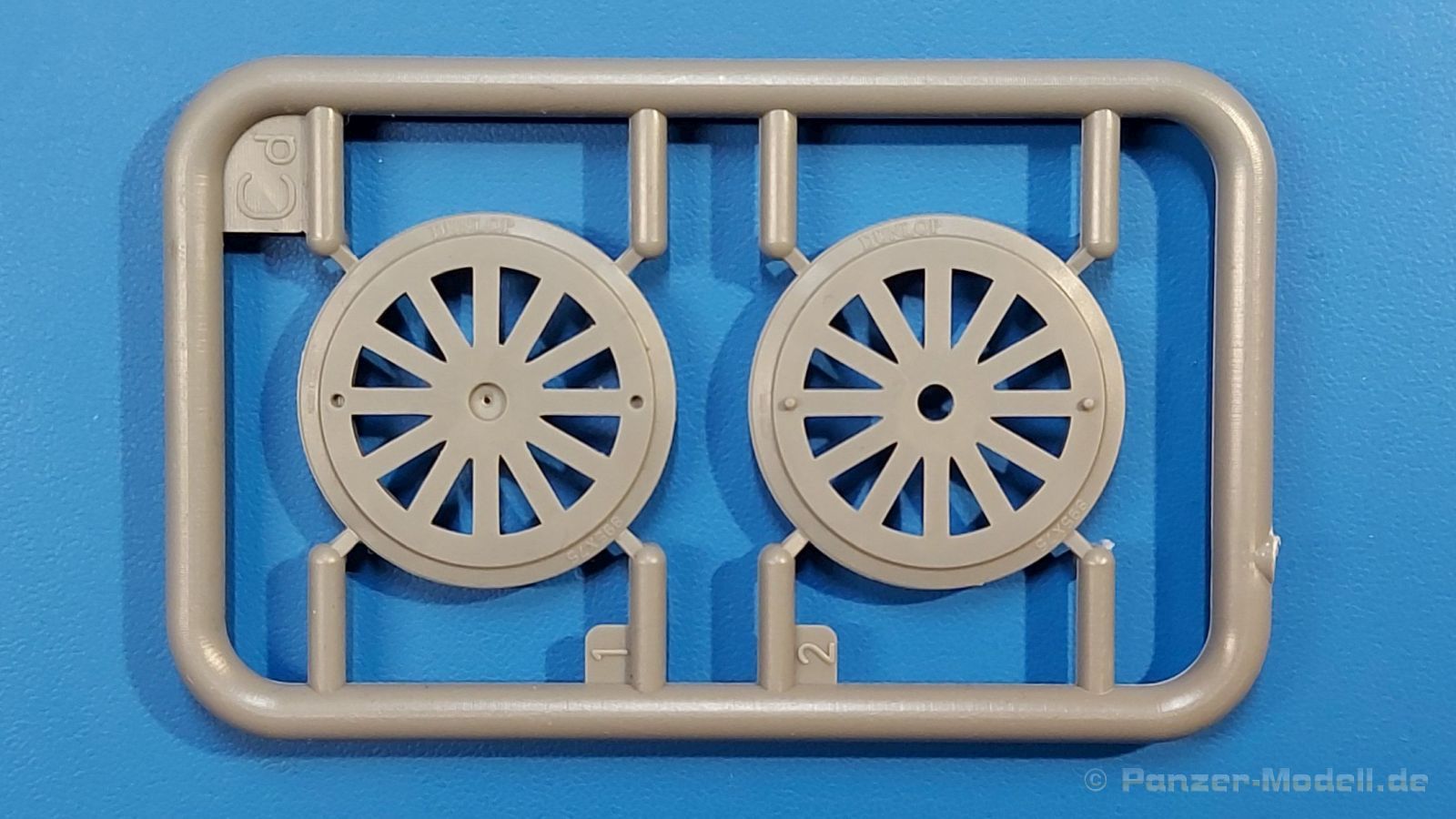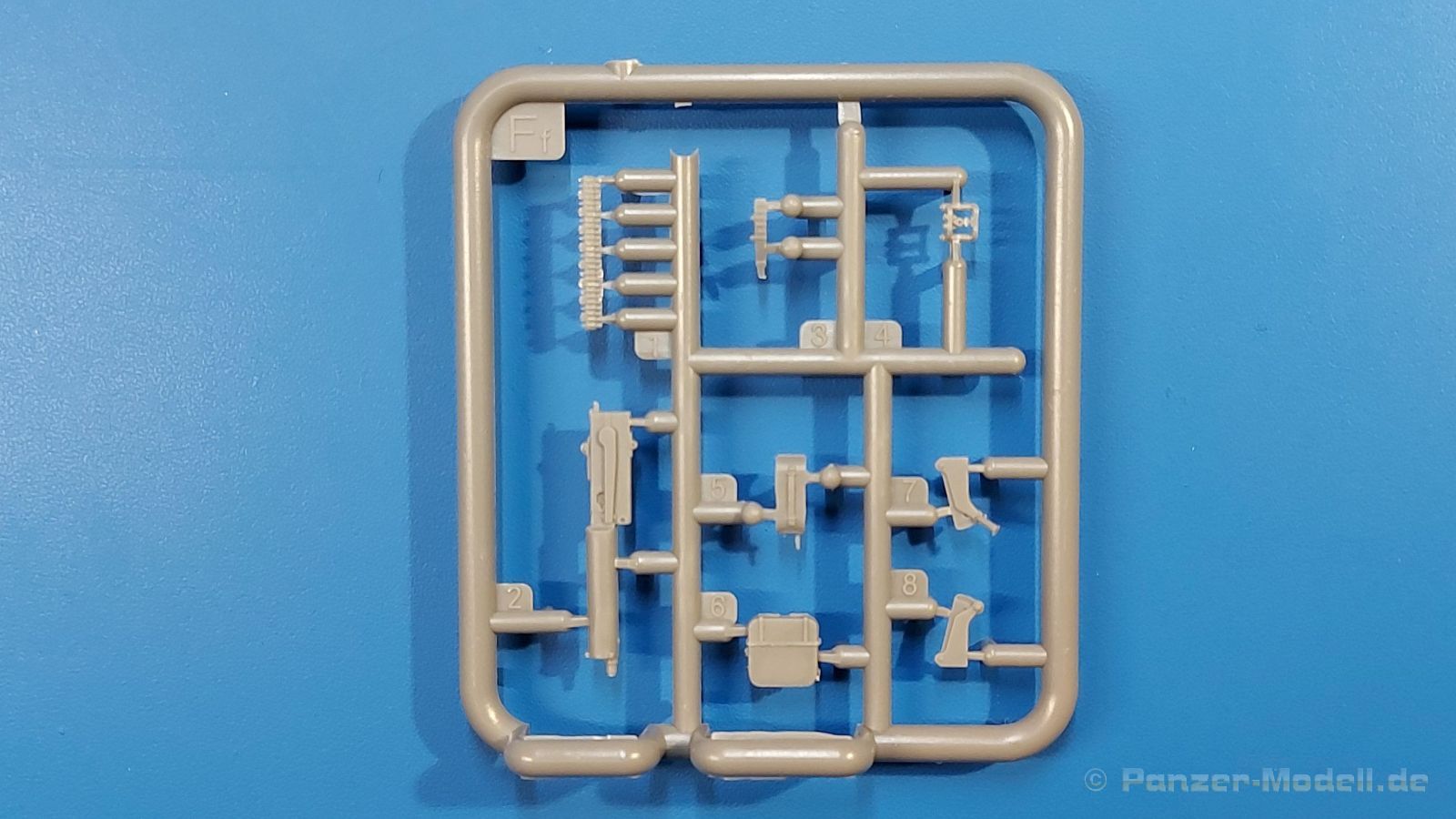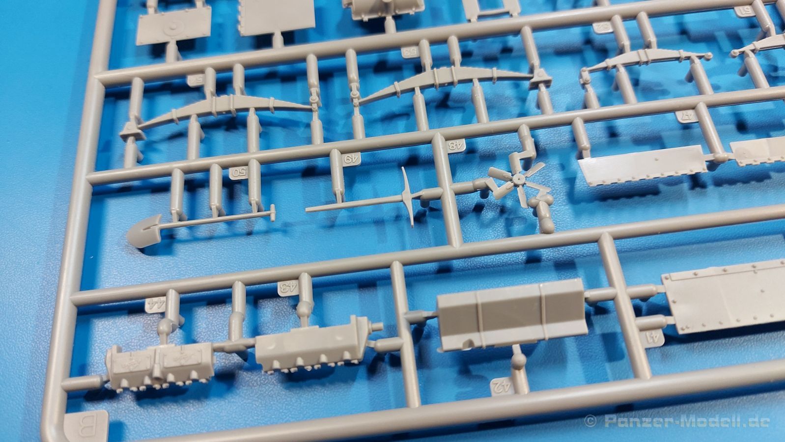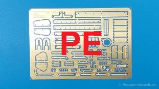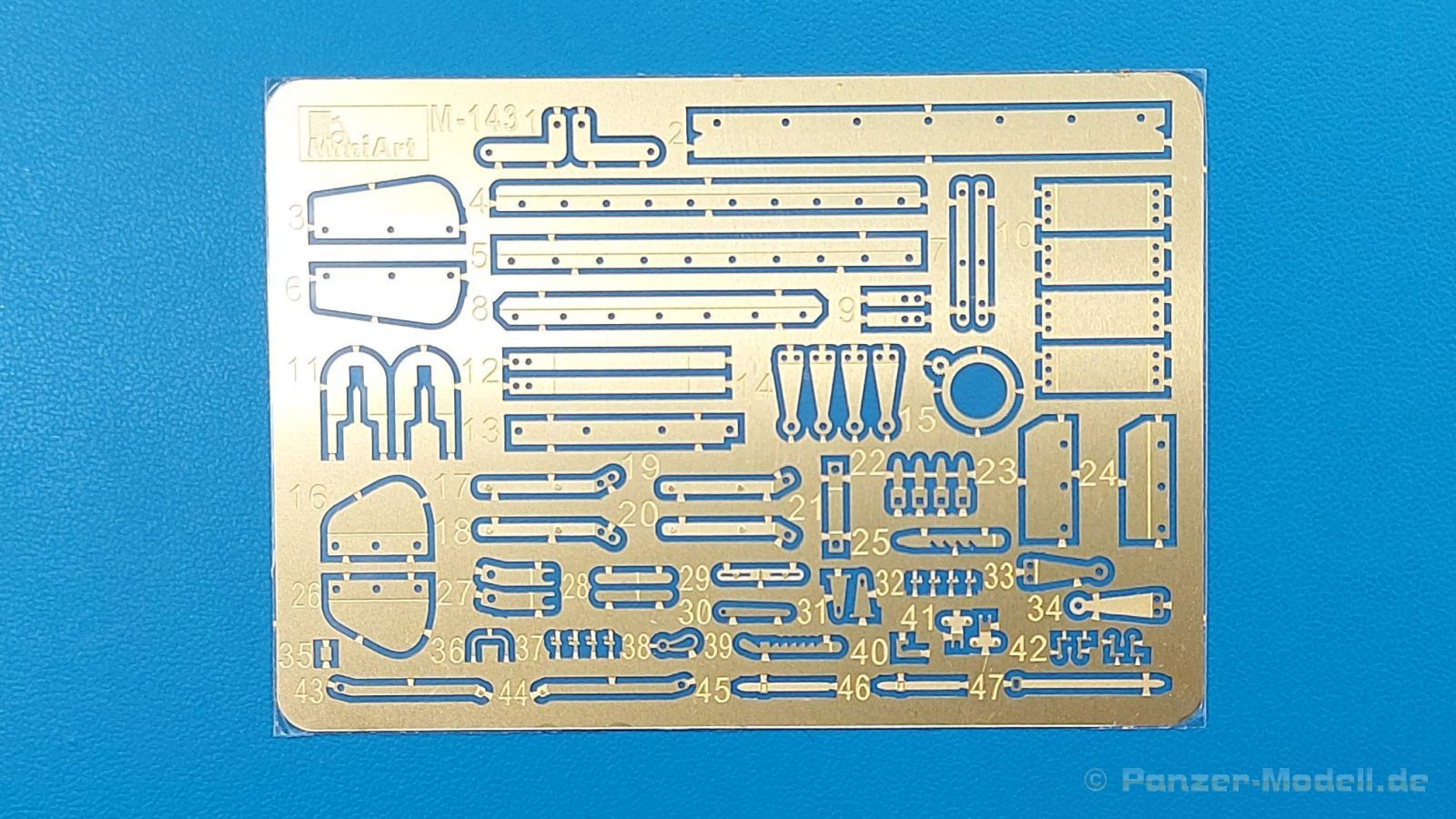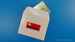Das Original: Der Austin Panzerwagen wurde während des 1. Weltkrieges produziert. Er basierte ursprünglich auf einem Pkw Fahrgestell und war rundum gepanzert und mit 2 MG-Türmen ausgestattet. E wog über 5 to. und erreichte mit einem 4-Zylinder 50 PS (37 kW) Benzinmotor 56 km/h Höchstgeschwindigkeit. Die Besatzung bestand ursprünglich aus 4 Soldaten, aber nach Einführung des Rückwärtsfahrers dann aus 5. Auch wenn es eigentlich ein britisches Fahrzeug war und im 1. Weltkrieg eingesetzt wurde, erlangte es doch eher Bekanntheit durch seine Nutzung während des russischen Bürgerkrieges. Dort wurde er auch oft als Beutefahrzeug eingesetzt. Der Bausatz: MiniArt hat die Gewohnheit, möglichst viel aus seinen Modellen herauszuholen und Varianten anzubieten. So kommt es, dass dieser Bausatz einer von (bisher) vieren ist. Diesmal haben wir die Version eines, mit Interior voll ausgestatteten, „Beute-Austins“ vor uns. Man möge mir den langen Text verzeihen, aber da war wohl etwas mehr Begeisterung mit im Spiel! Im 385 x 240 x 60 mm großen Karton befinden sich 17 hellgraue und 1 Klarsichtspritzling, 1 PE-Platine, 1 Decalsheet und natürlich eine Bau-/Bemalungsanleitung. Die Teile sind auf dem heutigen Stand der Technik produziert und können mit allerlei Details und Feinheiten glänzen. So gut wie keine Auswerferspuren auf Teilen, da diese meist auf die Gießäste gesetzt sind. Bei den wenigen Teilen, wo man glaubt, Auswerferspuren zu sehen, sitzen sie auf Stellen, die nach dem Bau nicht mehr zu sehen sind. Versatz, Gussgrat konnte ich mit bloßem Auge nicht entdecken. Original verpackt erwarten einen keine Probleme, aber wenn man die Spritzlinge nicht mehr in die Plastiktüten zurückpackt, kann es beim Transport passieren, dass man etwas Bruch hat. In meinem Fall betraf dies den vorderen, linken Kotflügel, dessen vordere Kante angebrochen war. Aber auch dies lässt sich mit den modernen Klebstoffen leicht reparieren. Der Leiterrahmen setzt sich traditionell aus Längs- und Querträgern, verstärkt durch Kreuzträger zusammen. Für den sehr gut detaillierten Motor gibt es extra Längsträger zum Einbau in den Rahmen. Der wassergekühlte Motor, ein Modell im Modell, bietet alle wichtigen Elemente wie z.B. Ölwanne mit separater Ölablassschraube, Motorblock mit gut erkennbaren, erhabenen Austin Aufschriften, Zylinderkopf mit ausliegenden Ventilfedern, Zündkerzen sind erkennbar, Luftansaugkanal mit kleinem Luftfilter, Abgaskrümmer, separate Wasserpumpe, Kühlleitungen, Keilriemen und Kühlerpropeller. Feine PE-Teile peppen den Motor weiter auf. Dazu kommen natürlich noch der Kühler selbst mit feinen Kühlrippen und separatem Kühlwasserdeckel, Kupplung (? - anhand der Pedalerie und Hebel bin ich nicht sicher, ob der Austin bereits so etwas wie eine Kupplung hatte oder ob die Gänge in Tradition feinster spannabhebender Verformung reingequält wurden… Für Aufklärung zur Technik wären wir dankbar!) und Getriebe. Auch auf dem Getriebe finden wir die erhabene Austin Aufschrift. Die mehrfach unterteilte Bodenplatte zeigt in einigen Bereichen eine Bretterstruktur. Im hinteren Bereich wird eine etwas erhöhte Plattform für den Rückwärtsfahrer und die beiden MG-Türme angebracht. Die kreisrunden Bodenflächen der Türme sind mit sternförmigen Riffeln versehen, damit die MG-Bedienungen sich mit den Füßen abstoßen konnten, um die Türme zu drehen. Riffel und Nieten sind sehr schön wiedergegeben. Sitzfläche und Rückenlehne geben glaubhaft die Polsterstruktur wieder. Auch die Verschraubungen der Rückenlehne gefallen mir. Neben dem Rückwärtsfahrer finden zwei aufeinander gesetzte Kisten Platz, von denen ich vermute, dass sich zumindest in einer davon der Tank befand. Fahrer und Beifahrer habengleiche Sitzkissen wie der Rückwärtsfahrer. Ähnlich die beiden Rückenlehnen, die aber bereits zusammen an einem Brett montiert sind. Während das Lenkrad des Rückwärtsfahrers ein einfaches 4-Speichen Rad ist, besitzt das Hauptlenkrad ein kleineren, inneren Ring mit zusätzliche Hebeln. Die Armaturentafel zeigt sehr viele Instrumente. Leider gibt es keine Decals dazu. Im Fußbereich des Fahrers wird eine kleine Ballpumpe plus Leitung montiert, die auf der anderen Seite im Motorraum in einer trompetenförmigen Hupe endet. Die genaue Montage wird in einem Extrabild in der Bauanleitung aufgezeigt. Der gepanzerte Aufbau ist ein Thema für sich, denn er besteht aus unzählig vielen Panzerplatten, Trägern, Klappen und PE-Teilen. Alle Aufbauteile sind beidseitig detailliert wie man es von einem Interior Bausatz wohl erwartet. Präzises Arbeiten ist hier Pflicht, damit alle Teile stimmig zusammenkommen. Bei allen Klappen und Deckeln, die man alternativ offen oder geschlossen anbauen kann, muss man sehr genau schauen, da oftmals Hebel und Gestänge je nach Anbau unterschiedlich ausfallen. Da wäre z.B. die Stange, mit der der Beifahrer gleichzeitig die Motorentlüftungsklappe auf der Haube und die Kühlerklappe bedient. Oder der Sägezahnhebel der hinteren Sichtklappe. Oder der Ausstellhebel der seitlichen Sichtklappen. Bei der Fahrerfront kann man sich entscheiden, ob man die obere Klappe anhebt und die untere Klappe ganz nach vorn abklappt, wie es z.B. bei Fahrten weitab vom Feind wohl sicherlich gemacht wurde. Andere Variationen sind da auch noch möglich. Für 5 Fahrzeuge verschiedener Länder gibt Abziehbilder (Decals). Die ukrainischen Rondells erscheinen etwas verschmiert, welches aber Absicht ist, da im Original die Rondells wohl auch nur schnell mit dem Pinsel aufgemalt wurden. Alle Decals sind seidenmatt mit wenig Rand.
