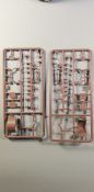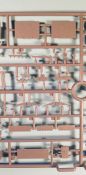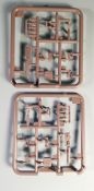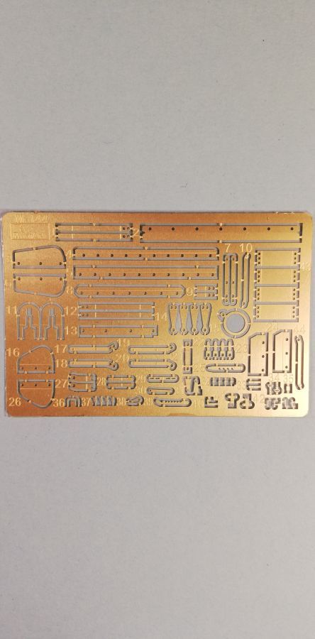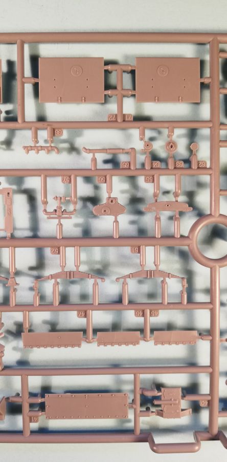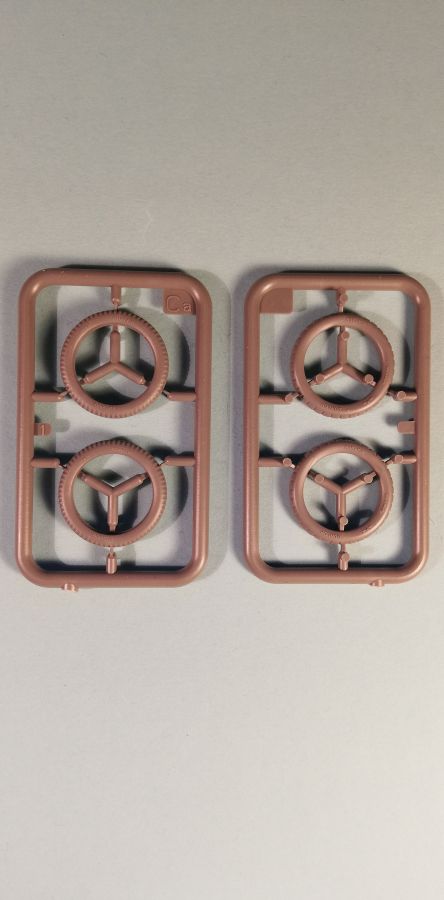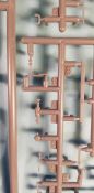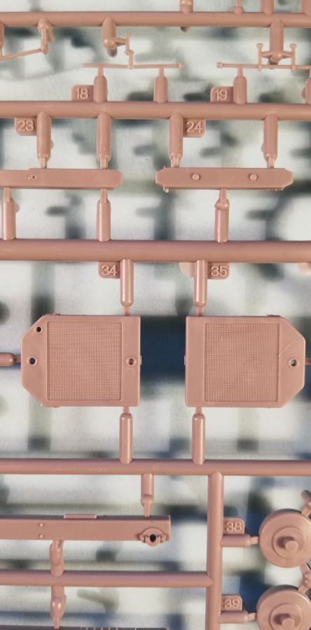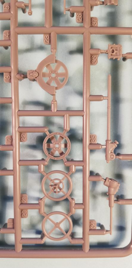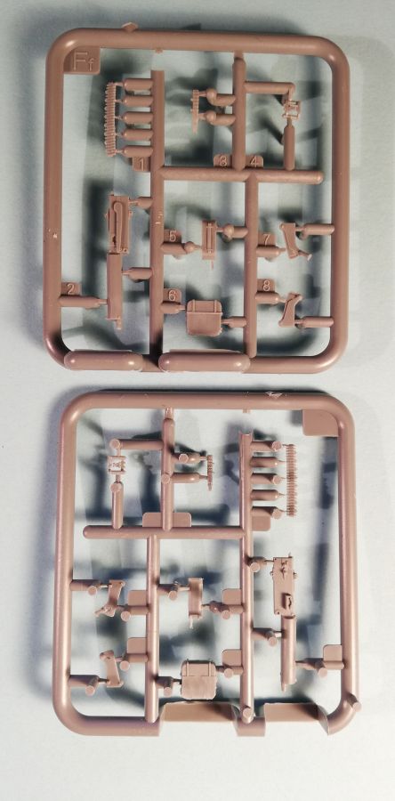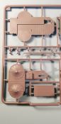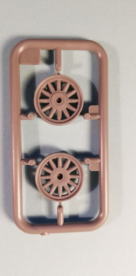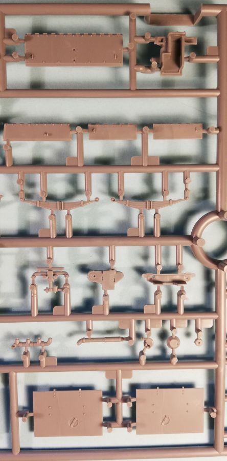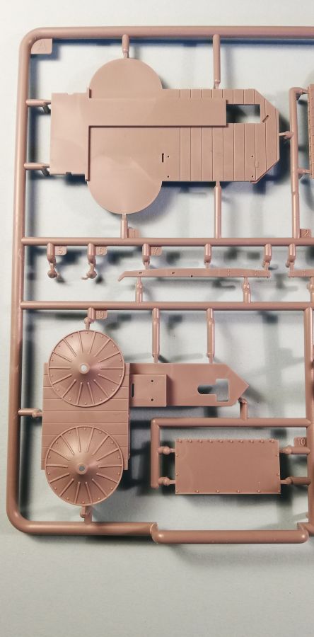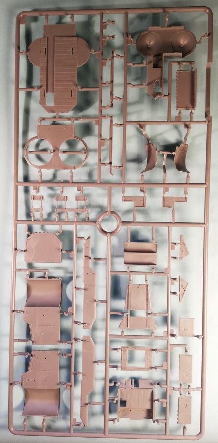 Der Austin Panzerwagen wurde während des 1. Weltkriegs produziert. Die Basis bildet ein Pkw-Fahrgestell, das komplett überpanzert und mit 2 MG-Türmen ausgerüstet wurde. Mit über 5t Gewicht erreichte der 4-Zylinder 50 PS (37 kW) Benzinmotor eine Höchstgeschwindigkeit von 56 km/h. Die Besatzung bestand zunächst aus 4 Soldaten und wurde später um einen Rückwärtsfahrer erweitert. Diese britische Entwicklung wurde noch im 1. Weltkrieg eingesetzt, erlangte aber eine größere Bekanntheit durch seine Verwendung während des russischen Bürgerkrieges. In dieser Zeit wurde es oft als Beutefahrzeug eingesetzt und ermöglicht so eine vielfältige Bemalung bzw. Markierung. Dies nutzt MiniArt geschickt, um den Markt nun mit einer weiteren Version zu bedienen. In einem für MiniArt typisch bunten Stülpkarton befinden sich 15 hellgraue und 1 Klarsichtspritzling, 1 PE-Platine, 1 Decalsheet und eine Bauanleitung, die sieben verschiedene Fahrzeuge vorstellt. Die Spritzlinge sind technisch hochwertig produziert und bieten viele Details. Es gibt keine Auswerfermarken auf später sichtbaren Stellen und die Angüsse sind so gesetzt, das ein einfaches entgraten möglich ist. Modellbeschreibung: Der Leiterrahmen aus Längs- und Querträgern wird durch einen Kreuzträger verstärkt. Für den schön detaillierten Motor gibt es einen weiteren Längsträger, um diesen im Rahmen zu befestigen. Der wassergekühlte Motor mit umfangreichen Bauteilen enthält alle wichtigen Bestandteile wie Ölwanne mit separater Ölablassschraube, Motorblock mit erhabenen Aufschriften der Marke Austin, Zylinderkopf mit ausliegenden Ventilfedern, sichtbaren Zündkerzen, Luftansaugkanal einschließlich kleinem Luftfilter, Abgaskrümmer, separate Wasserpumpe, Kühlleitungen, Keilriemen und Kühlerpropeller. Mit PE-Teile kann der Motor weiter detailliert werden. Hinzu kommen der Kühler mit feinen Kühlrippen und separatem Kühlwasserdeckel sowie eine Kupplung und Getriebe. Das Getriebe ist auch mit der Bezeichnung Austin versehen. Im Rahmen werden umfangreiche Lenk- und Bremsgestänge verbaut. Beachte: Gemäß Bauanleitung besteht hier die Option das beiliegende Plastikgestänge oder Draht zu verwenden, der jedoch dem Bausatz nicht beiliegt. Die mehrteilige Bodenplatte weist in einigen Bereichen eine Bretterstruktur auf, die eine etwas markantere Maserung haben könnte. Der hintere Bereich ist für den Rückwärtsfahrer etwas erhöht. Zwischen den beiden Fahrerplätzen ruhen die beiden MG-Türme auf der Plattform. Die drehbaren Türme sind jeweils auf einer runden Bodenfläche angebracht, die mit sternförmigen Riffeln versehen ist, damit die MG-Bedienungen sich mit den Füßen abstoßen konnten. Alle Details wie Riffel oder Nieten, die Polsterstruktur der Sitzflächen bzw. Rückenlehnen oder die Verschraubungen der Rückenlehne sind überzeugend ausgeführt. Neben dem Rückwärtsfahrer befinden sich zwei übereinanderliegende Kisten, in denen sich vermutlich der Tank befand. Die Sitzkissen des Fahrers bzw. Beifahrers sind mit den vorstehend beschriebenen identisch. Die beiden Rückenlehnen sind an einem Brett montiert. Die Lenkräder unterscheiden sich, in dem der Rückwärtsfahrer über ein einfaches 4-Speichen-Rad verfügt und das Hauptlenkrad einen kleineren, inneren Ring mit zusätzlichen Hebeln aufweist. Für die Instrumente des Armaturenbretts liegen leider keine Decals bei. Im Fußbereich des Fahrers wird eine kleine Ballpumpe nebst Leitung montiert und endet auf der anderen Seite im Motorraum in einer trompetenförmigen Hupe. Zur genauen Montage wird ein aufmerksamer Blick in die Bauanleitung empfohlen. Eine weitere Herausforderung ist der gepanzerte Aufbau, denn hier warten eine Vielzahl an Panzerplatten, Trägern, Klappen und PE-Teilen auf den Modellbauer. Die Aufbauteile haben eine hohe Qualität und sind beidseitig detailliert. Dementsprechend ist für ein stimmiges Endergebnis Präzision beim Zusammenbau gefragt. Da alle Klappen und Deckel wahlweise offen oder geschlossen anbauen werden können, ist hier genauestens auf die jeweilige Länge der Hebel bzw. Gestänge zu achten. Als Beispiel sei hier die Stange aufgeführt, mit der der Beifahrer gleichzeitig die Motorentlüftungsklappe auf der Haube und die Kühlerklappe bedient. Oder der Sägezahnhebel der hinteren Sichtklappe. Oder der Ausstellhebel der seitlichen Sichtklappen. Bei der Fahrerfront ist zu entscheiden, ob die obere Klappe angehoben und die Untere nach vorn abgeklappt wird. Andere Positionen sind möglich. Die Türme bestehen aus einem vorderen und einem hinteren Teil. Außen sind einige Nieten zu ergänzen, die am Spritzling CK zu finden sind. Jeder Turm bekommt beidseitig der MG-Öffnung Panzerplatten, die mittels PE-Blechen am Turm abgestützt werden. Das Turmdach weist einige schön gestaltete Nieten auf. Auch die Turmklappe ist sehr gut gelungen, da im Inneren nicht nur der Riegel angebracht wird, sondern auch ein sehr detaillierter Scheinwerfer. Dieser ist innen hohl mit angedeuteter Glühlampe und wird mit einer Scheibe aus Klarsichtplastik abgedeckt. Die Halterung der Scheinwerfer ist wiederum aus PE und irgendwie vermittelt die Bauanleitung den Eindruck, dass die Scheinwerfer schwenkbar wären. Im Übrigen befindet sich vor dem Kühler ein weiterer Scheinwerfer (hohl, mit Glühlampe und Klarsichtscheibe), der in eine Halterung zu setzen ist, bevor der Aufbau mit dem Rahmen verbunden wird. Es empfiehlt sich daher, die Kühlerklappe geöffnet anzubauen, damit später der Scheinwerfer auch zu sehen ist. Durch ein Loch in der Frontpanzerung wird die Anlasskurbel geschoben. Die Kotflügel sind sehr dünnwandig ausgeführt. Die Vorderen sind beidseitig detailliert und werden an der seitlichen Unterpanzerung angebracht. Eine PE-Stange sichert diese an der Oberpanzerung. Die hinteren Kotflügel sind an der Oberseite mit Nieten und Versteifungsrippen versehen. An der Unterseite werden die Details anhand weiterer PE-Halterung ergänzt und dann an die O