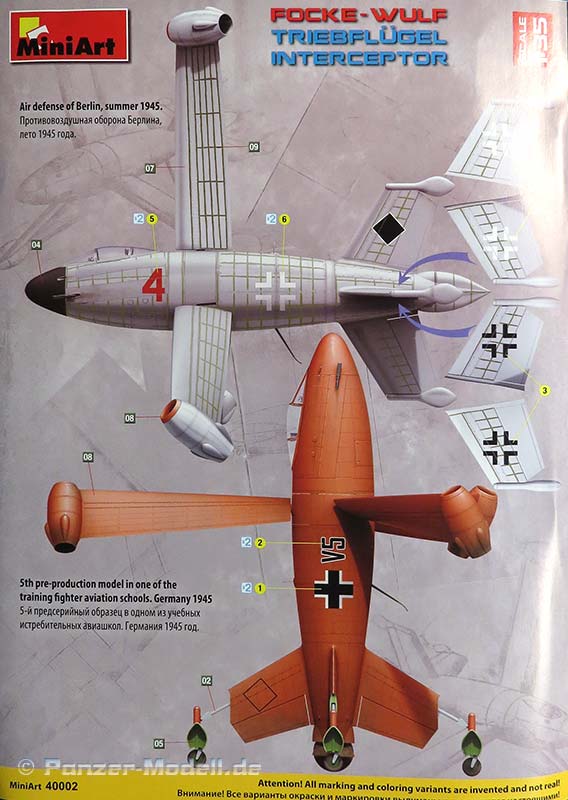 Am Ende sind weitere farbig gedruckte Bemalungsoptionen für den Triebflügel vorhanden.
