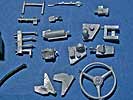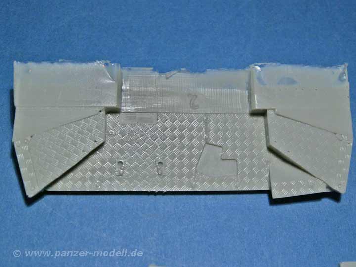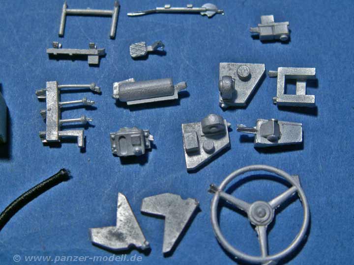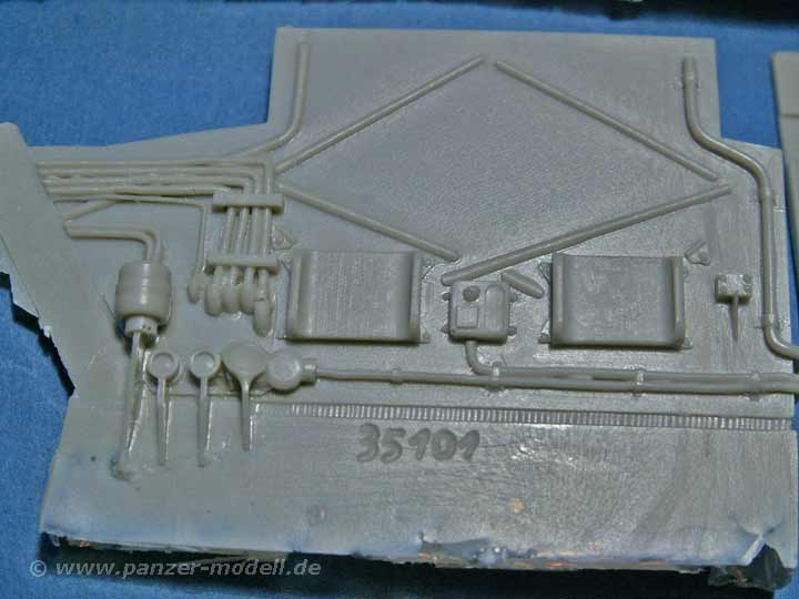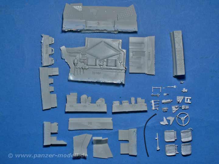 Das Set umfasst immerhin 49 sauber gegossene Resin und Zinnteile, die nahezu den kompletten Führerstand des TPz Fuchs abdecken. Besonders erwähnenswert ist hier der Beifahrersitz, dieser kann wie das Original als normaler Sitz oder aber zusammengeklappt als Standfläche für einen MG Schützen im Turmluk gebaut werden. Die Qualität sowohl der Resin als auch der Zinnteile ist erstklassig. Der Versäuberungsaufwand beschränkt sich auf ein Minimum und dürfte auch Anfänger vor keine Probleme stellen. Auch die Oberflächendetailierung ist gut gelungen, so sind zum Beispiel die diversen Leitungen an der Rückwand eine wahre Augenweide.