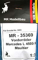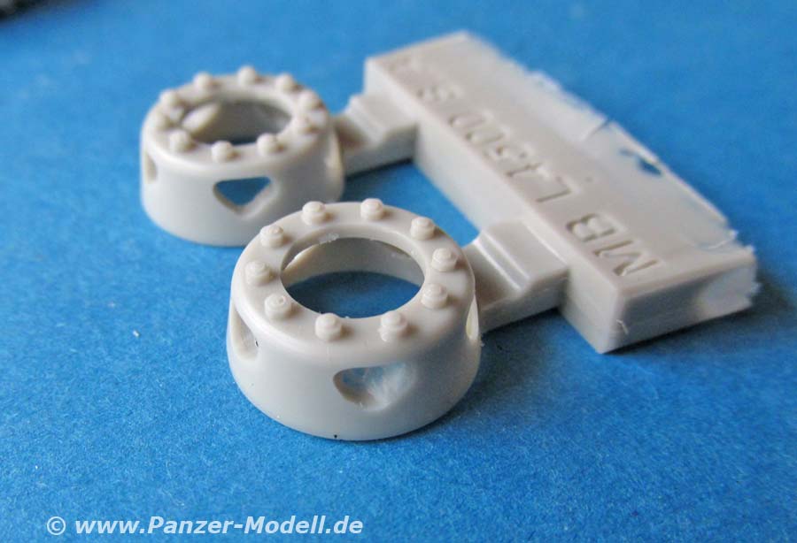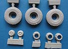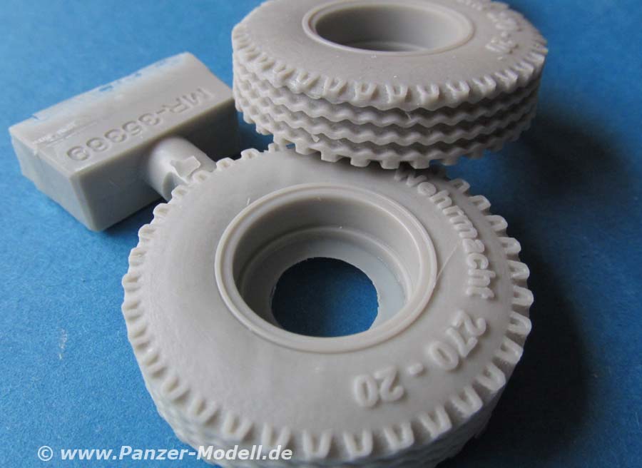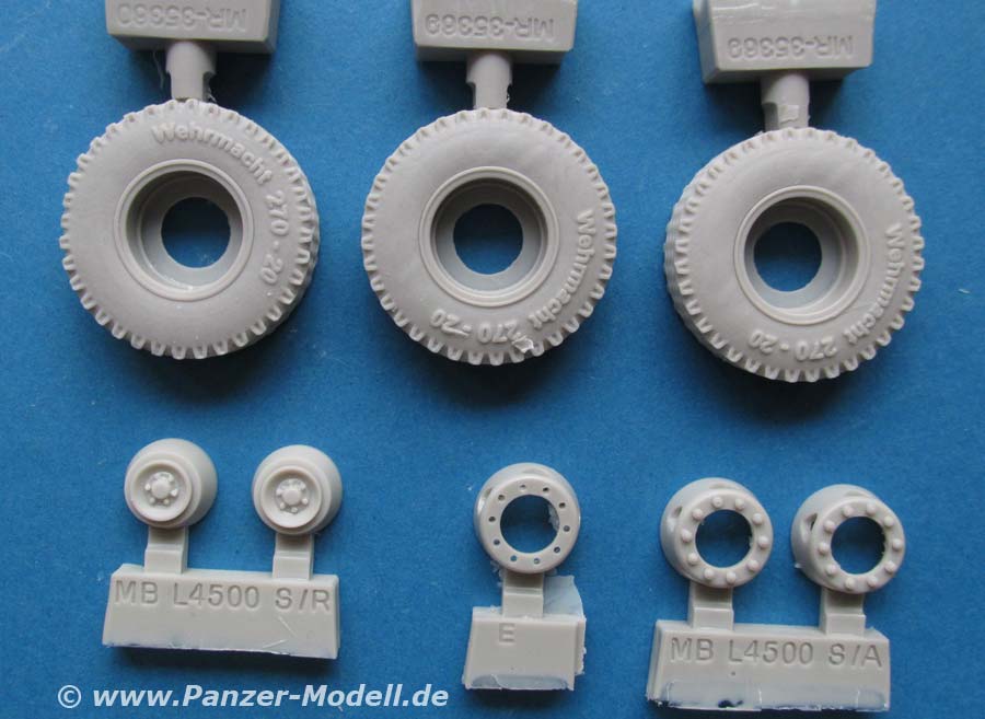 Vorderräder Mercedes L4500R Maultier In diesem Zurüstsatz finden sich 8 Resinteile zum Bau von 3 Reifen für das Mercedes Maultier um die nicht so schönen aus dem bausatz zu ersetzen.Dies sind in diesem Fall natürlich die beiden Vorderräder und der Ersatzreifen, die mit Felgenring und im Falle der Vorderräder auch mit Naben ausgestattet werden. Der Guss ist sauber und fehlerfrei. Die Angüsse sitzen zwar auf der Profillauffläche, allerdings angenehm klein, sodass sich die Versäuberung in Grenzen hält. Das Profil ist sauber und scharf gegossen, scheint mir allerdings maßstäblich etwas zu grob, bzw. zu tief zu sein. Auf den Reifenflanken gibt es sogar Herstelleraufdrucke "Wehrmacht 270-20". Den Aufdruck "Wehrmacht" habe ich da zwar noch nie gesehen - ausschließen will ich es aber auch nicht. Allerdings erscheint mir der Aufdruck maßstäblich zu dick - hier sollte man noch ein wenig die Feile kreisen lassen Ein interessantes Reifenset für das Maultier mit ein paar netten Rädern, die die Bausatzräder ersetzen. Kostenpunkt: knapp 14 Euro.