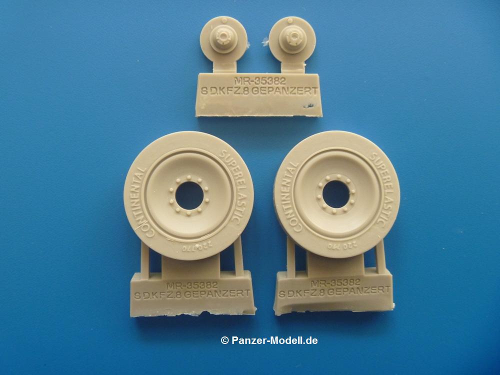 Der Umbausatz: Trumpeters Bausatz des Sd.Kfz.8 DB10 gepanzerte 12t war ja schon eine schöne Überraschung für die Militärmodellbauer. MR Modellbau beschert uns nun die Vollgummiräder wie sie auf dem geborgenen Fahrzeug vorgefunden wurden und mit denen man die Bausatzräder ersetzt.In einem wieder verschließbaren Tütchen finden wir die beiden Vorderräder und die dazugehörigen Radnaben. Die Angüsse sind so gewählt, dass man die Teile ohne besondere Schwierigkeiten abtrennen kann. Der fast blasenfreie Guss und die kristallklaren Details auf beiden Seiten der Räder, Laufflächen und Naben stechen sofort ins Auge.Jedes Rad trägt auf beiden Seiten die Aufschriften CONTINENTAL, SUPERELASTIC und 220 770 in erhabenen Buchstaben/Zahlen. Dies sieht fantastisch aus, aber so oft ich mir auch die einzige Nahaufnahme des Originals anschaue, die ich finden konnte, ich sehe immer nur eingeprägte Buchstaben.Statt einem Profil wie bei Luftreifen haben die Vollgummireifen 3 Löcher über die Breite, die sich dann zueinander versetzt über die ganze Lauffläche ziehen und dem Reifen einen besonderen Look geben. In der Mitte der Lauffläche verläuft noch eine flache Naht, die wir auch beim Original wiederfinden. Auf den Felgenrändern der Innenseiten finden wir 2 zueinander versetzte Nietenreihen, die das Vollgummi auf der Felge halten. Die Felgenaußenseiten sind mit zehn 6-kant Radmuttern versehen.Die konusförmigen Radnaben besitzen je einen Lokalisierungsstift zur Fixierung an der Felge und werden von hinten in die Felge eingeklebt. Auf der Rückseite der Naben finden wir wieder zehn 6-kant Schraubenköpfe. Hier hatte sich beim Besprechungsmuster leider ein Bläschen in einen Schraubenkopf eingeschlichen.Für um die 12,00 EUR bekommt man 2 tolle Hingucker für den gepanzerten 12t. Auch Resin-Anfänger sollten damit zurecht kommen.