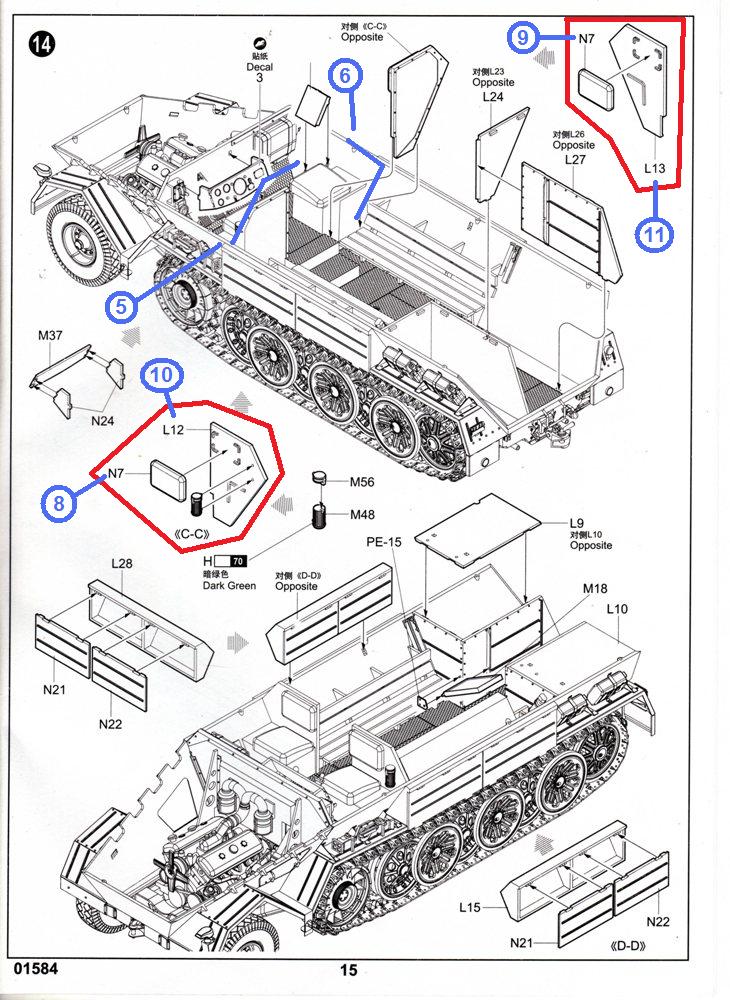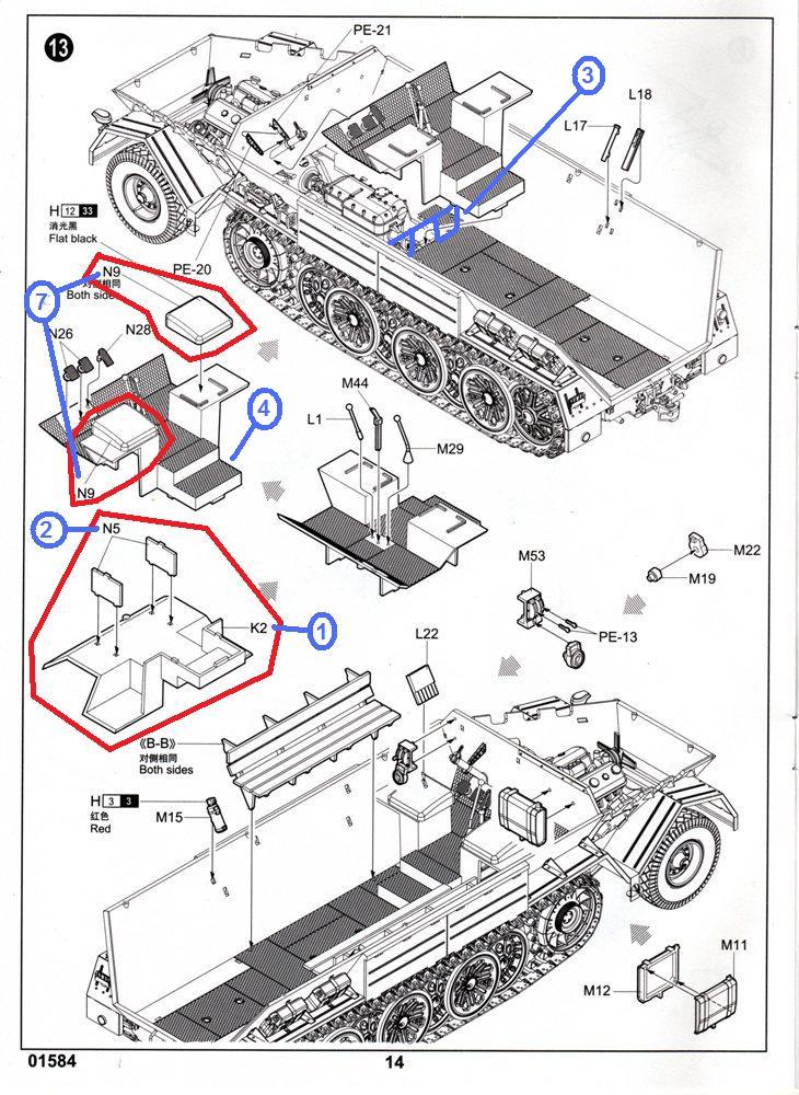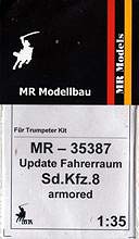 Der Umbausatz: Für Trumpeters Bausatz des Sd.Kfz.8 DB10 gepanzerte 12t gibt es ja bereits die Vollgummi Vorderräder von MR Modellbau mit der Nr. MR-35382. Als weitere Änderung versorgt uns die Firma nun mit einem neuen Fahrerraum, der folgende Bauteile aus dem Trumpeter Bausatz in den Bauschritten 13 und 14 ersetzt/ergänzt: