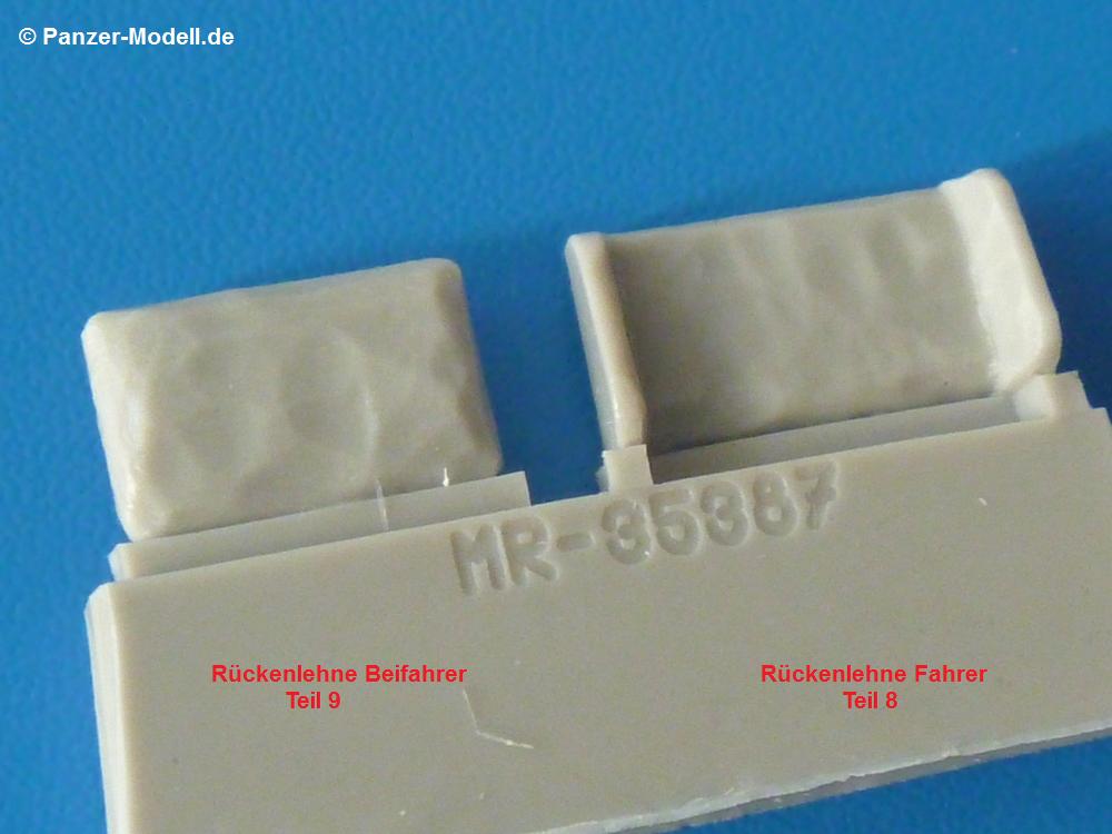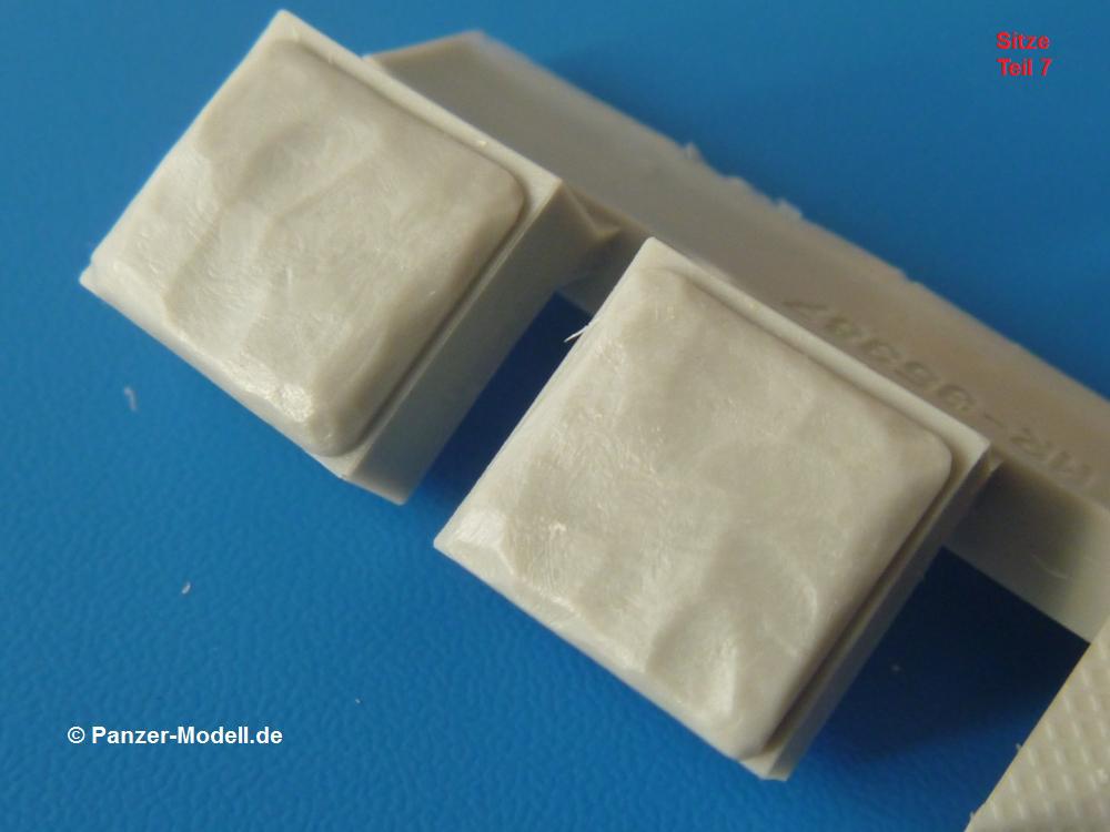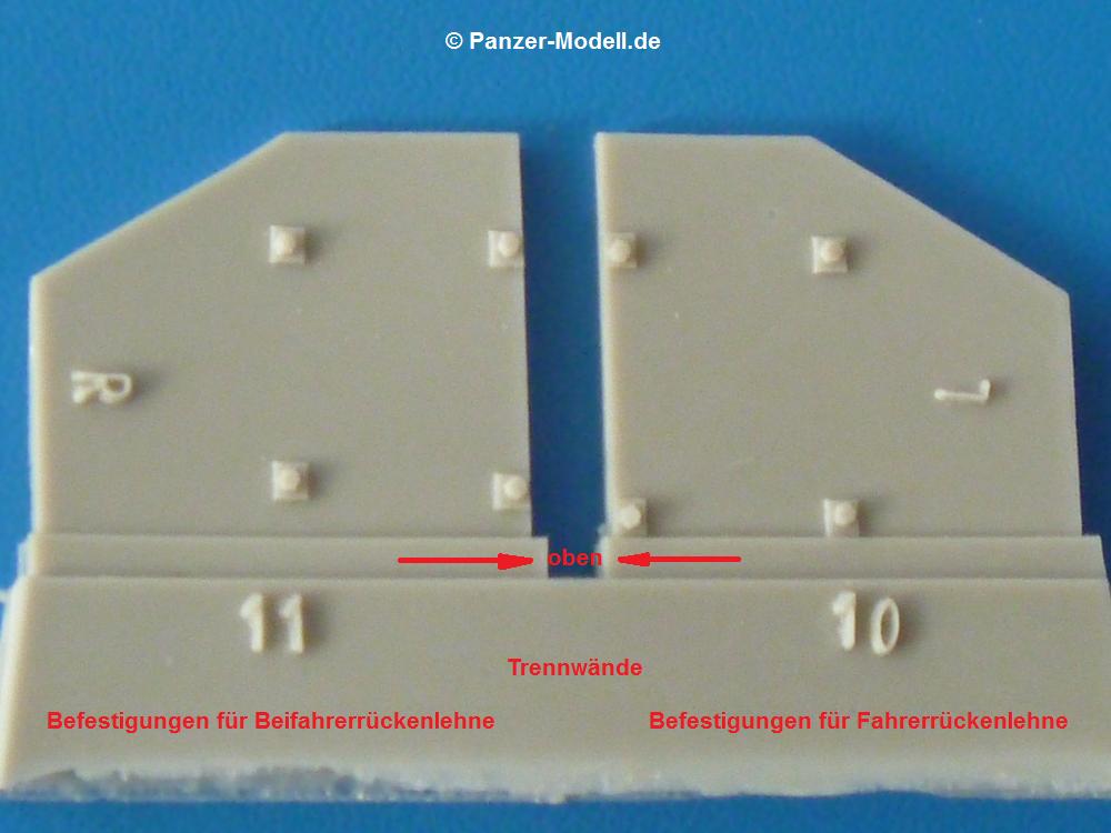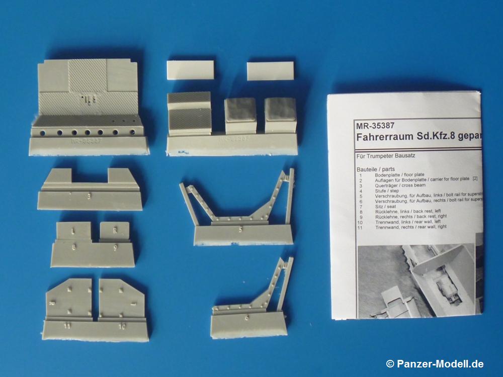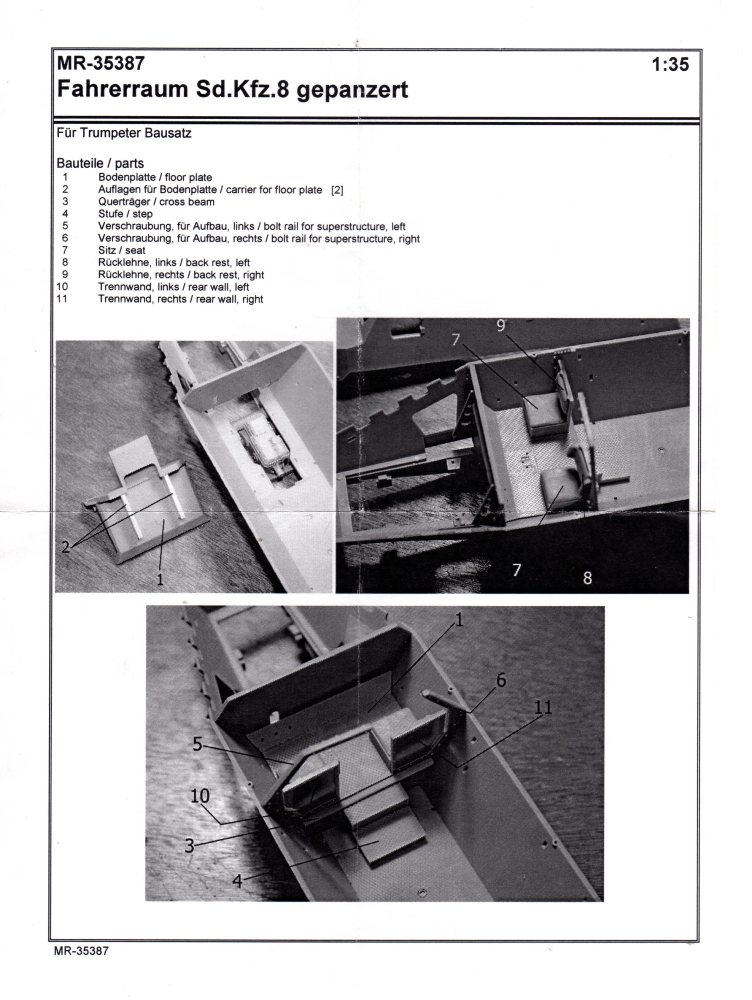 Der Fahrerraum ist wohl dem des in Polen gefundenen Fahrzeugs nachempfunden. Für die Version, die Trumpeter verwendet, konnte ich keine Hinweise finden.In einem wieder verschließbaren Tütchen erhalten wir neben der Bauanleitung mit der Teileübersicht und der fotografierten Anleitung 9 Gussstücke mit einem oder mehreren Teilen daran. Die Angüsse sind moderat, aber ein Anfänger muss beim Abtrennen vom Anguss sein Geschick einsetzen, um nicht zuviel abzusägen, grad bei der Bodenplatte. Der Guss ist blasenfrei. Details wie Riffelung und Schraubenköpfe kommen gut zur Geltung.Die verzugsfreie Bodenplatte hat eine schöne Riffelblechstruktur. Auch sind die Köpfe der Schlitzschrauben, mit denen die einzelnen Bodenbleche beim Original befestigt waren, gut zu erkennen. Löcher für Pedale und Schalthebel aus dem Trumpeter Bausatz sind vorhanden. Den Anguss an der Bodenplatte empfinde ich als etwas stark. Beim Absägen sollte man behutsam vorgehen. An der Unterseite der Platte sind 2 Führungsschlitze, in die die 2 Auflagen perfekt hineinpassen. Der neue Querträger, der ans hintere Ende der Bodenplatte kommt, ist ganz glatt ohne erkennbare Struktur. Dazu kommt noch Stufe mit Riffelung wie bei der Bodenplatte. Fahrer- und Beifahrersitz finden ihren Platz auf den glatten Flächen der Bodenplatte. Die Sitzkissen sind etwas aufgeraut, um die Lederstruktur darzustellen. Wellen und Dellen erwecken den Anschein, als hätte sich die Besatzung grad von ihren Sitzen erhoben. Ähnlich sind die beiden Rückenlehnen gestaltet. Hier aber aufpassen bei der Anbringung an den Trennwänden, denn linke und rechte Lehne sind unterschiedlich. Das aufgedruckte L und R helfen, Verwechslungen zu vermeiden. Sehr schön zu sehen sind die Nietenköpfe der Trennwände. Ebenso deutlich treten die Schraubenköpfe an den Verschraubungen des Ausbaus hervor. Diese Verschraubungen sind beim Original Bausatz überhaupt nicht vorhanden und geben ihm ein fehlendes Detail.Die einseitig bedruckte Bauanleitung besteht aus einer Auslistung und Benennung der Teile in Deutsch und Englisch. Auf 3 schwarz-weiß Photos wird die Platzierung der Teile gezeigt. Schaut man sich die Teile und die Bauanleitung genau an, sollte man hiermit keine Probleme haben. Bemalungshinweise gibt es nicht. Hier folgt man die Trumpeter Anleitung.Mit einem Preis um die 12 - 13,00 EUR erhält man ein einfache, aber wirksame Korrektur für Trumpeters Bausatz des Sd.Kfz.8 DB10 gepanzerte 12t. Der einzige Wermutstropfen dabei ist, dass man wegen der Dachpanzerung leider nicht mehr viel davon sehen wird.