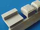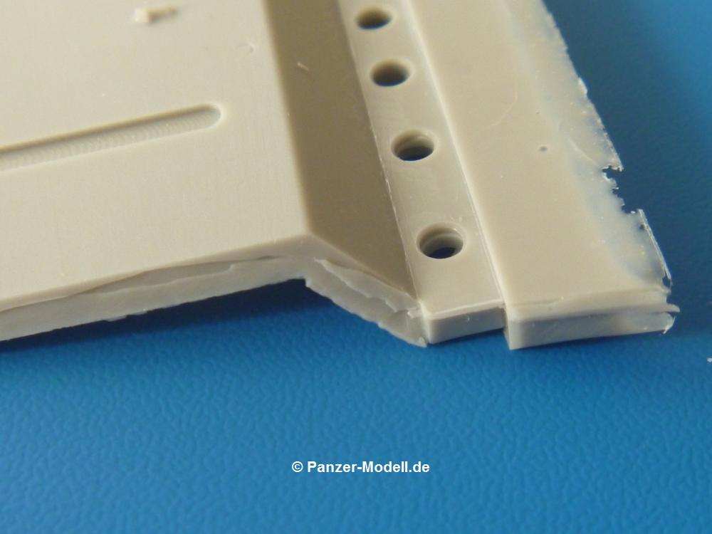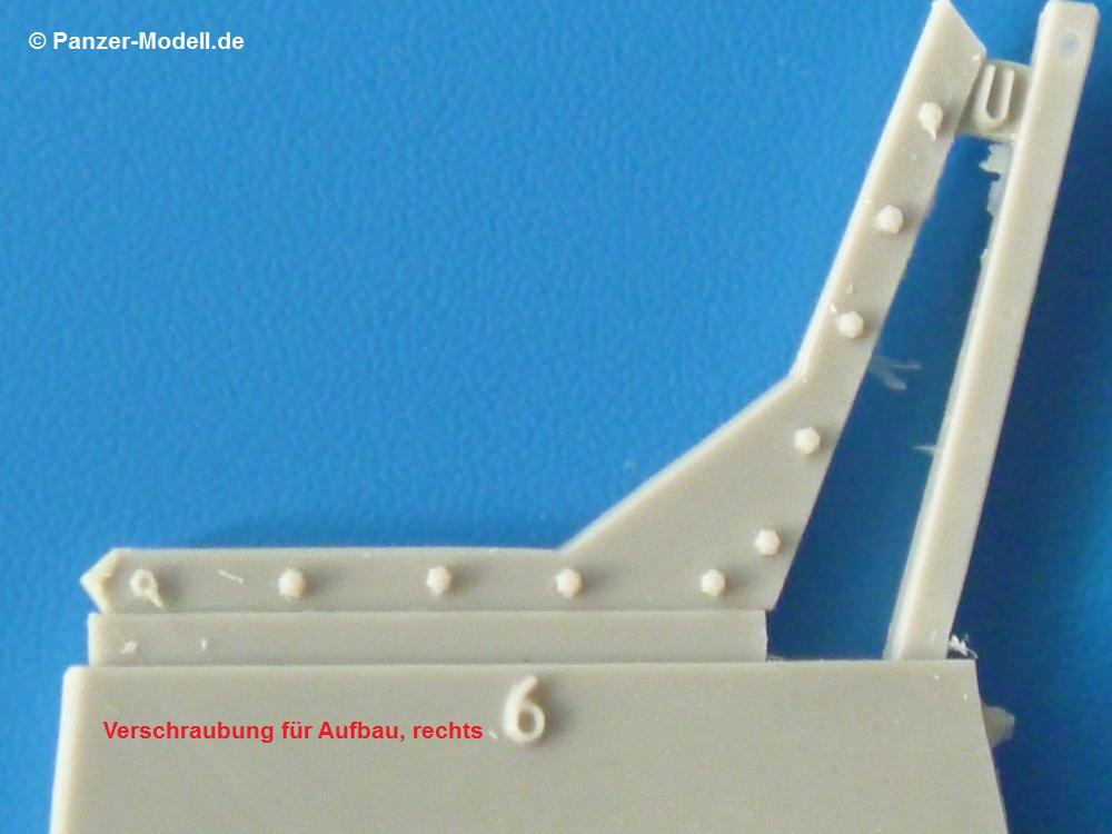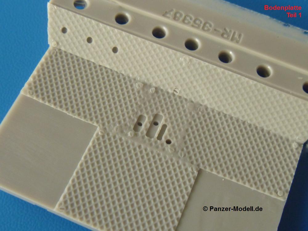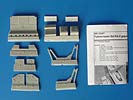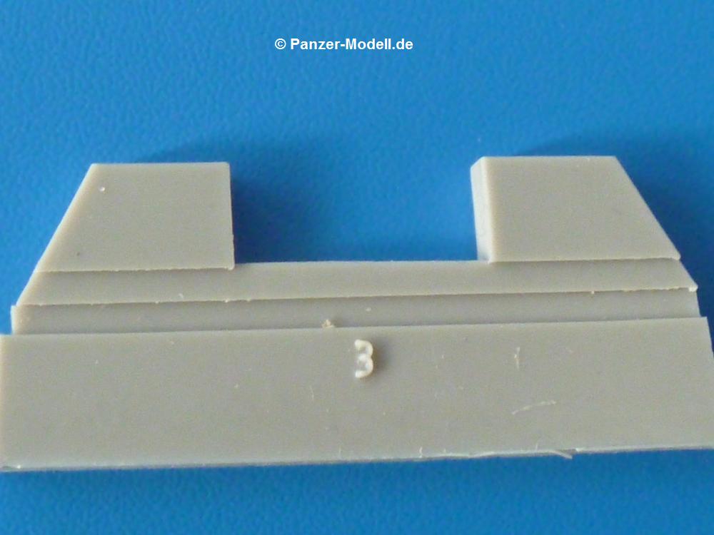Der Fahrerraum ist wohl dem des in Polen gefundenen Fahrzeugs nachempfunden. Für die Version, die Trumpeter verwendet, konnte ich keine Hinweise finden.In einem wieder verschließbaren Tütchen erhalten wir neben der Bauanleitung mit der Teileübersicht und der fotografierten Anleitung 9 Gussstücke mit einem oder mehreren Teilen daran. Die Angüsse sind moderat, aber ein Anfänger muss beim Abtrennen vom Anguss sein Geschick einsetzen, um nicht zuviel abzusägen, grad bei der Bodenplatte. Der Guss ist blasenfrei. Details wie Riffelung und Schraubenköpfe kommen gut zur Geltung.Die verzugsfreie Bodenplatte hat eine schöne Riffelblechstruktur. Auch sind die Köpfe der Schlitzschrauben, mit denen die einzelnen Bodenbleche beim Original befestigt waren, gut zu erkennen. Löcher für Pedale und Schalthebel aus dem Trumpeter Bausatz sind vorhanden. Den Anguss an der Bodenplatte empfinde ich als etwas stark. Beim Absägen sollte man behutsam vorgehen. An der Unterseite der Platte sind 2 Führungsschlitze, in die die 2 Auflagen perfekt hineinpassen. Der neue Querträger, der ans hintere Ende der Bodenplatte kommt, ist ganz glatt ohne erkennbare Struktur. Dazu kommt noch Stufe mit Riffelung wie bei der Bodenplatte. Fahrer- und Beifahrersitz finden ihren Platz auf den glatten Flächen der Bodenplatte. Die Sitzkissen sind etwas aufgeraut, um die Lederstruktur darzustellen. Wellen und Dellen erwecken den Anschein, als hätte sich die Besatzung grad von ihren Sitzen erhoben. Ähnlich sind die beiden Rückenlehnen gestaltet. Hier aber aufpassen bei der Anbringung an den Trennwänden, denn linke und rechte Lehne sind unterschiedlich. Das aufgedruckte L und R helfen, Verwechslungen zu vermeiden. Sehr schön zu sehen sind die Nietenköpfe der Trennwände. Ebenso deutlich treten die Schraubenköpfe an den Verschraubungen des Ausbaus hervor. Diese Verschraubungen sind beim Original Bausatz überhaupt nicht vorhanden und geben ihm ein fehlendes Detail.Die einseitig bedruckte Bauanleitung besteht aus einer Auslistung und Benennung der Teile in Deutsch und Englisch. Auf 3 schwarz-weiß Photos wird die Platzierung der Teile gezeigt. Schaut man sich die Teile und die Bauanleitung genau an, sollte man hiermit keine Probleme haben. Bemalungshinweise gibt es nicht. Hier folgt man die Trumpeter Anleitung.Mit einem Preis um die 12 - 13,00 EUR erhält man ein einfache, aber wirksame Korrektur für Trumpeters Bausatz des Sd.Kfz.8 DB10 gepanzerte 12t. Der einzige Wermutstropfen dabei ist, dass man wegen der Dachpanzerung leider nicht mehr viel davon sehen wird.